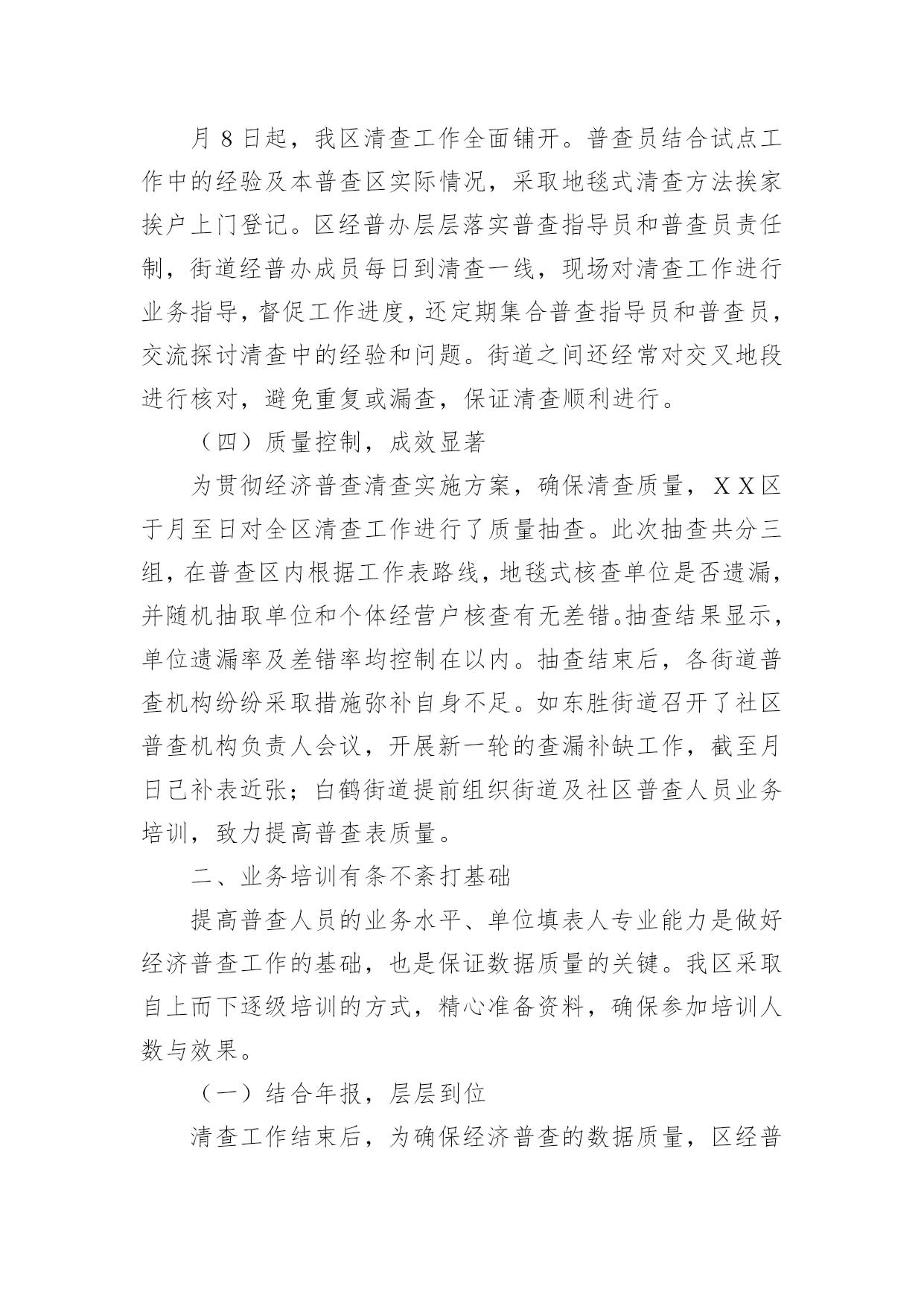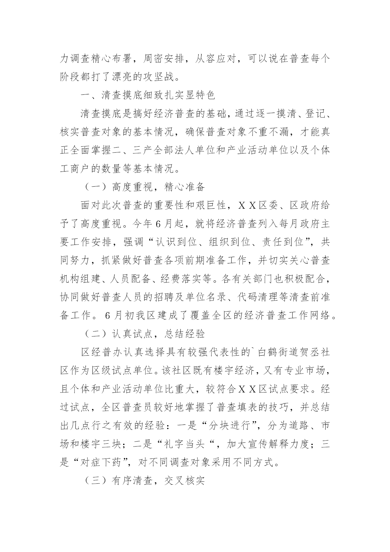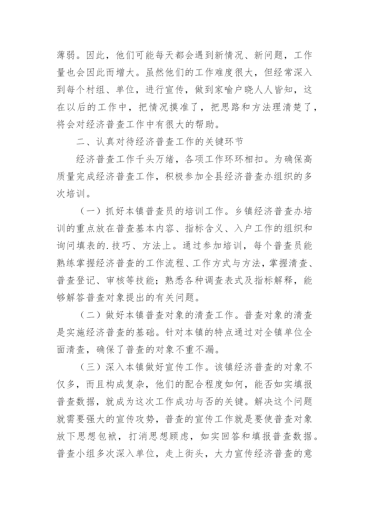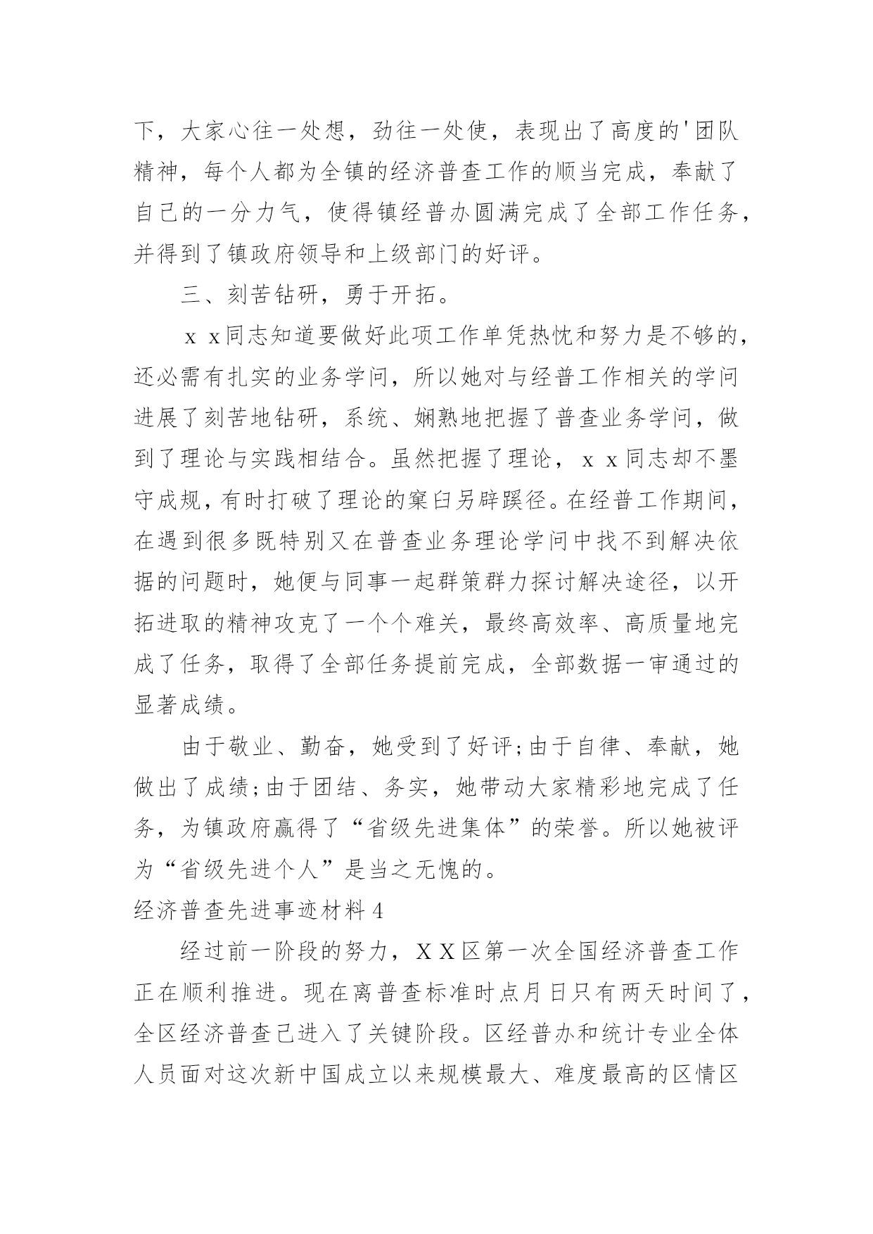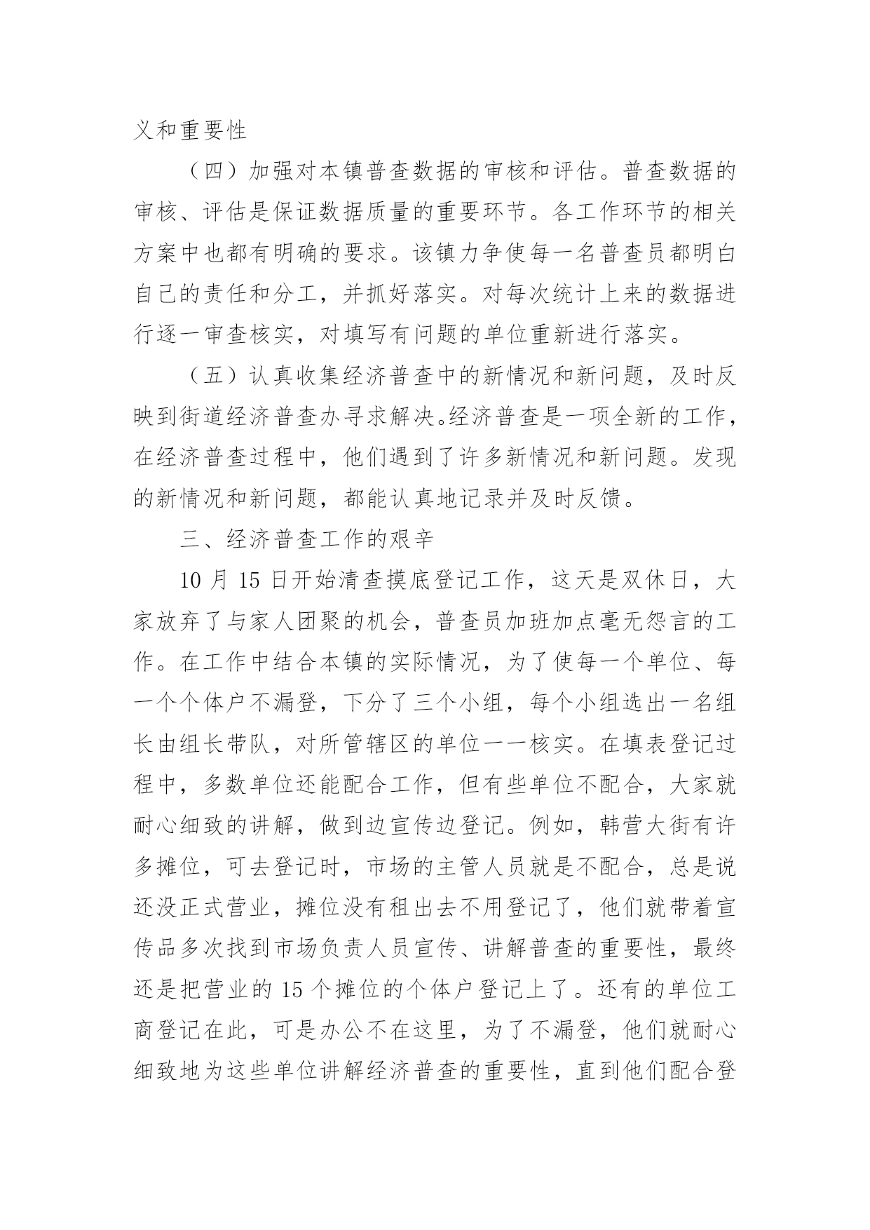 经济普查先进事迹材料经济普查先进事迹材料在平时的学习、工作或生活中,要用到事迹材料的地方还是很多的,从先进对象的形成和内涵上来分,事迹材料可分为在一个较长时间内形成的先进事迹的材料和在一时因突发事件而产生的先进事迹的材料。相信很多朋友都对拟事迹材料感到非常苦恼吧,以下是小编为大家收集的经济普查先进事迹材料,供大家参考借鉴,希望可以帮助到有需要的朋友。经济普查先进事迹材料1自20xx年全国第一次经济普查开始以来,民乐县新天镇普查小组,对此项工作高度负责,在时间紧、任务重的情况下,普查人员起早贪黑、加班加点、认真负责,按时按要求圆满完成县经济普查领导小组下达的任务,受到县领导和全镇干部职工的好评。一、充分认识经济普查工作的难度该镇法人和产业活动单位有近150家,在册登记的个体经营户有385家,还有为数众多的没有登记的个体户和流动摊位,普查对象的数量是很大的。另外,各单位不仅经济成分、企业产权结构和组织形式较复杂,而且第三产业也较发达。这些行业大都没有建立规范的统计制度,统计基础比较薄弱。因此,他们可能每天都会遇到新情况、新问题,工作量也会因此而增大。虽然他们的工作难度很大,但经常深入到每个村组、单位,进行宣传,做到家喻户晓人人皆知,这在以后的工作中,把情况摸准了,把思路和方法理清楚了,将会对经济普查工作中有很大的帮助。二、认真对待经济普查工作的关键环节经济普查工作千头万绪,各项工作环环相扣。为确保高质量完成经济普查工作,积极参加全县经济普查办组织的多次培训。(一)抓好本镇普查员的培训工作。乡镇经济普查办培训的重点放在普查基本内容、指标含义、入户工作的组织和询问填表的.技巧、方法上。通过参加培训,每个普查员能熟练掌握经济普查的工作流程、工作方式与方法,掌握清查、普查登记、审核等技能;熟悉各种调查表式及指标解释,能够解答普查对象提出的有关问题。(二)做好本镇普查对象的清查工作。普查对象的清查是实施经济普查的基础。针对本镇的特点通过对全镇单位全面清查,确保了普查的对象不重不漏。(三)深入本镇做好宣传工作。该镇经济普查的对象不仅多,而且构成复杂,他们的配合程度如何,能否如实填报普查数据,就成为这次工作成功与否的关键。解决这个问题就需要强大的宣传攻势,普查的宣传工作就是要使普查对象放下思想包袱,打消思想顾虑,如实回答和填报普查数据。普查小组多次深入单位,走上街头,大力宣传经济普查的意义和重要性(四)加强对本镇普查数据的审核和评估。普查数据的审核、评估是保证数据质量的重要环节。各工作环节的相关方案中也都有明确的要求。该镇力争使每一名普查员都明白自己的责任和分工,并抓好落实。对每次统计上来的数据进行逐一审查核实,对填写有问题的单位重新进行落实。(五)认真收集经济普查中的新情况和新问题,及时反映到街道经济普查办寻求解决。经济普查是一项全新的工作,在经济普查过程中,他们遇到了许多新情况和新问题。发现的新情况和新问题,都能认真地记录并及时反馈。三、经济普查工作的艰辛10月15日开始清查摸底登记工作,这天是双休日,大家放弃了与家人团聚的机会,普查员加班加点毫无怨言的工作。在工作中结合本镇的实际情况,为了使每一个单位、每一个个体户不漏登,下分了三个小组,每个小组选出一名组长由组长带队,对所管辖区的单位一一核实。在填表登记过程中,多数单位还能配合工作,但有些单位不配合,大家就耐心细致的讲解,做到边宣传边登记。例如,韩营大街有许多摊位,可去登记时,市场的主管人员就是不配合,总是说还没正式营业,摊位没有租出去不用登记了,他们就带着宣传品多次找到市场负责人员宣传、讲解普查的重要性,最终还是把营业的15个摊位的个体户登记上了。还有的单位工商登记在此,可是办公不在这里,为了不漏登,他们就耐心细致地为这些单位讲解经济普查的重要性,直到他们配合登记为止,确保了登记的真实性。一年来,镇普查办全体成员发挥团队精神,明确职责分工,积极配合,协同作战.遵守组织纪律,勤勤恳恳,扎实工作,顺利完成第一次全国经济普查工作前期的各项工作任务。在县普查办公室的精心指导下,全体普查员团结努力,做到了尽职尽责,认真负责,不计较份内份外,不计较时间,默默奉献。经济普查先进事迹材料2第一次全国经济普查,是我国经济发展进入21世纪后进行的一项重要的国情国力调查,也是中国加入wto与国际经济接轨的需要。对于兴源镇来说,也是一次重要的镇情调查,此次调查意义非凡,责任重大,兴源镇党委、政府对这项工作给予了高度的重视和正确的领导,社会各界也给予了大力支持和积极的配合。经过该镇普查办公人员几个月的工作,对兴源镇的308个经济普查对象进行了详细的调查,并取得了详实可靠的数据。之所以取得这些成绩,他们主要做了以下几个方面的工作。1、领导重视,确保普查任务的完成自穆棱市经济普查工作会议结束后,兴源镇根据此次普