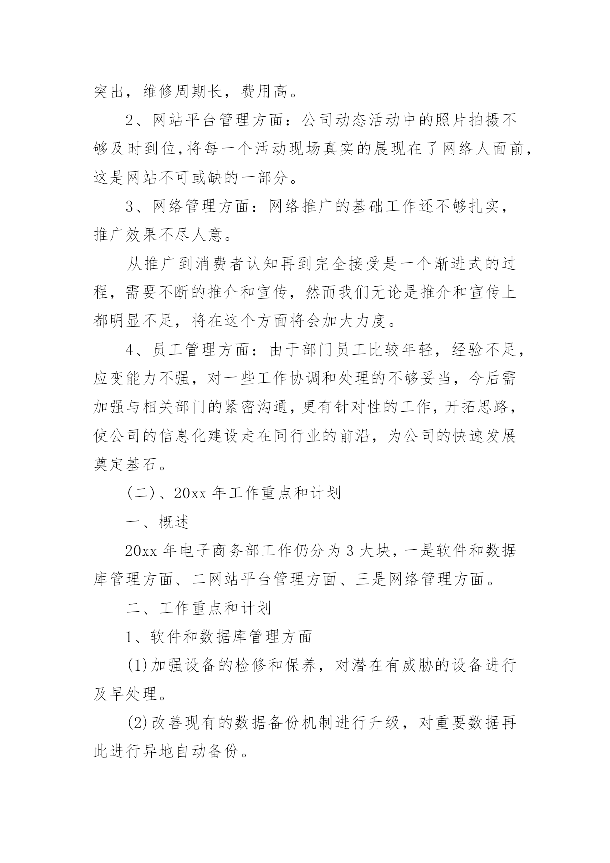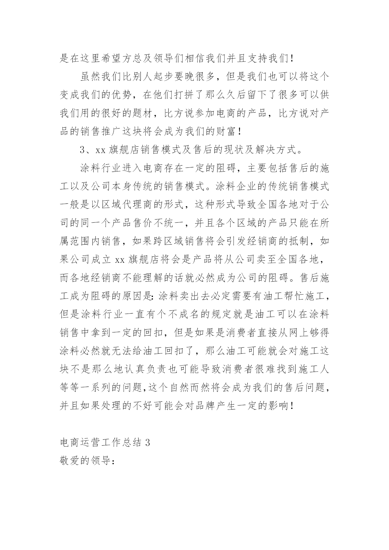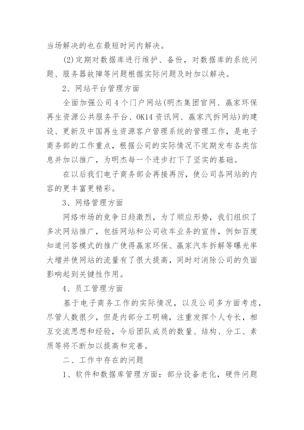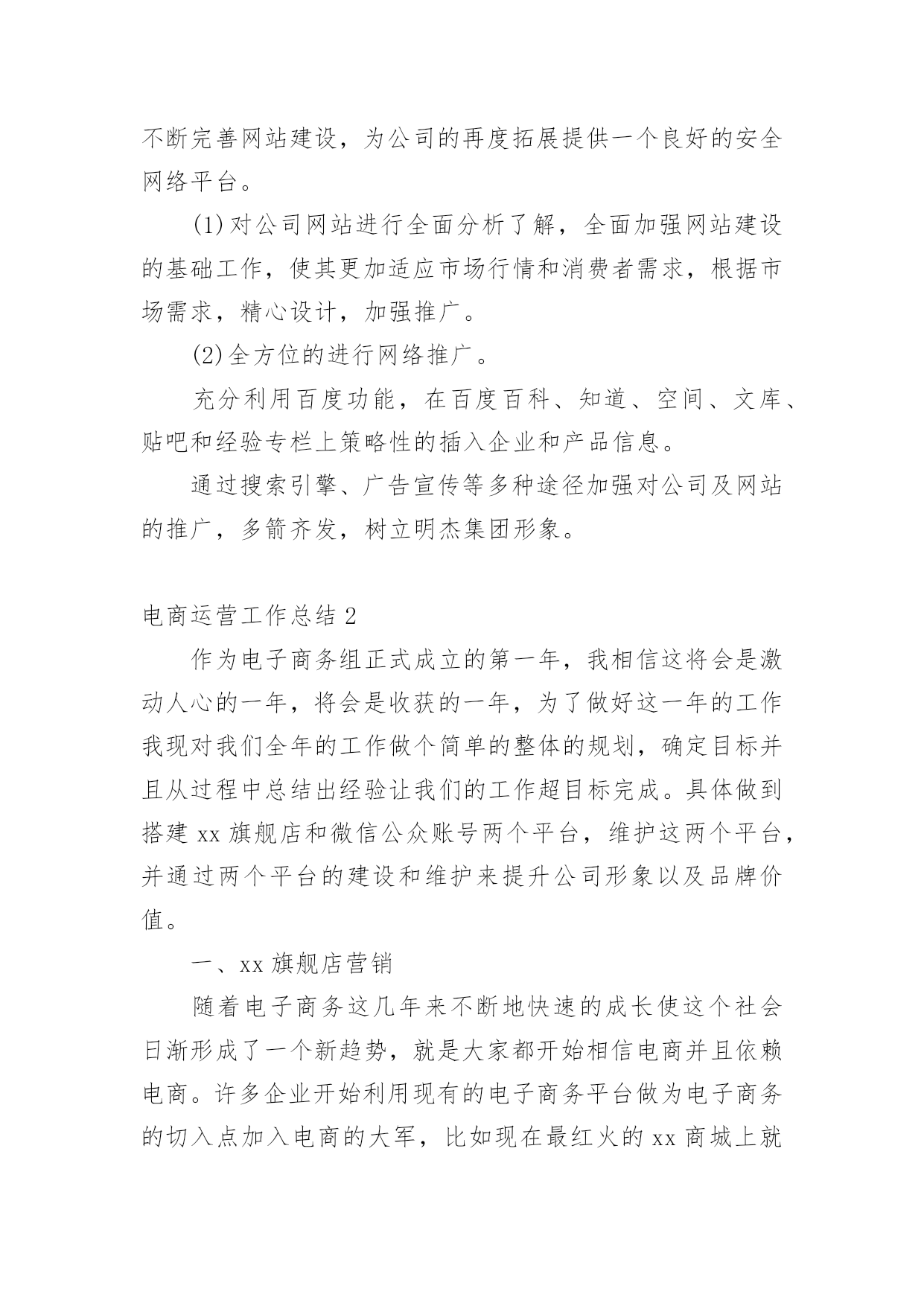 电商运营工作总结电商运营工作总结11篇总结就是把一个时段的学习、工作或其完成情况进行一次全面系统的总结,通过它可以全面地、系统地了解以往的学习和工作情况,不如立即行动起来写一份总结吧。那么总结应该包括什么内容呢?以下是小编为大家整理的电商运营工作总结,供大家参考借鉴,希望可以帮助到有需要的朋友。电商运营工作总结1时光荏苒,20xx年即将过去,回顾这一年的工作历程,电子商务部在公司领导的支持和各个部门的配合下,确保了公司网络的正常运行,配合各个部门顺利完成公司的各项工作任务,推进了“搜车网”的开发、制作、测试及全面上线。新的一年意味着新的起点新的机遇新的挑战,希望同大家一道,在20xx年的工作基础上,继续群策群力,为明杰人的明天,携手共进!总结如下:(一)、20xx年工作重点回顾和存在的问题一、工作重点回顾1、软件和数据库管理方面(1)合理安排软件使用流程并制定相关规范,及时响应了各部门的电脑软件的维护,尽可能的.降低使用故障,在其出现故障的时候,并做到了能即时解决就即时解决,不能当场解决的也在最短时间内解决。(2)定期对数据库进行维护、备份,对数据库的系统问题、服务器故障等问题根据实际问题及时加以解决。2、网站平台管理方面全面加强公司4个门户网站(明杰集团官网、赢家环保再生资源公共服务平台、OK14资讯网、赢家汽拆网站)的建设、更新及中国再生资源客户管理系统的管理工作,是电子商务部的工作重点,根据公司的实际情况不定期发布各类信息并加以推广,为明杰每一个进步打下了坚实的基础。在以后我们电子商务部会再接再厉,使公司各网站的内容的更丰富更精彩。3、网络管理方面网络市场的竞争日趋激烈,为了顺应形势,我们组织了多次网站推广,包括网站和公司收车业务的宣传,例如百度知道问答模式的推广使得赢家环保、赢家汽车拆解等曝光率大增并使网站的流量有了很大提高,同时对消除公司的负面影响起到关键性作用。4、员工管理方面基于电子商务工作的实际情况,以及公司多方面考虑,尽管人数很少,但是内部分工明确,注重发挥个人专长,相互交流思想和经验,今后团队成员的数量、结构、分工、素质等将不断加以提高和完善。二、工作中存在的问题1、软件和数据库管理方面:部分设备老化,硬件问题突出,维修周期长,费用高。2、网站平台管理方面:公司动态活动中的照片拍摄不够及时到位,将每一个活动现场真实的展现在了网络人面前,这是网站不可或缺的一部分。3、网络管理方面:网络推广的基础工作还不够扎实,推广效果不尽人意。从推广到消费者认知再到完全接受是一个渐进式的过程,需要不断的推介和宣传,然而我们无论是推介和宣传上都明显不足,将在这个方面将会加大力度。4、员工管理方面:由于部门员工比较年轻,经验不足,应变能力不强,对一些工作协调和处理的不够妥当,今后需加强与相关部门的紧密沟通,更有针对性的工作,开拓思路,使公司的信息化建设走在同行业的前沿,为公司的快速发展奠定基石。(二)、20xx年工作重点和计划一、概述20xx年电子商务部工作仍分为3大块,一是软件和数据库管理方面、二网站平台管理方面、三是网络管理方面。二、工作重点和计划1、软件和数据库管理方面(1)加强设备的检修和保养,对潜在有威胁的设备进行及早处理。(2)改善现有的数据备份机制进行升级,对重要数据再此进行异地自动备份。(3)完善工作流程和操作规范,配合各部门完善和监督操作的措施,从数据管理,病毒防范管理,网络系统操作流程开始规范。(4)在继续完善以上工作的同时,加强学习,提高部门综合素质水平,学习并引入各种的技术,提高服务质量和工作效率。2、网站平台管理方面网站的维护建设开发,主要包括网站的进一步完善和优化,完成对网站诊断、优化,加强网站用户体验、方便运营推广,自己也会加强与各部门之间的联系与沟通,以保证各部门资源及可发布信息能达到最优整合,使网站形象与公司形象达到统一。针对我公司的4个网站,20xx年日常维护更新工作主要包括:(1)监控网站整体运行正常,一旦出现异常,立即解决,解决不了的第一时间联系运营商处理,确保公司网站在互联网上的健康的运行。(2)主要是每个网站的公司动态更新和新闻信息的更新,其他栏目偶尔的个别调整。(3)在线交流和留言板的管理,保证每天查看留言板,遇到客户留言,及时进行处理,确保每天在线,及时解决咨询者的问题。3、网络管理方面我们将在公司现有网络的基础上,合理设计、配置资源,不断完善网站建设,为公司的再度拓展提供一个良好的安全网络平台。(1)对公司网站进行全面分析了解,全面加强网站建设的基础工作,使其更加适应市场行情和消费者需求,根据市场需求,精心设计,加强推广。(2)全方位的进行网络推广。充分利用百度功能,在百度百科、知道、空间、文库、贴吧和经验专栏上策略性的插入企业和产品信息。通过搜索引擎、广告宣传等多种途径加强