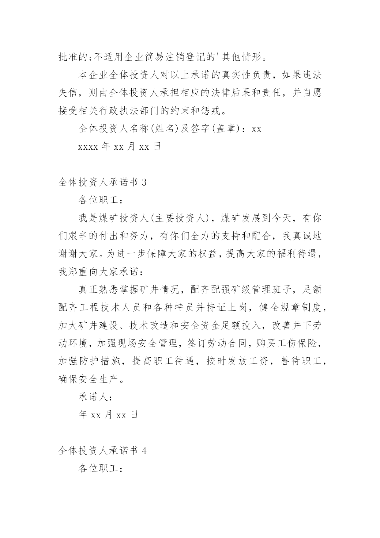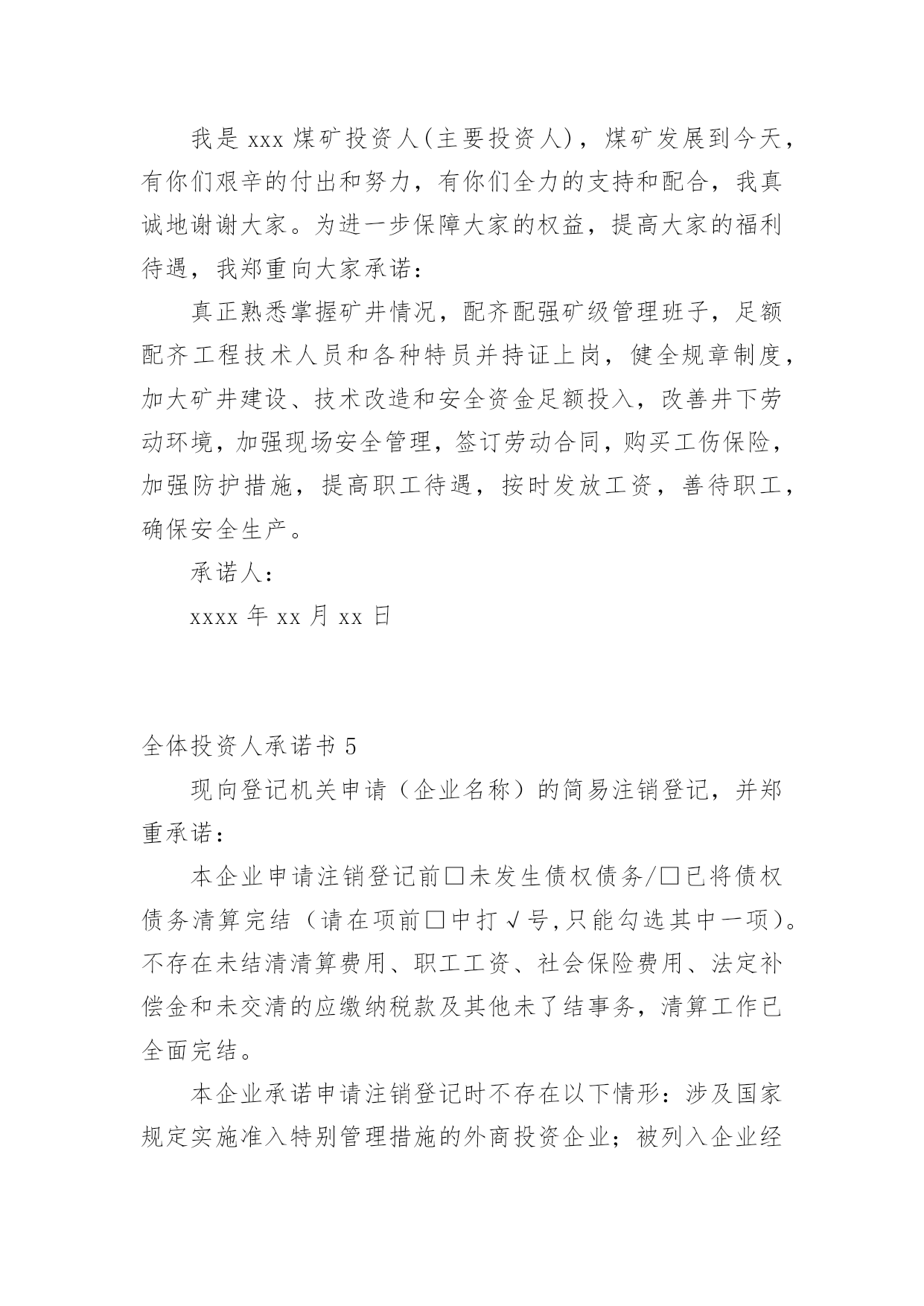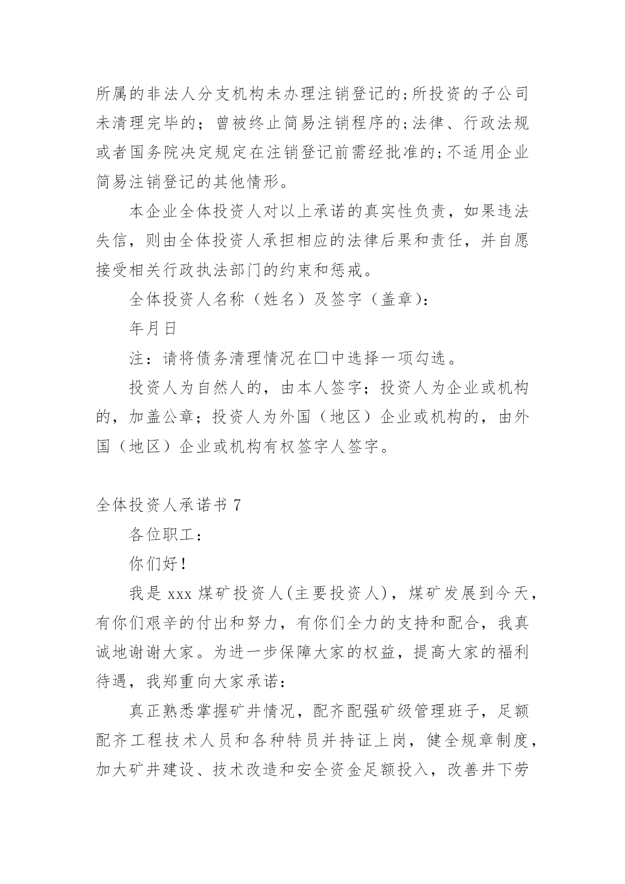 全体投资人承诺书在当今社会生活中,很多地方都会使用到承诺书,承诺书必须由受要约人作出,只有受要约人才能取得承诺的权利,受要约人以外的第三人不享有承诺的权利。大家知道承诺书的格式吗?下面是小编帮大家整理的全体投资人承诺书,仅供参考,欢迎大家阅读。全体投资人承诺书1现向登记机关申请(企业名称)的简易注销登记,并郑重承诺:本企业申请注销登记前□未发生债权债务/□已将债权债务清算完结(请在项前□中打√号,只能勾选其中一项)。不存在未结清清算费用、职工工资、社会保险费用、法定补偿金和未交清的应缴纳税款及其他未了结事务,清算工作已全面完结。本企业承诺申请注销登记时不存在以下情形:涉及国家规定实施准入特别管理措施的外商投资企业;被列入企业经营异常名录或严重违法失信企业名单的;存在股权(投资权益)被冻结、出质或动产抵押等情形;有正在被立案调查或采取行政强制、司法协助、被予以行政处罚等情形的;企业所属的非法人分支机构未办理注销登记的;曾被终止简易注销程序的;法律、行政法规或者国务院决定规定在注销登记前需经批准的;不适用企业简易注销登记的其他情形。本企业全体投资人对以上承诺的真实性负责,如果违法失信,则由全体投资人承担相应的法律后果和责任,并自愿接受相关行政执法部门的约束和惩戒。全体投资人签字(盖章):年月日注:填写后将全体投资人承诺书照片(大小不超过300KB)上传,照片务必清晰,否则无法通过简易注销。全体投资人承诺书2现向登记机关申请(企业名称)(统一代码/注册号)的简易注销登记,并郑重承诺:本企业申请注销登记前□未发生债权债务□已将债权债务清算完结,不存在未结清清算费用、职工工资、社会保险费用、法定补偿金和未交清的应缴纳税款及其他未了结事务,清算工作已全面完结。本企业承诺申请注销登记时不存在以下情形:涉及国家规定实施准入特别管理措施的外商投资企业;被列入企业经营异常名录或严重违法失信企业名单的;存在股权(投资权益)被冻结、出质或动产抵押等情形;有正在被立案调查或采取行政强制、司法协助、被予以行政处罚等情形的;企业所属的非法人分支机构未办理注销登记的;所投资的子公司未清理完毕的;曾被终止简易注销程序的;法律、行政法规或者国务院决定规定在注销登记前需经批准的;不适用企业简易注销登记的'其他情形。本企业全体投资人对以上承诺的真实性负责,如果违法失信,则由全体投资人承担相应的法律后果和责任,并自愿接受相关行政执法部门的约束和惩戒。全体投资人名称(姓名)及签字(盖章):xxxxxx年xx月xx日全体投资人承诺书3各位职工:我是煤矿投资人(主要投资人),煤矿发展到今天,有你们艰辛的付出和努力,有你们全力的支持和配合,我真诚地谢谢大家。为进一步保障大家的权益,提高大家的福利待遇,我郑重向大家承诺:真正熟悉掌握矿井情况,配齐配强矿级管理班子,足额配齐工程技术人员和各种特员并持证上岗,健全规章制度,加大矿井建设、技术改造和安全资金足额投入,改善井下劳动环境,加强现场安全管理,签订劳动合同,购买工伤保险,加强防护措施,提高职工待遇,按时发放工资,善待职工,确保安全生产。承诺人:年xx月xx日全体投资人承诺书4各位职工:我是xxx煤矿投资人(主要投资人),煤矿发展到今天,有你们艰辛的付出和努力,有你们全力的支持和配合,我真诚地谢谢大家。为进一步保障大家的权益,提高大家的福利待遇,我郑重向大家承诺:真正熟悉掌握矿井情况,配齐配强矿级管理班子,足额配齐工程技术人员和各种特员并持证上岗,健全规章制度,加大矿井建设、技术改造和安全资金足额投入,改善井下劳动环境,加强现场安全管理,签订劳动合同,购买工伤保险,加强防护措施,提高职工待遇,按时发放工资,善待职工,确保安全生产。承诺人:xxxx年xx月xx日全体投资人承诺书5现向登记机关申请(企业名称)的简易注销登记,并郑重承诺:本企业申请注销登记前□未发生债权债务/□已将债权债务清算完结(请在项前□中打√号,只能勾选其中一项)。不存在未结清清算费用、职工工资、社会保险费用、法定补偿金和未交清的应缴纳税款及其他未了结事务,清算工作已全面完结。本企业承诺申请注销登记时不存在以下情形:涉及国家规定实施准入特别管理措施的外商投资企业;被列入企业经营异常名录或严重违法失信企业名单的;存在股权(投资权益)被冻结、出质或动产抵押等情形;有正在被立案调查或采取行政强制、司法协助、被予以行政处罚等情形的;企业所属的非法人分支机构未办理注销登记的;曾被终止简易注销程序的;法律、行政法规或者国务院决定规定在注销登记前需经批准的;不适用企业简易注销登记的其他情形。本企业全体投资人对以上承诺的真实性负责,如果违法失信,则由全体投资人承担相应的法律后果和责任,并自愿接受相关行政执法部门的约束和惩戒。承诺人:xxxx年xx月xx日全体投资人承诺书6现