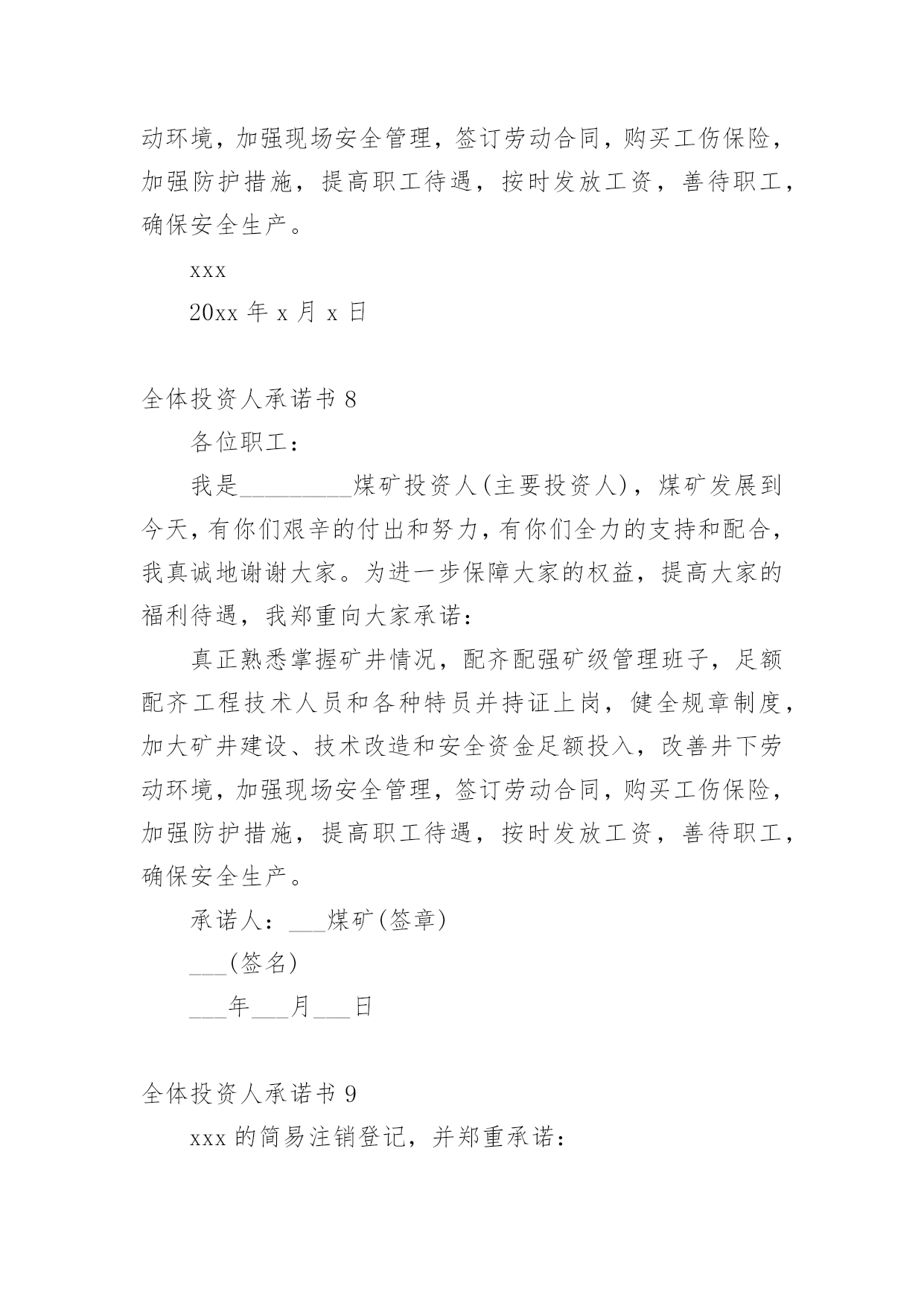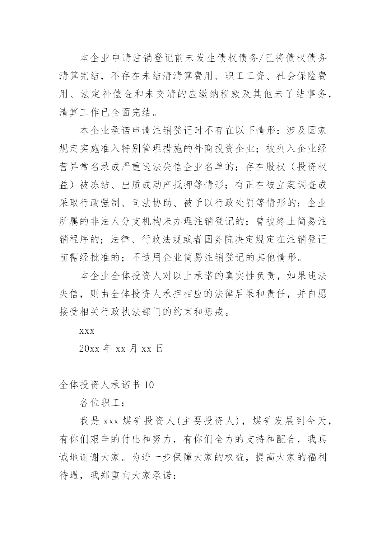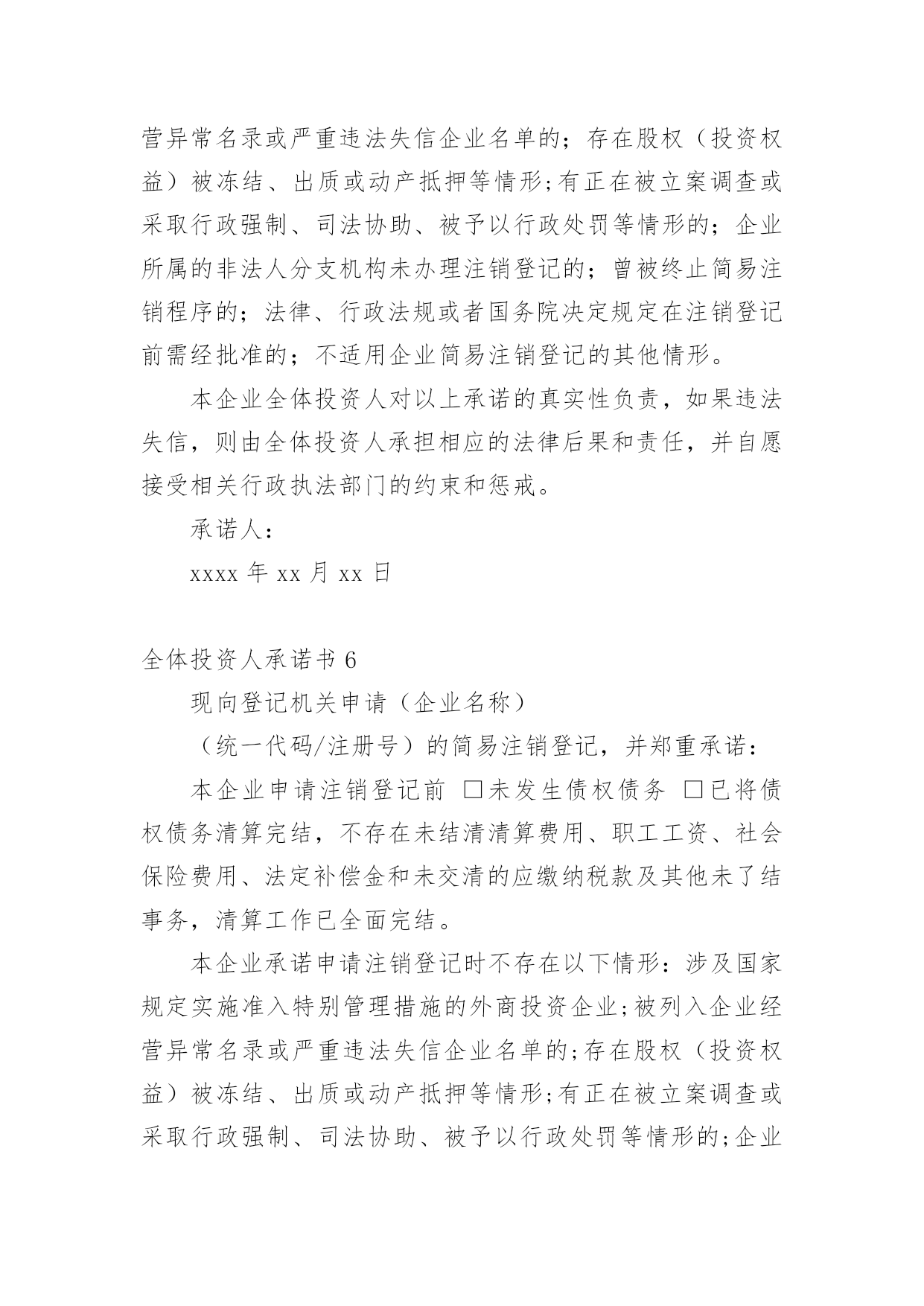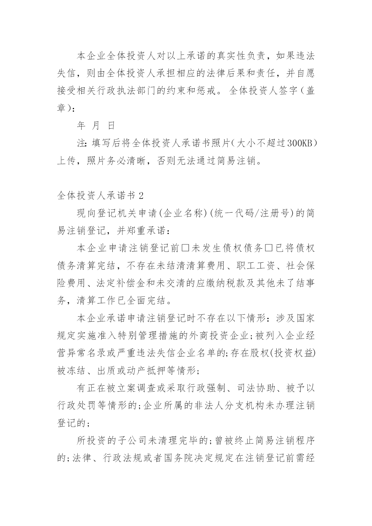 全体投资人承诺书在当今社会生活中,很多地方都会使用到承诺书,承诺书必须由受要约人作出,只有受要约人才能取得承诺的权利,受要约人以外的第三人不享有承诺的权利。大家知道承诺书的格式吗?下面是小编帮大家整理的全体投资人承诺书,仅供参考,欢迎大家阅读。全体投资人承诺书1现向登记机关申请(企业名称)的简易注销登记,并郑重承诺:本企业申请注销登记前□未发生债权债务/□已将债权债务清算完结(请在项前□中打√号,只能勾选其中一项)。不存在未结清清算费用、职工工资、社会保险费用、法定补偿金和未交清的应缴纳税款及其他未了结事务,清算工作已全面完结。本企业承诺申请注销登记时不存在以下情形:涉及国家规定实施准入特别管理措施的外商投资企业;被列入企业经营异常名录或严重违法失信企业名单的;存在股权(投资权益)被冻结、出质或动产抵押等情形;有正在被立案调查或采取行政强制、司法协助、被予以行政处罚等情形的;企业所属的非法人分支机构未办理注销登记的;曾被终止简易注销程序的;法律、行政法规或者国务院决定规定在注销登记前需经批准的;不适用企业简易注销登记的其他情形。本企业全体投资人对以上承诺的真实性负责,如果违法失信,则由全体投资人承担相应的法律后果和责任,并自愿接受相关行政执法部门的约束和惩戒。全体投资人签字(盖章):年月日注:填写后将全体投资人承诺书照片(大小不超过300KB)上传,照片务必清晰,否则无法通过简易注销。全体投资人承诺书2现向登记机关申请(企业名称)(统一代码/注册号)的简易注销登记,并郑重承诺:本企业申请注销登记前□未发生债权债务□已将债权债务清算完结,不存在未结清清算费用、职工工资、社会保险费用、法定补偿金和未交清的应缴纳税款及其他未了结事务,清算工作已全面完结。本企业承诺申请注销登记时不存在以下情形:涉及国家规定实施准入特别管理措施的外商投资企业;被列入企业经营异常名录或严重违法失信企业名单的;存在股权(投资权益)被冻结、出质或动产抵押等情形;有正在被立案调查或采取行政强制、司法协助、被予以行政处罚等情形的;企业所属的非法人分支机构未办理注销登记的;所投资的子公司未清理完毕的;曾被终止简易注销程序的;法律、行政法规或者国务院决定规定在注销登记前需经批准的;不适用企业简易注销登记的'其他情形。本企业全体投资人对以上承诺的真实性负责,如果违法失信,则由全体投资人承担相应的法律后果和责任,并自愿接受相关行政执法部门的约束和惩戒。全体投资人名称(姓名)及签字(盖章):xxxxxx年xx月xx日全体投资人承诺书3各位职工:我是煤矿投资人(主要投资人),煤矿发展到今天,有你们艰辛的付出和努力,有你们全力的支持和配合,我真诚地谢谢大家。为进一步保障大家的权益,提高大家的福利待遇,我郑重向大家承诺:真正熟悉掌握矿井情况,配齐配强矿级管理班子,足额配齐工程技术人员和各种特员并持证上岗,健全规章制度,加大矿井建设、技术改造和安全资金足额投入,改善井下劳动环境,加强现场安全管理,签订劳动合同,购买工伤保险,加强防护措施,提高职工待遇,按时发放工资,善待职工,确保安全生产。承诺人:年xx月xx日全体投资人承诺书4各位职工:我是xxx煤矿投资人(主要投资人),煤矿发展到今天,有你们艰辛的付出和努力,有你们全力的支持和配合,我真诚地谢谢大家。为进一步保障大家的权益,提高大家的福利待遇,我郑重向大家承诺:真正熟悉掌握矿井情况,配齐配强矿级管理班子,足额配齐工程技术人员和各种特员并持证上岗,健全规章制度,加大矿井建设、技术改造和安全资金足额投入,改善井下劳动环境,加强现场安全管理,签订劳动合同,购买工伤保险,加强防护措施,提高职工待遇,按时发放工资,善待职工,确保安全生产。承诺人:xxxx年xx月xx日全体投资人承诺书5现向登记机关申请(企业名称)的简易注销登记,并郑重承诺:本企业申请注销登记前□未发生债权债务/□已将债权债务清算完结(请在项前□中打√号,只能勾选其中一项)。不存在未结清清算费用、职工工资、社会保险费用、法定补偿金和未交清的应缴纳税款及其他未了结事务,清算工作已全面完结。本企业承诺申请注销登记时不存在以下情形:涉及国家规定实施准入特别管理措施的外商投资企业;被列入企业经营异常名录或严重违法失信企业名单的;存在股权(投资权益)被冻结、出质或动产抵押等情形;有正在被立案调查或采取行政强制、司法协助、被予以行政处罚等情形的;企业所属的非法人分支机构未办理注销登记的;曾被终止简易注销程序的;法律、行政法规或者国务院决定规定在注销登记前需经批准的;不适用企业简易注销登记的其他情形。本企业全体投资人对以上承诺的真实性负责,如果违法失信,则由全体投资人承担相应的法律后果和责任,并自愿接受相关行政执法部门的约束和惩戒。承诺人:xxxx年xx月xx日全体投资人承诺书6现