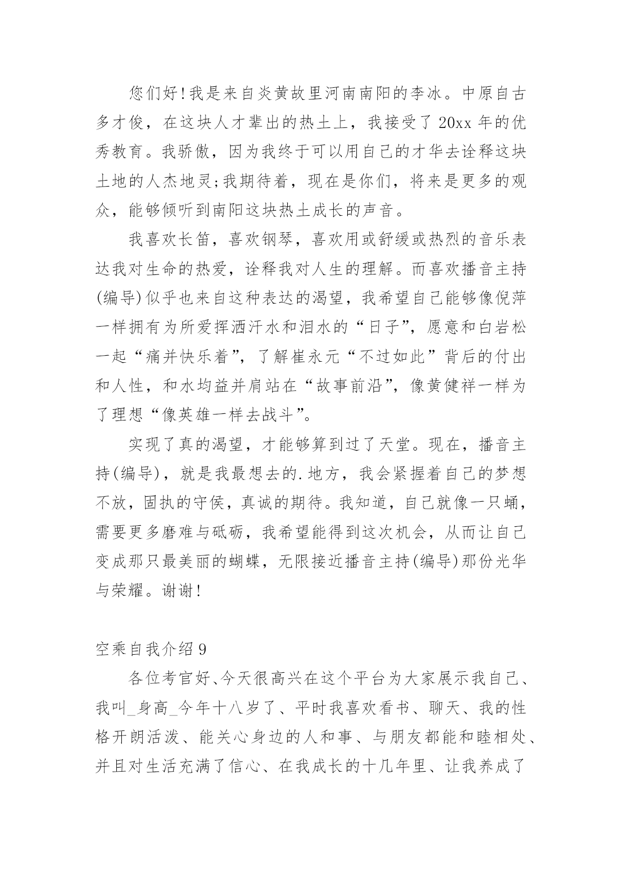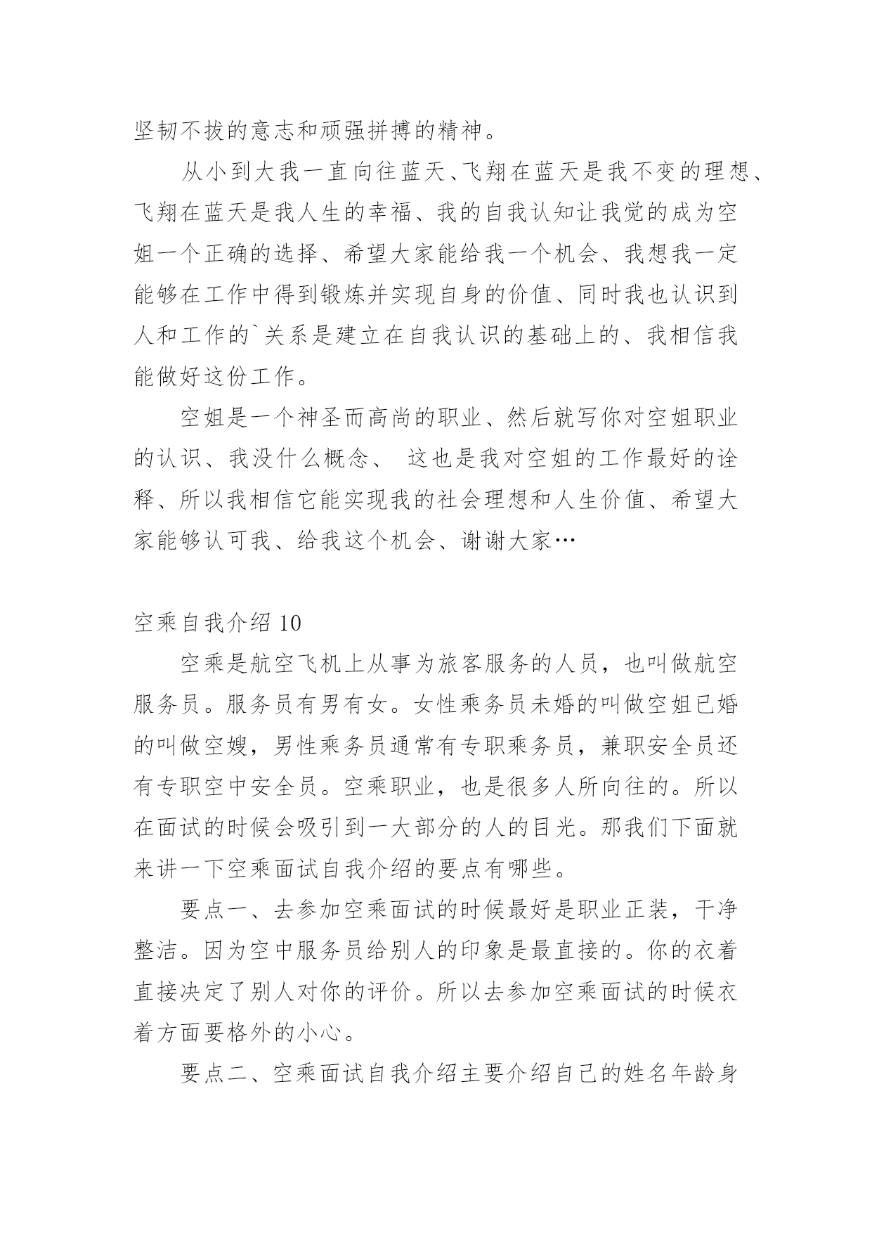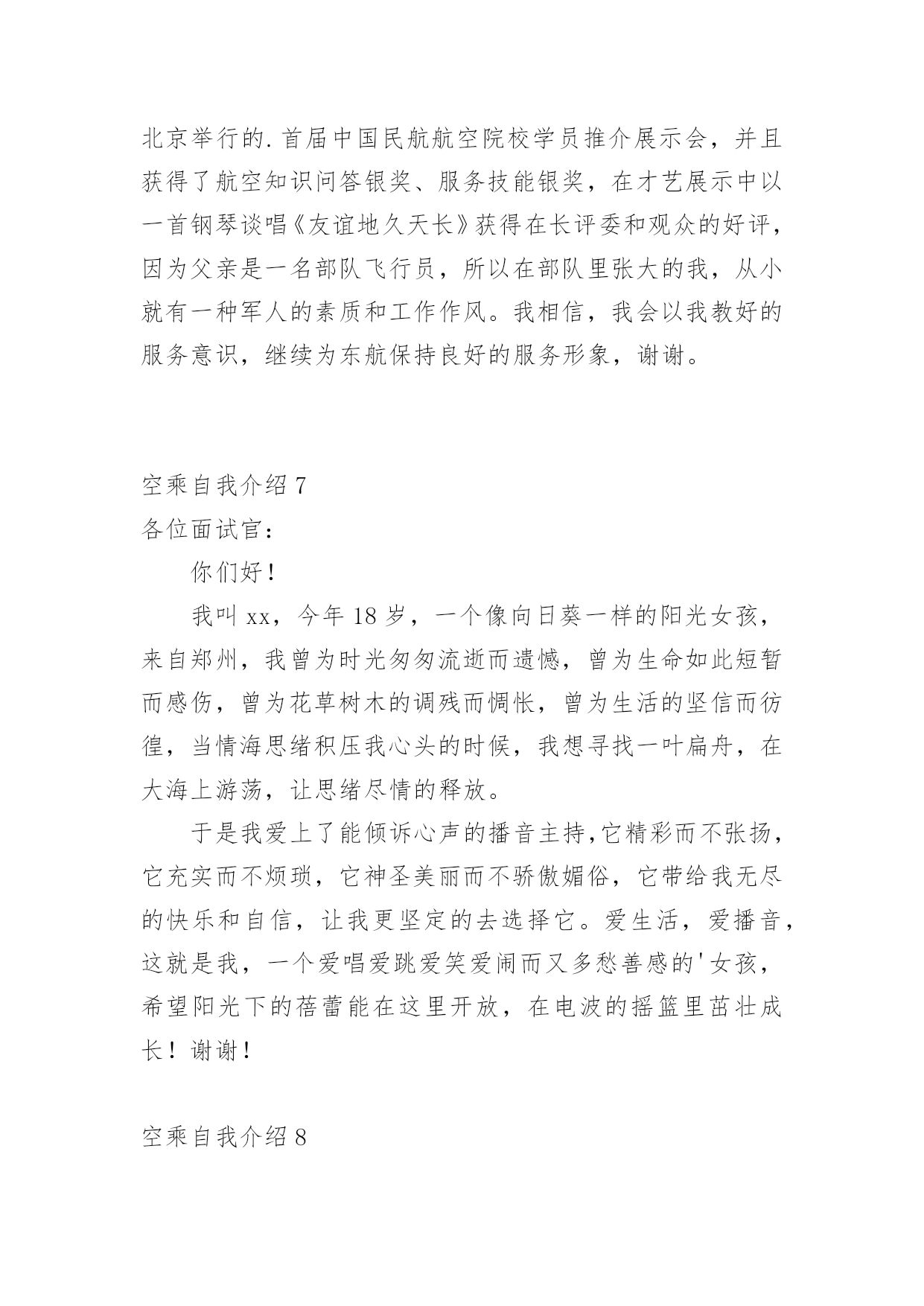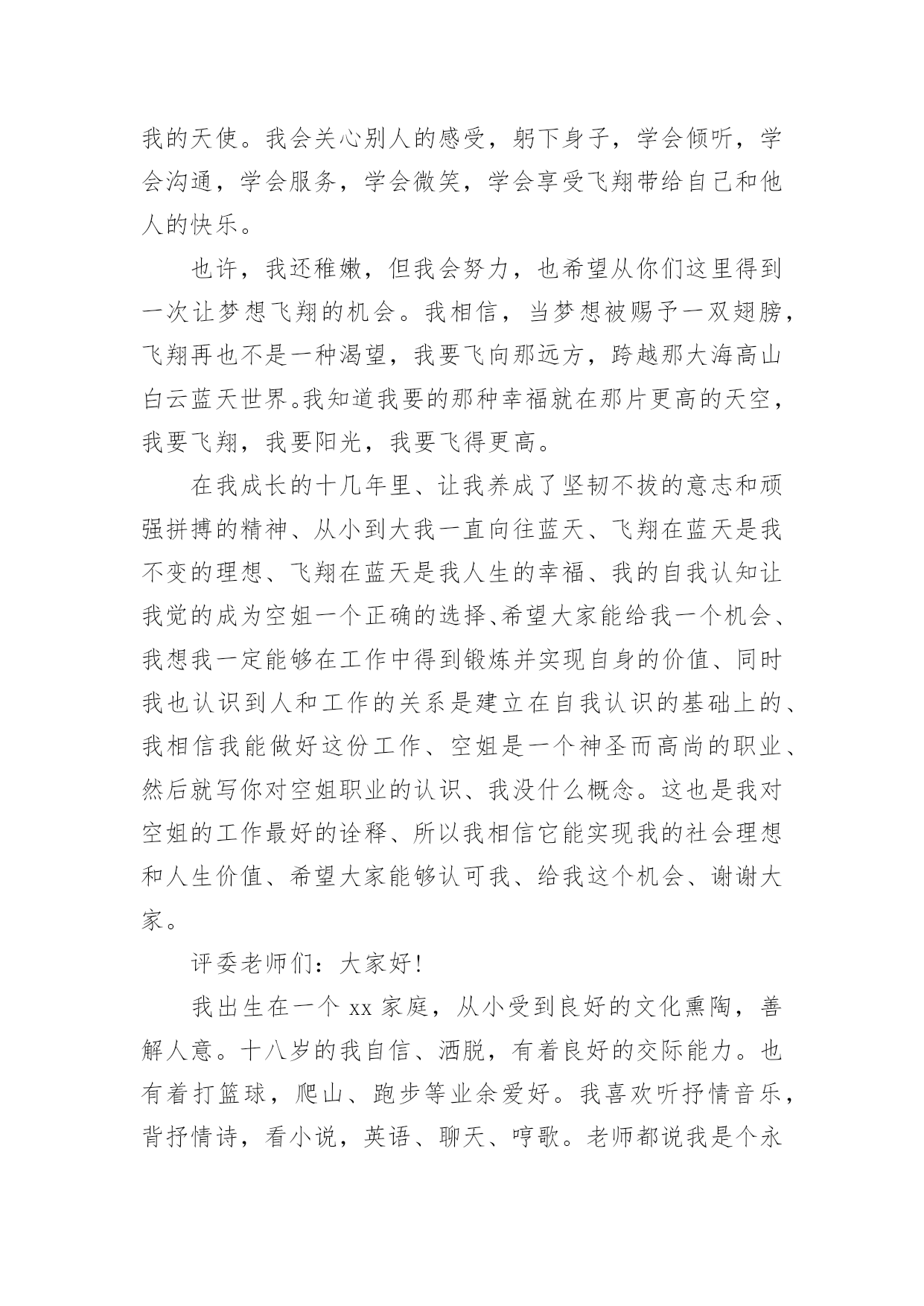 空乘自我介绍来到一个新的地方后,我们总归要向他人介绍自己,通过自我介绍可以得到他人的认可。怎么写自我介绍才能避免踩雷呢?下面是小编精心整理的空乘自我介绍,仅供参考,欢迎大家阅读。空乘自我介绍1各位面试官:你们好!我叫xx。十八岁的我自信、洒脱,有着良好的交际能力。也有着打篮球,爬山、跑步等业余爱好。我喜欢听抒情音乐,背抒情诗,看小说,英语、聊天、哼歌。老师都说我是个永不疲倦的乐天派。从小的我就渴望翱翔蓝天,能够为世界各地的朋友做好热情周到的服务是我的荣幸。我知道作为一名空中乘务员,不仅要有服务他人的满腔热忱,还要有隐忍、宽容、海纳百川的胸襟。这是关系国家形象的光荣而又神圣的事业,我会关心别人的感受,学会沟通,学会微笑,学会享受飞翔带给自己和他人的快乐。也许,我还稚嫩,离那个梦想还缺少很多条件,但是我会努力,去学习更多的东西来充实自己,也渴望从评委老师这里得到一次让梦想飞翔的机会。谢谢!空乘,一直是一个单纯女孩傻傻的梦想,美丽,浪漫,与白云为伴,蓝天上的天使,是我对它的理解。也许,我不像天使那样美丽,但我会发自内心地以乘客至上,乘客才是我的天使。我会关心别人的感受,躬下身子,学会倾听,学会沟通,学会服务,学会微笑,学会享受飞翔带给自己和他人的快乐。也许,我还稚嫩,但我会努力,也希望从你们这里得到一次让梦想飞翔的机会。我相信,当梦想被赐予一双翅膀,飞翔再也不是一种渴望,我要飞向那远方,跨越那大海高山白云蓝天世界。我知道我要的那种幸福就在那片更高的天空,我要飞翔,我要阳光,我要飞得更高。在我成长的十几年里、让我养成了坚韧不拔的意志和顽强拼搏的精神、从小到大我一直向往蓝天、飞翔在蓝天是我不变的理想、飞翔在蓝天是我人生的幸福、我的自我认知让我觉的成为空姐一个正确的选择、希望大家能给我一个机会、我想我一定能够在工作中得到锻炼并实现自身的价值、同时我也认识到人和工作的关系是建立在自我认识的基础上的、我相信我能做好这份工作、空姐是一个神圣而高尚的职业、然后就写你对空姐职业的认识、我没什么概念。这也是我对空姐的工作最好的诠释、所以我相信它能实现我的社会理想和人生价值、希望大家能够认可我、给我这个机会、谢谢大家。评委老师们:大家好!我出生在一个xx家庭,从小受到良好的文化熏陶,善解人意。十八岁的我自信、洒脱,有着良好的交际能力。也有着打篮球,爬山、跑步等业余爱好。我喜欢听抒情音乐,背抒情诗,看小说,英语、聊天、哼歌。老师都说我是个永不疲倦的乐天派。从小的我就渴望翱翔蓝天,能够为世界各地的.朋友做好热情周到的服务是我的荣幸。我知道作为一名空中乘务员,不仅要有服务他人的满腔热忱,还要有隐忍、宽容、海纳百川的胸襟。这是关系国家形象的光荣而又神圣的事业,我会关心别人的感受,学会沟通,学会微笑,学会享受飞翔带给自己和他人的快乐。也许,我还稚嫩,离那个梦想还缺少很多条件,但是我会努力,去学习更多的东西来充实自己,也渴望从评委老师这里得到一次让梦想飞翔的机会。我相信,当梦想被赐予一双翅膀,飞翔再也不是一种渴望。我知道我的梦想就在那片更高的天空,我要用纯真的心灵去感化着每一位一闪而过的旅客。谢谢!空乘自我介绍2其实面试主要就分3个大部分,第1关:个人形象展示和自我介绍。第2关:英语口语笔试。第3关:面试官的提问(主要考察学生的家庭情况、语言表达能力、皮肤好坏、有无特长等)第一关最重要,因为直接关系到后面的成败。在个人形象展示时候(站姿、走路、蹲起),要面带微笑,眼睛看位于考官席中间的主考官,有人会问看考官的什么地方呢?看考管的眉心,这样她会感觉你非常专业,非常舒服。在个人形象展示完之后每个人会有一个1分钟的个人自我介绍,有同学想问了,自我介绍都应该说些什么好?有人在自我介绍时会说我叫XX,就读于XX学校,身高XX,体重XX,爱好XX,回答完毕。全是废话!考官听了马上会说:好,下一个!注意,一分钟的自我介绍,只用了10秒不到就说完了,连考官观察你的时间都没有,让人感觉是你不重视这次面试,其实你不是,心理还特别紧张特别重视。首先,自我介绍要分为中文30秒,英文30秒,中英文的内容不能重复,不要把中文自我介绍直接翻译成英文说出来。下面我就把一篇空乘自我介绍发出来给大家做参考:各位评委你们好,我叫XX,来自青岛,我的特长是声乐、钢琴。参加过在北京举行的.首届中国民航航空院校学员推介展示会,并且获得了航空知识问答银奖、服务技能银奖,在才艺展示中以一首钢琴谈唱《友谊地久天长》获得在长评委和观众的好评,因为父亲是一名部队飞行员,所以在部队里张大的我,从小就有一种军人的素质和工作作风。我相信,我会以我教好的服务意识,继续为东航保持良好的服务形象,谢谢。空乘自我介绍3各位评委你们好,我叫,来自青岛,我的特长是声乐、钢琴。参加过在北京举行的首届中国民航航空院校学员推介展示会,并
