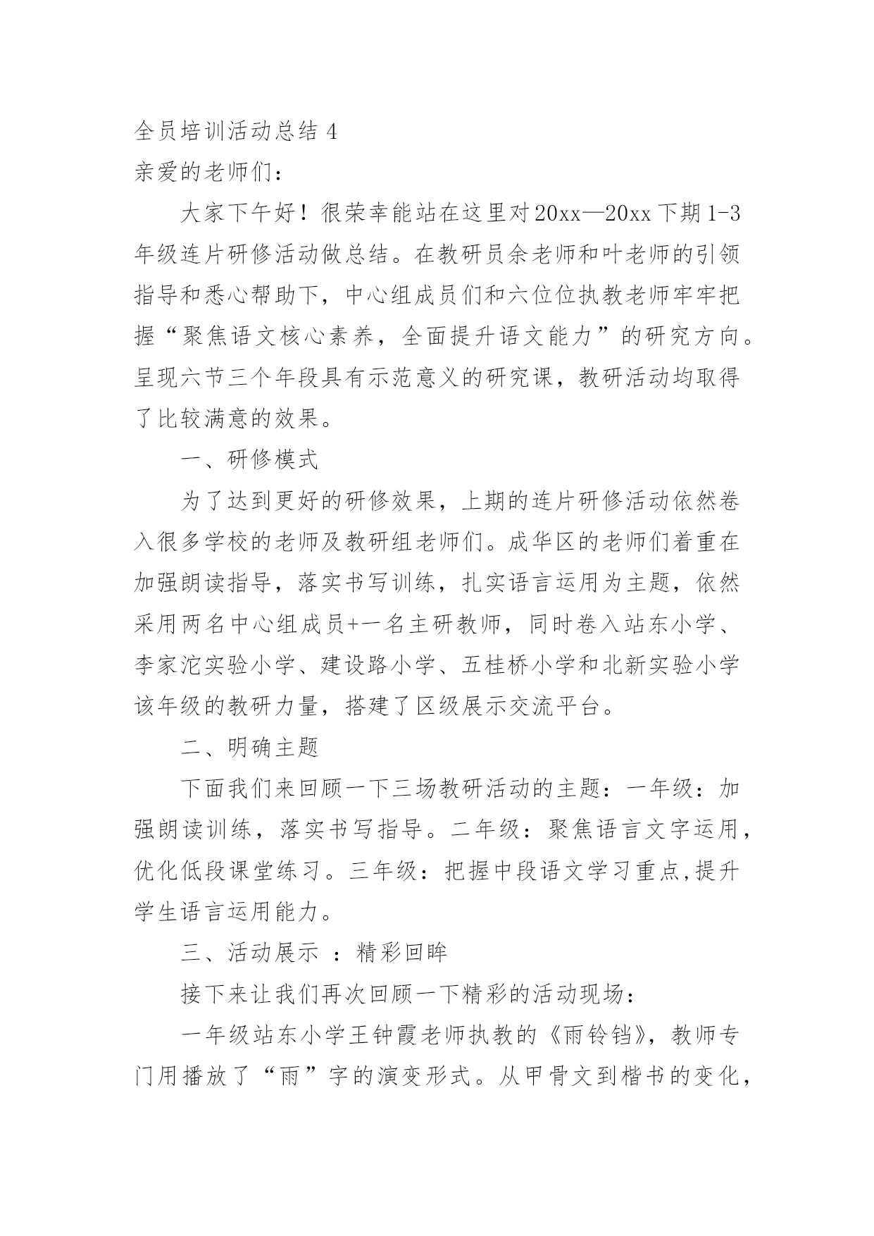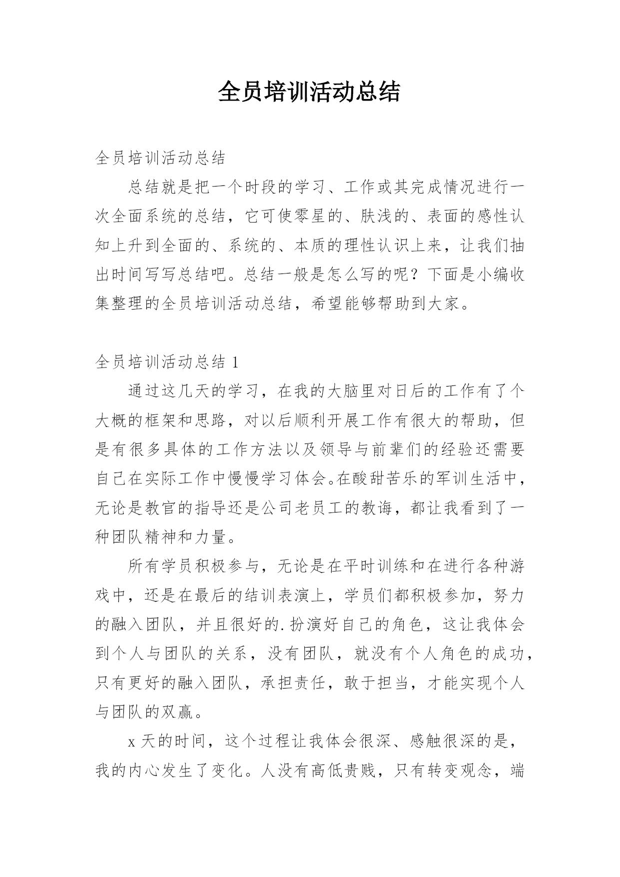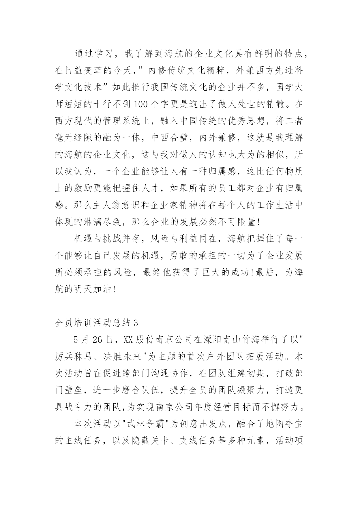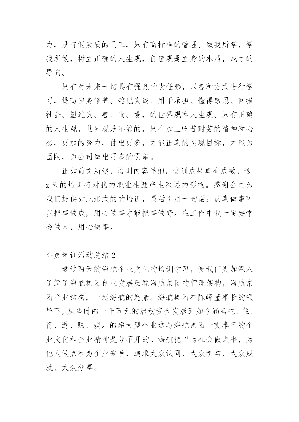 全员培训活动总结总结就是把一个时段的学习、工作或其完成情况进行一次全面系统的总结,它可使零星的、肤浅的、表面的感性认知上升到全面的、系统的、本质的理性认识上来,让我们抽出时间写写总结吧。总结一般是怎么写的呢?下面是小编收集整理的全员培训活动总结,希望能够帮助到大家。全员培训活动总结1通过这几天的学习,在我的大脑里对日后的工作有了个大概的框架和思路,对以后顺利开展工作有很大的帮助,但是有很多具体的工作方法以及领导与前辈们的经验还需要自己在实际工作中慢慢学习体会。在酸甜苦乐的军训生活中,无论是教官的指导还是公司老员工的教诲,都让我看到了一种团队精神和力量。所有学员积极参与,无论是在平时训练和在进行各种游戏中,还是在最后的结训表演上,学员们都积极参加,努力的融入团队,并且很好的.扮演好自己的角色,这让我体会到个人与团队的关系,没有团队,就没有个人角色的成功,只有更好的融入团队,承担责任,敢于担当,才能实现个人与团队的双赢。x天的时间,这个过程让我体会很深、感触很深的是,我的内心发生了变化。人没有高低贵贱,只有转变观念,端正心态,以努力换取肯定,用实力赢得尊重。学历不等于能力,没有低素质的员工,只有高标准的管理。做我所学,学我所做,树立正确的人生观,价值观是立身的本质,成才的导向。只有对未来一切具有强烈的责任感,以各种方式进行学习,提高自身修养。铭记真诚、用于承担、懂得感恩、回报社会、塑造真、善、责、爱,的世界观和人生观。只有正确的人生观,世界观是不够的,只有加上吃苦耐劳的精神和心态,更加的努力,付出更多,才能正真的实现目标,才能为团队,为公司做出更多的贡献。正如前文所述,培训内容详细,培训成果卓有成效,这x天的培训将对我的职业生涯产生深远的影响。感谢公司为我们提供如此形式的的培训,最后引用一句话:认真做事可以把事做成,用心做事才能把事做好。在工作中我一定要学会做人,用心做事。全员培训活动总结2通过两天的海航企业文化的培训学习,使我们更加深入了解了海航集团创业发展历程海航集团的管理架构,海航集团产业结构,一起海航的愿景。海航集团在陈峰董事长的领导下,从当时的一千万元的启动资金发展到如今涵盖吃、住、行、游、购、娱。的超大型企业这与海航集团一贯奉行的企业文化和企业精神是分不开的。海航把“为社会做点事,为他人做点事为企业宗旨,追求大众认同、大众参与、大众成就、大众分享。学习海航同仁共勉十条给我印象最深刻的是:“待人以至诚为基石”。人与人之间最根本的莫过于一个“诚”字。“诚”是培养个人善行的'土壤,如果每个人待人以至诚,自然能同心协力,相互信赖,这事业将必定成功!海航正是奉行一个“诚”字,才使企业发展壮大,使海航同仁精诚团结。共赴这一个伟大的事业中去。海航正是奉行一个“诚”字,才能在业内树立起一个极其良好的信誉,使企业走向共存、共荣、共赢。为推动和谐企业、和谐中国、和谐世界的建设而不懈努力!“凡事以预立而不劳”对于一个企业如果没有一个长远的发展目标没有一个切合实际紧贴市场的规划,没有一个超前的战略和一个灵活的战术则企业将无法发展壮大。而对于我们个人如果没有一个长远的人生规划和理想,则这个人生将会失去方向我们在工作中应谨记此训条,凡事都要有充分的准备,详实的调研基础,严谨的处事预案。以使在具体实施中做到心中有数,有序自信,则能做到事半功倍。“推己及人难又难”人活在世上都是相互的,我们自己在享受幸福的同时,一定依赖了别人。在工作中,员工之间,团队之间都有可能在某些事上存在不同于别人的观点。关键是我们怎样去处理,怎样去理解。凡事都能以大局为重,用一颗包容的心凡事都能多为对方想一想。且能够善于在对方那里吸取营养来完善自己,那么我们的集体将更加和谐工作效率将更高。通过学习,我了解到海航的企业文化具有鲜明的特点,在日益变革的今天,”内修传统文化精粹,外兼西方先进科学文化技术”如此推行我国传统文化的企业并不多,国学大师短短的十行不到100个字更是道出了做人处世的精髓。在西方现代的管理系统上,融入中国传统的优秀思想,将二者毫无缝隙的融为一体,中西合璧,内外兼修,这就是我理解的海航的企业文化,这与我对做人的认知也大为的相似,所以我认为,一个企业能够让人有一种归属感,这比任何物质上的激励更能把握住人才,如果所有的员工都对企业有归属感。那么主人翁意识和企业家精神将在每个人的工作生活中体现的淋漓尽致,那么企业的发展必然不可限量!机遇与挑战并存,风险与利益同在,海航把握住了每一个能够让自己发展的机遇,勇敢的承担的一切为了企业发展所必须承担的风险,最终他获得了巨大的成功!最后,为海航的明天加油!全员培训活动总结35月26日,XX股份南京公司在溧阳南山竹海举行了以"厉兵秣马、决胜未来"为主题的首次户外团队拓展活动。本次活动旨在促进跨部门沟通协作,在团队组建初期,打破部