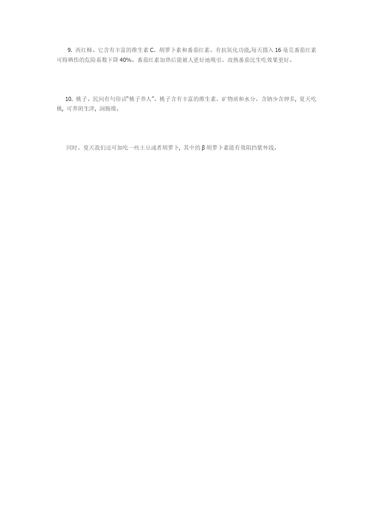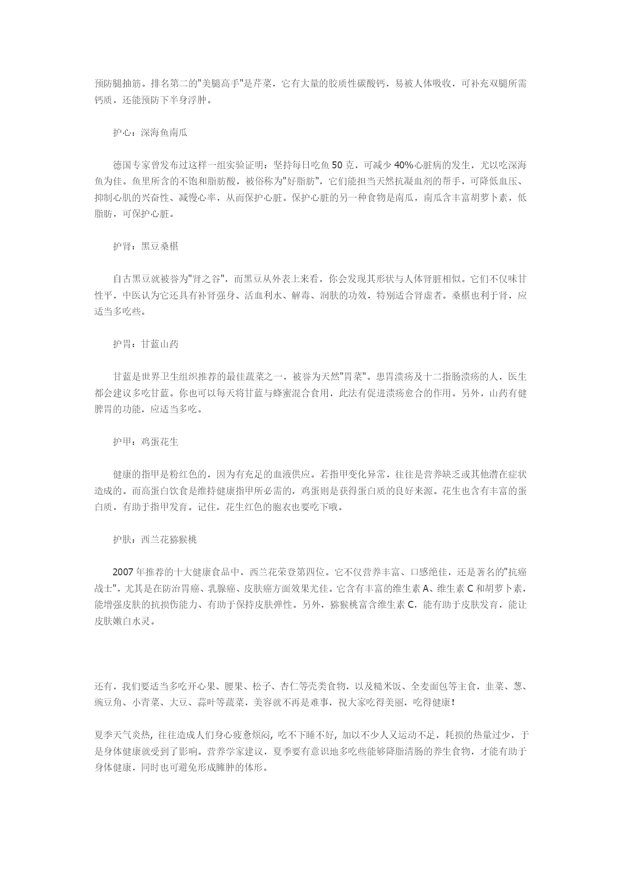 女性养生食品,夏季养生食物,每天需要摄取多少蛋白质,缺乏蛋白质的危害,维生素c的学问,人体需要哪些矿物质,含钙的食物,必须营养素吃不够会怎样来源:HYPERLINK"javascript:showReg(0);"闫静的日志女性养生食品俗话说,女人靠养,要对得住自己的身体,有舒适和成就感,就一定要会保养自己哦~那么,你知道大脑、心脏、肺、头发等都需要什么样的食物营养吗?现给你提供一张全身的"食物养生路线图",告诉你从头到脚的饮食秘方,让你吃得美丽,吃得健康。护脑:菠菜核桃因拥有超氧化物歧化酶(SOD)等成分的"还原食物",可以阻止脑血管的病变而保护大脑。哪些属于"还原食物"呢?专家研究认为,菠菜首当其冲。其次,核桃的蛋白质丰富,有助于滋养和保护你的大脑。护眼:红薯胡萝卜胡萝卜中含有丰富的胡萝卜素,可转化为维生素A。而维生素A素有"护眼小卫士"之称,如果人体缺乏它,眼睛感受弱光的能力便会下降,对黑暗环境的适应能力也会减退,严重时容易患上夜盲症。因此,我们要多吃胡萝卜。除胡萝卜之外,红薯中也富含丰富的胡萝卜素,能提供丰富的维生素A,可以增进视力,而且常食红薯对皮肤有好处,可适当多吃红薯。护发:黑芝麻生姜海带黑芝麻能令人头发乌黑,生姜能令毛发生长,还有海带,营养专家认为,经常食用海带不但能补充身体的碘元素,而且对头发的生长、滋润、亮泽也都具有特殊功效。护肺:番茄银耳英国的最新研究发现,每星期吃番茄3次以上可以预防呼吸系统疾病,保护双肺免受细菌的感染。但番茄红素的含量与番茄中可溶性糖的含量是成反比的,也就是说,越是不甜的西红柿,其中番茄红素含量越高。银耳也有护肺功能,有利于呼吸器官。护腿:香蕉芹菜含钾元素丰富的香蕉是食物中排名第一的"美腿高手",它所含丰富的钾元素能帮助你伸展腿部肌肉和预防腿抽筋。排名第二的"美腿高手"是芹菜,它有大量的胶质性碳酸钙,易被人体吸收,可补充双腿所需钙质,还能预防下半身浮肿。护心:深海鱼南瓜德国专家曾发布过这样一组实验证明:坚持每日吃鱼50克,可减少40%心脏病的发生,尤以吃深海鱼为佳。鱼里所含的不饱和脂肪酸,被俗称为"好脂肪",它们能担当天然抗凝血剂的帮手,可降低血压、抑制心肌的兴奋性、减慢心率,从而保护心脏。保护心脏的另一种食物是南瓜,南瓜含丰富胡萝卜素,低脂肪,可保护心脏。护肾:黑豆桑椹自古黑豆就被誉为"肾之谷",而黑豆从外表上来看,你会发现其形状与人体肾脏相似。它们不仅味甘性平,中医认为它还具有补肾强身、活血利水、解毒、润肤的功效,特别适合肾虚者。桑椹也利于肾,应适当多吃些。护胃:甘蓝山药甘蓝是世界卫生组织推荐的最佳蔬菜之一,被誉为天然"胃菜"。患胃溃疡及十二指肠溃疡的人,医生都会建议多吃甘蓝。你也可以每天将甘蓝与蜂蜜混合食用,此法有促进溃疡愈合的作用。另外,山药有健脾胃的功能,应适当多吃。护甲:鸡蛋花生健康的指甲是粉红色的,因为有充足的血液供应。若指甲变化异常,往往是营养缺乏或其他潜在症状造成的。而高蛋白饮食是维持健康指甲所必需的,鸡蛋则是获得蛋白质的良好来源。花生也含有丰富的蛋白质,有助于指甲发育。记住,花生红色的胞衣也要吃下哦。护肤:西兰花猕猴桃2007年推荐的十大健康食品中,西兰花荣登第四位。它不仅营养丰富、口感绝佳,还是著名的"抗癌战士",尤其是在防治胃癌、乳腺癌、皮肤癌方面效果尤佳。它含有丰富的维生素A、维生素C和胡萝卜素,能增强皮肤的抗损伤能力、有助于保持皮肤弹性。另外,猕猴桃富含维生素C,能有助于皮肤发育,能让皮肤嫩白水灵。还有,我们要适当多吃开心果、腰果、松子、杏仁等壳类食物,以及糙米饭、全麦面包等主食,韭菜、葱、豌豆角、小青菜、大豆、蒜叶等蔬菜,美容就不再是难事,祝大家吃得美丽,吃得健康!夏季天气炎热,往往造成人们身心疲惫烦闷,吃不下睡不好,加以不少人又运动不足,耗损的热量过少,于是身体健康就受到了影响。营养学家建议,夏季要有意识地多吃些能够降脂清肠的养生食物,才能有助于身体健康,同时也可避免形成臃肿的体形。1.玉米。含丰富的钙、磷、镁、铁、硒及维生素A、E与B族维生素、胡萝卜素等,还富含纤维素。玉米对胆囊炎、胆结石、黄疸型肝炎和糖尿病等,都有辅助治疗作用。此外,常食玉米油,可降低血胆固醇并软化血管。2.红薯。红薯含有丰富的膳食纤维和胶质类等容积性排便物质,可谓“肠道清道夫”。另外,红薯还有很强的降低血中胆固醇、维持血液酸碱平衡、延缓衰老及防癌抗癌作用。3.海带。海带含有丰富的胶体纤维,能显著降低血清胆固醇,海带配绿豆熬粥食用能清热解毒,利水泄热。4.银耳。银耳中含有多种维生素、氨基酸、葡萄糖、葡萄糖醛酸,并含有脂肪、蛋白质、硫、磷、镁、钙、钾、钠和微量元素,所含的银耳多糖可降低高脂大鼠的血清胆固醇,并有抗血栓功能,可少量冰糖加水熬成粥食用。5.红枣。多食能提高机体抗氧化