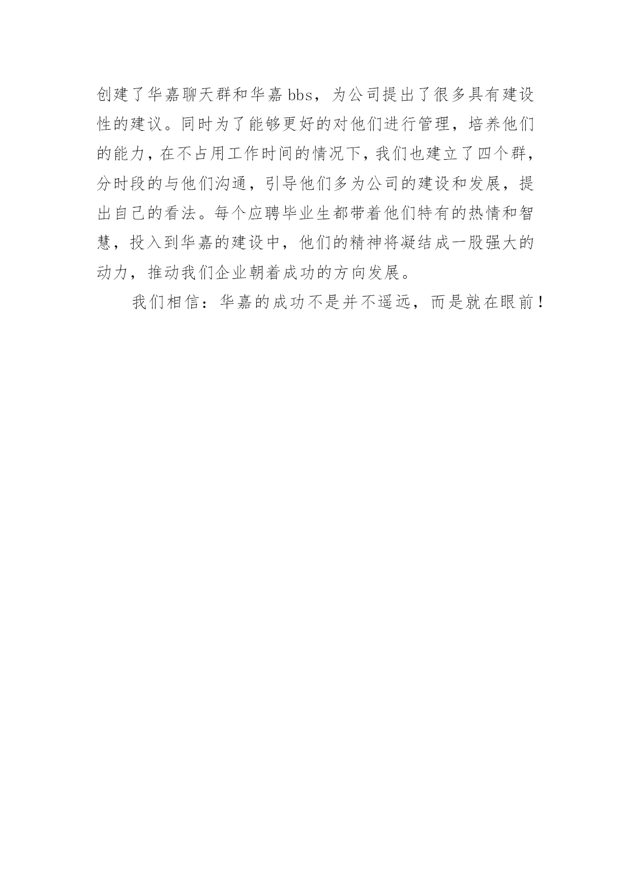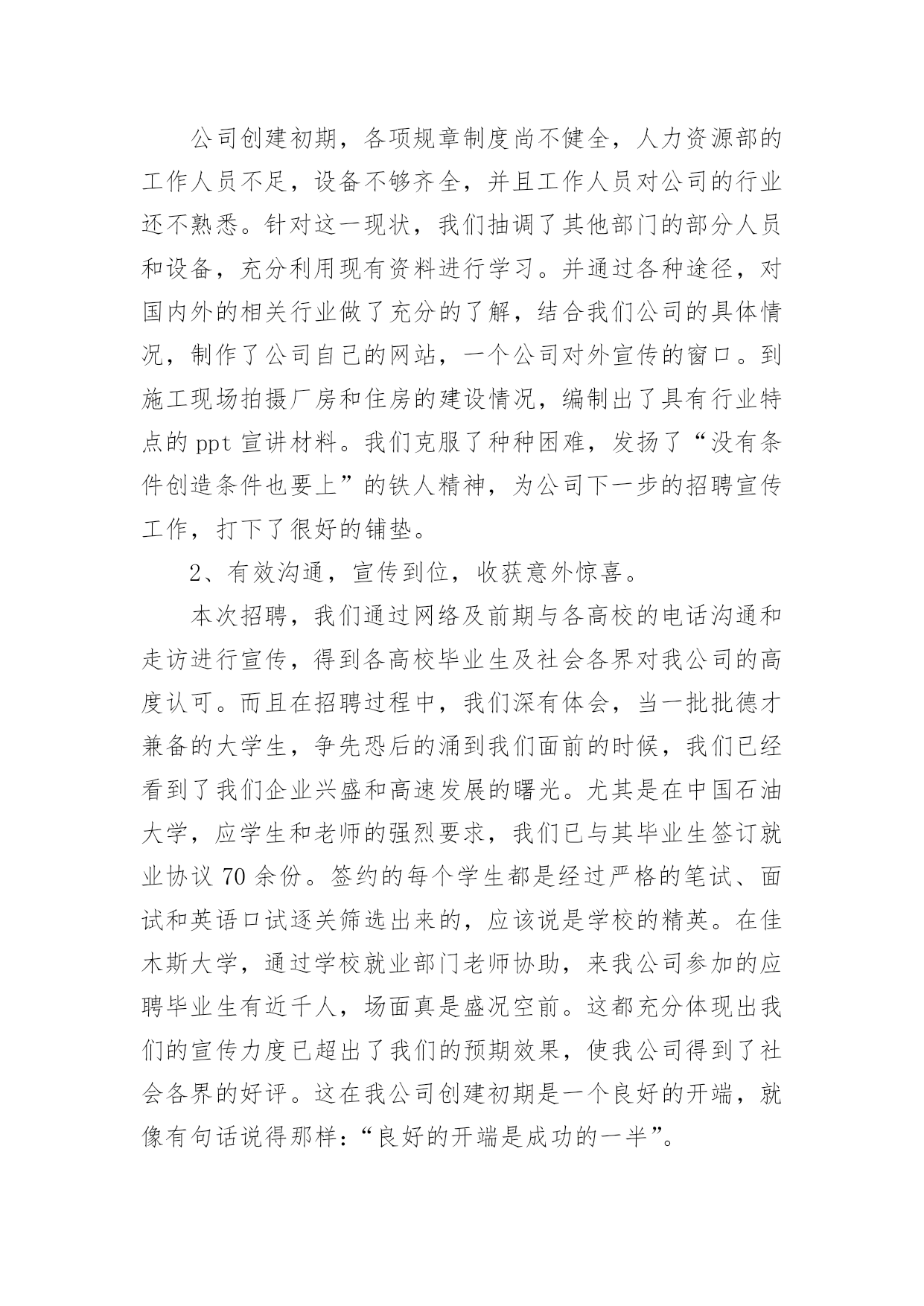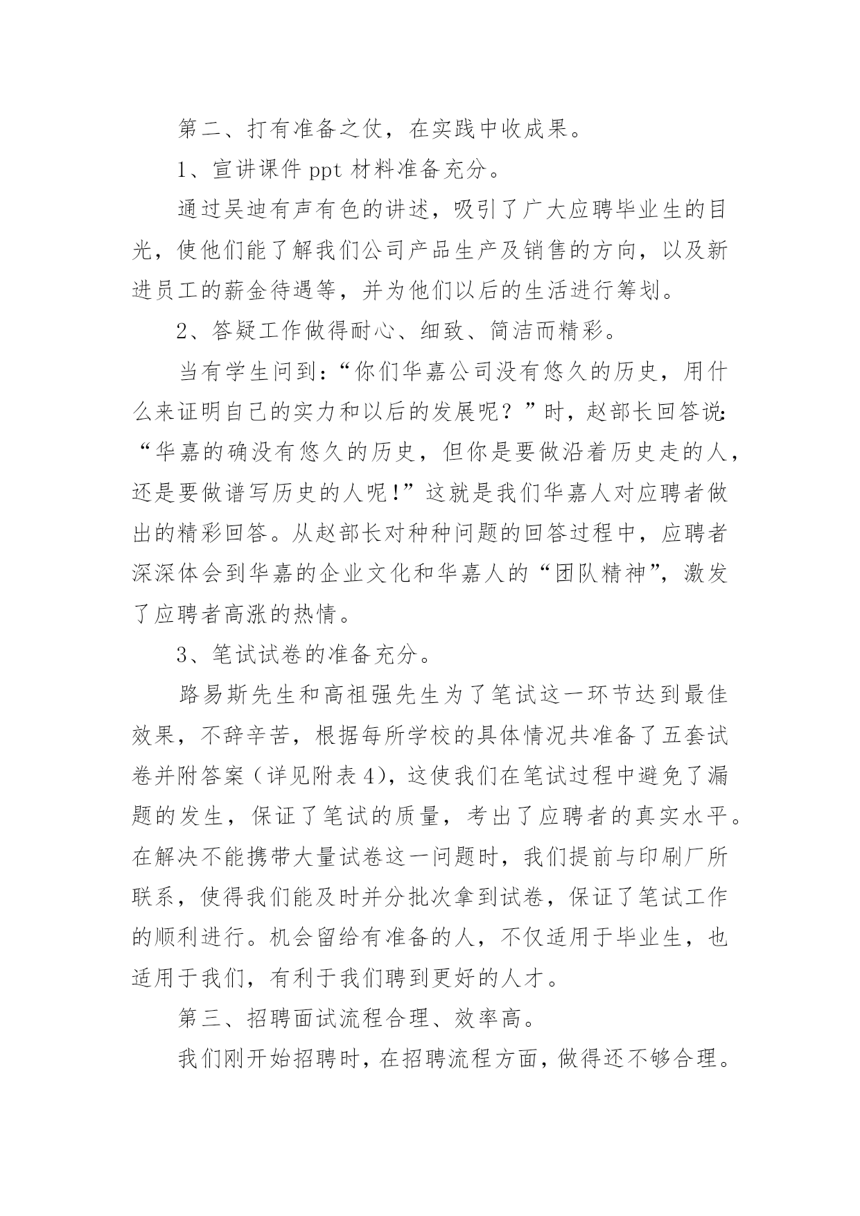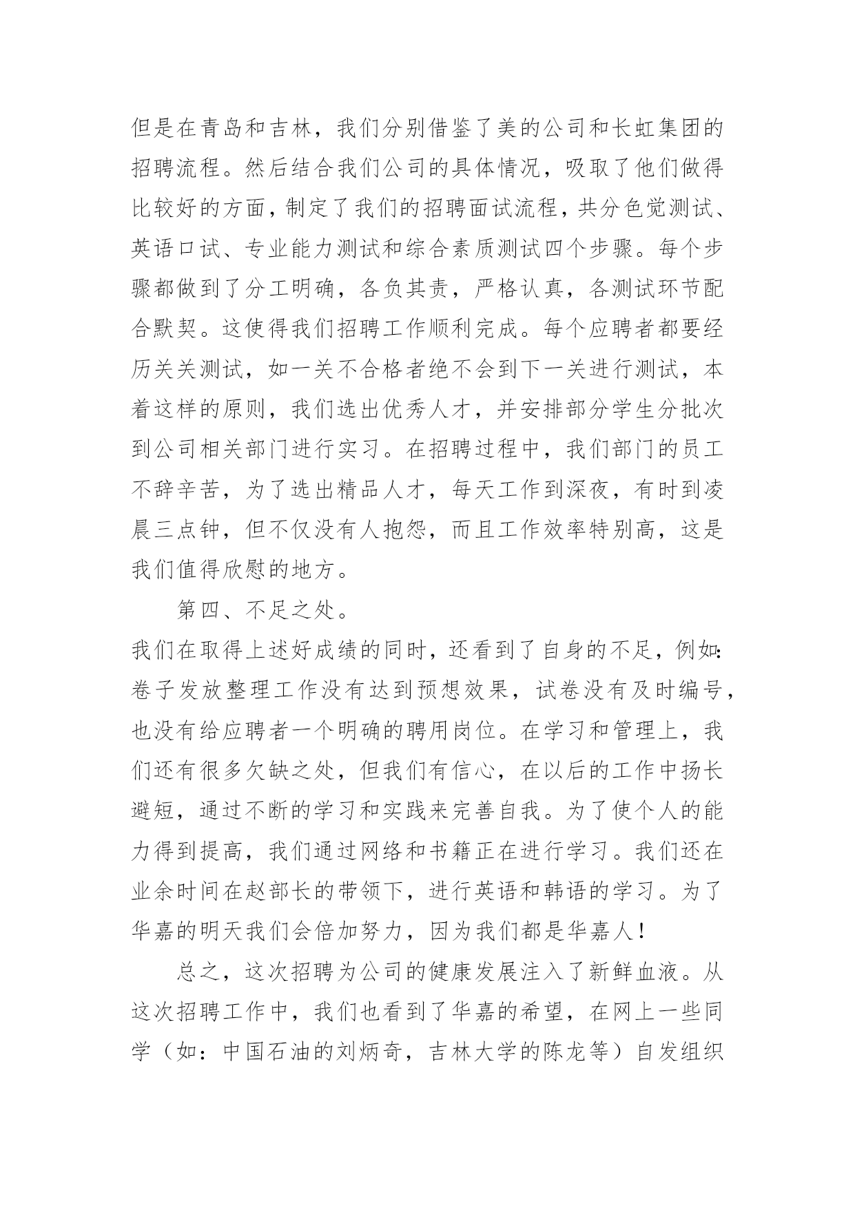 人力资源部工作总结-其他工作总结人力资源部工作总结-其他工作总结当今时代是信息的时代,是飞速发展的时代,在这个高速发展的时代中,我们公司应运而生。从国际的形势看国内的发展,任何企业的兴衰成败,不仅仅取决于资金的雄厚、设备的精良和管理者的管理水平,更在于企业对人才的培养。根据我们企业及行业的特点,我人力资源部打破以往的招聘模式,特与省内外各高校取得联系,采取校园现场招聘的方式选拔人才。参加人员有:路易斯先生、高祖强先生、赵春雨女士、吴迪、张晶、李杰、修士君。历时近两个月,经过我们通力协作、共同努力,取得了可喜的成绩,选拔出优秀人才为公司人才储备增添了新的活力,同时这也为公司的更好发展提供了有利条件。本次招聘工作从9月26日起正式开始,11月15日结束,先后走访了华瑞学院、东方学院、德强学院、中国石油大学(华东校区)、黑龙江科技学院、哈尔滨理工大学、哈尔滨工程大学、黑龙江工程学院、黑龙江大学、佳木斯大学、吉林大学、哈尔滨工业大学、齐齐哈尔大学等多家高校,共有XX余人参加考试(见附表1、2、3)。现对此次招聘工作做如下总结。第一、前期铺垫,网络宣传,起到决定作用。1、排除万难,创造条件,做好前期铺垫。公司创建初期,各项规章制度尚不健全,人力资源部的工作人员不足,设备不够齐全,并且工作人员对公司的行业还不熟悉。针对这一现状,我们抽调了其他部门的部分人员和设备,充分利用现有资料进行学习。并通过各种途径,对国内外的相关行业做了充分的了解,结合我们公司的具体情况,制作了公司自己的网站,一个公司对外宣传的窗口。到施工现场拍摄厂房和住房的建设情况,编制出了具有行业特点的ppt宣讲材料。我们克服了种种困难,发扬了“没有条件创造条件也要上”的铁人精神,为公司下一步的招聘宣传工作,打下了很好的铺垫。2、有效沟通,宣传到位,收获意外惊喜。本次招聘,我们通过网络及前期与各高校的电话沟通和走访进行宣传,得到各高校毕业生及社会各界对我公司的高度认可。而且在招聘过程中,我们深有体会,当一批批德才兼备的大学生,争先恐后的涌到我们面前的时候,我们已经看到了我们企业兴盛和高速发展的曙光。尤其是在中国石油大学,应学生和老师的强烈要求,我们已与其毕业生签订就业协议70余份。签约的每个学生都是经过严格的笔试、面试和英语口试逐关筛选出来的,应该说是学校的精英。在佳木斯大学,通过学校就业部门老师协助,来我公司参加的应聘毕业生有近千人,场面真是盛况空前。这都充分体现出我们的宣传力度已超出了我们的预期效果,使我公司得到了社会各界的好评。这在我公司创建初期是一个良好的开端,就像有句话说得那样:“良好的开端是成功的一半”。第二、打有准备之仗,在实践中收成果。1、宣讲课件ppt材料准备充分。通过吴迪有声有色的讲述,吸引了广大应聘毕业生的目光,使他们能了解我们公司产品生产及销售的方向,以及新进员工的薪金待遇等,并为他们以后的生活进行筹划。2、答疑工作做得耐心、细致、简洁而精彩。当有学生问到:“你们华嘉公司没有悠久的历史,用什么来证明自己的实力和以后的发展呢?”时,赵部长回答说:“华嘉的确没有悠久的历史,但你是要做沿着历史走的人,还是要做谱写历史的人呢!”这就是我们华嘉人对应聘者做出的精彩回答。从赵部长对种种问题的回答过程中,应聘者深深体会到华嘉的企业文化和华嘉人的“团队精神”,激发了应聘者高涨的热情。3、笔试试卷的准备充分。路易斯先生和高祖强先生为了笔试这一环节达到最佳效果,不辞辛苦,根据每所学校的具体情况共准备了五套试卷并附答案(详见附表4),这使我们在笔试过程中避免了漏题的发生,保证了笔试的质量,考出了应聘者的真实水平。在解决不能携带大量试卷这一问题时,我们提前与印刷厂所联系,使得我们能及时并分批次拿到试卷,保证了笔试工作的顺利进行。机会留给有准备的人,不仅适用于毕业生,也适用于我们,有利于我们聘到更好的人才。第三、招聘面试流程合理、效率高。我们刚开始招聘时,在招聘流程方面,做得还不够合理。但是在青岛和吉林,我们分别借鉴了美的公司和长虹集团的招聘流程。然后结合我们公司的具体情况,吸取了他们做得比较好的方面,制定了我们的招聘面试流程,共分色觉测试、英语口试、专业能力测试和综合素质测试四个步骤。每个步骤都做到了分工明确,各负其责,严格认真,各测试环节配合默契。这使得我们招聘工作顺利完成。每个应聘者都要经历关关测试,如一关不合格者绝不会到下一关进行测试,本着这样的原则,我们选出优秀人才,并安排部分学生分批次到公司相关部门进行实习。在招聘过程中,我们部门的员工不辞辛苦,为了选出精品人才,每天工作到深夜,有时到凌晨三点钟,但不仅没有人抱怨,而且工作效率特别高,这是我们值得欣慰的地方。第四、不足之处。我们在取得上述好成绩的同时,还看到了自身的不足,例如:卷子发放整理工作没有达到预想效果,试卷