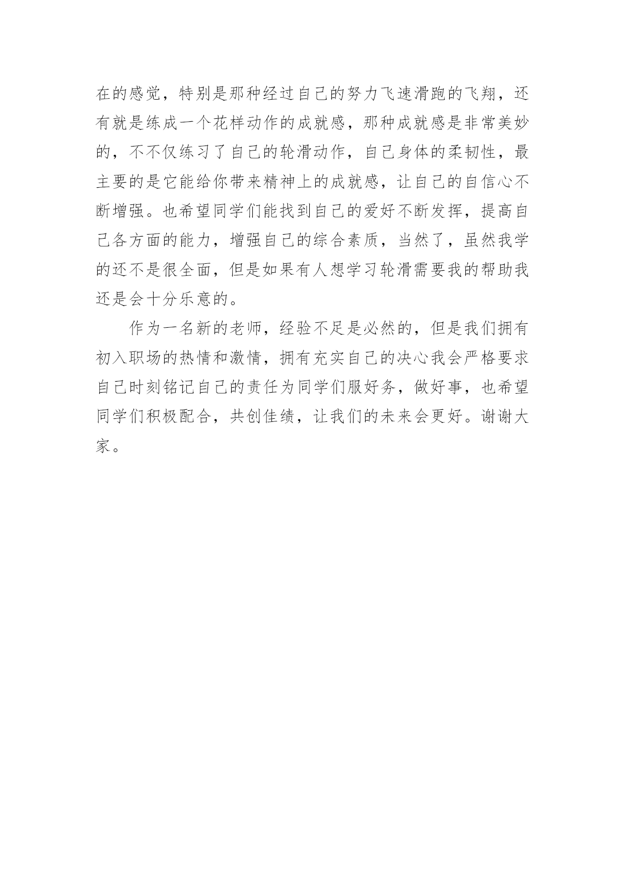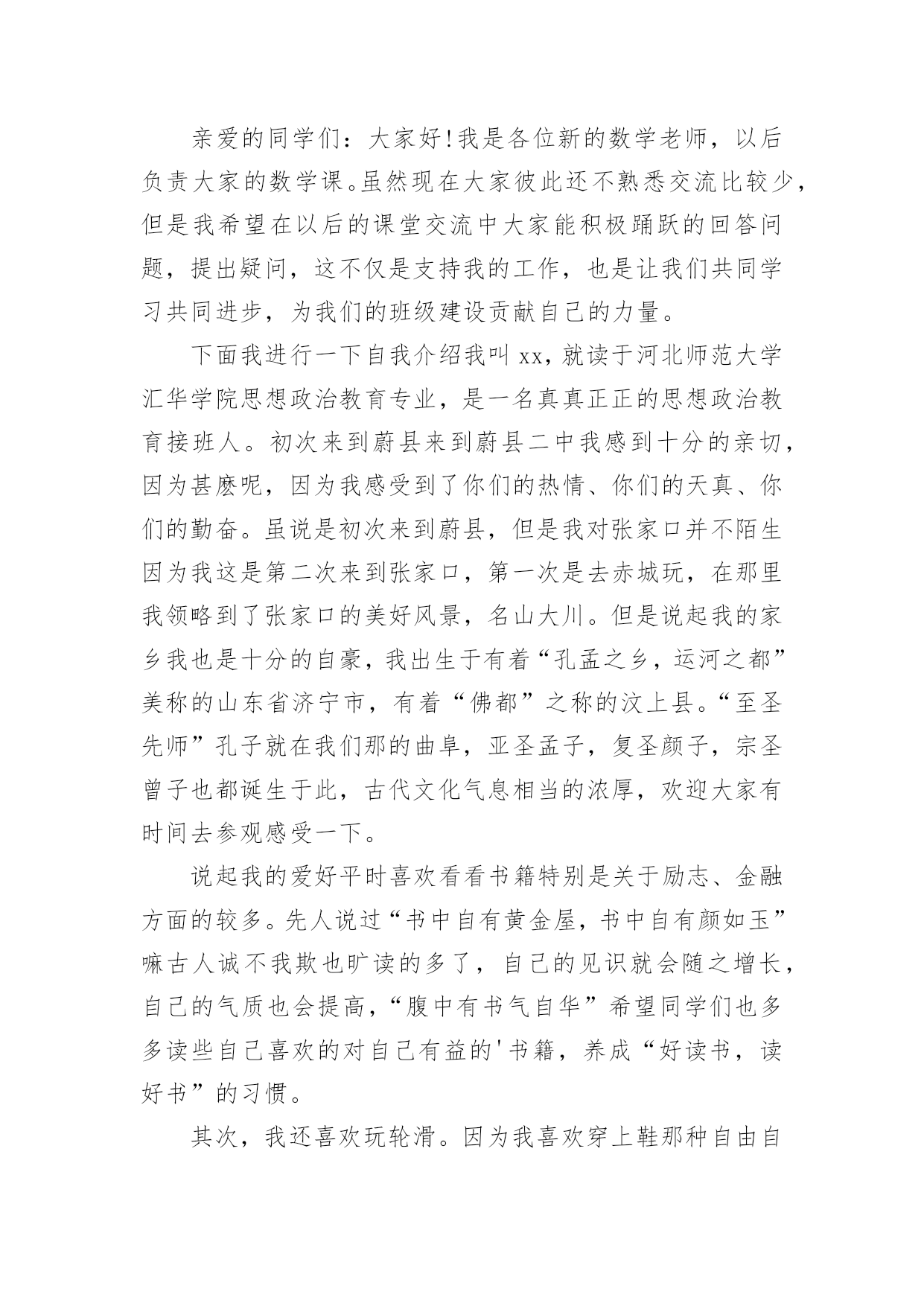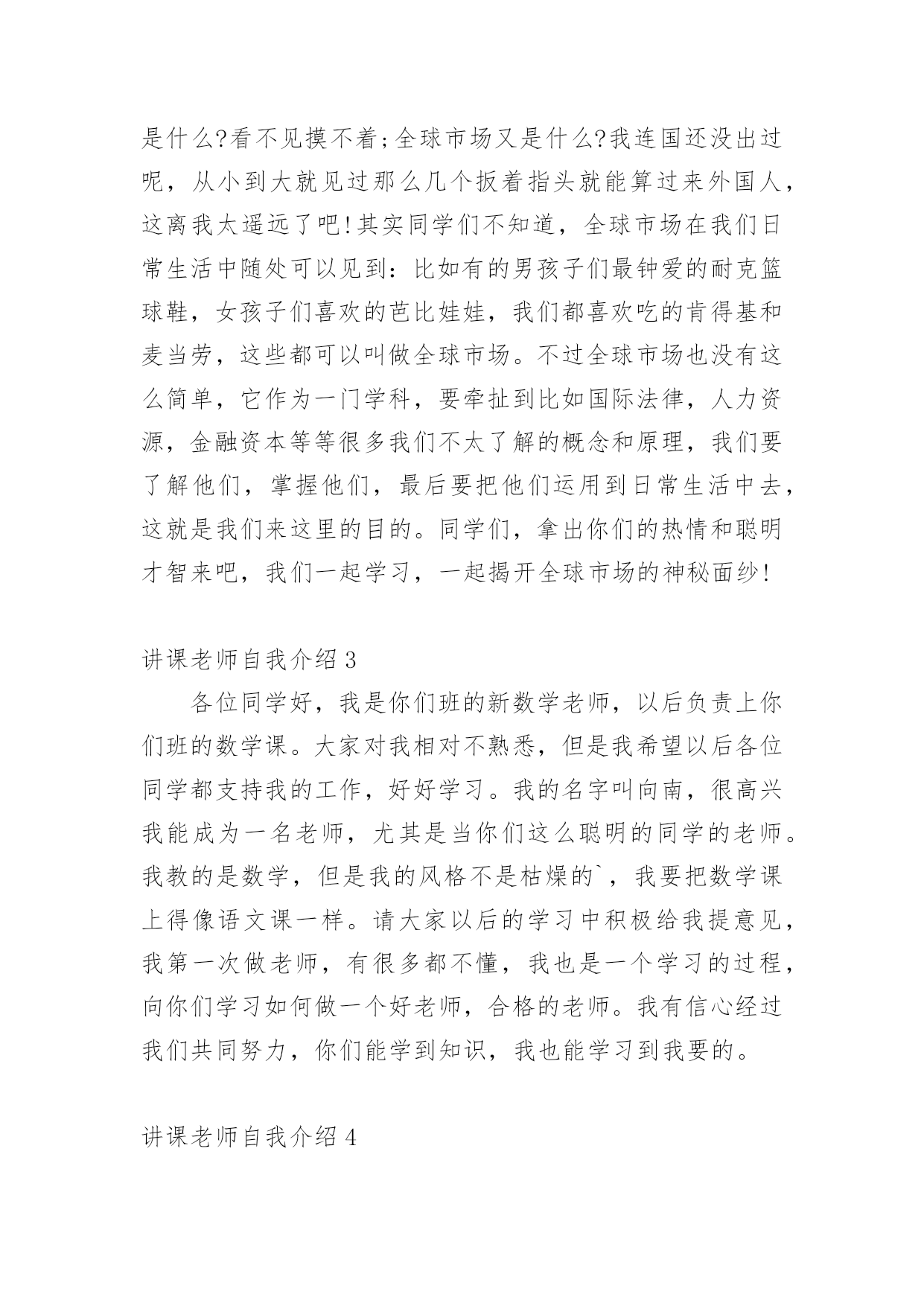 讲课老师自我介绍讲课老师自我介绍1我叫***,是本学期新来的语文教师,刚毕业于浙江师范大学。我非常高兴也非常荣幸的加入到班集体这个大家庭中来,这里不仅为我提供了一个成长锻炼、展示自我的良好平台,也让我有机会认识更多的'新同事、新朋友。虽然之前已经实习过一段时间了,但还是有许多方方面面的知识需要向大家学习,还希望在以后的工作中请大家能够多多指教。讲课老师自我介绍2同学们大家好!很高兴认识大家,虽然我们都是初次见面,但我已经迫不及待想要认识每一位同学了!首先让我介绍下自己吧:我叫,你们可以叫我王老师,但我更喜欢大家叫我芸姐姐,随便你们只要不要叫我芸阿姨就行了。我来自中国科学院电工研究所,每天打交道的东西是如何把我们身边无所不在却又变化莫测的风能变为我们无时无刻不在使用的电能,是不是听起来很玄妙啊!我一开始也是这么认为的,慢慢接触多了才知道无论什么领域的`学问,都是从我们生活中最简单的事物和现象开始一步一步积累和发展起来的。就像这学期我们要和大家一同学习的《JA全球市场》这门课,同学们可能一听到这个名字就会产生很多疑问:市场是什么?看不见摸不着;全球市场又是什么?我连国还没出过呢,从小到大就见过那么几个扳着指头就能算过来外国人,这离我太遥远了吧!其实同学们不知道,全球市场在我们日常生活中随处可以见到:比如有的男孩子们最钟爱的耐克篮球鞋,女孩子们喜欢的芭比娃娃,我们都喜欢吃的肯得基和麦当劳,这些都可以叫做全球市场。不过全球市场也没有这么简单,它作为一门学科,要牵扯到比如国际法律,人力资源,金融资本等等很多我们不太了解的概念和原理,我们要了解他们,掌握他们,最后要把他们运用到日常生活中去,这就是我们来这里的目的。同学们,拿出你们的热情和聪明才智来吧,我们一起学习,一起揭开全球市场的神秘面纱!讲课老师自我介绍3各位同学好,我是你们班的新数学老师,以后负责上你们班的数学课。大家对我相对不熟悉,但是我希望以后各位同学都支持我的工作,好好学习。我的名字叫向南,很高兴我能成为一名老师,尤其是当你们这么聪明的同学的老师。我教的是数学,但是我的风格不是枯燥的`,我要把数学课上得像语文课一样。请大家以后的学习中积极给我提意见,我第一次做老师,有很多都不懂,我也是一个学习的过程,向你们学习如何做一个好老师,合格的老师。我有信心经过我们共同努力,你们能学到知识,我也能学习到我要的。讲课老师自我介绍4亲爱的同学们:大家好!我是各位新的数学老师,以后负责大家的数学课。虽然现在大家彼此还不熟悉交流比较少,但是我希望在以后的课堂交流中大家能积极踊跃的回答问题,提出疑问,这不仅是支持我的工作,也是让我们共同学习共同进步,为我们的班级建设贡献自己的力量。下面我进行一下自我介绍我叫xx,就读于河北师范大学汇华学院思想政治教育专业,是一名真真正正的思想政治教育接班人。初次来到蔚县来到蔚县二中我感到十分的亲切,因为甚麽呢,因为我感受到了你们的热情、你们的天真、你们的勤奋。虽说是初次来到蔚县,但是我对张家口并不陌生因为我这是第二次来到张家口,第一次是去赤城玩,在那里我领略到了张家口的美好风景,名山大川。但是说起我的家乡我也是十分的自豪,我出生于有着“孔孟之乡,运河之都”美称的山东省济宁市,有着“佛都”之称的汶上县。“至圣先师”孔子就在我们那的曲阜,亚圣孟子,复圣颜子,宗圣曾子也都诞生于此,古代文化气息相当的浓厚,欢迎大家有时间去参观感受一下。说起我的爱好平时喜欢看看书籍特别是关于励志、金融方面的较多。先人说过“书中自有黄金屋,书中自有颜如玉”嘛古人诚不我欺也旷读的多了,自己的见识就会随之增长,自己的气质也会提高,“腹中有书气自华”希望同学们也多多读些自己喜欢的对自己有益的'书籍,养成“好读书,读好书”的习惯。其次,我还喜欢玩轮滑。因为我喜欢穿上鞋那种自由自在的感觉,特别是那种经过自己的努力飞速滑跑的飞翔,还有就是练成一个花样动作的成就感,那种成就感是非常美妙的,不不仅练习了自己的轮滑动作,自己身体的柔韧性,最主要的是它能给你带来精神上的成就感,让自己的自信心不断增强。也希望同学们能找到自己的爱好不断发挥,提高自己各方面的能力,增强自己的综合素质,当然了,虽然我学的还不是很全面,但是如果有人想学习轮滑需要我的帮助我还是会十分乐意的。作为一名新的老师,经验不足是必然的,但是我们拥有初入职场的热情和激情,拥有充实自己的决心我会严格要求自己时刻铭记自己的责任为同学们服好务,做好事,也希望同学们积极配合,共创佳绩,让我们的未来会更好。谢谢大家。