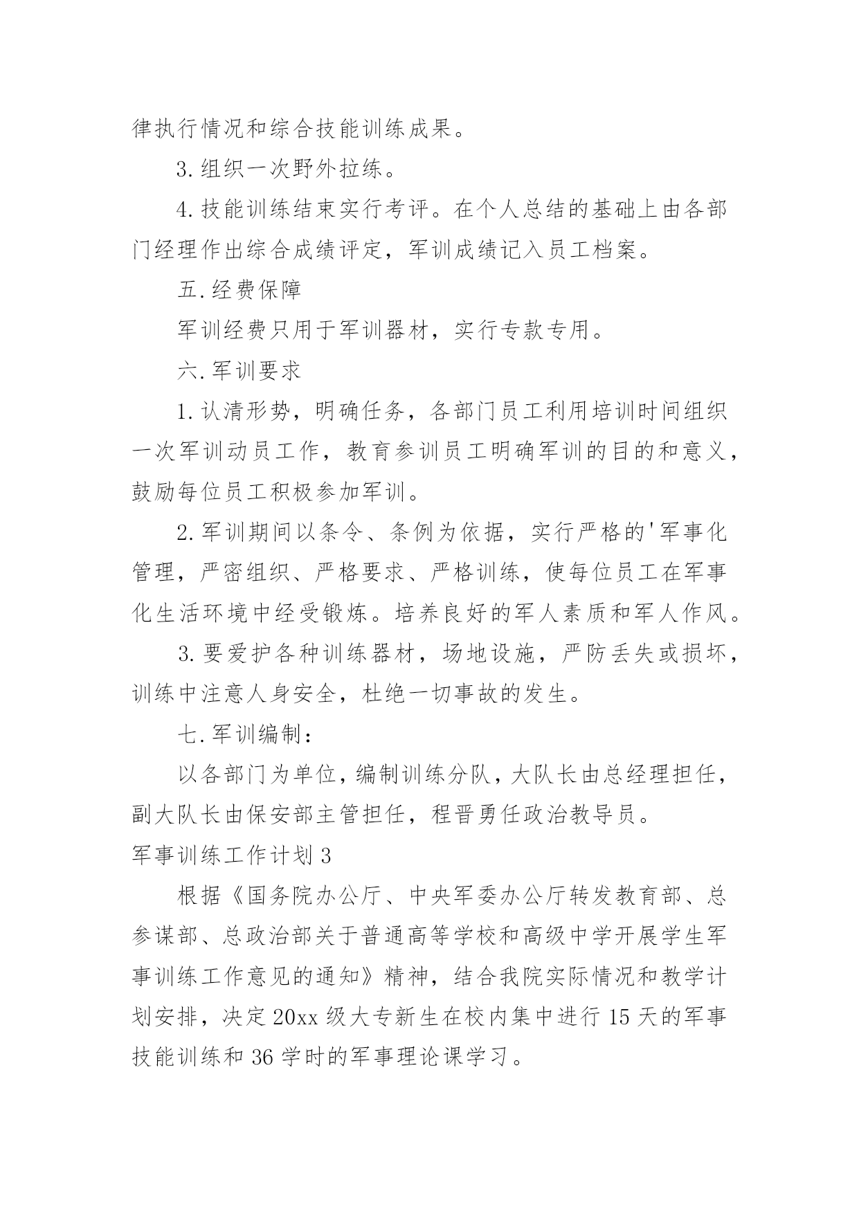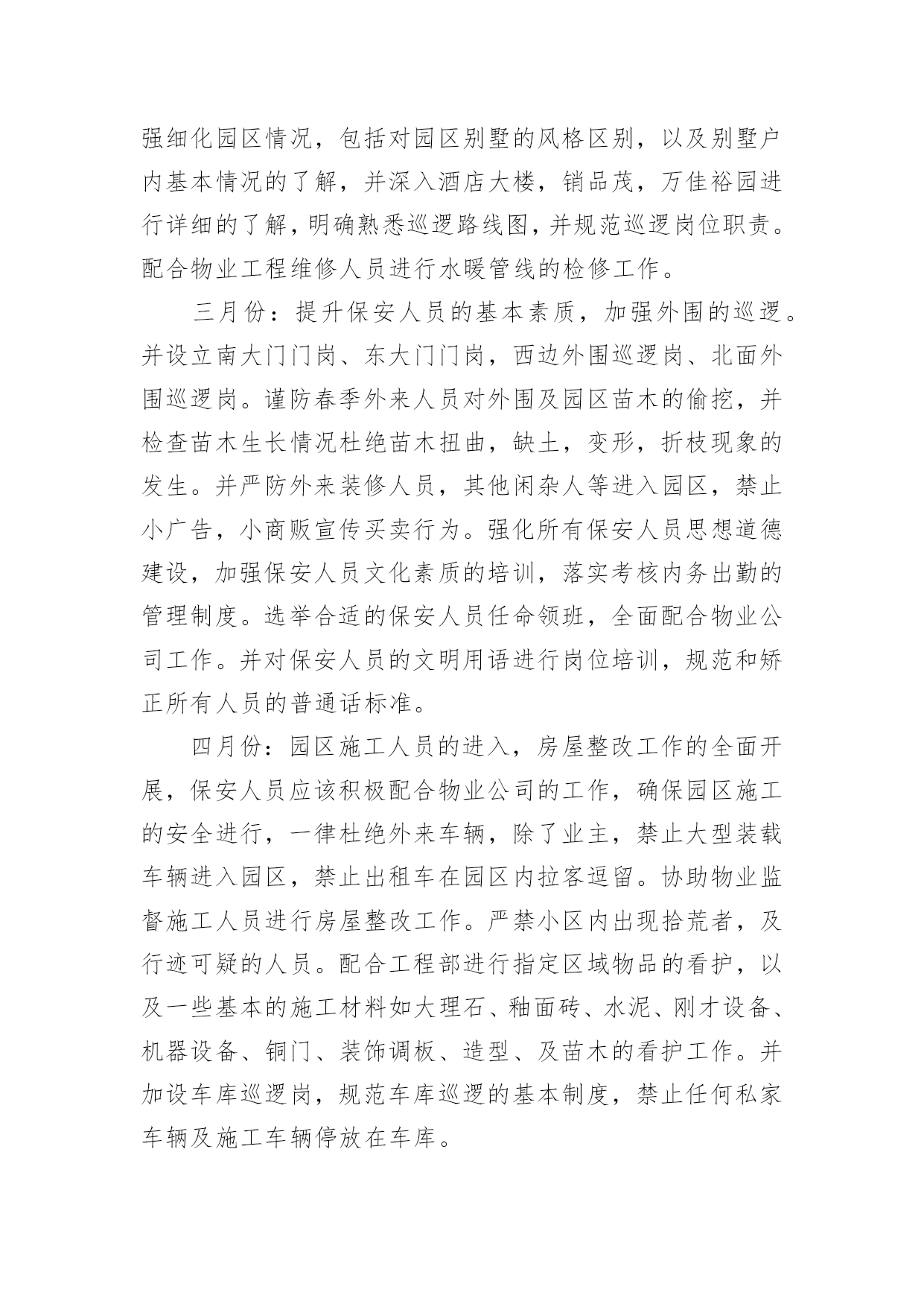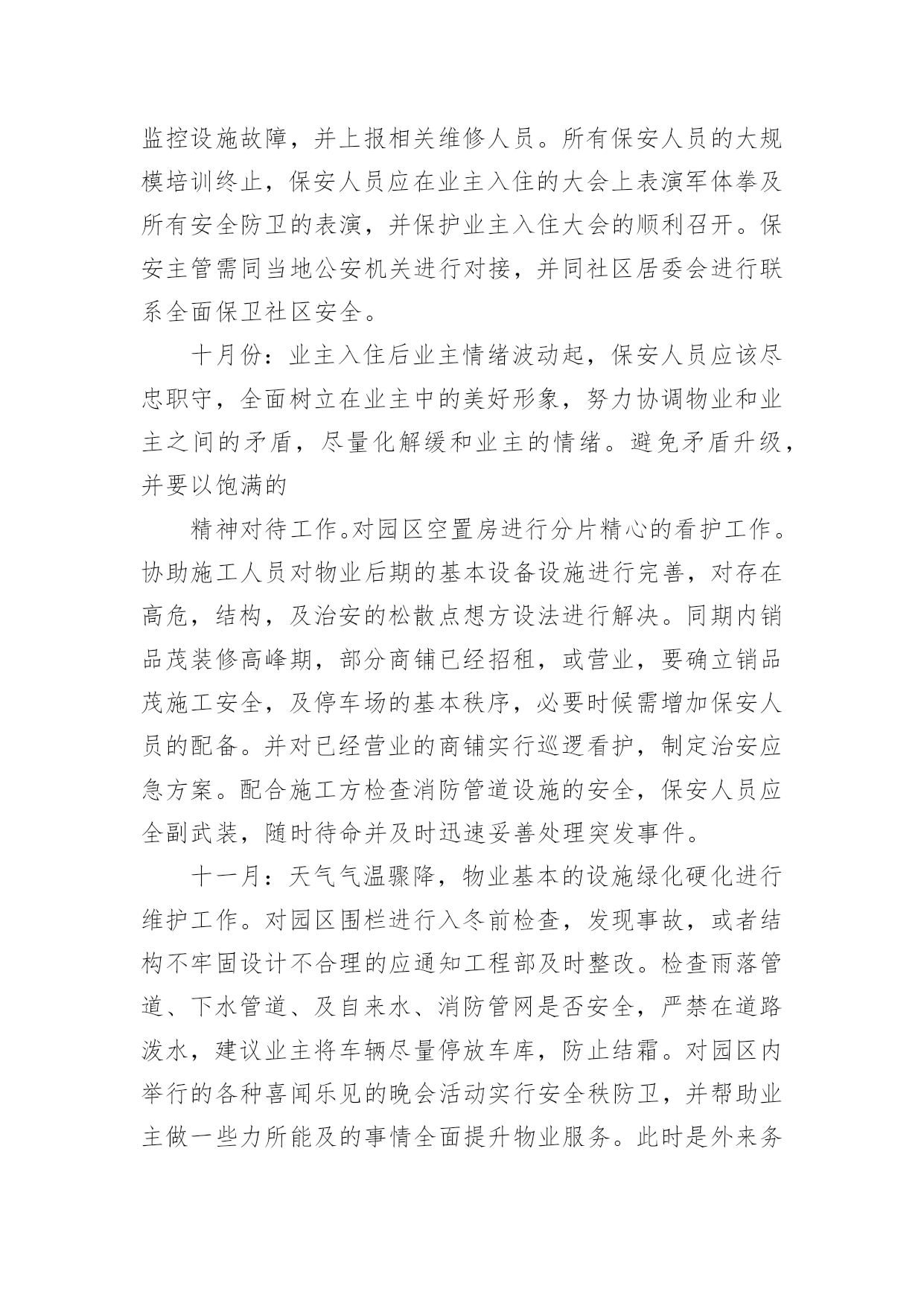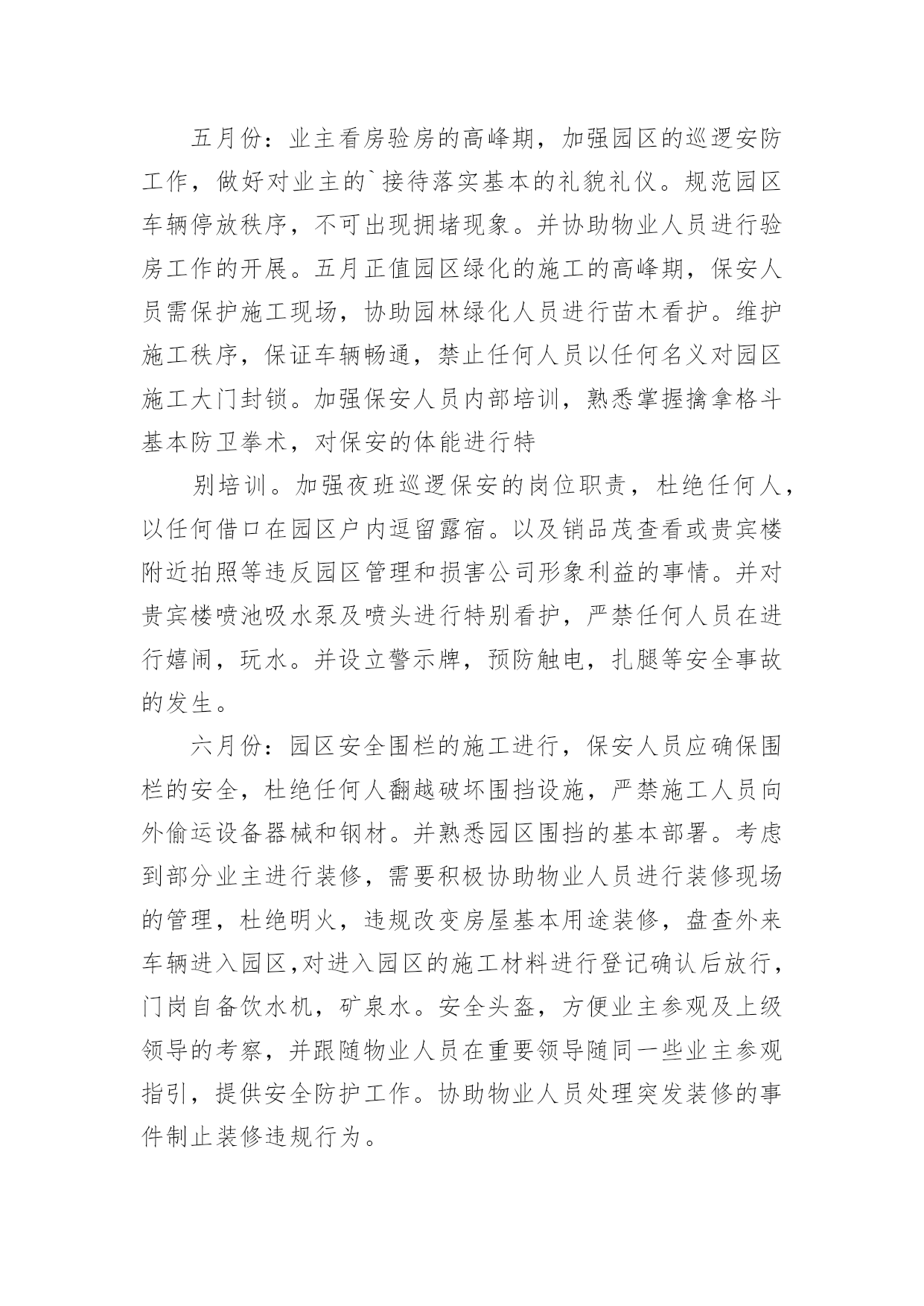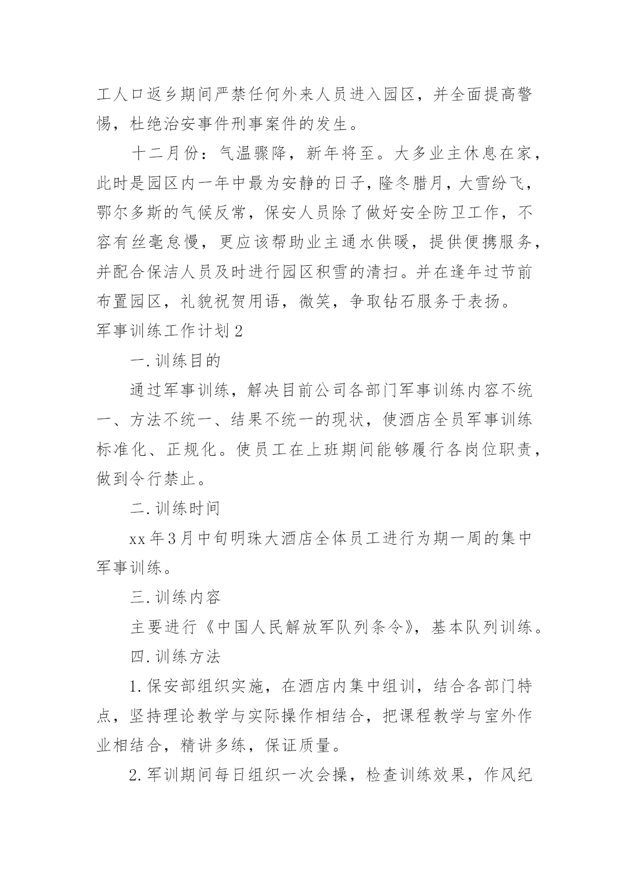 军事训练工作计划军事训练工作计划时间过得真快,总在不经意间流逝,我们又将接触新的知识,学习新的技能,积累新的经验,是时候写一份详细的计划了。相信大家又在为写计划犯愁了吧?以下是小编为大家整理的军事训练工作计划,仅供参考,欢迎大家阅读。军事训练工作计划1根据交房进度和入住的基本情况并依据万佳豪园别墅区总体的安防形势制定计划。一月份:保安人员内部整编,并进行长达一个月的集训。协助物业人员对所有房屋的基本设施,情况进行全面盘点,找出存在的问题报告给物业部。并协助清理路障,预防火灾,偷盗,禁止外来逗留人员,协助酒店贵宾楼保洁对外面场地积雪进行全面清扫工作。在春节里,举办保安人员喜闻乐见的茶话会、及文艺表演,组织保安看电影,猜灯谜,并给保安人员过节发放适当的节日津贴。队长和领班分别汇报年度工作计划,主管召开专门会议确立年度工作计划和工作部署。二月份:加强保安人员的集训和思想道德建设,确定交房时间后,进行保安人员基本的素质培训,包括擒拿、格斗、安全防火,培训时间定为每天早晨2小时,双休日集中培训,定为每天4小时,全面为万宇房地产树立形象。保安人员加强细化园区情况,包括对园区别墅的风格区别,以及别墅户内基本情况的了解,并深入酒店大楼,销品茂,万佳裕园进行详细的了解,明确熟悉巡逻路线图,并规范巡逻岗位职责。配合物业工程维修人员进行水暖管线的检修工作。三月份:提升保安人员的基本素质,加强外围的巡逻。并设立南大门门岗、东大门门岗,西边外围巡逻岗、北面外围巡逻岗。谨防春季外来人员对外围及园区苗木的偷挖,并检查苗木生长情况杜绝苗木扭曲,缺土,变形,折枝现象的发生。并严防外来装修人员,其他闲杂人等进入园区,禁止小广告,小商贩宣传买卖行为。强化所有保安人员思想道德建设,加强保安人员文化素质的培训,落实考核内务出勤的管理制度。选举合适的保安人员任命领班,全面配合物业公司工作。并对保安人员的文明用语进行岗位培训,规范和矫正所有人员的普通话标准。四月份:园区施工人员的进入,房屋整改工作的全面开展,保安人员应该积极配合物业公司的工作,确保园区施工的安全进行,一律杜绝外来车辆,除了业主,禁止大型装载车辆进入园区,禁止出租车在园区内拉客逗留。协助物业监督施工人员进行房屋整改工作。严禁小区内出现拾荒者,及行迹可疑的人员。配合工程部进行指定区域物品的看护,以及一些基本的施工材料如大理石、釉面砖、水泥、刚才设备、机器设备、铜门、装饰调板、造型、及苗木的看护工作。并加设车库巡逻岗,规范车库巡逻的基本制度,禁止任何私家车辆及施工车辆停放在车库。五月份:业主看房验房的高峰期,加强园区的巡逻安防工作,做好对业主的`接待落实基本的礼貌礼仪。规范园区车辆停放秩序,不可出现拥堵现象。并协助物业人员进行验房工作的开展。五月正值园区绿化的施工的高峰期,保安人员需保护施工现场,协助园林绿化人员进行苗木看护。维护施工秩序,保证车辆畅通,禁止任何人员以任何名义对园区施工大门封锁。加强保安人员内部培训,熟悉掌握擒拿格斗基本防卫拳术,对保安的体能进行特别培训。加强夜班巡逻保安的岗位职责,杜绝任何人,以任何借口在园区户内逗留露宿。以及销品茂查看或贵宾楼附近拍照等违反园区管理和损害公司形象利益的事情。并对贵宾楼喷池吸水泵及喷头进行特别看护,严禁任何人员在进行嬉闹,玩水。并设立警示牌,预防触电,扎腿等安全事故的发生。六月份:园区安全围栏的施工进行,保安人员应确保围栏的安全,杜绝任何人翻越破坏围挡设施,严禁施工人员向外偷运设备器械和钢材。并熟悉园区围挡的基本部署。考虑到部分业主进行装修,需要积极协助物业人员进行装修现场的管理,杜绝明火,违规改变房屋基本用途装修,盘查外来车辆进入园区,对进入园区的施工材料进行登记确认后放行,门岗自备饮水机,矿泉水。安全头盔,方便业主参观及上级领导的考察,并跟随物业人员在重要领导随同一些业主参观指引,提供安全防护工作。协助物业人员处理突发装修的事件制止装修违规行为。七月份:装修人员大量入场,园区内增设保安安防部署,细化装修管理工作流程,对园区内所有苗木实行安全看护,发现枯死,落叶,土壤松动,折枝现象及时报告物业或园林相关负责人。时值园区道路进行二次硬化,保安人员应协助施工人员确保安全施工,加强硬化看护工作,禁止任何车辆在道路未能使用时候进入园区。帮助业主进行施工装修物品的看管工作。及时发现工程问题,防止园区内出现积水,道路破坏甚至坍塌现象。并及时查看维修井口,全面提升保安人员的综合素质。八月份:雨季到来,不少业主在装修,所有的木材,石岗板等,装修物件所有易受潮湿变形损坏的东西,保安人员需及时协助物业、施工方进行安全看护,必要时进行物品转移。门岗应配备合理的雨具方便业主出行,并提供一定的消暑药品。此时少数业主装修完毕,保安应对装修好的房子进行看护,发现问题能够及时处理,如处理