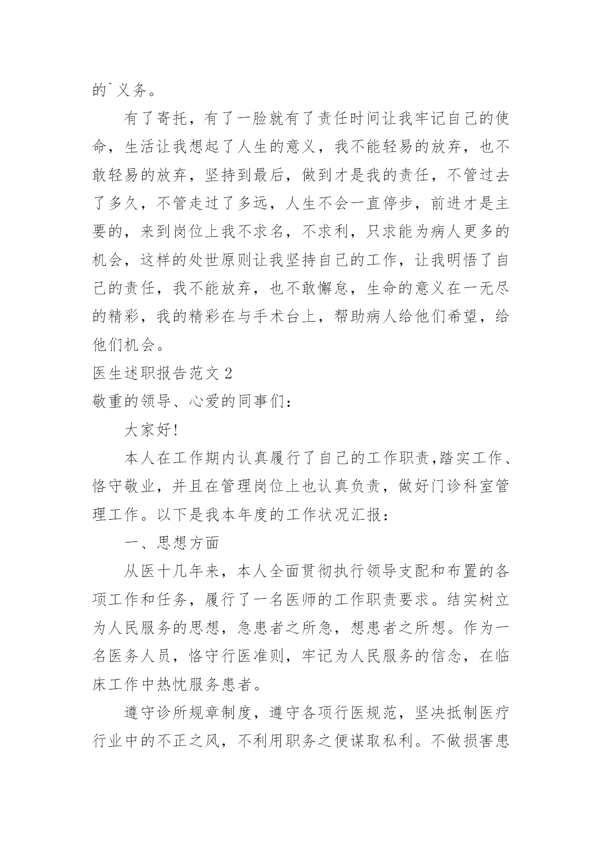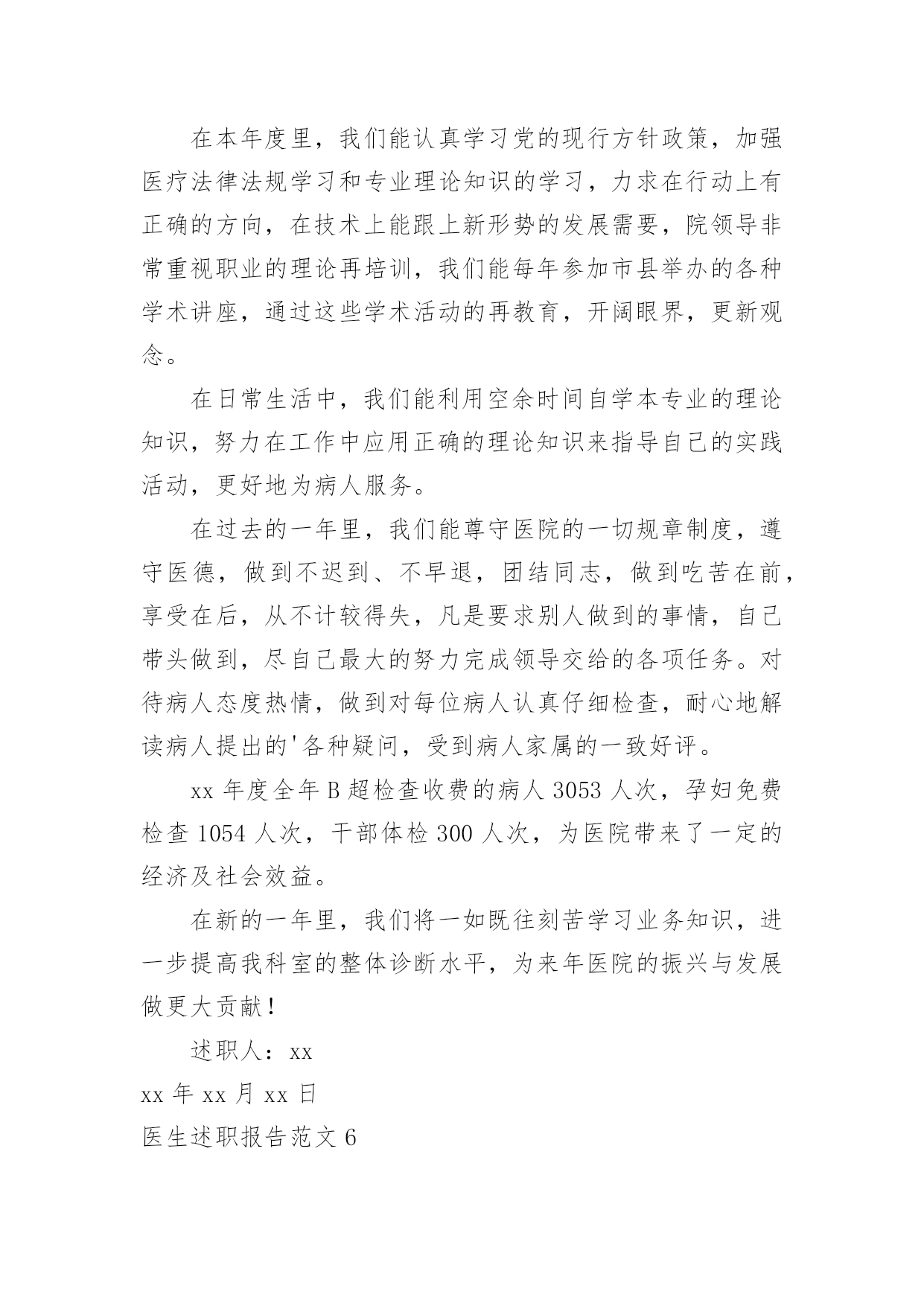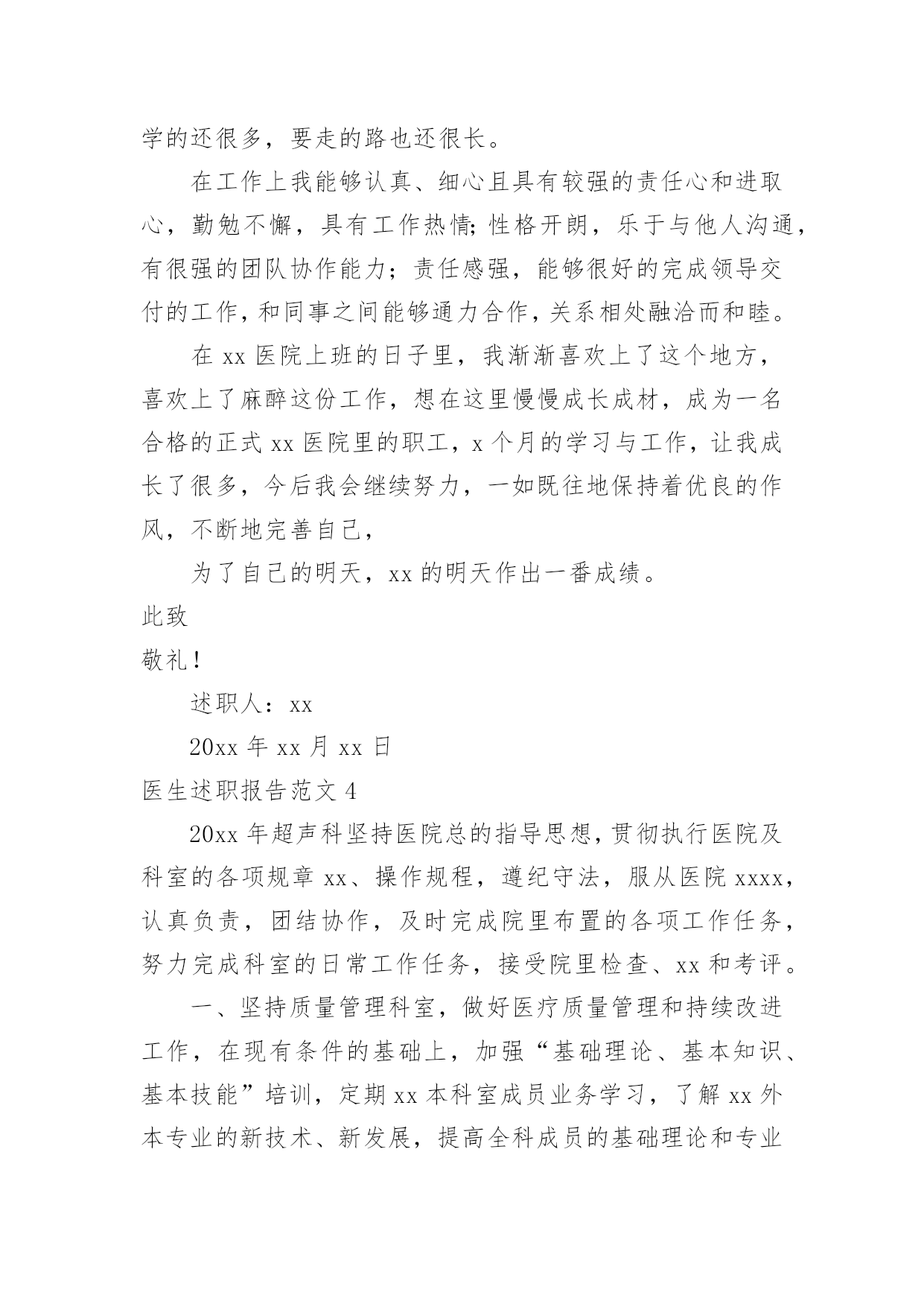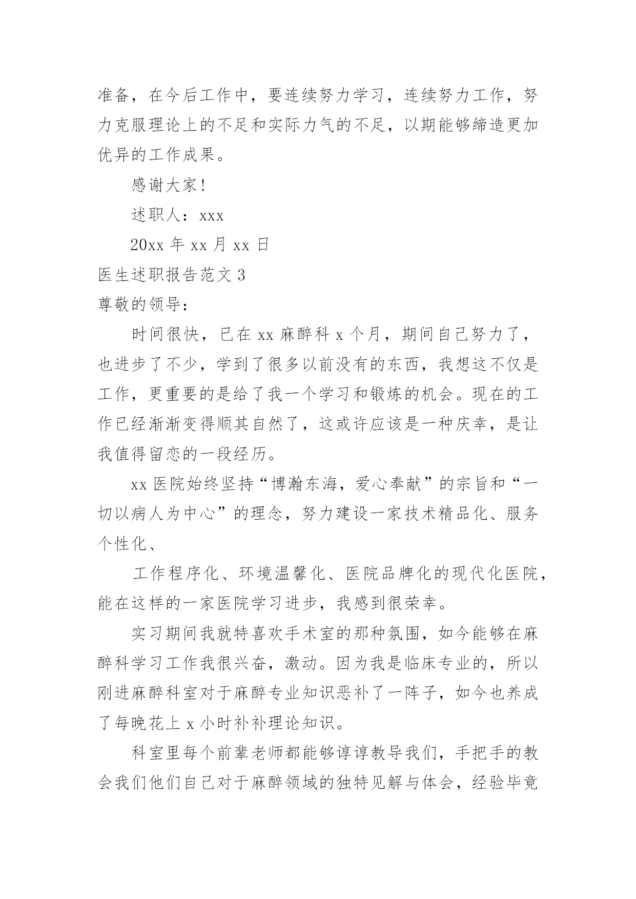 医生述职报告医生述职报告范文15篇随着个人素质的提升,报告有着举足轻重的地位,报告具有成文事后性的特点。我们应当如何写报告呢?以下是小编帮大家整理的医生述职报告范文,欢迎大家借鉴与参考,希望对大家有所帮助。医生述职报告范文1来到急诊科工作,xx年时间,成为了主治医生,同样工作的重担也到了我的肩上,不管道路有多艰难,都要一路走下去,给病人与希望,也是我对医院对国家的贡献。不会以时间为转移,永远坚定的做好工作。想到过去我只是一个普通医生的时候,不需要考虑很多,只要一步步做好就行,但是当了主治医生才知道工作有多艰难,拿起手术刀,有的沉重的重担和责任,有这不能分开的义务,作为一个愿意为了工作付出一辈子时间的人是非常疲惫的,总想着有时间好好的休息,好好的停留,但是有很多病人在等着我,期盼着。我是选择等待休息,还是继续工作?不为其他就为了他们对我的信任我就有责任给特他们足够的希望,没有希望的人生是悲剧的,没有机会的人生是没有可能的,我身为医生就担负着这样的责任,机会与时间并重,时间不能阻止自己的前进,勇敢的扛起病人的希望这才是我的`义务。有了寄托,有了一脸就有了责任时间让我牢记自己的使命,生活让我想起了人生的意义,我不能轻易的放弃,也不敢轻易的放弃,坚持到最后,做到才是我的责任,不管过去了多久,不管走过了多远,人生不会一直停步,前进才是主要的,来到岗位上我不求名,不求利,只求能为病人更多的机会,这样的处世原则让我坚持自己的工作,让我明悟了自己的责任,我不能放弃,也不敢懈怠,生命的意义在一无尽的精彩,我的精彩在与手术台上,帮助病人给他们希望,给他们机会。医生述职报告范文2敬重的领导、心爱的同事们:大家好!本人在工作期内认真履行了自己的工作职责,踏实工作、恪守敬业,并且在管理岗位上也认真负责,做好门诊科室管理工作。以下是我本年度的工作状况汇报:一、思想方面从医十几年来,本人全面贯彻执行领导支配和布置的各项工作和任务,履行了一名医师的工作职责要求。结实树立为人民服务的思想,急患者之所急,想患者之所想。作为一名医务人员,恪守行医准则,牢记为人民服务的信念,在临床工作中热忱服务患者。遵守诊所规章制度,遵守各项行医规范,坚决抵制医疗行业中的不正之风,不利用职务之便谋取私利。不做损害患者利益的事情,不做损害医院的行为。对待患者一视同仁,为患者多考虑,节约医疗费用,不开大处方、不开多余检查单,合理把握医疗费用,合理用药,让患者得到的服务,为患者谋福利。二、工作方面本人一贯能够认真并负责地做好医疗工作,在工作中,本人深切的.熟识到一个合格的医生应具备的素养和条件。努力提高自身的业务水平,不断加强业务理论学习,通过阅读大量业务杂志及书刊,学习有关医疗卫生学问,时常参预学术会议,极大地开阔了视野,扩大了学问面。始终坚持用新的理论技术指导业务工作促进自己业务水平的不断提高。始终坚持用新的理论技术指导业务工作,从而使自己能够娴熟把握多种常见病、多发病的诊断和处理技术和方法。工作中严格执行各种工作制度、诊疗常规和操作规程,认真负责地处理每一位病人,在程度上避开了误诊误治年来,本人仔认真细工作,踏踏实实做事,从未发生一起差错事故。三、学习方面尽力气完成作为一个医生的各项工作和任务。热忱接待每位前来就诊的患者,严格要求自己,不高傲自满,敬重领导,对年轻同事真诚地对待,相互学习,共同提高,遵守医院各项纪律,兢兢业业,任劳任怨,树立了自身良好形象。一年来,在各级领导的关怀和同事们的支持下,工作虽然取得了确定成果,但与要求相比还有差距,自己尚须进一步加强理论学习,并坚持理论联系实际并为实际服务的原则。我准备,在今后工作中,要连续努力学习,连续努力工作,努力克服理论上的不足和实际力气的不足,以期能够缔造更加优异的工作成果。感谢大家!述职人:xxx20xx年xx月xx日医生述职报告范文3尊敬的领导:时间很快,已在xx麻醉科x个月,期间自己努力了,也进步了不少,学到了很多以前没有的东西,我想这不仅是工作,更重要的是给了我一个学习和锻炼的机会。现在的工作已经渐渐变得顺其自然了,这或许应该是一种庆幸,是让我值得留恋的一段经历。xx医院始终坚持“博瀚东海,爱心奉献”的宗旨和“一切以病人为中心”的理念,努力建设一家技术精品化、服务个性化、工作程序化、环境温馨化、医院品牌化的现代化医院,能在这样的一家医院学习进步,我感到很荣幸。实习期间我就特喜欢手术室的那种氛围,如今能够在麻醉科学习工作我很兴奋,激动。因为我是临床专业的,所以刚进麻醉科室对于麻醉专业知识恶补了一阵子,如今也养成了每晚花上x小时补补理论知识。科室里每个前辈老师都能够谆谆教导我们,手把手的教会我们他们自己对于麻醉领域的独特见解与体会,经验毕竟是有些书本上所欠缺的,这让我们倍感弥足珍惜。在这里我真的很感激xx老师,她不仅能当面