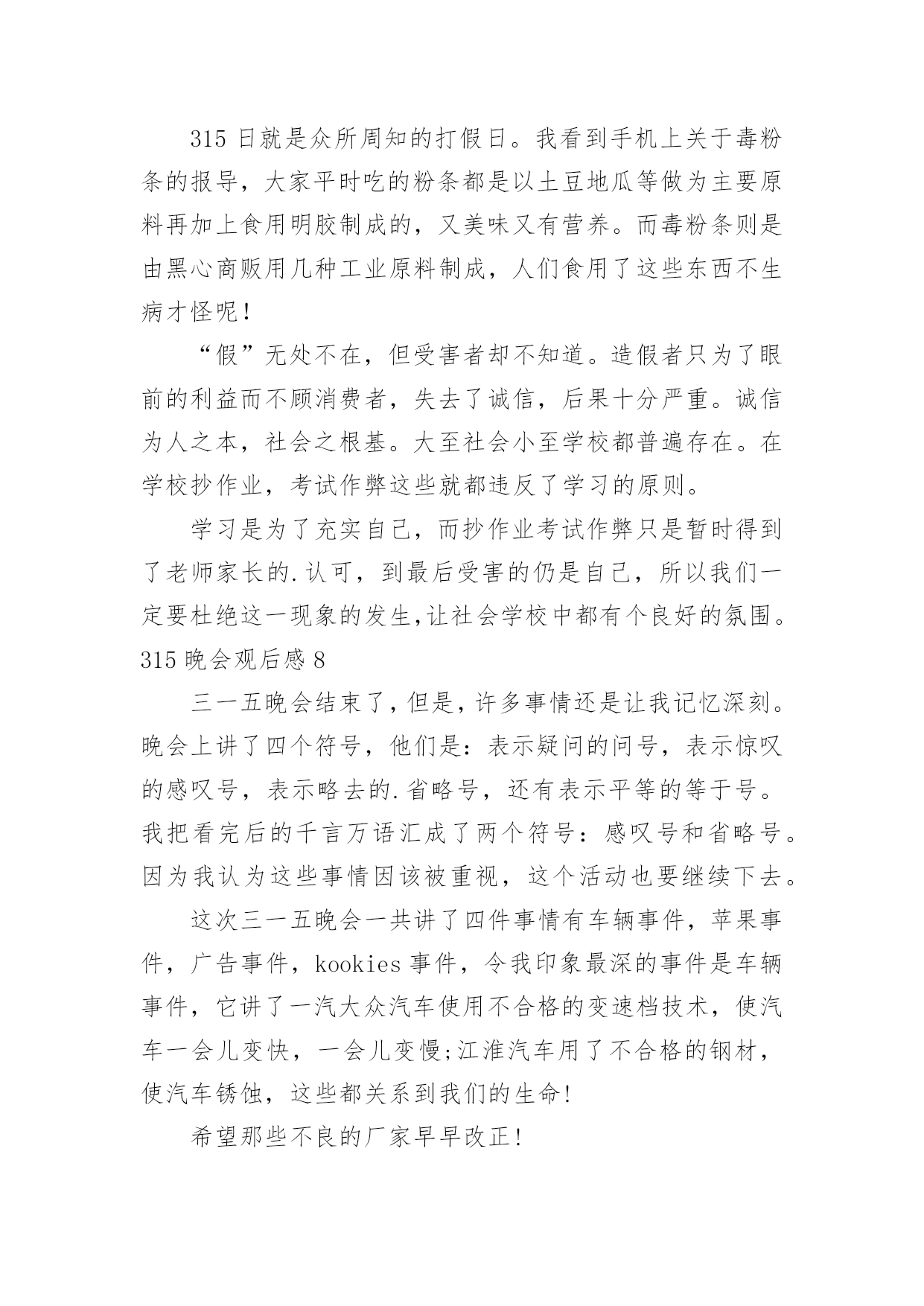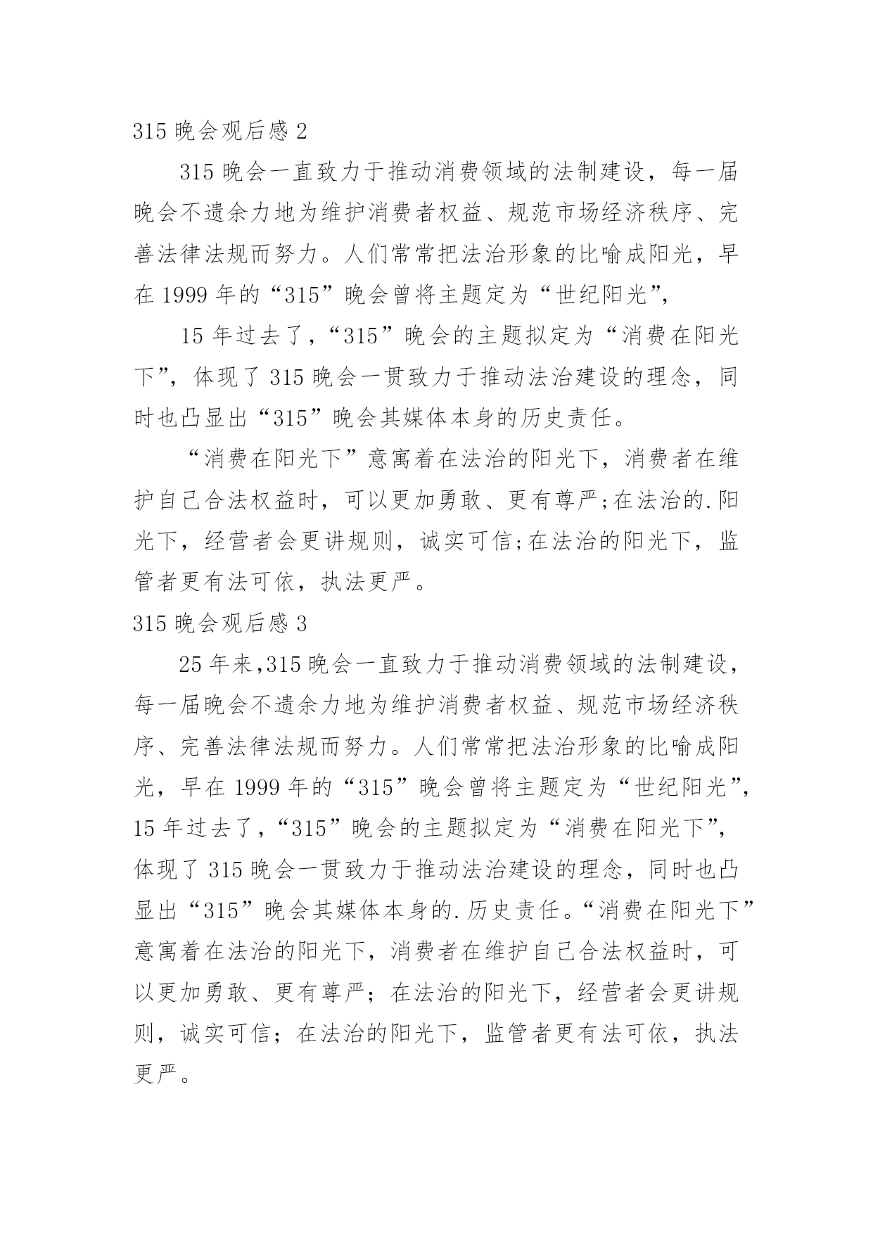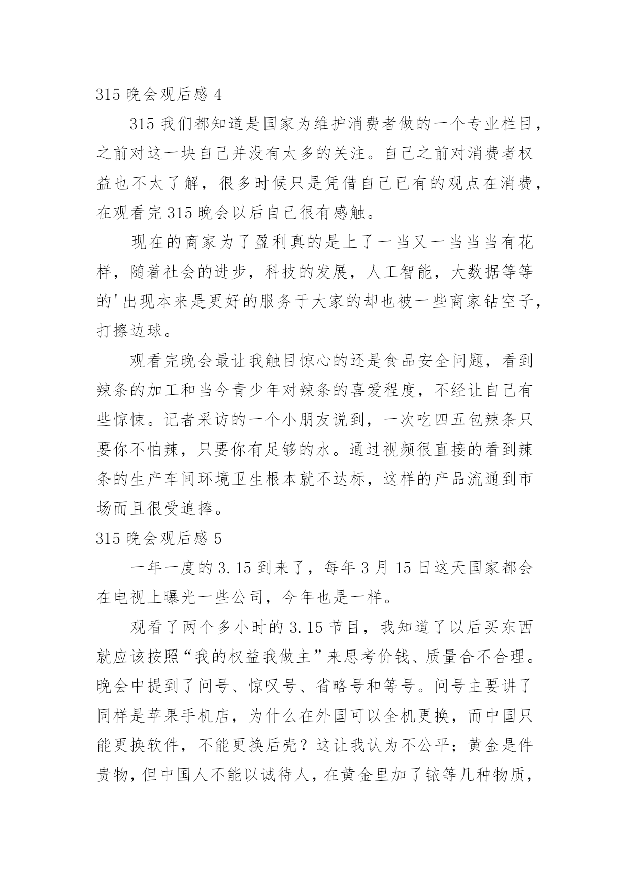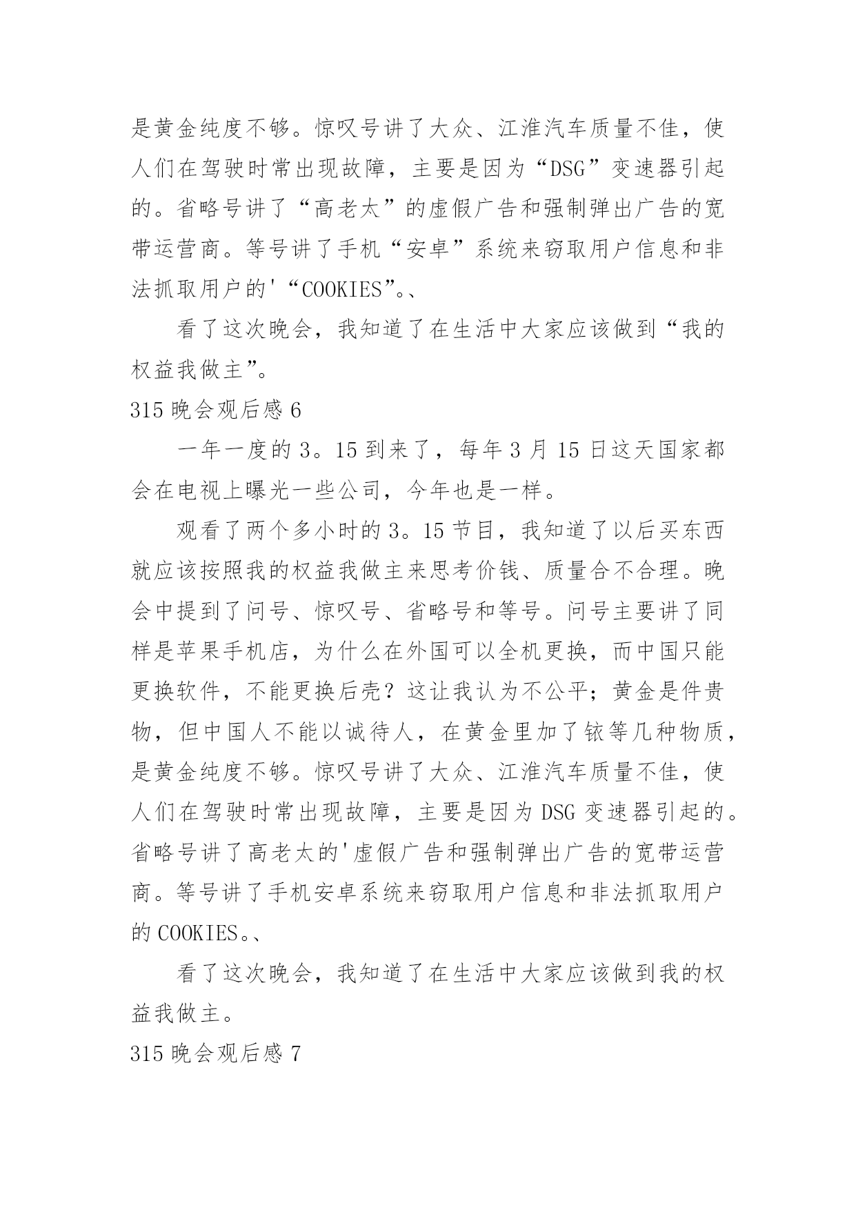 315晚会观后感(荐)315晚会观后感8篇观看完作品之后,内心会产生很多感慨,对人生或者事物一定产生了许多感想吧,是时候静下心来好好写写观后感了。为了让您不再为写观后感头疼,以下是小编帮大家整理的315晚会观后感,仅供参考,大家一起来看看吧。315晚会观后感1再过几个月,20xx年“3·15晚会”将如期举行,20xx年将是央视315举办的第29年。随着经济发展,消费升级,服务投诉成为了越来越重要的主题,客服行业也有上千万从业人员。历年315晚会的举行促进了行业的健康发展和升级,全国呼叫中心行业自律与监督委员会亦是在315晚会后发起多年的.全国性行业自律组织,4PS国际标准/CNCBA主席颜晓滨为该委员会首任主任。行业律监委及相应机构近年在4PS标准组织的支持下,配合国家管理与执法机构,在提升全行业服务品质,打击无序外呼,杜绝扰民行销等方面起到了促进作用,并推动全行业全面参照4PS国际标准进行客服提升,倡导服务外包、服务建设等领域招投标引入标准机制,推动很多企业接轨了4PS标准体系。在历年的央视315晚会活动中,行业律监委起到了积极作用。315晚会观后感2315晚会一直致力于推动消费领域的法制建设,每一届晚会不遗余力地为维护消费者权益、规范市场经济秩序、完善法律法规而努力。人们常常把法治形象的比喻成阳光,早在1999年的“315”晚会曾将主题定为“世纪阳光”,15年过去了,“315”晚会的主题拟定为“消费在阳光下”,体现了315晚会一贯致力于推动法治建设的理念,同时也凸显出“315”晚会其媒体本身的历史责任。“消费在阳光下”意寓着在法治的阳光下,消费者在维护自己合法权益时,可以更加勇敢、更有尊严;在法治的.阳光下,经营者会更讲规则,诚实可信;在法治的阳光下,监管者更有法可依,执法更严。315晚会观后感325年来,315晚会一直致力于推动消费领域的法制建设,每一届晚会不遗余力地为维护消费者权益、规范市场经济秩序、完善法律法规而努力。人们常常把法治形象的比喻成阳光,早在1999年的“315”晚会曾将主题定为“世纪阳光”,15年过去了,“315”晚会的主题拟定为“消费在阳光下”,体现了315晚会一贯致力于推动法治建设的理念,同时也凸显出“315”晚会其媒体本身的.历史责任。“消费在阳光下”意寓着在法治的阳光下,消费者在维护自己合法权益时,可以更加勇敢、更有尊严;在法治的阳光下,经营者会更讲规则,诚实可信;在法治的阳光下,监管者更有法可依,执法更严。315晚会观后感4315我们都知道是国家为维护消费者做的一个专业栏目,之前对这一块自己并没有太多的关注。自己之前对消费者权益也不太了解,很多时候只是凭借自己已有的观点在消费,在观看完315晚会以后自己很有感触。现在的商家为了盈利真的是上了一当又一当当当有花样,随着社会的进步,科技的发展,人工智能,大数据等等的'出现本来是更好的服务于大家的却也被一些商家钻空子,打擦边球。观看完晚会最让我触目惊心的还是食品安全问题,看到辣条的加工和当今青少年对辣条的喜爱程度,不经让自己有些惊悚。记者采访的一个小朋友说到,一次吃四五包辣条只要你不怕辣,只要你有足够的水。通过视频很直接的看到辣条的生产车间环境卫生根本就不达标,这样的产品流通到市场而且很受追捧。315晚会观后感5一年一度的3.15到来了,每年3月15日这天国家都会在电视上曝光一些公司,今年也是一样。观看了两个多小时的3.15节目,我知道了以后买东西就应该按照“我的权益我做主”来思考价钱、质量合不合理。晚会中提到了问号、惊叹号、省略号和等号。问号主要讲了同样是苹果手机店,为什么在外国可以全机更换,而中国只能更换软件,不能更换后壳?这让我认为不公平;黄金是件贵物,但中国人不能以诚待人,在黄金里加了铱等几种物质,是黄金纯度不够。惊叹号讲了大众、江淮汽车质量不佳,使人们在驾驶时常出现故障,主要是因为“DSG”变速器引起的。省略号讲了“高老太”的虚假广告和强制弹出广告的宽带运营商。等号讲了手机“安卓”系统来窃取用户信息和非法抓取用户的'“COOKIES”。、看了这次晚会,我知道了在生活中大家应该做到“我的权益我做主”。315晚会观后感6一年一度的3。15到来了,每年3月15日这天国家都会在电视上曝光一些公司,今年也是一样。观看了两个多小时的3。15节目,我知道了以后买东西就应该按照我的权益我做主来思考价钱、质量合不合理。晚会中提到了问号、惊叹号、省略号和等号。问号主要讲了同样是苹果手机店,为什么在外国可以全机更换,而中国只能更换软件,不能更换后壳?这让我认为不公平;黄金是件贵物,但中国人不能以诚待人,在黄金里加了铱等几种物质,是黄金纯度不够。惊叹号讲了大众、江淮汽车质量不佳,使人们在驾驶时常出现故障,主要是因为DSG变速器引起的。省略号讲了高老太的'虚假广