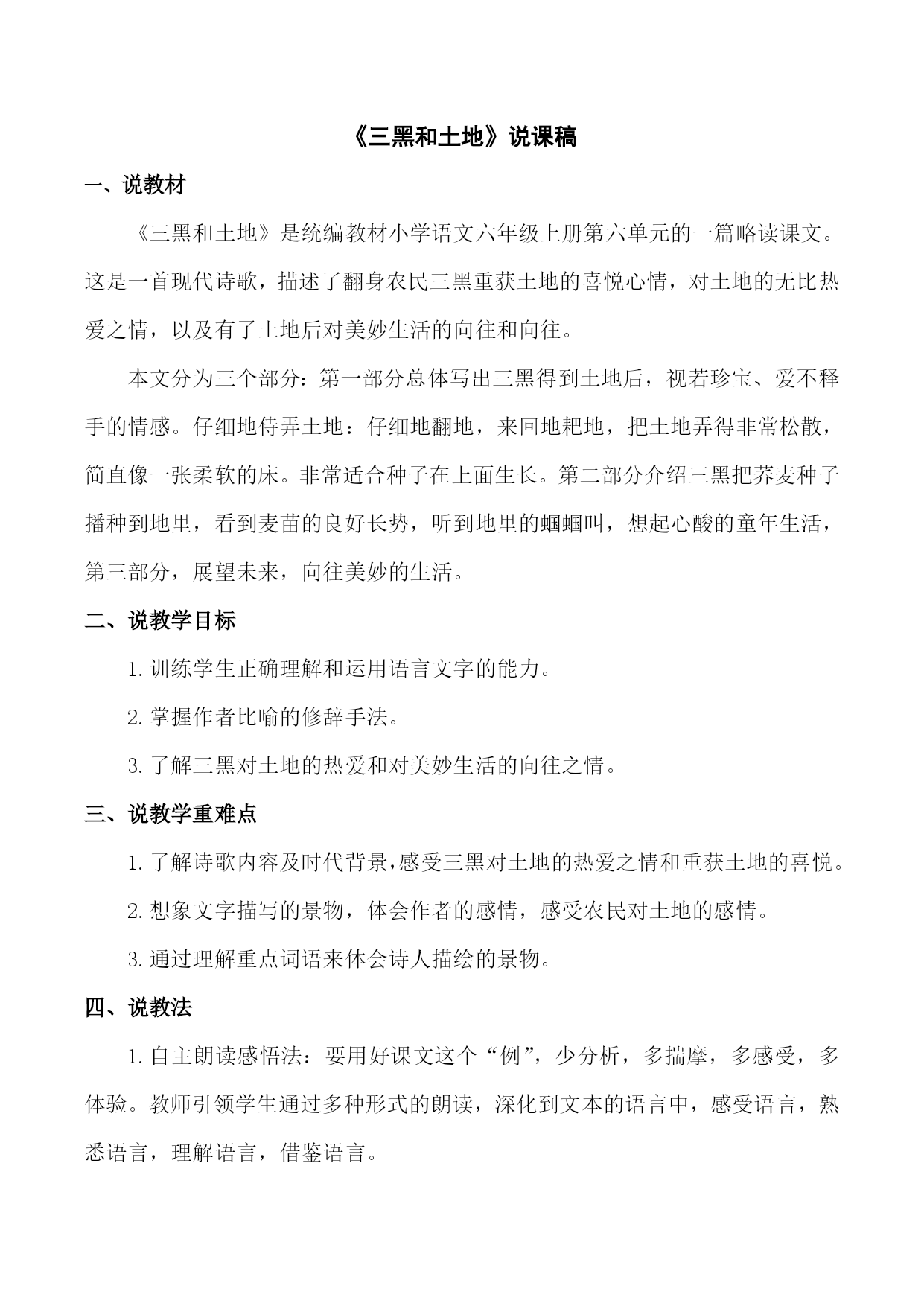 《三黑和土地》说课稿说教材 《三黑和土地》是统编教材小学语文六年级上册第六单元的一篇略读课文。这是一首现代诗歌,描述了翻身农民三黑重获土地的喜悦心情,对土地的无比热爱之情,以及有了土地后对美妙生活的向往和向往。 本文分为三个部分:第一部分总体写出三黑得到土地后,视若珍宝、爱不释手的情感。仔细地侍弄土地:仔细地翻地,来回地耙地,把土地弄得非常松散,简直像一张柔软的床。非常适合种子在上面生长。第二部分介绍三黑把荞麦种子播种到地里,看到麦苗的良好长势,听到地里的蝈蝈叫,想起心酸的童年生活,第三部分,展望