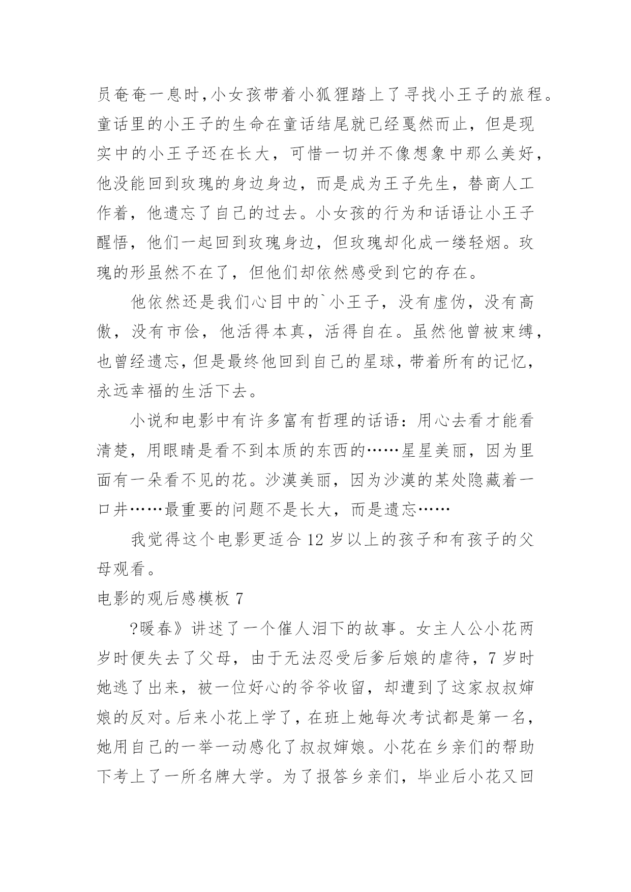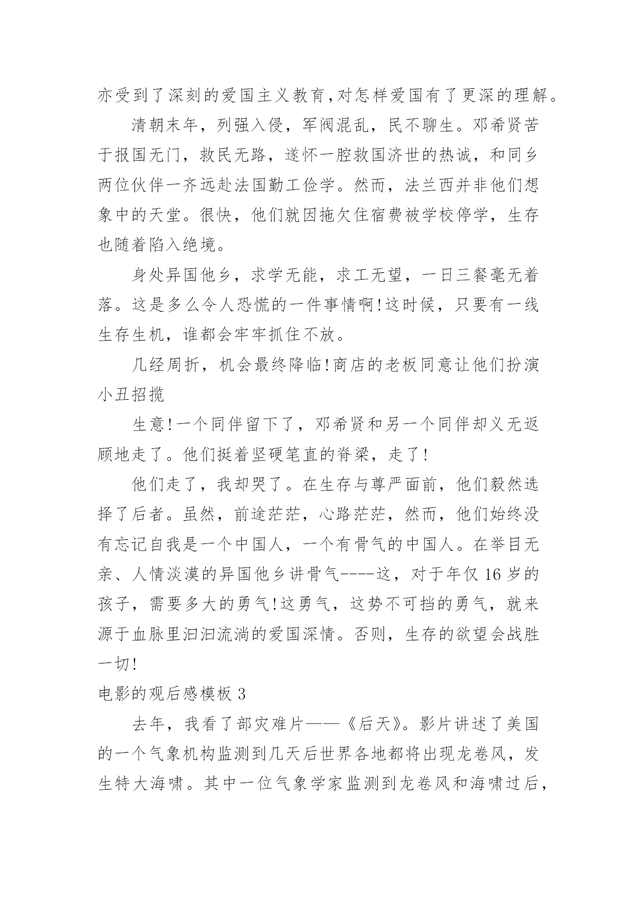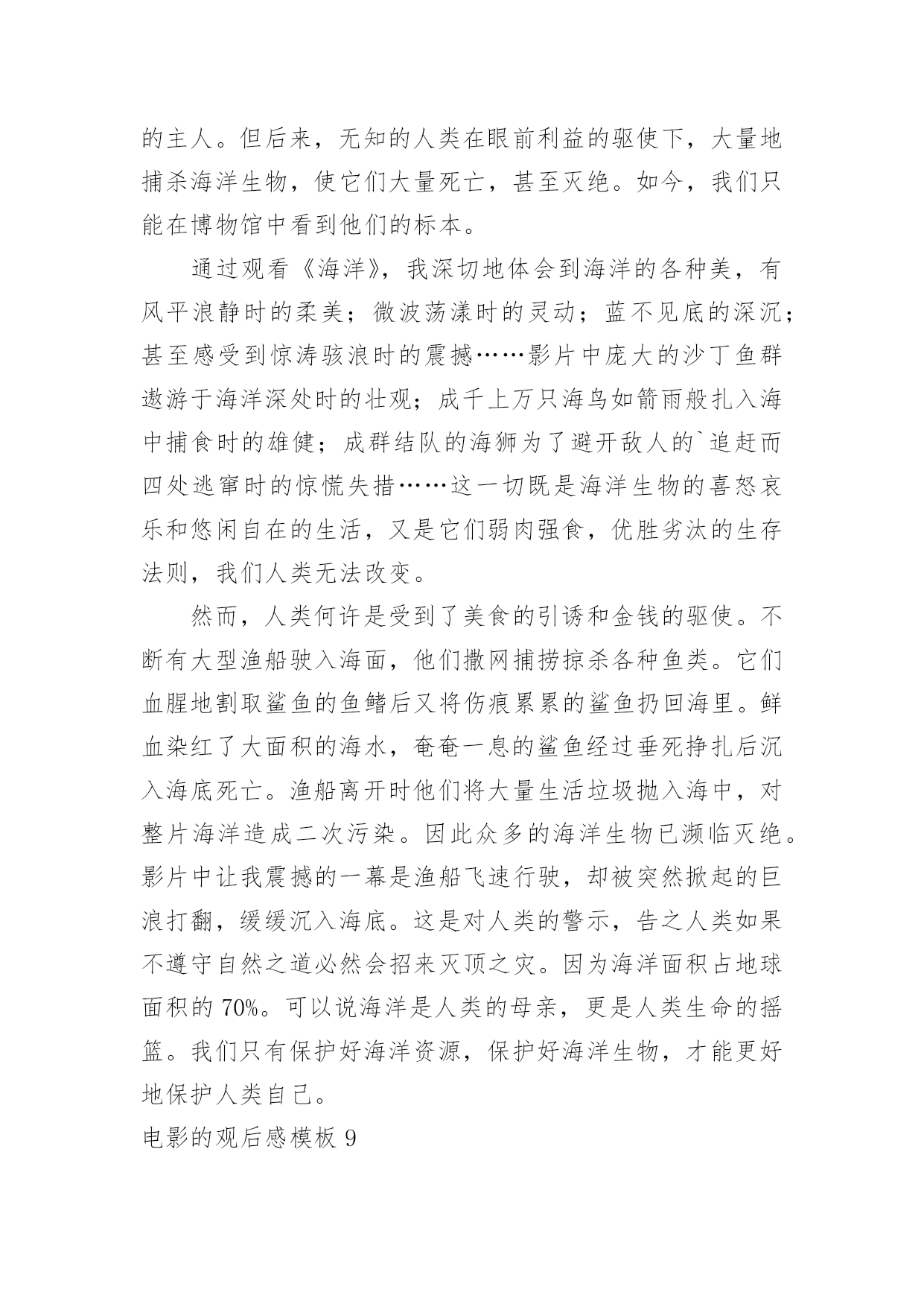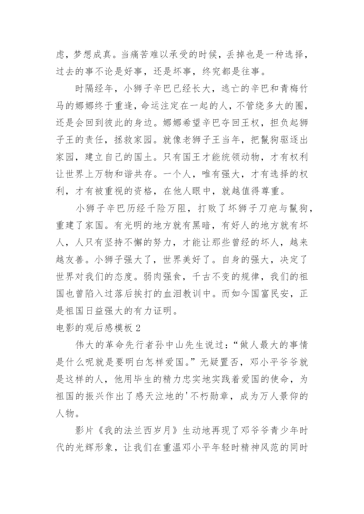 电影的观后感电影的观后感模板当品味完一部作品后,一定有很多值得分享的心得吧,撰写观后感可以帮助我们提升自己。那要怎么写好观后感呢?以下是小编整理的电影的观后感模板,希望对大家有所帮助。电影的观后感模板1最近有一部获奖动画片《狮子王》正在热映,抽出时间陪女儿一起去看电影。这部电影主要讲小狮子辛巴成长过程中,为坏狮子刀疤所利用,屡次犯下的错误,所付出的沉重代价。人弱的时候,坏人最多,小狮子辛巴也不例外,在名利冲突下,坏狮子刀疤勾结鬣狗,哄骗年幼无知的小狮子辛巴去危险的地方,辛巴为证明自己是未来的狮子王,很勇敢,不听其它动物的'劝告,最终导致老狮子王木法沙为救小狮子,被坏狮子刀疤推入悬崖摔死。水不试,不知深浅;人不交,不知好坏,时间是个好东西,见证了人性,也验证了人心。当小狮子辛巴失去了父亲,又被坏狮子刀疤、鬣狗追杀,跌入悬崖,九死一生的时候,它失去了所有的依靠。这时候,它遇到了善良的朋友,学会了哈库那玛塔塔,意思是无忧无虑,梦想成真。当痛苦难以承受的时候,丢掉也是一种选择,过去的事不论是好事,还是坏事,终究都是往事。时隔经年,小狮子辛巴已经长大,逃亡的辛巴和青梅竹马的娜娜终于重逢,命运注定在一起的人,不管绕多大的圈,还是会回到彼此的身边。娜娜希望辛巴夺回王权,担负起狮子王的责任,拯救家园。就像老狮子王当年,把鬣狗驱逐出家园,建立自己的国土。只有国王才能统领动物,才有权利让世界上万物和谐共存。一个人,唯有强大,才有选择的权利,才有被重视的资格,在他人眼中,就越值得尊重。小狮子辛巴历经千险万阻,打败了坏狮子刀疤与鬣狗,重建了家国。有光明的地方就有黑暗,有好人的地方就有坏人,人只有坚持不懈的努力,才能让那些曾经的坏人,越来越友善。小狮子强大了,世界美好了。自身的强大,决定了世界对我们的态度。弱肉强食,千古不变的规律,我们的祖国也曾陷入过落后挨打的血泪教训中。而如今国富民安,正是祖国日益强大的有力证明。电影的观后感模板2伟大的革命先行者孙中山先生说过:“做人最大的事情是什么呢就是要明白怎样爱国。”无疑置否,邓小平爷爷就是这样的人,他用毕生的精力忠实地实践着爱国的使命,为祖国的振兴作出了感天泣地的'不朽勋章,成为万人景仰的人物。影片《我的法兰西岁月》生动地再现了邓爷爷青少年时代的光辉形象,让我们在重温邓小平年轻时精神风范的同时亦受到了深刻的爱国主义教育,对怎样爱国有了更深的理解。清朝末年,列强入侵,军阀混乱,民不聊生。邓希贤苦于报国无门,救民无路,遂怀一腔救国济世的热诚,和同乡两位伙伴一齐远赴法国勤工俭学。然而,法兰西并非他们想象中的天堂。很快,他们就因拖欠住宿费被学校停学,生存也随着陷入绝境。身处异国他乡,求学无能,求工无望,一日三餐毫无着落。这是多么令人恐慌的一件事情啊!这时候,只要有一线生存生机,谁都会牢牢抓住不放。几经周折,机会最终降临!商店的老板同意让他们扮演小丑招揽生意!一个同伴留下了,邓希贤和另一个同伴却义无返顾地走了。他们挺着坚硬笔直的脊梁,走了!他们走了,我却哭了。在生存与尊严面前,他们毅然选择了后者。虽然,前途茫茫,心路茫茫,然而,他们始终没有忘记自我是一个中国人,一个有骨气的中国人。在举目无亲、人情淡漠的异国他乡讲骨气----这,对于年仅16岁的孩子,需要多大的勇气!这勇气,这势不可挡的勇气,就来源于血脉里汩汩流淌的爱国深情。否则,生存的欲望会战胜一切!电影的观后感模板3去年,我看了部灾难片——《后天》。影片讲述了美国的一个气象机构监测到几天后世界各地都将出现龙卷风,发生特大海啸。其中一位气象学家监测到龙卷风和海啸过后,全球气温会急剧下降。可同行都说他在胡说,谁都不相信他。就在他苦恼没有人相信他时,突然想到自己的儿子还在外地考试。他急忙打电话给儿子,可是已经晚了,海啸已经发生了。他告诉儿子呆在房子里,千万不要在外面走动,尽量找些能烧的东西来取暖。他儿子把这些话告诉考试的人,可人们都不听,都到外面去了,只剩下他儿子和几个人留下来了。他们用这种方法坚持到救援队的到来。看完这部影片,我有些忧虑,如果我们还继续污染环境,砍伐树木、破坏大自然、世界将变成什么样啊?会不会像电影中一样,龙卷风、海啸;会不会上演全球版的“日本仙台大地震”,会不会发生火灾、旱灾、洪涝灾害。有人说这些不可能发生,不,有可能,虽然这很让人难以置信,但是只要人类继续肆无忌惮破坏大自然,发生的可能性就会很大。到时候,我们赖以生存的家园就会消失得无影无踪,那时,你会后悔莫及地说:“早知如此,何必当初。”在此,我想呼吁人们,不要再破坏大自然中的一草一木,不要再污染一寸土的,污染大自然就是在破坏我们赖以生存的家园。如果有一天的球上寸草不生,到处是人、植物、动物的残骸。不时的发生自然灾害,我们将到何处去生存、居住呢?月球吗?火星吗?还是……地球是宇宙给人类赖以生存