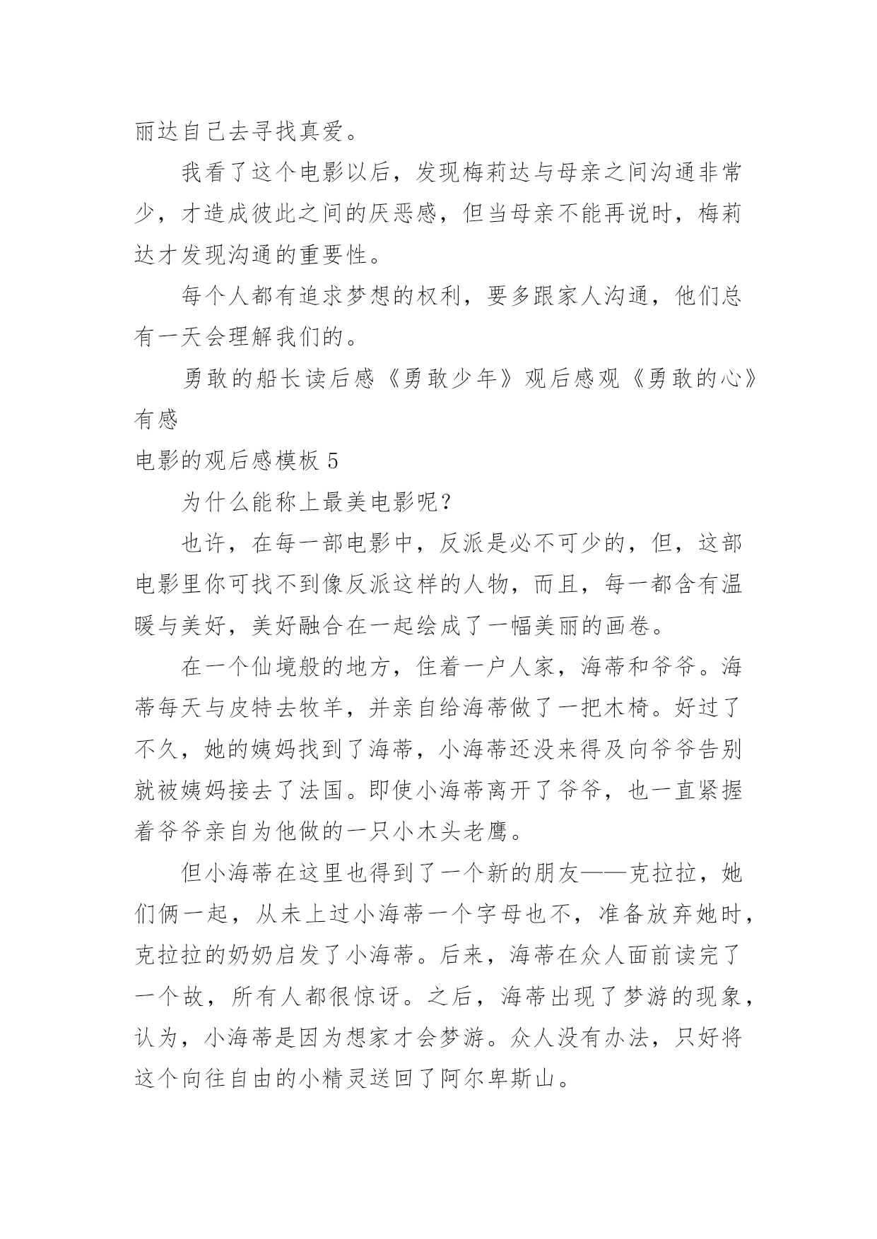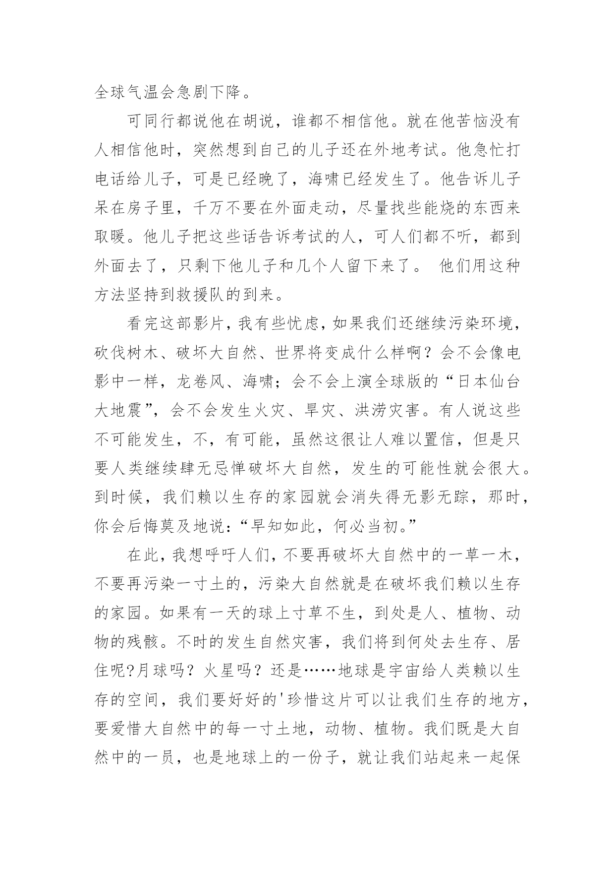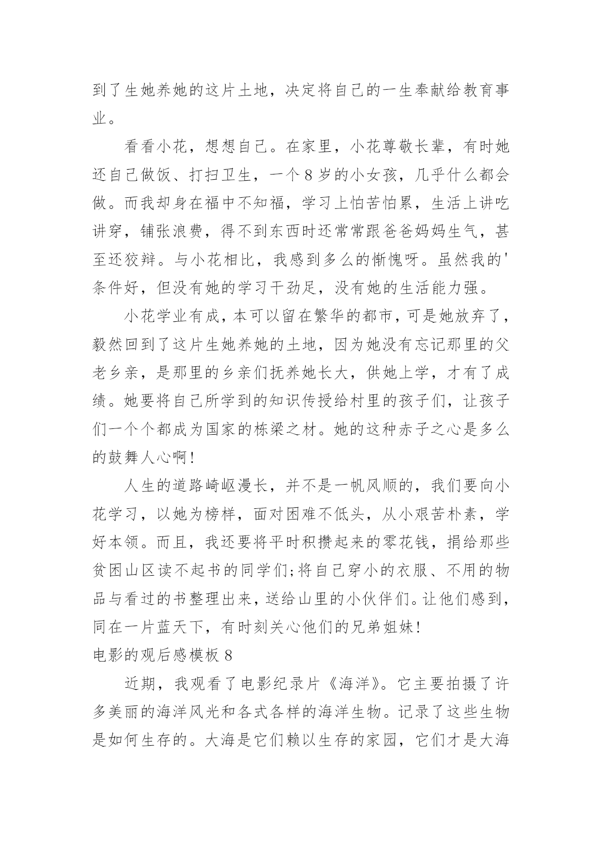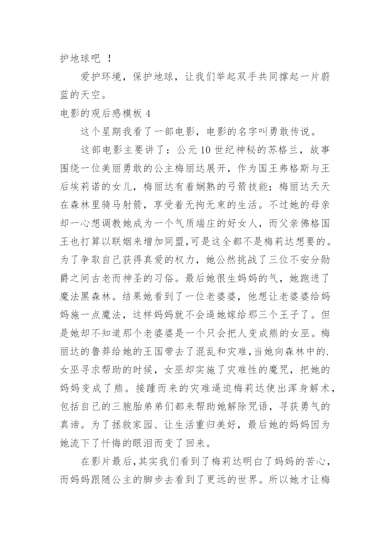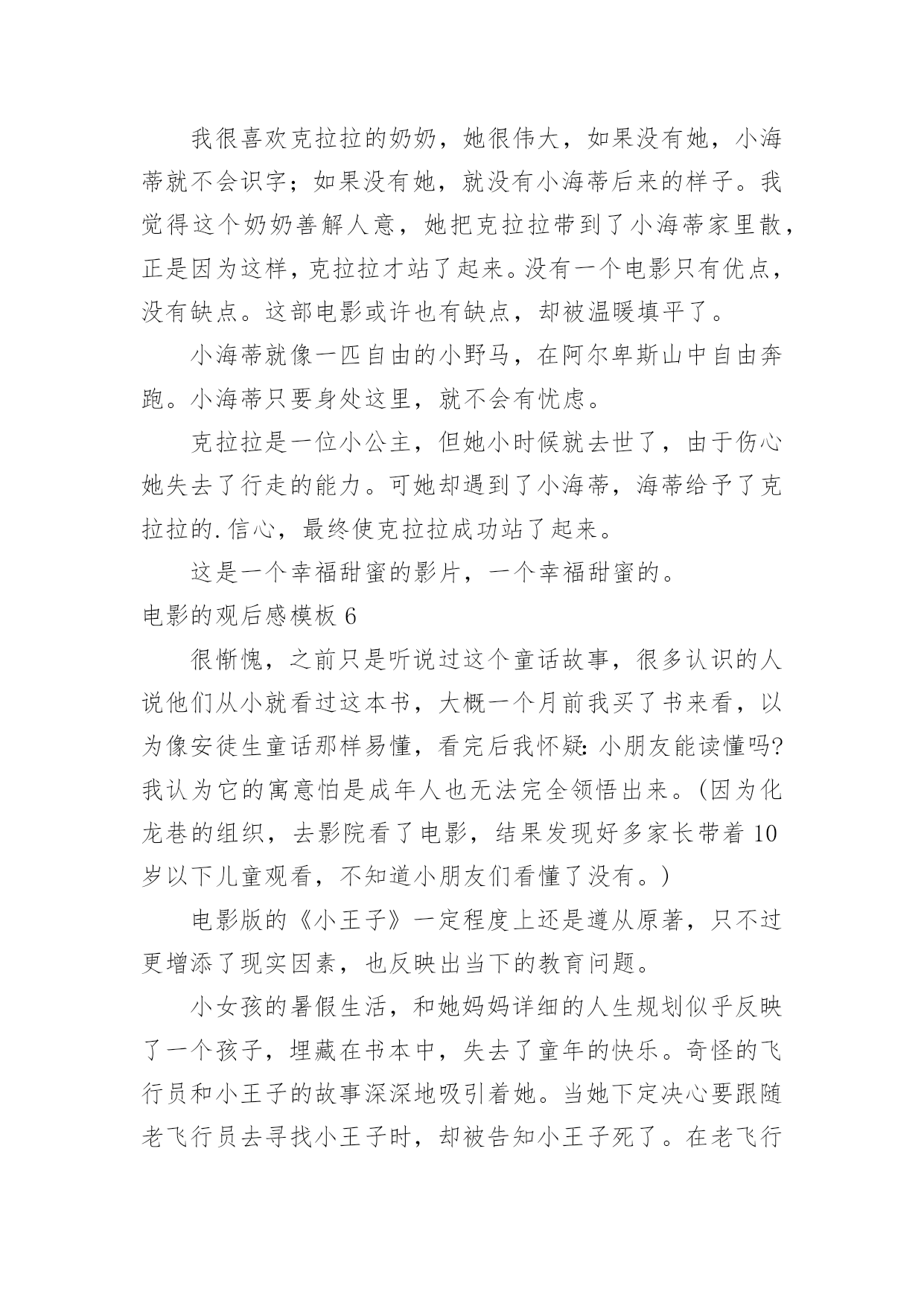 电影的观后感电影的观后感模板当品味完一部作品后,一定有很多值得分享的心得吧,撰写观后感可以帮助我们提升自己。那要怎么写好观后感呢?以下是小编整理的电影的观后感模板,希望对大家有所帮助。电影的观后感模板1最近有一部获奖动画片《狮子王》正在热映,抽出时间陪女儿一起去看电影。这部电影主要讲小狮子辛巴成长过程中,为坏狮子刀疤所利用,屡次犯下的错误,所付出的沉重代价。人弱的时候,坏人最多,小狮子辛巴也不例外,在名利冲突下,坏狮子刀疤勾结鬣狗,哄骗年幼无知的小狮子辛巴去危险的地方,辛巴为证明自己是未来的狮子王,很勇敢,不听其它动物的'劝告,最终导致老狮子王木法沙为救小狮子,被坏狮子刀疤推入悬崖摔死。水不试,不知深浅;人不交,不知好坏,时间是个好东西,见证了人性,也验证了人心。当小狮子辛巴失去了父亲,又被坏狮子刀疤、鬣狗追杀,跌入悬崖,九死一生的时候,它失去了所有的依靠。这时候,它遇到了善良的朋友,学会了哈库那玛塔塔,意思是无忧无虑,梦想成真。当痛苦难以承受的时候,丢掉也是一种选择,过去的事不论是好事,还是坏事,终究都是往事。时隔经年,小狮子辛巴已经长大,逃亡的辛巴和青梅竹马的娜娜终于重逢,命运注定在一起的人,不管绕多大的圈,还是会回到彼此的身边。娜娜希望辛巴夺回王权,担负起狮子王的责任,拯救家园。就像老狮子王当年,把鬣狗驱逐出家园,建立自己的国土。只有国王才能统领动物,才有权利让世界上万物和谐共存。一个人,唯有强大,才有选择的权利,才有被重视的资格,在他人眼中,就越值得尊重。小狮子辛巴历经千险万阻,打败了坏狮子刀疤与鬣狗,重建了家国。有光明的地方就有黑暗,有好人的地方就有坏人,人只有坚持不懈的努力,才能让那些曾经的坏人,越来越友善。小狮子强大了,世界美好了。自身的强大,决定了世界对我们的态度。弱肉强食,千古不变的规律,我们的祖国也曾陷入过落后挨打的血泪教训中。而如今国富民安,正是祖国日益强大的有力证明。电影的观后感模板2伟大的革命先行者孙中山先生说过:“做人最大的事情是什么呢就是要明白怎样爱国。”无疑置否,邓小平爷爷就是这样的人,他用毕生的精力忠实地实践着爱国的使命,为祖国的振兴作出了感天泣地的'不朽勋章,成为万人景仰的人物。影片《我的法兰西岁月》生动地再现了邓爷爷青少年时代的光辉形象,让我们在重温邓小平年轻时精神风范的同时亦受到了深刻的爱国主义教育,对怎样爱国有了更深的理解。清朝末年,列强入侵,军阀混乱,民不聊生。邓希贤苦于报国无门,救民无路,遂怀一腔救国济世的热诚,和同乡两位伙伴一齐远赴法国勤工俭学。然而,法兰西并非他们想象中的天堂。很快,他们就因拖欠住宿费被学校停学,生存也随着陷入绝境。身处异国他乡,求学无能,求工无望,一日三餐毫无着落。这是多么令人恐慌的一件事情啊!这时候,只要有一线生存生机,谁都会牢牢抓住不放。几经周折,机会最终降临!商店的老板同意让他们扮演小丑招揽生意!一个同伴留下了,邓希贤和另一个同伴却义无返顾地走了。他们挺着坚硬笔直的脊梁,走了!他们走了,我却哭了。在生存与尊严面前,他们毅然选择了后者。虽然,前途茫茫,心路茫茫,然而,他们始终没有忘记自我是一个中国人,一个有骨气的中国人。在举目无亲、人情淡漠的异国他乡讲骨气----这,对于年仅16岁的孩子,需要多大的勇气!这勇气,这势不可挡的勇气,就来源于血脉里汩汩流淌的爱国深情。否则,生存的欲望会战胜一切!电影的观后感模板3去年,我看了部灾难片——《后天》。影片讲述了美国的一个气象机构监测到几天后世界各地都将出现龙卷风,发生特大海啸。其中一位气象学家监测到龙卷风和海啸过后,全球气温会急剧下降。可同行都说他在胡说,谁都不相信他。就在他苦恼没有人相信他时,突然想到自己的儿子还在外地考试。他急忙打电话给儿子,可是已经晚了,海啸已经发生了。他告诉儿子呆在房子里,千万不要在外面走动,尽量找些能烧的东西来取暖。他儿子把这些话告诉考试的人,可人们都不听,都到外面去了,只剩下他儿子和几个人留下来了。他们用这种方法坚持到救援队的到来。看完这部影片,我有些忧虑,如果我们还继续污染环境,砍伐树木、破坏大自然、世界将变成什么样啊?会不会像电影中一样,龙卷风、海啸;会不会上演全球版的“日本仙台大地震”,会不会发生火灾、旱灾、洪涝灾害。有人说这些不可能发生,不,有可能,虽然这很让人难以置信,但是只要人类继续肆无忌惮破坏大自然,发生的可能性就会很大。到时候,我们赖以生存的家园就会消失得无影无踪,那时,你会后悔莫及地说:“早知如此,何必当初。”在此,我想呼吁人们,不要再破坏大自然中的一草一木,不要再污染一寸土的,污染大自然就是在破坏我们赖以生存的家园。如果有一天的球上寸草不生,到处是人、植物、动物的残骸。不时的发生自然灾害,我们将到何处去生存、居住呢?月球吗?火星吗?还是……地球是宇宙给人类赖以生存