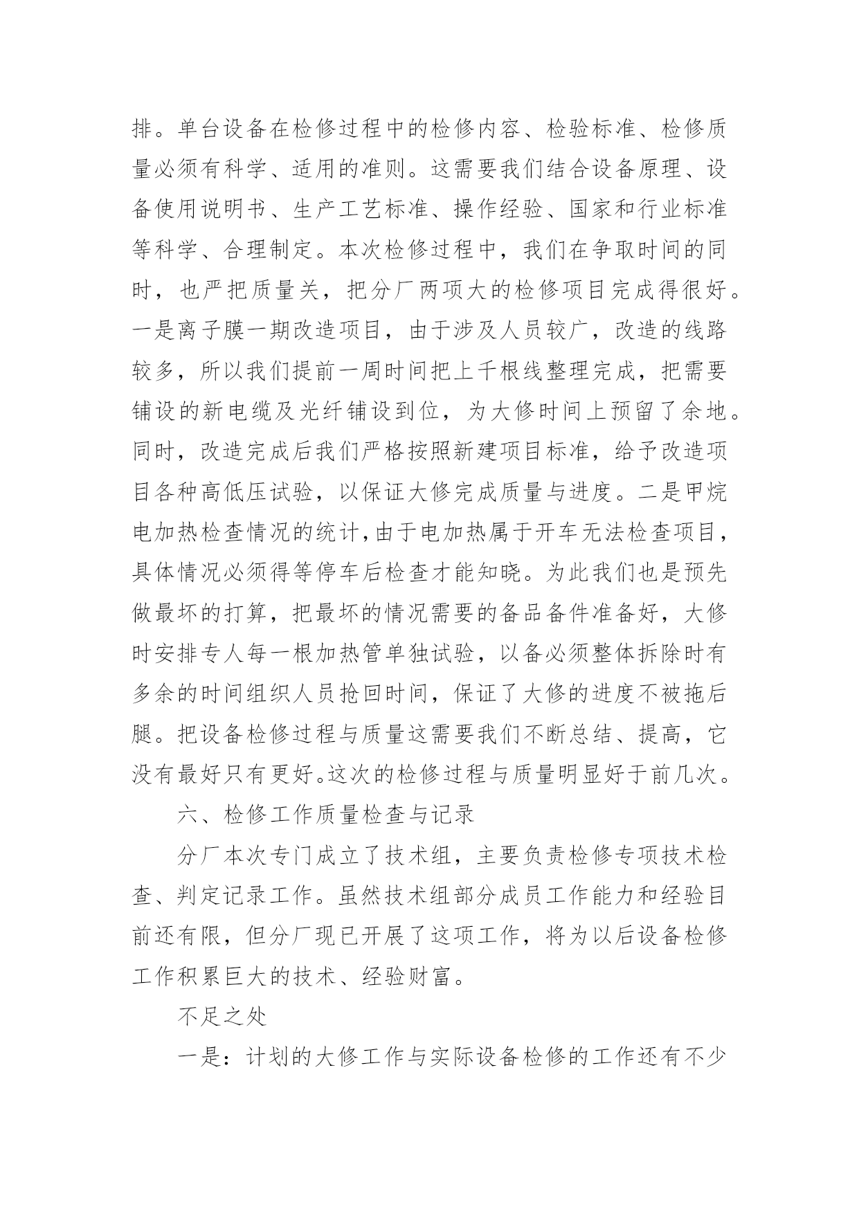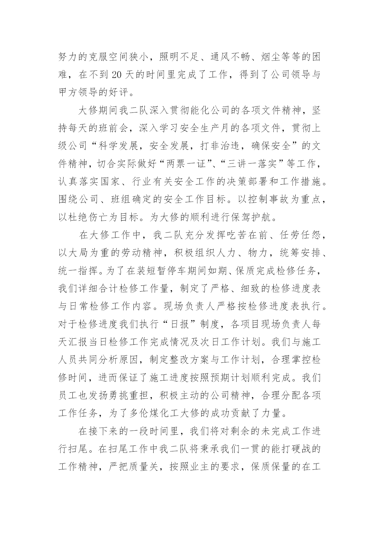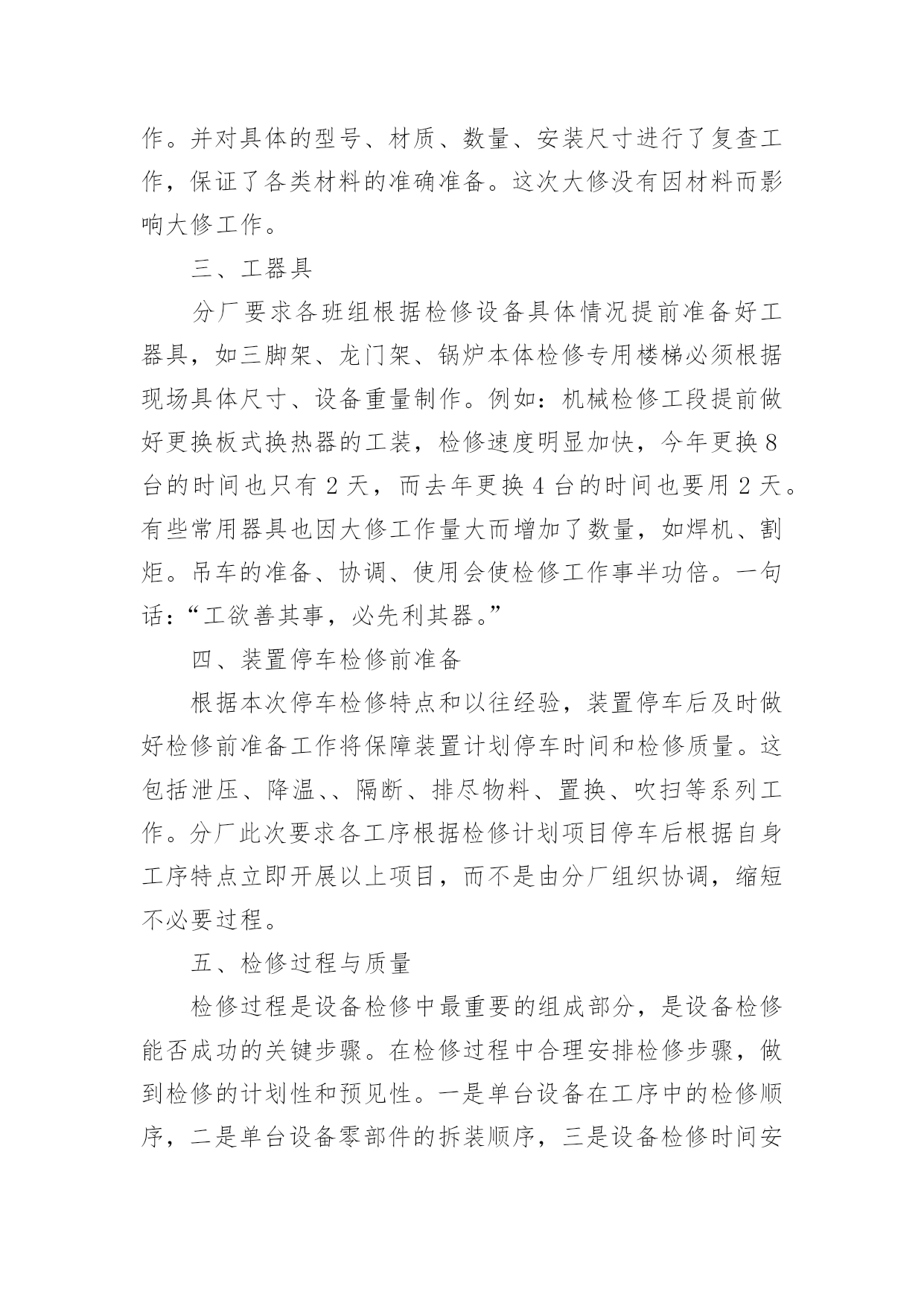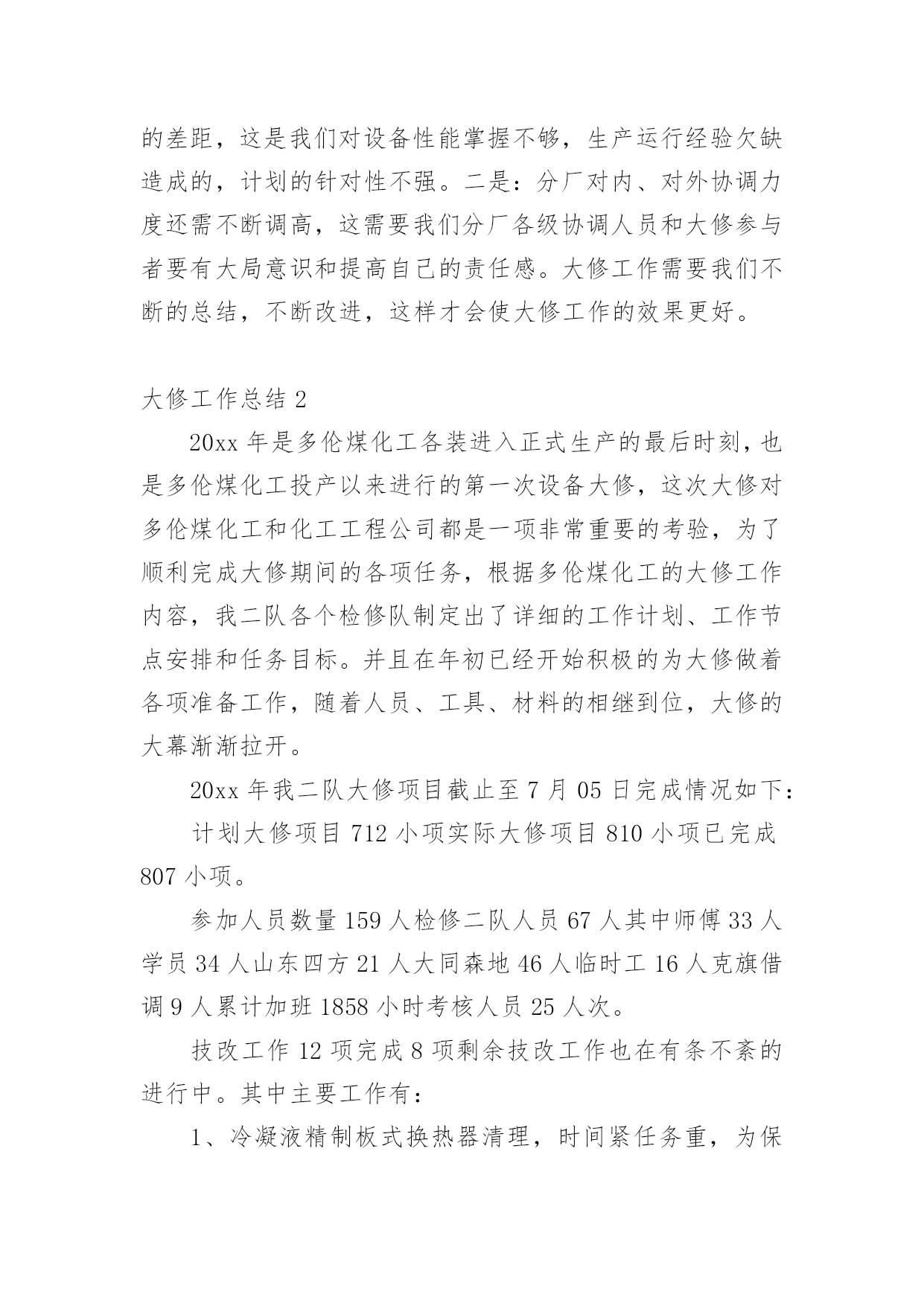 大修工作总结总结是在某一时期、某一项目或某些工作告一段落或者全部完成后进行回顾检查、分析评价,从而得出教训和一些规律性认识的一种书面材料,它可以帮助我们总结以往思想,发扬成绩,因此十分有必须要写一份总结哦。总结怎么写才是正确的呢?以下是小编整理的大修工作总结,欢迎大家分享。大修工作总结120xx年的大修工作是公司生产装置建设、投产后的第五次大修。这次的大修工作与前几次有很多不同的地方。一是:部分生产装置停车检修与部分装置生产运行同时进行,时间跨度长;二是:设备检修工作量明显高于前几次,既有一期旧设备又有二期新设备;三是:公用系统停车计划检修时间安排紧凑。这次设备检修工作主要分为以下六方面进行总结。一、人员分厂在大修方案时计划了人员安排,合理安排人员,根据分厂特点制定了组织机构,落实责任到人。从三班制员工中抽出了部分人员进行大修中力所能及的事,从事了检修力量。民工和外协单位人员的参与也进一步保障了人力要求。合理安排人员作息时间,也是人员安排中则需注意的问题。二、材料分厂根据各类设备运行情况,计划了相应的备件采购工作。并对具体的型号、材质、数量、安装尺寸进行了复查工作,保证了各类材料的准确准备。这次大修没有因材料而影响大修工作。三、工器具分厂要求各班组根据检修设备具体情况提前准备好工器具,如三脚架、龙门架、锅炉本体检修专用楼梯必须根据现场具体尺寸、设备重量制作。例如:机械检修工段提前做好更换板式换热器的工装,检修速度明显加快,今年更换8台的时间也只有2天,而去年更换4台的时间也要用2天。有些常用器具也因大修工作量大而增加了数量,如焊机、割炬。吊车的准备、协调、使用会使检修工作事半功倍。一句话:“工欲善其事,必先利其器。”四、装置停车检修前准备根据本次停车检修特点和以往经验,装置停车后及时做好检修前准备工作将保障装置计划停车时间和检修质量。这包括泄压、降温、、隔断、排尽物料、置换、吹扫等系列工作。分厂此次要求各工序根据检修计划项目停车后根据自身工序特点立即开展以上项目,而不是由分厂组织协调,缩短不必要过程。五、检修过程与质量检修过程是设备检修中最重要的组成部分,是设备检修能否成功的关键步骤。在检修过程中合理安排检修步骤,做到检修的计划性和预见性。一是单台设备在工序中的检修顺序,二是单台设备零部件的拆装顺序,三是设备检修时间安排。单台设备在检修过程中的检修内容、检验标准、检修质量必须有科学、适用的准则。这需要我们结合设备原理、设备使用说明书、生产工艺标准、操作经验、国家和行业标准等科学、合理制定。本次检修过程中,我们在争取时间的同时,也严把质量关,把分厂两项大的检修项目完成得很好。一是离子膜一期改造项目,由于涉及人员较广,改造的线路较多,所以我们提前一周时间把上千根线整理完成,把需要铺设的新电缆及光纤铺设到位,为大修时间上预留了余地。同时,改造完成后我们严格按照新建项目标准,给予改造项目各种高低压试验,以保证大修完成质量与进度。二是甲烷电加热检查情况的统计,由于电加热属于开车无法检查项目,具体情况必须得等停车后检查才能知晓。为此我们也是预先做最坏的打算,把最坏的情况需要的备品备件准备好,大修时安排专人每一根加热管单独试验,以备必须整体拆除时有多余的时间组织人员抢回时间,保证了大修的进度不被拖后腿。把设备检修过程与质量这需要我们不断总结、提高,它没有最好只有更好。这次的检修过程与质量明显好于前几次。六、检修工作质量检查与记录分厂本次专门成立了技术组,主要负责检修专项技术检查、判定记录工作。虽然技术组部分成员工作能力和经验目前还有限,但分厂现已开展了这项工作,将为以后设备检修工作积累巨大的技术、经验财富。不足之处一是:计划的大修工作与实际设备检修的工作还有不少的差距,这是我们对设备性能掌握不够,生产运行经验欠缺造成的,计划的针对性不强。二是:分厂对内、对外协调力度还需不断调高,这需要我们分厂各级协调人员和大修参与者要有大局意识和提高自己的责任感。大修工作需要我们不断的总结,不断改进,这样才会使大修工作的效果更好。大修工作总结220xx年是多伦煤化工各装进入正式生产的最后时刻,也是多伦煤化工投产以来进行的第一次设备大修,这次大修对多伦煤化工和化工工程公司都是一项非常重要的考验,为了顺利完成大修期间的各项任务,根据多伦煤化工的大修工作内容,我二队各个检修队制定出了详细的工作计划、工作节点安排和任务目标。并且在年初已经开始积极的为大修做着各项准备工作,随着人员、工具、材料的相继到位,大修的大幕渐渐拉开。20xx年我二队大修项目截止至7月05日完成情况如下:计划大修项目712小项实际大修项目810小项已完成807小项。参加人员数量159人检修二队人员67人其中师傅33人学员34人山东四方21人大同森地46人临时工16人克旗借调9人累计加班18