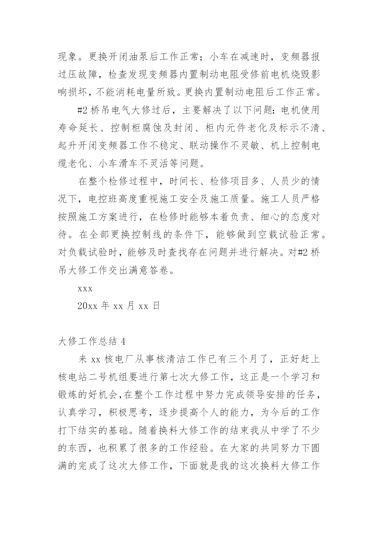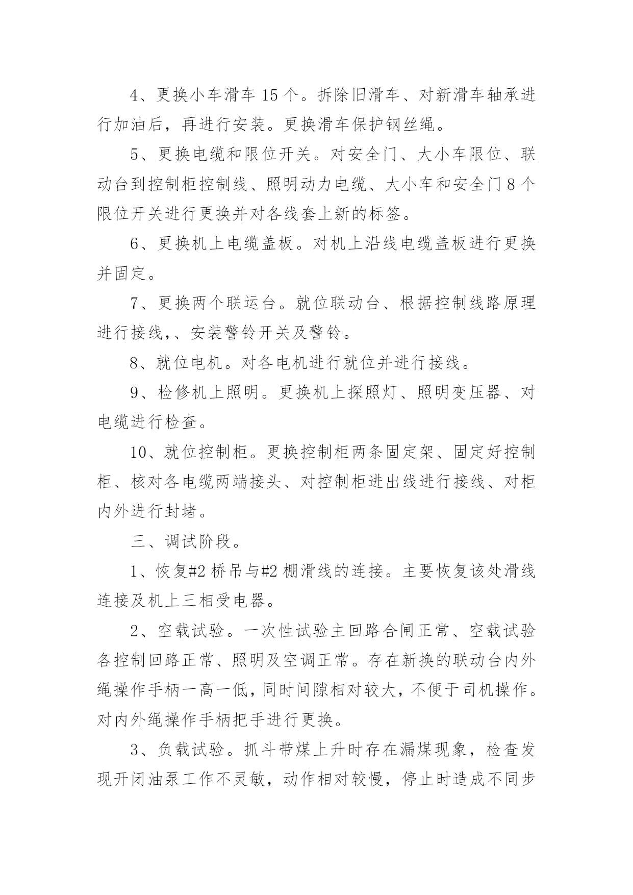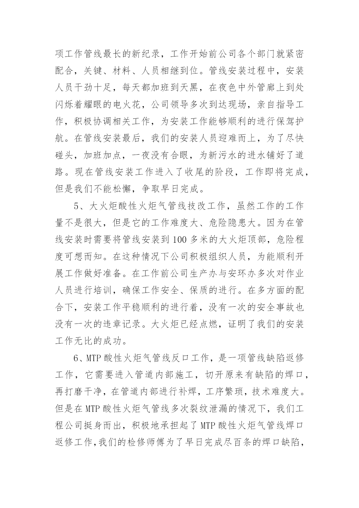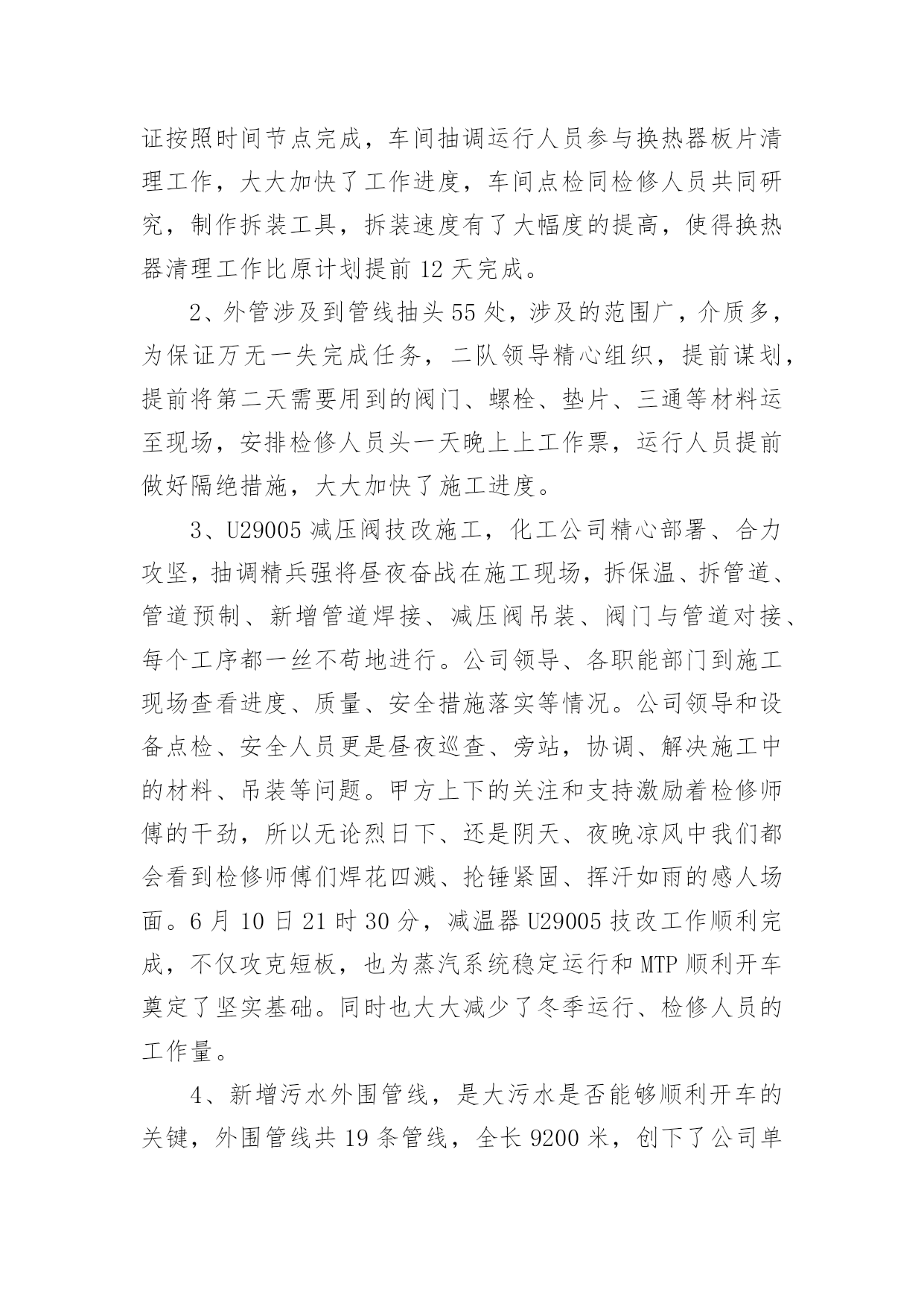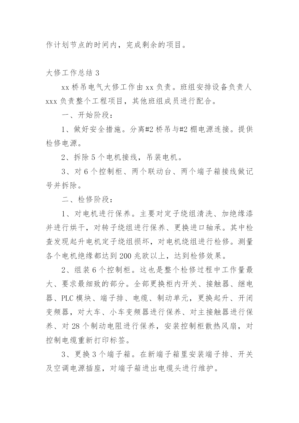 大修工作总结总结是在某一时期、某一项目或某些工作告一段落或者全部完成后进行回顾检查、分析评价,从而得出教训和一些规律性认识的一种书面材料,它可以帮助我们总结以往思想,发扬成绩,因此十分有必须要写一份总结哦。总结怎么写才是正确的呢?以下是小编整理的大修工作总结,欢迎大家分享。大修工作总结120xx年的大修工作是公司生产装置建设、投产后的第五次大修。这次的大修工作与前几次有很多不同的地方。一是:部分生产装置停车检修与部分装置生产运行同时进行,时间跨度长;二是:设备检修工作量明显高于前几次,既有一期旧设备又有二期新设备;三是:公用系统停车计划检修时间安排紧凑。这次设备检修工作主要分为以下六方面进行总结。一、人员分厂在大修方案时计划了人员安排,合理安排人员,根据分厂特点制定了组织机构,落实责任到人。从三班制员工中抽出了部分人员进行大修中力所能及的事,从事了检修力量。民工和外协单位人员的参与也进一步保障了人力要求。合理安排人员作息时间,也是人员安排中则需注意的问题。二、材料分厂根据各类设备运行情况,计划了相应的备件采购工作。并对具体的型号、材质、数量、安装尺寸进行了复查工作,保证了各类材料的准确准备。这次大修没有因材料而影响大修工作。三、工器具分厂要求各班组根据检修设备具体情况提前准备好工器具,如三脚架、龙门架、锅炉本体检修专用楼梯必须根据现场具体尺寸、设备重量制作。例如:机械检修工段提前做好更换板式换热器的工装,检修速度明显加快,今年更换8台的时间也只有2天,而去年更换4台的时间也要用2天。有些常用器具也因大修工作量大而增加了数量,如焊机、割炬。吊车的准备、协调、使用会使检修工作事半功倍。一句话:“工欲善其事,必先利其器。”四、装置停车检修前准备根据本次停车检修特点和以往经验,装置停车后及时做好检修前准备工作将保障装置计划停车时间和检修质量。这包括泄压、降温、、隔断、排尽物料、置换、吹扫等系列工作。分厂此次要求各工序根据检修计划项目停车后根据自身工序特点立即开展以上项目,而不是由分厂组织协调,缩短不必要过程。五、检修过程与质量检修过程是设备检修中最重要的组成部分,是设备检修能否成功的关键步骤。在检修过程中合理安排检修步骤,做到检修的计划性和预见性。一是单台设备在工序中的检修顺序,二是单台设备零部件的拆装顺序,三是设备检修时间安排。单台设备在检修过程中的检修内容、检验标准、检修质量必须有科学、适用的准则。这需要我们结合设备原理、设备使用说明书、生产工艺标准、操作经验、国家和行业标准等科学、合理制定。本次检修过程中,我们在争取时间的同时,也严把质量关,把分厂两项大的检修项目完成得很好。一是离子膜一期改造项目,由于涉及人员较广,改造的线路较多,所以我们提前一周时间把上千根线整理完成,把需要铺设的新电缆及光纤铺设到位,为大修时间上预留了余地。同时,改造完成后我们严格按照新建项目标准,给予改造项目各种高低压试验,以保证大修完成质量与进度。二是甲烷电加热检查情况的统计,由于电加热属于开车无法检查项目,具体情况必须得等停车后检查才能知晓。为此我们也是预先做最坏的打算,把最坏的情况需要的备品备件准备好,大修时安排专人每一根加热管单独试验,以备必须整体拆除时有多余的时间组织人员抢回时间,保证了大修的进度不被拖后腿。把设备检修过程与质量这需要我们不断总结、提高,它没有最好只有更好。这次的检修过程与质量明显好于前几次。六、检修工作质量检查与记录分厂本次专门成立了技术组,主要负责检修专项技术检查、判定记录工作。虽然技术组部分成员工作能力和经验目前还有限,但分厂现已开展了这项工作,将为以后设备检修工作积累巨大的技术、经验财富。不足之处一是:计划的大修工作与实际设备检修的工作还有不少的差距,这是我们对设备性能掌握不够,生产运行经验欠缺造成的,计划的针对性不强。二是:分厂对内、对外协调力度还需不断调高,这需要我们分厂各级协调人员和大修参与者要有大局意识和提高自己的责任感。大修工作需要我们不断的总结,不断改进,这样才会使大修工作的效果更好。大修工作总结220xx年是多伦煤化工各装进入正式生产的最后时刻,也是多伦煤化工投产以来进行的第一次设备大修,这次大修对多伦煤化工和化工工程公司都是一项非常重要的考验,为了顺利完成大修期间的各项任务,根据多伦煤化工的大修工作内容,我二队各个检修队制定出了详细的工作计划、工作节点安排和任务目标。并且在年初已经开始积极的为大修做着各项准备工作,随着人员、工具、材料的相继到位,大修的大幕渐渐拉开。20xx年我二队大修项目截止至7月05日完成情况如下:计划大修项目712小项实际大修项目810小项已完成807小项。参加人员数量159人检修二队人员67人其中师傅33人学员34人山东四方21人大同森地46人临时工16人克旗借调9人累计加班18