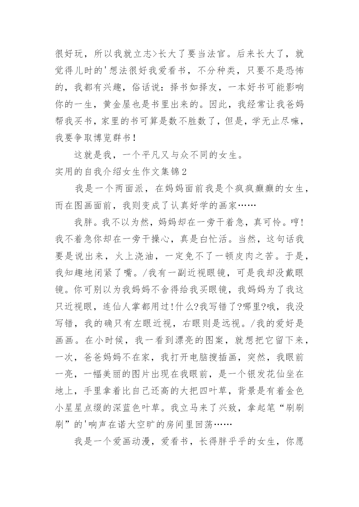 自我介绍女生作文实用的自我介绍女生作文集锦当碰到不熟悉的人时,时常需要用到自我介绍,自我介绍是结识新朋友的重要手段。你所见过的自我介绍是什么样的呢?下面是小编收集整理的实用的自我介绍女生作文集锦,供大家参考借鉴,希望可以帮助到有需要的朋友。实用的自我介绍女生作文集锦1我叫xxx,今年13岁,脸上最大的特点就是带了副眼镜,我喜欢助人为乐,不管是学习还是生活,能帮就帮。有一次,我还在读二年级,学校组织春游,恰巧听天气预报说那天下雨,大家都很着急,都在担心会不会取消春游改上课,但学校广播说风雨无阻,但要带好雨具,我们都很高兴。到了第二天,我穿了件雨披,打算去学校,但是突然想到可能有同学会没带,于是吵着要带把伞去,以防有同学没带,家人本不同意,但后来也没办法,只好让我带去。最后,总算是没有下雨,不过我的雨伞可就无用武之地啦。我也很胆小,但不是天生的,促成这个性格的原因是电视。我从小受我妈的影响就爱看法制节目,听闻了许多绑架小孩、小偷强盗等等,所以对于这类事情很害怕,害怕有一天会降临到我头上,但是,也有好处。我的志向是当法官,最初让我产生这一想法的还是因为电视,法制节目看多了,自然也看过很多法官判案,我尤其喜欢法官的锤子,敲起来很好玩,所以我就立志>长大了要当法官。后来长大了,就觉得儿时的'想法很好我爱看书,不分种类,只要不是恐怖的,我都有兴趣,俗话说:择书如择友,一本好书可能影响你的一生,黄金屋也是书里出来的。因此,我经常让我爸妈帮我买书,家里的书可算是数不胜数了,但是,学无止尽嘛,我要争取博览群书!这就是我,一个平凡又与众不同的女生。实用的自我介绍女生作文集锦2我是一个两面派,在妈妈面前我是个疯疯癫癫的女生,而在图画面前,我则变成了认真好学的画家……我胖。我不以为然,妈妈却在一旁干着急,真可怜。哼!我不着急你却在一旁干操心,真是白忙活。当然,这句话我要是说出来,火上浇油,一定免不了一顿皮肉之苦。于是,我知趣地闭紧了嘴。/我有一副近视眼镜,可是我却没戴眼镜。你可别以为我妈妈不舍得给我买眼镜,我妈妈为了我这只近视眼,连仙人掌都用过!什么?我写错了?哪里?哦,我没写错,我的确只有左眼近视,右眼则是远视。/我的爱好是画画。在小时候,我一看到漂亮的图案,就想把它留下来,一次,爸爸妈妈不在家,我打开电脑搜插画,突然,我眼前一亮,一幅美丽的图片出现在我眼前,是一个银发花仙坐在地上,手里拿着比自己还高的大把四叶草,背景是有着金色小星星点缀的深蓝色叶草。我立马来了兴致,拿起笔“刷刷刷”的'响声在诺大空旷的房间里回荡……我是一个爱画动漫,爱看书,长得胖乎乎的女生,你愿意跟我交朋友吗?
