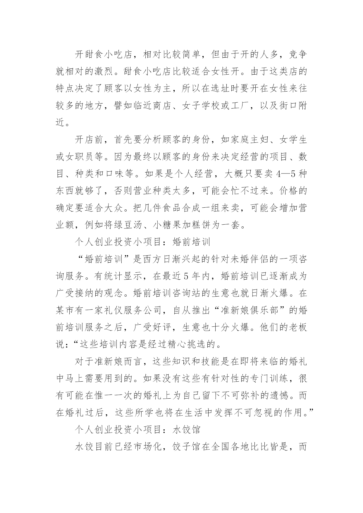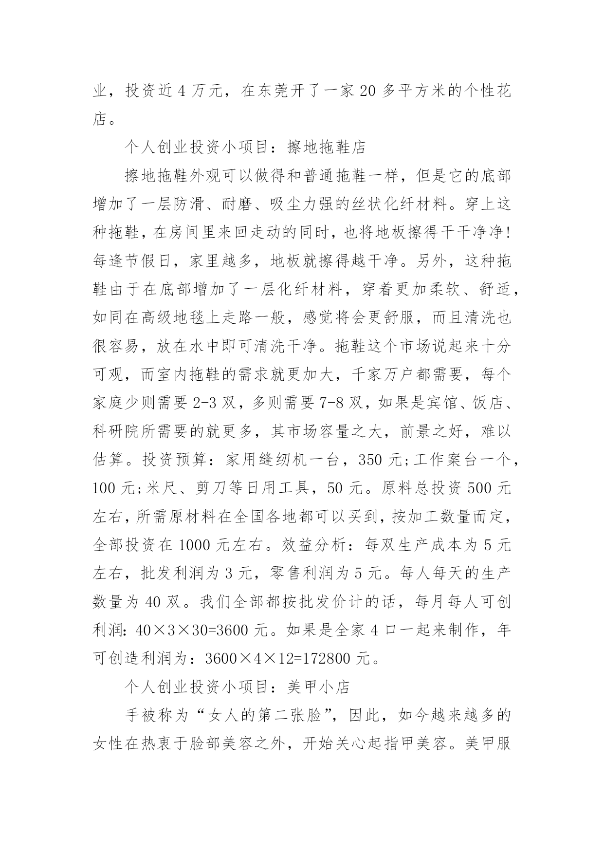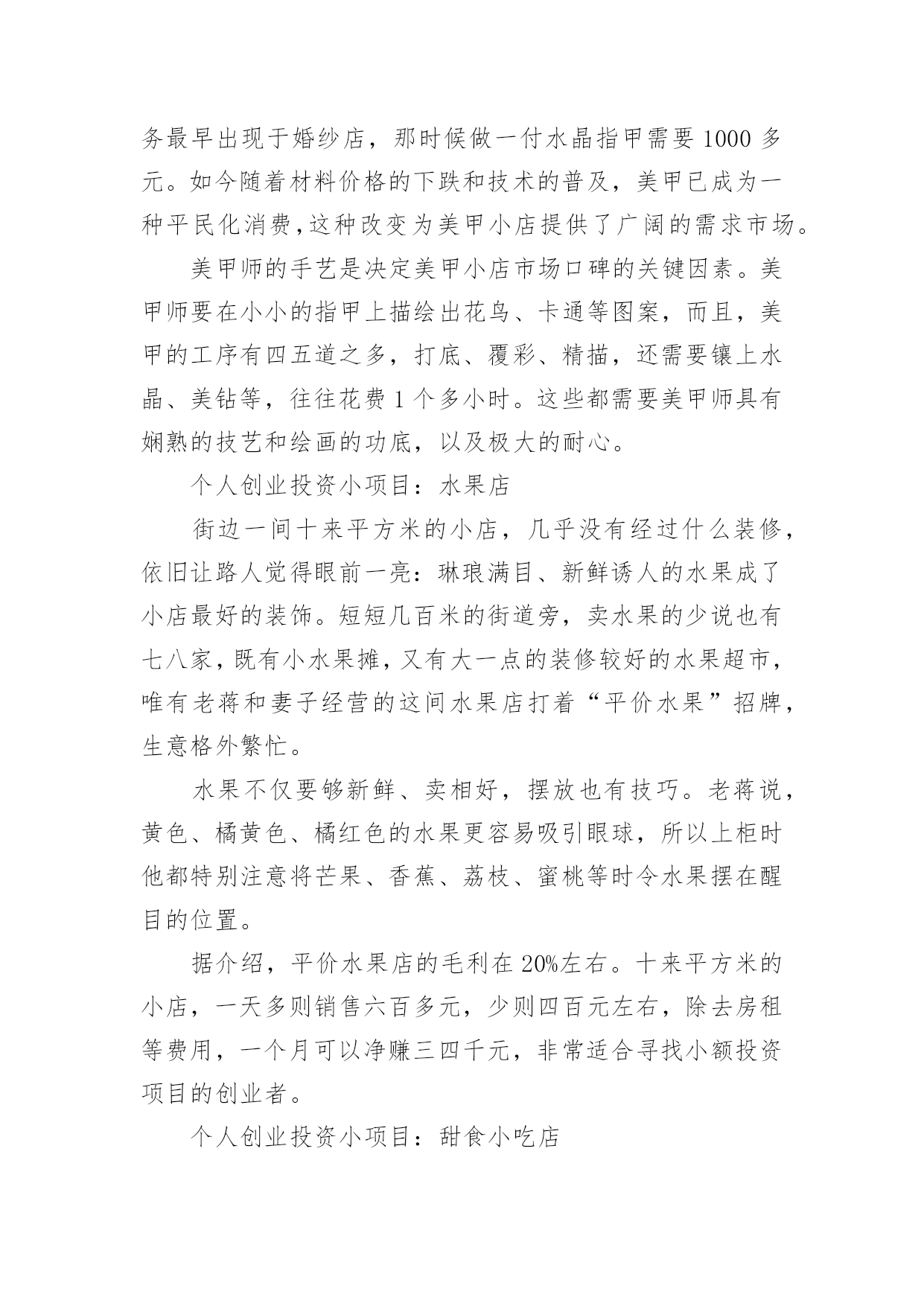 个人创业投资小项目哪里找个人创业投资小项目哪里找创业是创业者及创业搭档对他们拥有的资源或通过努力对能够拥有的资源进行优化整合,从而创造出更大经济或社会价值的过程。创业是一种需要创业者及其创业搭档组织经营管理、运用服务、技术、器物作业的思考、推理和判断的行为。下面是小编为大家收集的个人创业投资小项目,希望能够帮助到大家。个人创业投资小项目:婴儿纪念品专卖店相关调查,大陆的母婴市场每年约有800亿元的市场规模,婴儿纪念品作为分支市场之一,市场前景相当广阔。想创业如何找项目?有数据表明,省会级城市的婴儿纪念品的平均消费水平达到300—500元,有些家庭还远远超过了这一标准。目前市场上流行的婴儿纪念品包括:胎毛笔、胎毛画、手足秀等。初期投入经费也不多,5万元即可开业。此类门店一般选择在大型医院(尤其是妇儿医院)旁。采用优质、优惠服务,才能创造口碑效应。个人创业投资小项目:个性花店小店经营成功胜在有特色。在花艺行业众多竞争对手中,小小突破了其他花店的简单定位,把生意对准写字楼的公司“门面”和新人的婚庆,用地毯式宣传的“走商”形式推广自己的商品。一年前,22岁的小小结束了三年的婚庆策划职业,投资近4万元,在东莞开了一家20多平方米的个性花店。个人创业投资小项目:擦地拖鞋店擦地拖鞋外观可以做得和普通拖鞋一样,但是它的底部增加了一层防滑、耐磨、吸尘力强的丝状化纤材料。穿上这种拖鞋,在房间里来回走动的同时,也将地板擦得干干净净!每逢节假日,家里越多,地板就擦得越干净。另外,这种拖鞋由于在底部增加了一层化纤材料,穿着更加柔软、舒适,如同在高级地毯上走路一般,感觉将会更舒服,而且清洗也很容易,放在水中即可清洗干净。拖鞋这个市场说起来十分可观,而室内拖鞋的需求就更加大,千家万户都需要,每个家庭少则需要2-3双,多则需要7-8双,如果是宾馆、饭店、科研院所需要的就更多,其市场容量之大,前景之好,难以估算。投资预算:家用缝纫机一台,350元;工作案台一个,100元;米尺、剪刀等日用工具,50元。原料总投资500元左右,所需原材料在全国各地都可以买到,按加工数量而定,全部投资在1000元左右。效益分析:每双生产成本为5元左右,批发利润为3元,零售利润为5元。每人每天的生产数量为40双。我们全部都按批发价计的话,每月每人可创利润:40×3×30=3600元。如果是全家4口一起来制作,年可创造利润为:3600×4×12=172800元。个人创业投资小项目:美甲小店手被称为“女人的第二张脸”,因此,如今越来越多的女性在热衷于脸部美容之外,开始关心起指甲美容。美甲服务最早出现于婚纱店,那时候做一付水晶指甲需要1000多元。如今随着材料价格的下跌和技术的普及,美甲已成为一种平民化消费,这种改变为美甲小店提供了广阔的需求市场。美甲师的手艺是决定美甲小店市场口碑的关键因素。美甲师要在小小的指甲上描绘出花鸟、卡通等图案,而且,美甲的工序有四五道之多,打底、覆彩、精描,还需要镶上水晶、美钻等,往往花费1个多小时。这些都需要美甲师具有娴熟的技艺和绘画的功底,以及极大的耐心。个人创业投资小项目:水果店街边一间十来平方米的小店,几乎没有经过什么装修,依旧让路人觉得眼前一亮:琳琅满目、新鲜诱人的水果成了小店最好的装饰。短短几百米的街道旁,卖水果的少说也有七八家,既有小水果摊,又有大一点的装修较好的水果超市,唯有老蒋和妻子经营的这间水果店打着“平价水果”招牌,生意格外繁忙。水果不仅要够新鲜、卖相好,摆放也有技巧。老蒋说,黄色、橘黄色、橘红色的水果更容易吸引眼球,所以上柜时他都特别注意将芒果、香蕉、荔枝、蜜桃等时令水果摆在醒目的位置。据介绍,平价水果店的毛利在20%左右。十来平方米的小店,一天多则销售六百多元,少则四百元左右,除去房租等费用,一个月可以净赚三四千元,非常适合寻找小额投资项目的创业者。个人创业投资小项目:甜食小吃店开甜食小吃店,相对比较简单,但由于开的人多,竞争就相对的激烈。甜食小吃店比较适合女性开。由于这类店的特点决定了顾客以女性为主,所以在选址时要开在女性来往较多的地方,譬如临近商店、女子学校或工厂,以及街口附近。开店前,首先要分析顾客的身份,如家庭主妇、女学生或女职员等。因为最终以顾客的身份来决定经营的项目、数目、种类和口味等。如果是个人经营,大概只要卖4—5种东西就够了,否则营业种类太多,可能会忙不过来。价格的确定要适合大众。把几件食品合成一组来卖,可能会增加营业额,例如将绿豆汤、小糖果加糕饼为一套。个人创业投资小项目:婚前培训“婚前培训”是西方日渐兴起的针对未婚伴侣的一项咨询服务。有统计显示,在最近5年内,婚前培训已逐渐成为广受接纳的观念。婚前培训咨询站的生意也就日渐火爆。在某市有一家礼仪服务公司,自从推出“准新娘俱乐部”的婚前培训服务之后,广受好评,生意也