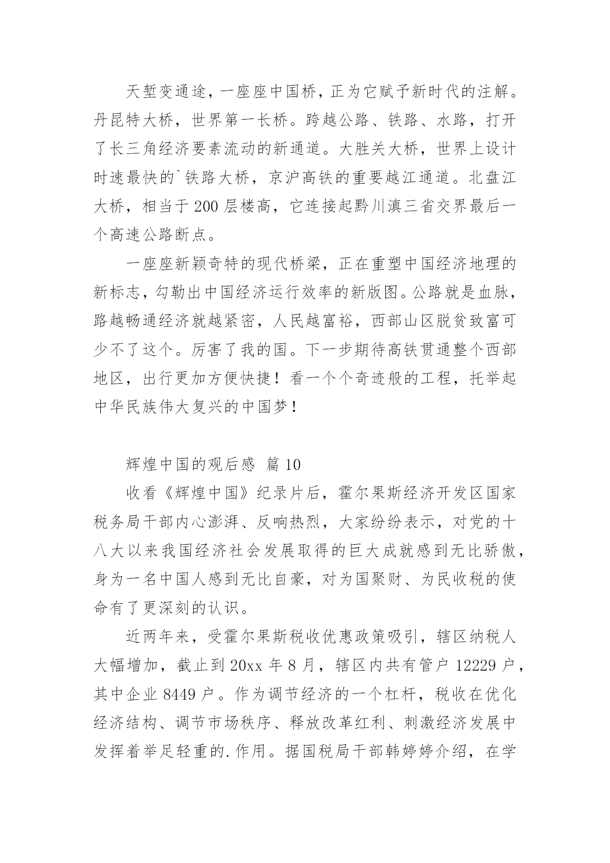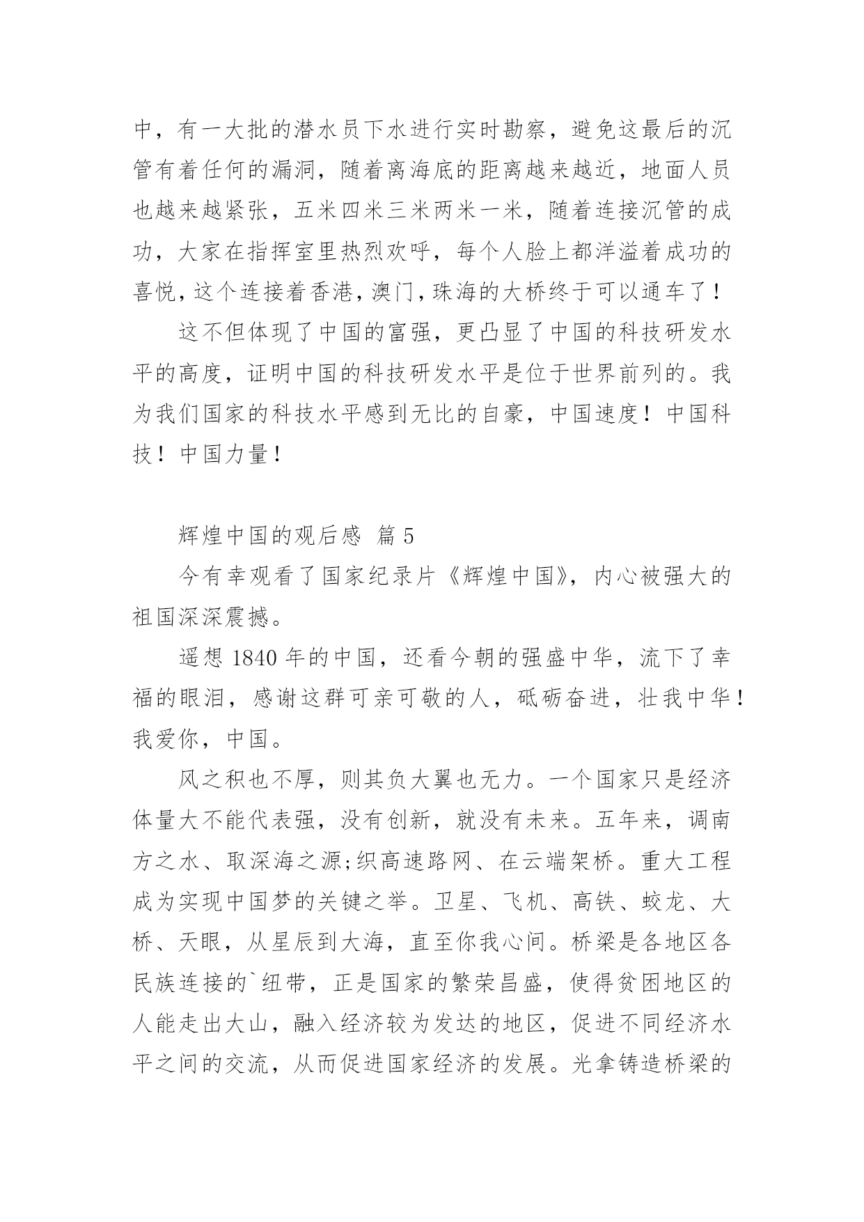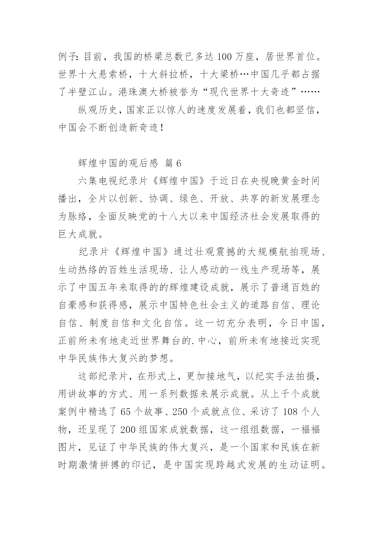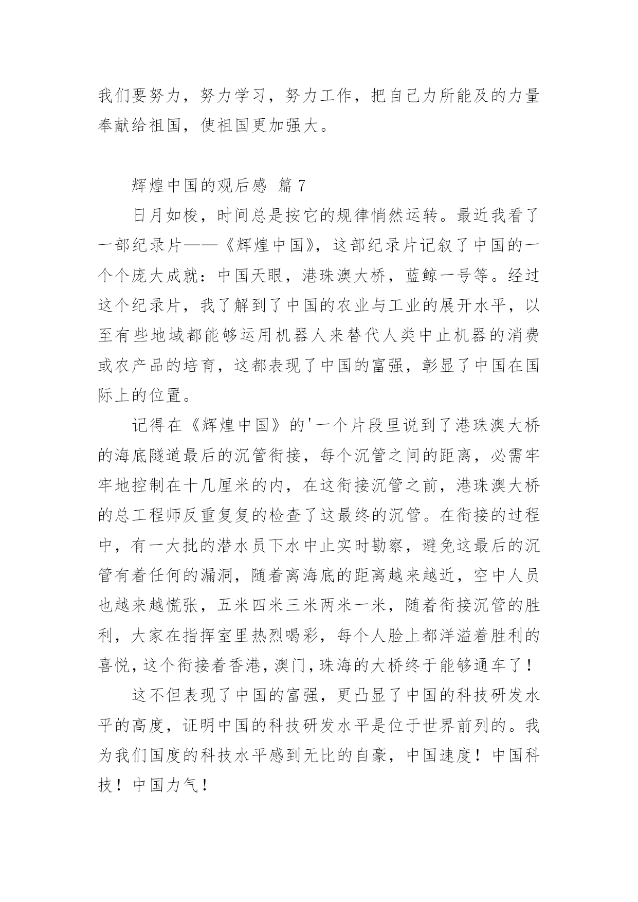 辉煌中国的观后感细细品味一部作品以后,一定有不少感悟吧,这时我们很有必要写一篇观后感了。那么你会写观后感吗?下面是小编帮大家整理的辉煌中国的观后感,欢迎阅读,希望大家能够喜欢。辉煌中国的观后感篇1风雨多经人不老,关山初度路犹长。五年来,我们面对问题不断突围,不断赢取生活的幸福和安宁,国家社会得到实质性改善。但是未来的发展之路依然充满挑战,这也是《辉煌中国》里的“故事”带给我们的警示。今日之中国,发展很快、问题也不少,我们固然有实现中国复兴梦的美好蓝图,有“一万年太久,只争朝夕”的紧迫感,但也必须要在解决人民的.需求中步步前行。躺在历史的功劳簿上诚不可取,毕其功于一役也绝不现实,这不是天真无知,就是轻浮冒进。从辩证法的视角,观察我们的社会,其本身就是一个不断发现问题和解决问题的过程。《辉煌中国》并不回避矛盾,也不掩盖问题,把问题放入中国现实语境中去分析,实现与国情对接、跟事实对接,这就是一个“好故事”产生的逻辑前提。《辉煌中国》让我们砥砺前行的五年场景,让我们对未来更有信心。中华民族伟大复兴,是几代中国人为之奋斗的梦想。圆梦工程,举世称道。圆梦有我,奔向目标!看到日益强大的祖国,我们的生活会越来越好!祖国强大是我们最伟大的后盾,让我们更加有底气,尤其是身处国外的中国人,感受更加实在。辉煌中国的观后感篇2为展现我国近些年巨大发展成果,增强学生对祖国新成就、新面孔的了解和认识,培养学生的国家荣誉感和自豪感,我院科技系全体成员于晚自习期间观看纪录片《辉煌中国》。《辉煌中国》是由中共中央宣传部、中央电视台联合制作,全篇六集,分别是《圆梦工程》《创新活力》《协调发展》《绿色家园》《共享小康》《开放中国》。这些片段展现了我国近些年科技、生活、基础设施建设和外交方面的突出表现,全国各族人民砥砺奋进、真抓实干,充分展示五年来中国人民更多的'获得感、安全感、幸福感、自豪感,真实记录中华民族实现从站起来、富起来到强起来的历史性飞跃。通过本次纪录片,同学们看到了中国在全国人民共同努力逐渐强大的过程,为此既自豪又感动,有的同学甚至不自觉的流下眼泪。衷心祝愿祖国未来更加富强。辉煌中国的观后感篇3由中宣部、中央电视台联合制作的六集电视纪录片《辉煌中国》19日起在央视播出以来引起热烈议论,作为一名中国人我感到非常自豪。“看了《辉煌中国》第一集《圆梦工程》很震撼、很振奋。道路通,百业兴。一百多年前,孙中山先生在《建国方略》中构建“振兴中华”的.宏伟蓝图时就将兰渝铁路列入了“中国铁路系统中最重要者”。然而,850公里的兰渝铁路需要穿越海拔3000米的秦岭,地势复杂多变。被称之为“鬼门关”的14公里胡麻岭隧道打了8年才贯通。兰渝铁路通车后,“人畅其行,物畅其流”。兰州与重庆的铁路运输距离将由1466公里缩短至855公里,客车运行时间由22小时缩短为6.5小时,货运年吞吐量达5000万吨。届时,中欧班列的国际货物运输时间也将节省11个小时,实现了时间的高效压缩,创造出更多的经济效益。辉煌中国的观后感篇4日月如梭,时间总是按它的规律悄然运转。最近我看了一部纪录片——《辉煌中国》,这部纪录片记述了中国的一个个巨大成就:中国天眼,港珠澳大桥,蓝鲸一号等。通过这个纪录片,我了解到了中国的农业与工业的发展程度,甚至有些地区都可以使用机器人来代替人类进行机器的生产或农产品的培育,这都体现了中国的富强,彰显了中国在国际上的地位。记得在《辉煌中国》的一个片段里说到了港珠澳大桥的海底隧道最后的沉管连接,每个沉管之间的距离,必须牢牢地控制在十几厘米的内,在这连接沉管之前,港珠澳大桥的总工程师反反复复的'检查了这最终的沉管。在连接的过程中,有一大批的潜水员下水进行实时勘察,避免这最后的沉管有着任何的漏洞,随着离海底的距离越来越近,地面人员也越来越紧张,五米四米三米两米一米,随着连接沉管的成功,大家在指挥室里热烈欢呼,每个人脸上都洋溢着成功的喜悦,这个连接着香港,澳门,珠海的大桥终于可以通车了!这不但体现了中国的富强,更凸显了中国的科技研发水平的高度,证明中国的科技研发水平是位于世界前列的。我为我们国家的科技水平感到无比的自豪,中国速度!中国科技!中国力量!辉煌中国的观后感篇5今有幸观看了国家纪录片《辉煌中国》,内心被强大的祖国深深震撼。遥想1840年的中国,还看今朝的强盛中华,流下了幸福的眼泪,感谢这群可亲可敬的人,砥砺奋进,壮我中华!我爱你,中国。风之积也不厚,则其负大翼也无力。一个国家只是经济体量大不能代表强,没有创新,就没有未来。五年来,调南方之水、取深海之源;织高速路网、在云端架桥。重大工程成为实现中国梦的关键之举。卫星、飞机、高铁、蛟龙、大桥、天眼,从星辰到大海,直至你我心间。桥梁是各地区各民族连接的`纽带,正是国家的繁荣昌盛,使得贫困地区的人能走出大山,融入经济较为发达的
