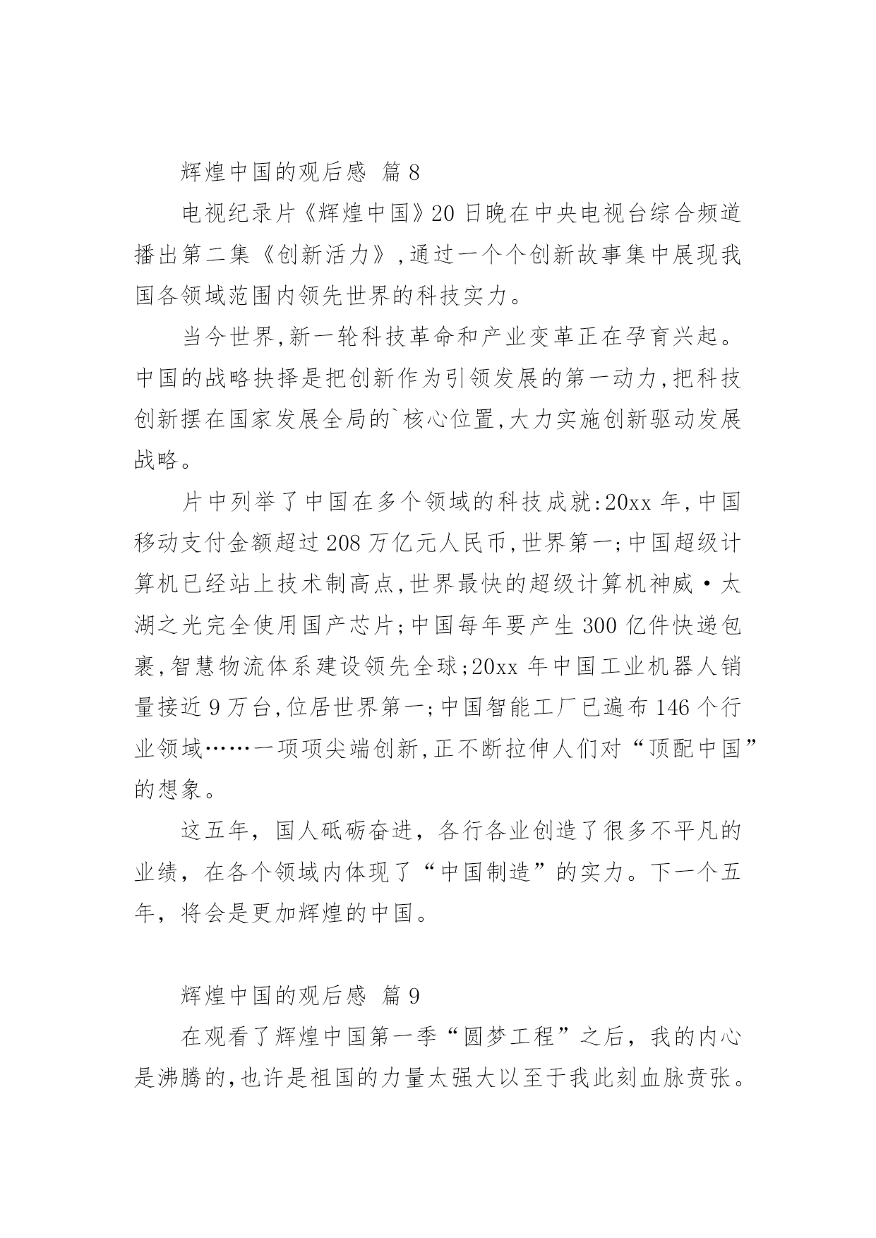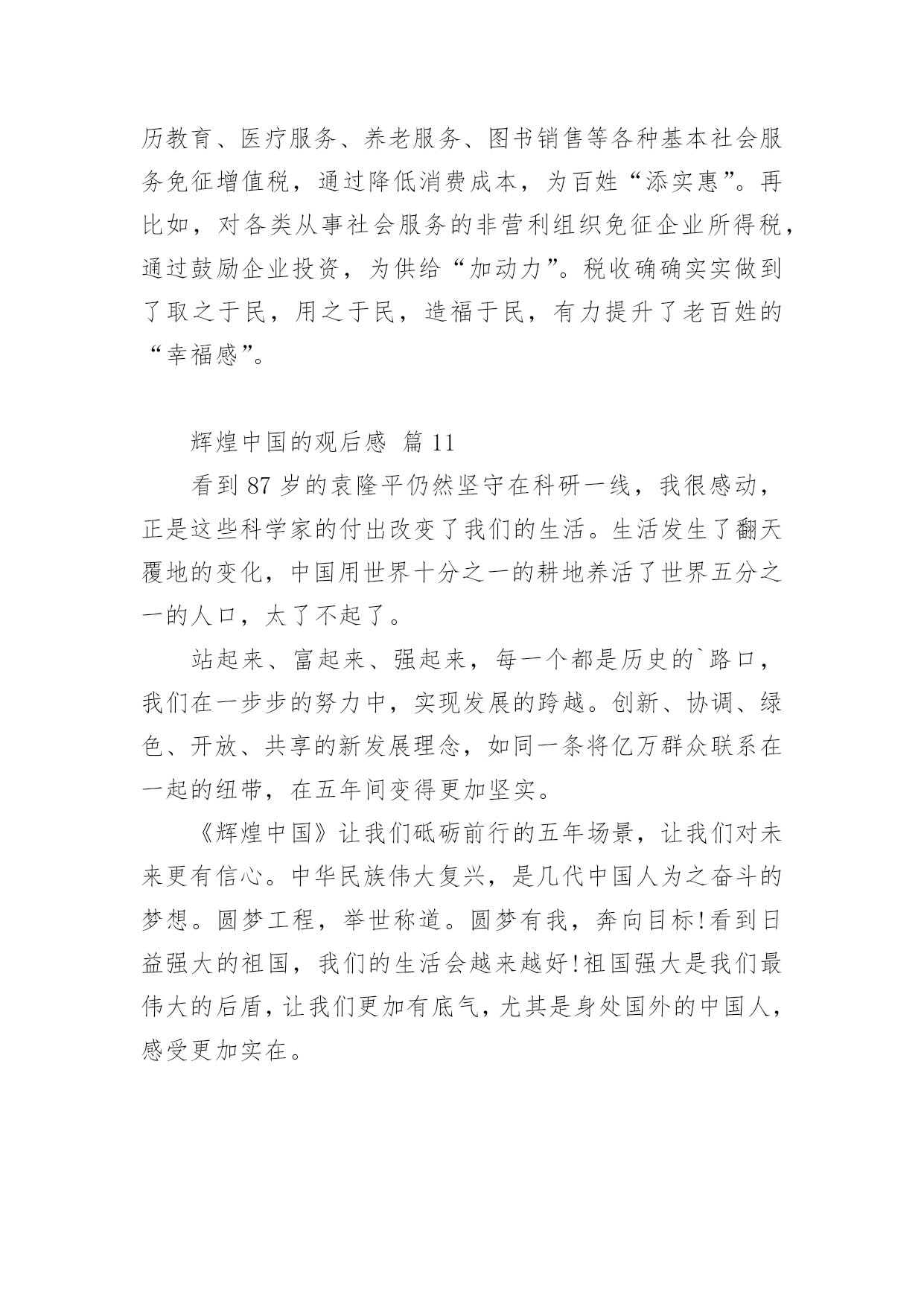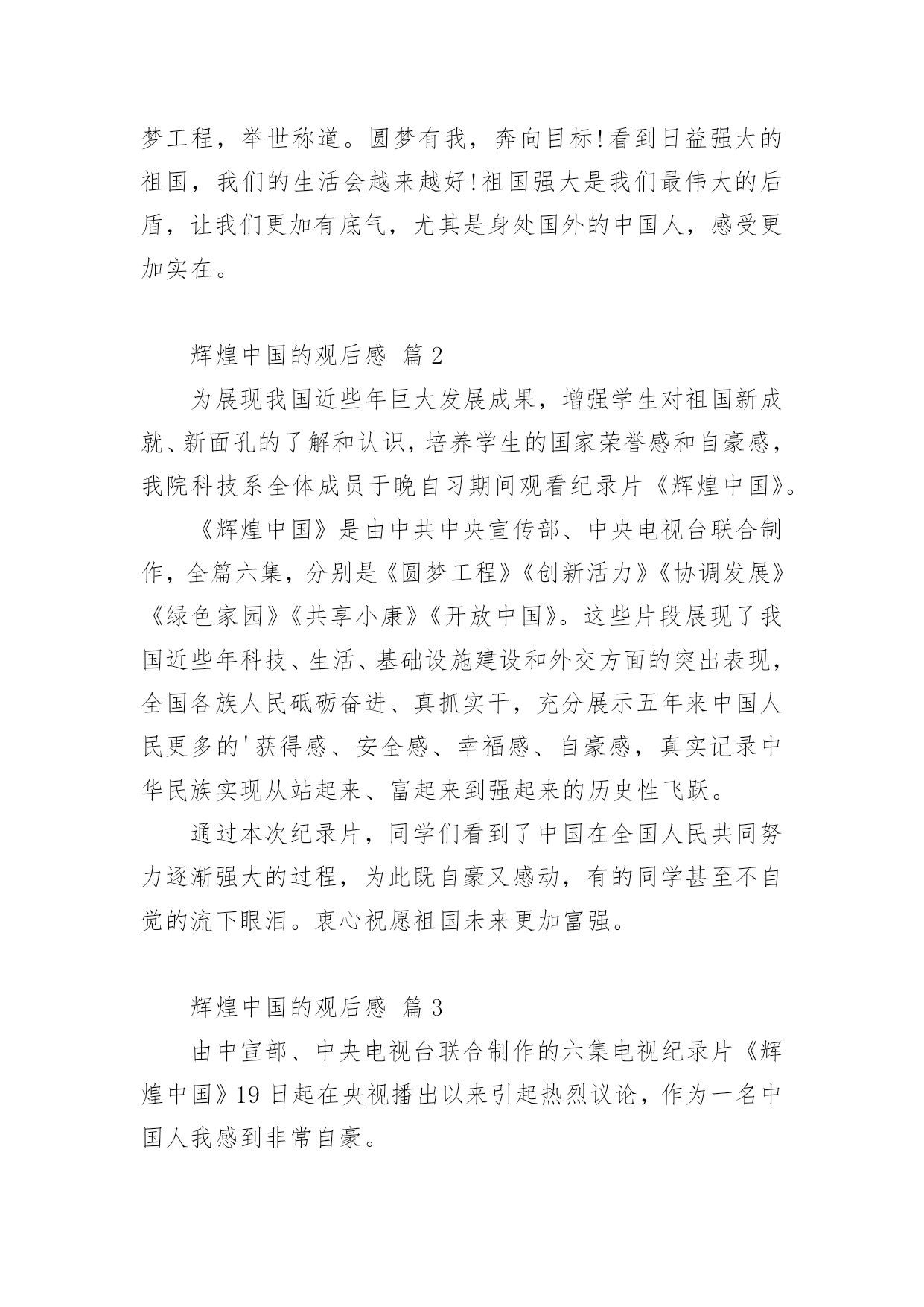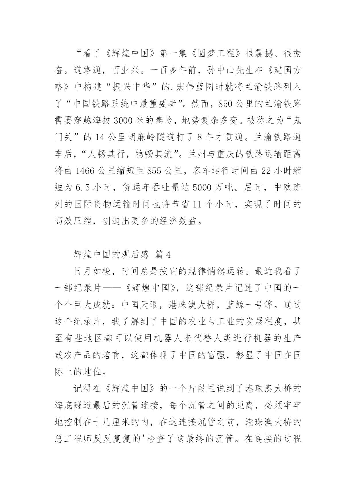 辉煌中国的观后感细细品味一部作品以后,一定有不少感悟吧,这时我们很有必要写一篇观后感了。那么你会写观后感吗?下面是小编帮大家整理的辉煌中国的观后感,欢迎阅读,希望大家能够喜欢。辉煌中国的观后感篇1风雨多经人不老,关山初度路犹长。五年来,我们面对问题不断突围,不断赢取生活的幸福和安宁,国家社会得到实质性改善。但是未来的发展之路依然充满挑战,这也是《辉煌中国》里的“故事”带给我们的警示。今日之中国,发展很快、问题也不少,我们固然有实现中国复兴梦的美好蓝图,有“一万年太久,只争朝夕”的紧迫感,但也必须要在解决人民的.需求中步步前行。躺在历史的功劳簿上诚不可取,毕其功于一役也绝不现实,这不是天真无知,就是轻浮冒进。从辩证法的视角,观察我们的社会,其本身就是一个不断发现问题和解决问题的过程。《辉煌中国》并不回避矛盾,也不掩盖问题,把问题放入中国现实语境中去分析,实现与国情对接、跟事实对接,这就是一个“好故事”产生的逻辑前提。《辉煌中国》让我们砥砺前行的五年场景,让我们对未来更有信心。中华民族伟大复兴,是几代中国人为之奋斗的梦想。圆梦工程,举世称道。圆梦有我,奔向目标!看到日益强大的祖国,我们的生活会越来越好!祖国强大是我们最伟大的后盾,让我们更加有底气,尤其是身处国外的中国人,感受更加实在。辉煌中国的观后感篇2为展现我国近些年巨大发展成果,增强学生对祖国新成就、新面孔的了解和认识,培养学生的国家荣誉感和自豪感,我院科技系全体成员于晚自习期间观看纪录片《辉煌中国》。《辉煌中国》是由中共中央宣传部、中央电视台联合制作,全篇六集,分别是《圆梦工程》《创新活力》《协调发展》《绿色家园》《共享小康》《开放中国》。这些片段展现了我国近些年科技、生活、基础设施建设和外交方面的突出表现,全国各族人民砥砺奋进、真抓实干,充分展示五年来中国人民更多的'获得感、安全感、幸福感、自豪感,真实记录中华民族实现从站起来、富起来到强起来的历史性飞跃。通过本次纪录片,同学们看到了中国在全国人民共同努力逐渐强大的过程,为此既自豪又感动,有的同学甚至不自觉的流下眼泪。衷心祝愿祖国未来更加富强。辉煌中国的观后感篇3由中宣部、中央电视台联合制作的六集电视纪录片《辉煌中国》19日起在央视播出以来引起热烈议论,作为一名中国人我感到非常自豪。“看了《辉煌中国》第一集《圆梦工程》很震撼、很振奋。道路通,百业兴。一百多年前,孙中山先生在《建国方略》中构建“振兴中华”的.宏伟蓝图时就将兰渝铁路列入了“中国铁路系统中最重要者”。然而,850公里的兰渝铁路需要穿越海拔3000米的秦岭,地势复杂多变。被称之为“鬼门关”的14公里胡麻岭隧道打了8年才贯通。兰渝铁路通车后,“人畅其行,物畅其流”。兰州与重庆的铁路运输距离将由1466公里缩短至855公里,客车运行时间由22小时缩短为6.5小时,货运年吞吐量达5000万吨。届时,中欧班列的国际货物运输时间也将节省11个小时,实现了时间的高效压缩,创造出更多的经济效益。辉煌中国的观后感篇4日月如梭,时间总是按它的规律悄然运转。最近我看了一部纪录片——《辉煌中国》,这部纪录片记述了中国的一个个巨大成就:中国天眼,港珠澳大桥,蓝鲸一号等。通过这个纪录片,我了解到了中国的农业与工业的发展程度,甚至有些地区都可以使用机器人来代替人类进行机器的生产或农产品的培育,这都体现了中国的富强,彰显了中国在国际上的地位。记得在《辉煌中国》的一个片段里说到了港珠澳大桥的海底隧道最后的沉管连接,每个沉管之间的距离,必须牢牢地控制在十几厘米的内,在这连接沉管之前,港珠澳大桥的总工程师反反复复的'检查了这最终的沉管。在连接的过程中,有一大批的潜水员下水进行实时勘察,避免这最后的沉管有着任何的漏洞,随着离海底的距离越来越近,地面人员也越来越紧张,五米四米三米两米一米,随着连接沉管的成功,大家在指挥室里热烈欢呼,每个人脸上都洋溢着成功的喜悦,这个连接着香港,澳门,珠海的大桥终于可以通车了!这不但体现了中国的富强,更凸显了中国的科技研发水平的高度,证明中国的科技研发水平是位于世界前列的。我为我们国家的科技水平感到无比的自豪,中国速度!中国科技!中国力量!辉煌中国的观后感篇5今有幸观看了国家纪录片《辉煌中国》,内心被强大的祖国深深震撼。遥想1840年的中国,还看今朝的强盛中华,流下了幸福的眼泪,感谢这群可亲可敬的人,砥砺奋进,壮我中华!我爱你,中国。风之积也不厚,则其负大翼也无力。一个国家只是经济体量大不能代表强,没有创新,就没有未来。五年来,调南方之水、取深海之源;织高速路网、在云端架桥。重大工程成为实现中国梦的关键之举。卫星、飞机、高铁、蛟龙、大桥、天眼,从星辰到大海,直至你我心间。桥梁是各地区各民族连接的`纽带,正是国家的繁荣昌盛,使得贫困地区的人能走出大山,融入经济较为发达的