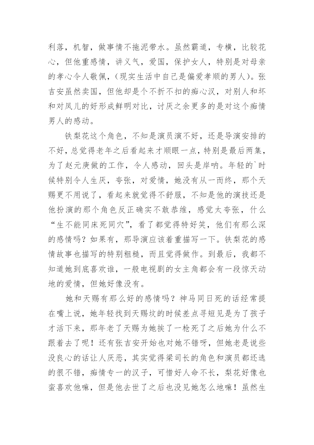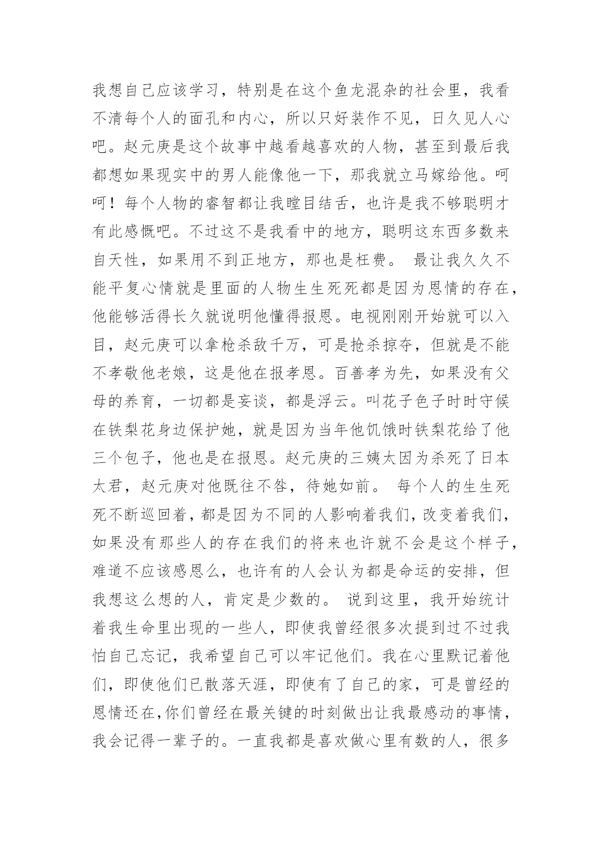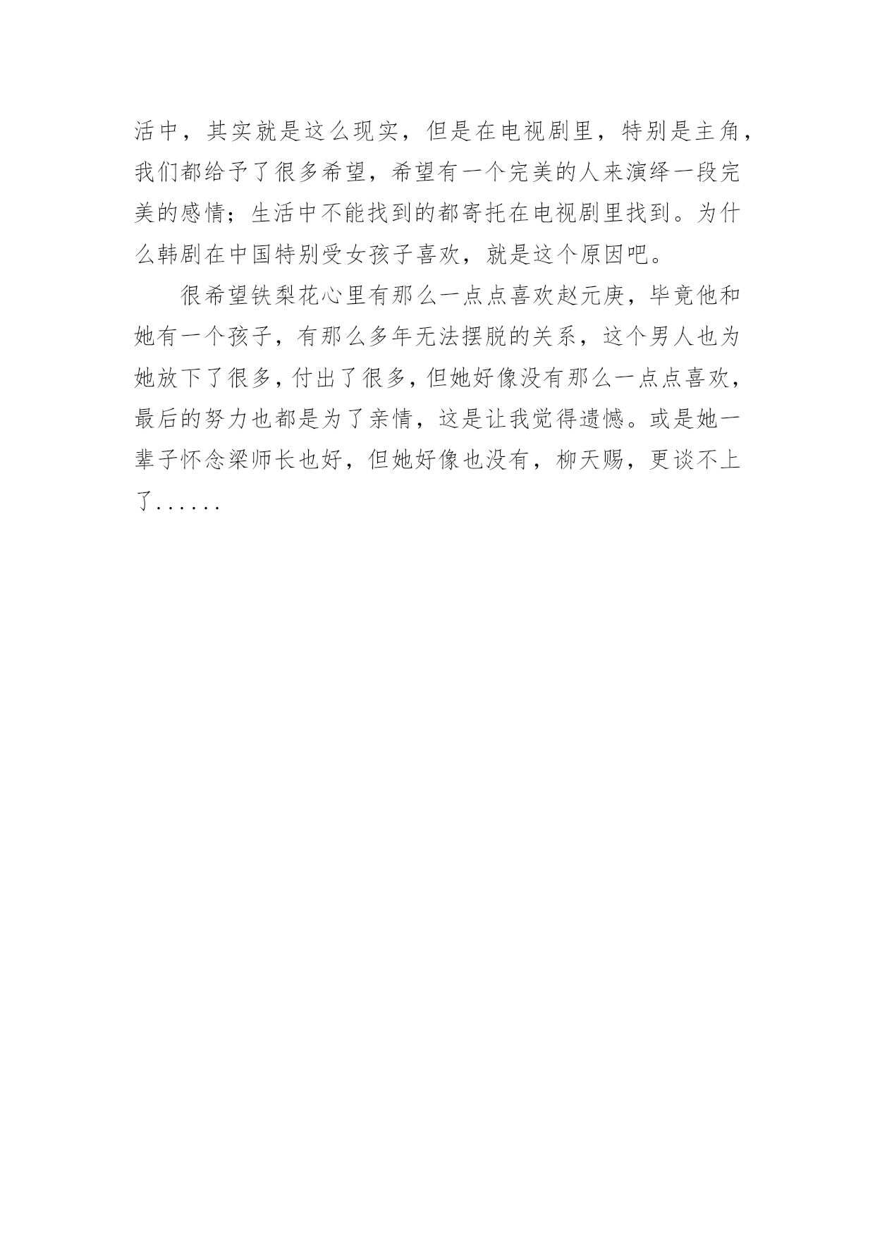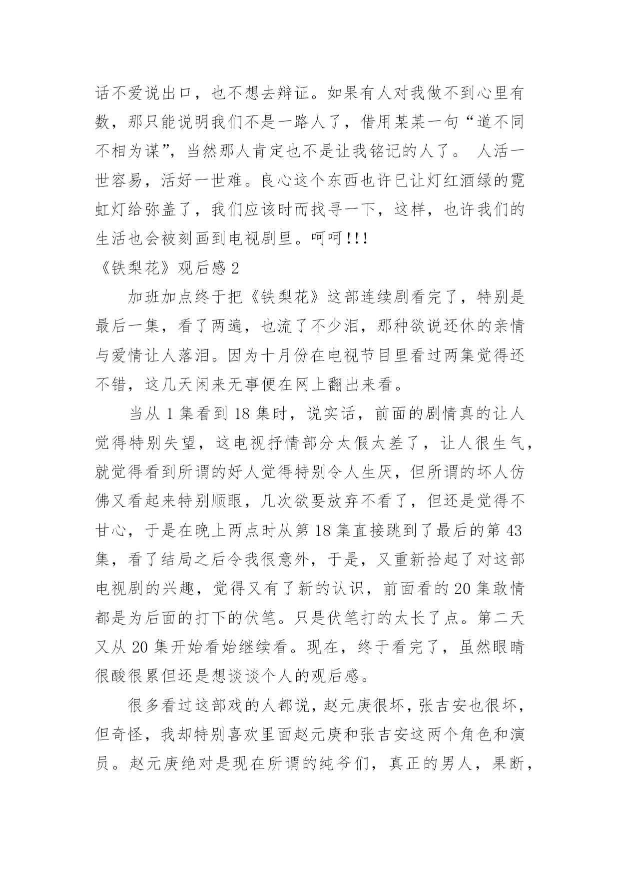 《铁梨花》观后感《铁梨花》观后感当认真看完一部作品后,相信你会有不少感想吧,这时候最关键的观后感不能忘了。在写观后感之前,可以先参考范文,以下是小编帮大家整理的《铁梨花》观后感,仅供参考,欢迎大家阅读。《铁梨花》观后感1又完整的看完了一部电视剧《铁梨花》,记得当时上学时看完《士兵突击》时心中沸腾了好多天。今天又找到了这种感觉,本来是要睡觉休息一下的,结果心中的兴奋让我久久不能入睡。只好起来完成我的观后感。《铁梨花》观完之后脑袋里显现的第一个字也是唯一一个字,就是“恩”。整个剧情都是围绕着人情之间的恩在延续,就是这个恩字让很多危险都及时化解,就是这个恩字让很多的怨和恨都漂之云霄。电视剧里面的故事和人物毕竟是虚构或者刻画的,然而我想,人物我们也许在现实中找不到,但我们可以找到相像的.。可是里面反映出来的道理我们不能不琢磨,无论现实中还是电视情节中,这个道理是真真切切存在的。也许时代不同,我们所拥有的思想不同,《铁梨花》里面人物的聪明英武不得不让人折服,铁梨花刚刚进入赵家时面对仇人却还笑脸相迎,让人看不到一丝她要逃走的迹象。这种女人我想自己应该学习,特别是在这个鱼龙混杂的社会里,我看不清每个人的面孔和内心,所以只好装作不见,日久见人心吧。赵元庚是这个故事中越看越喜欢的人物,甚至到最后我都想如果现实中的男人能像他一下,那我就立马嫁给他。呵呵!每个人物的睿智都让我瞠目结舌,也许是我不够聪明才有此感慨吧。不过这不是我看中的地方,聪明这东西多数来自天性,如果用不到正地方,那也是枉费。最让我久久不能平复心情就是里面的人物生生死死都是因为恩情的存在,他能够活得长久就说明他懂得报恩。电视刚刚开始就可以入目,赵元庚可以拿枪杀敌千万,可是抢杀掠夺,但就是不能不孝敬他老娘,这是他在报孝恩。百善孝为先,如果没有父母的养育,一切都是妄谈,都是浮云。叫花子色子时时守候在铁梨花身边保护她,就是因为当年他饥饿时铁梨花给了他三个包子,他也是在报恩。赵元庚的三姨太因为杀死了日本太君,赵元庚对他既往不咎,待她如前。每个人的生生死死不断巡回着,都是因为不同的人影响着我们,改变着我们,如果没有那些人的存在我们的将来也许就不会是这个样子,难道不应该感恩么,也许有的人会认为都是命运的安排,但我想这么想的人,肯定是少数的。说到这里,我开始统计着我生命里出现的一些人,即使我曾经很多次提到过不过我怕自己忘记,我希望自己可以牢记他们。我在心里默记着他们,即使他们已散落天涯,即使有了自己的家,可是曾经的恩情还在,你们曾经在最关键的时刻做出让我最感动的事情,我会记得一辈子的。一直我都是喜欢做心里有数的人,很多话不爱说出口,也不想去辩证。如果有人对我做不到心里有数,那只能说明我们不是一路人了,借用某某一句“道不同不相为谋”,当然那人肯定也不是让我铭记的人了。人活一世容易,活好一世难。良心这个东西也许已让灯红酒绿的霓虹灯给弥盖了,我们应该时而找寻一下,这样,也许我们的生活也会被刻画到电视剧里。呵呵!!!《铁梨花》观后感2加班加点终于把《铁梨花》这部连续剧看完了,特别是最后一集,看了两遍,也流了不少泪,那种欲说还休的亲情与爱情让人落泪。因为十月份在电视节目里看过两集觉得还不错,这几天闲来无事便在网上翻出来看。当从1集看到18集时,说实话,前面的剧情真的让人觉得特别失望,这电视抒情部分太假太差了,让人很生气,就觉得看到所谓的好人觉得特别令人生厌,但所谓的坏人仿佛又看起来特别顺眼,几次欲要放弃不看了,但还是觉得不甘心,于是在晚上两点时从第18集直接跳到了最后的第43集,看了结局之后令我很意外,于是,又重新拾起了对这部电视剧的兴趣,觉得又有了新的认识,前面看的20集敢情都是为后面的打下的伏笔。只是伏笔打的太长了点。第二天又从20集开始看始继续看。现在,终于看完了,虽然眼睛很酸很累但还是想谈谈个人的观后感。很多看过这部戏的人都说,赵元庚很坏,张吉安也很坏,但奇怪,我却特别喜欢里面赵元庚和张吉安这两个角色和演员。赵元庚绝对是现在所谓的纯爷们,真正的男人,果断,利落,机智,做事情不拖泥带水。虽然霸道,专横,比较花心,但他重感情,讲义气,爱国,保护女人,特别是对母亲的孝心令人敬佩,(现实生活中自己是偏爱孝顺的男人)。张吉安虽然卖国,但他却是个不折不扣的痴心汉,对别人和坏和对凤儿的好形成鲜明对比,讨厌之余更多的是对这个痴情男人的感动。铁梨花这个角色,不知是演员演不好,还是导演安排的不好,总觉得老年之后看起来才顺眼一点,特别是最后两集,为了赵元庚做的工作,令人感动,回头是岸呐。年轻的`时候特别令人生厌,夸张,对爱情,她没有从一而终,那个天赐更不用说了,看起来就觉得不舒服,不知是他的演技还是他扮演的那个角色反正确实不敢恭维,感觉太夸张,什么“生不能同床死同穴”,看了都觉得特好笑,他们有那么深的感情吗?如果有,