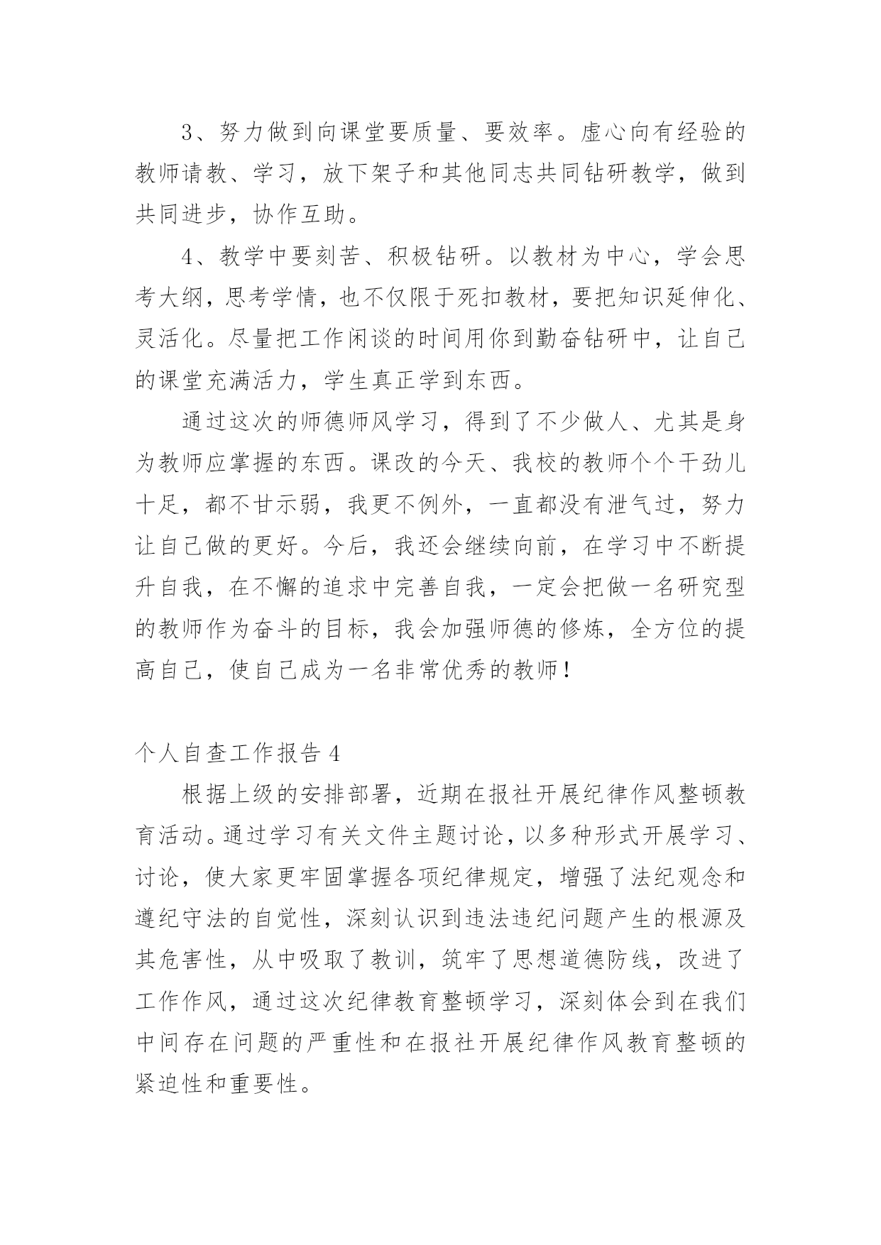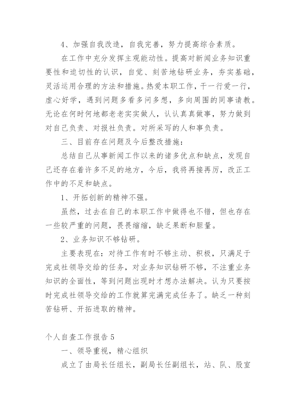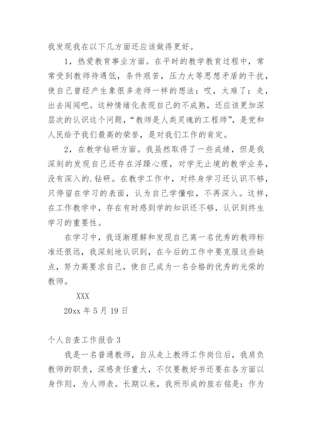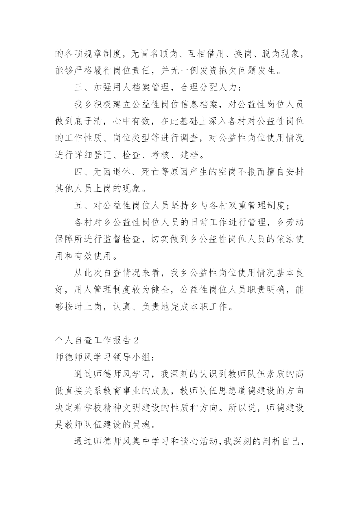 个人自查工作报告在经济飞速发展的今天,接触并使用报告的人越来越多,我们在写报告的时候要注意涵盖报告的基本要素。一起来参考报告是怎么写的吧,以下是小编为大家整理的个人自查工作报告,仅供参考,欢迎大家阅读。个人自查工作报告1为进一步做好我乡公益性岗位的管理工作,使我乡就业困难人员真正得到就业援助和帮助,根据x号文件精神,我乡于20xx年3月21日至20xx年3月25日对全乡所有公益性岗位的'工作性质、岗位类型、岗位使用情况进行了一次全面的检查。现将检查结果报告如下:一、乡公益性岗位基本情况:乡公益性岗位人员共计6名,其中民政政公益性岗位1名;计划生育公益性岗位1名;社会保障服务公益性岗位1名;保洁员2名。我乡对公益性岗位人员实行每日签到制度;所有人员有事必须办理请假手续制度。通过在岗、出勤情况自查,我乡公益性岗位人员出勤、在岗情况均符合岗位要求。二、坚持“谁用人、谁管理”原则:由乡劳动保障所统一掌握公益性岗位人员的总体情况并负责岗位设置、工作绩效考核。同时每季度对公益性岗位人员进行“背靠背”考核,确保公益性岗位有进步、有成绩、有社会效益。通过自查,我乡公益性岗位人员严格执行乡里的各项规章制度,无冒名顶岗、互相借用、换岗、脱岗现象,能够严格履行岗位责任,并无一例发资拖欠问题发生。三、加强用人档案管理,合理分配人力:我乡积极建立公益性岗位信息档案,对公益性岗位人员做到底子清,心中有数,在此基础上深入各村对公益性岗位的工作性质、岗位类型等进行调查,对公益性岗位使用情况进行详细登记、检查、考核、建档。四、无因退休、死亡等原因产生的空岗不报而擅自安排其他人员上岗的现象。五、对公益性岗位人员坚持乡与各村双重管理制度;各村对乡公益性岗位人员的日常工作进行管理,乡劳动保障所进行监督检查,切实做到乡公益性岗位人员的依法使用和有效使用。从此次自查情况来看,我乡公益性岗位使用情况基本良好,用人管理制度较为健全,公益性岗位人员职责明确,能够按时上岗,认真、负责地完成本职工作。个人自查工作报告2师德师风学习领导小组:通过师德师风学习,我深刻的认识到教师队伍素质的高低直接关系教育事业的成败,教师队伍思想道德建设的方向决定着学校精神文明建设的性质和方向。所以说,师德建设是教师队伍建设的灵魂。通过师德师风集中学习和谈心活动,我深刻的剖析自己,我发现我在以下几方面还应该做得更好。1,热爱教育事业方面。在平时的教学教育过程中,常常受到教师待遇低,条件艰苦,压力大等思想矛盾的干扰,使自己曾经产生象很多老师一样的想法:哎,太难了;走,出去闯闯吧。这种情绪化表现自己的不成熟,还应该更加深层次的认识这个问题,“教师是人类灵魂的工程师”,是党和人民给予我们最高的荣誉,是对我们工作的肯定。2,在教学钻研方面。我虽然取得了一些成绩,但是我深刻的发现自己还存在浮躁心理,对学无止境的教学业务,没有深入的.钻研。在教学工作中,对终身学习还认识不够,只停留在学习的表面,认为自己学懂啦,不再深入。这样,在工作教学中,存在有时感到学的知识还不够,认识到终生学习的重要性。在学习中,我逐渐理解和发现自己离一名优秀的教师标准还很远,我深刻地认识到,在今后的工作中要克服这些缺点,努力高要求自己,使自己成为一名合格的优秀的光荣的教师。XXX20xx年5月19日个人自查工作报告3我是一名普通教师,自从走上教师工作岗位后,我肩负教师的职责,深感责任重大,不仅要教好书还要在各方面以身作则,为人师表。长期以来,我所形成的座右铭是:作为一名人类灵魂的工程师,必须要自觉坚持用“为人师表”和“教书育人”这两条作为自己的行为规范——要出自内心的爱学生,以平等的身份待学生,以尽可能多的时间与学生打成一片,并尽己所能授业于学生。有一首歌最为动人,那就是师德;有一种人生最为美丽,那就是教师;有一道风景线最为绮丽,那就是师魂。学高为师,身正为范。教师是学生心目中的楷模,关系到学生的成长,关系到教育业的发展,所以对于每个教师来说,德就显得至关重要。因此,借助于师德师风学习这个学习的良机,我对自己做了自查自纠,并对出现的问题作了整改。其具体自我查摆总结如下:一、基本情况1、团结协作工作中,和同志们相处都是一直以“和谐”为贵,以“尊重”为首,从不与同志闹矛盾,和他们一起钻研、一起讨论。2、廉洁从教我一直都不以教谋私,强烈抵制社会不良风气,不从事带有盈利性质的活动;不乱收费、不乱调课,不借学生家长办私事,不索取或接受学生家长的馈赠。3、为人师表我一直在“为人师表”这方面特别注重,尊重社会公德,不参与有损形象的娱乐活动,做到工作期间,衣着规范,课上不接打电话,以免影响上课,言行不粗暴,对学生亲切、温和。4、爱岗敬业我热爱教育,所以我选择了它,从教二十年来,我一直把教育当成是重要的事业来干,把教育学生看成是职责来做,认真备课,精心授