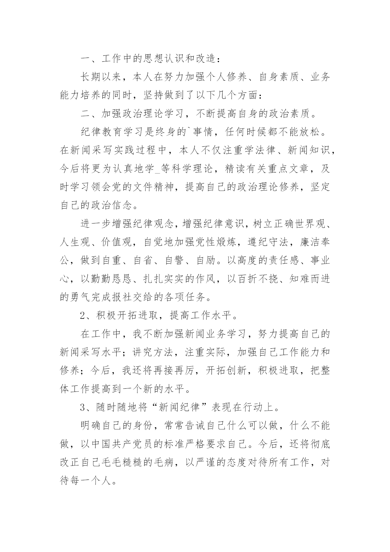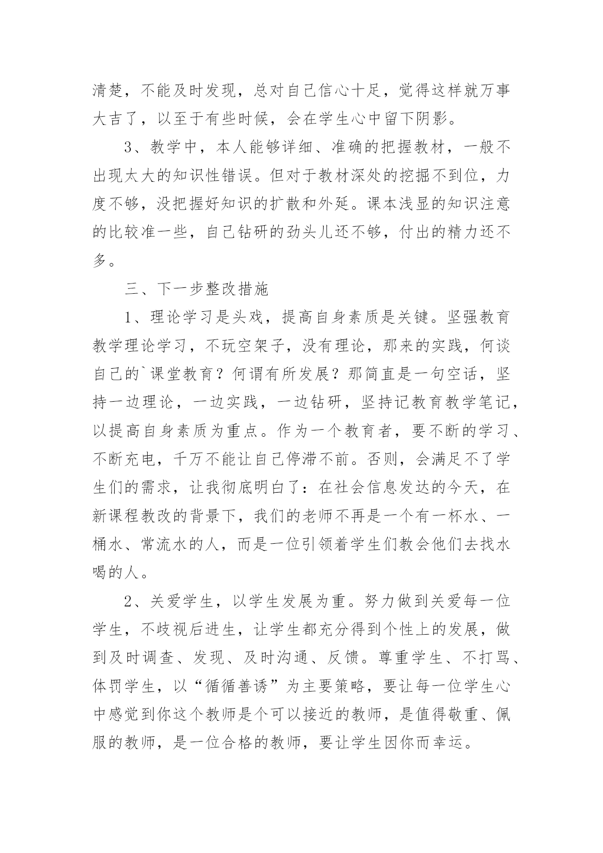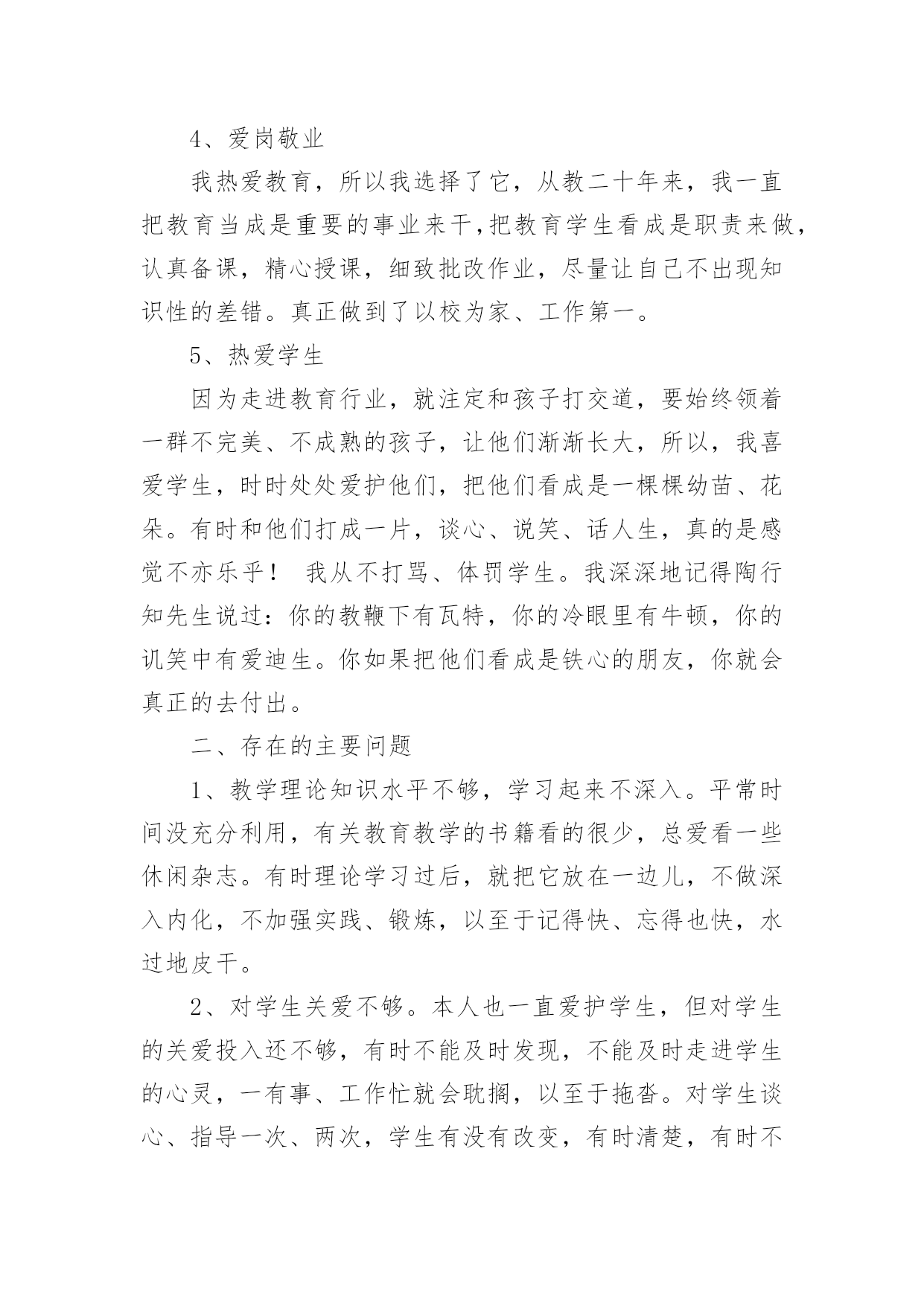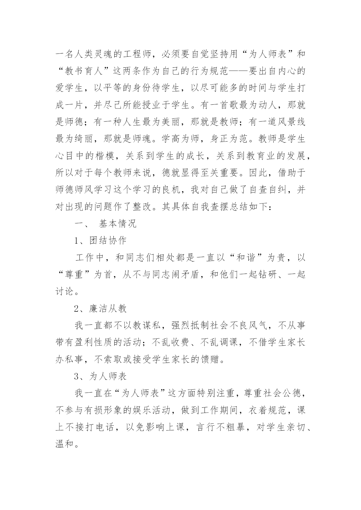 个人自查工作报告在经济飞速发展的今天,接触并使用报告的人越来越多,我们在写报告的时候要注意涵盖报告的基本要素。一起来参考报告是怎么写的吧,以下是小编为大家整理的个人自查工作报告,仅供参考,欢迎大家阅读。个人自查工作报告1为进一步做好我乡公益性岗位的管理工作,使我乡就业困难人员真正得到就业援助和帮助,根据x号文件精神,我乡于20xx年3月21日至20xx年3月25日对全乡所有公益性岗位的'工作性质、岗位类型、岗位使用情况进行了一次全面的检查。现将检查结果报告如下:一、乡公益性岗位基本情况:乡公益性岗位人员共计6名,其中民政政公益性岗位1名;计划生育公益性岗位1名;社会保障服务公益性岗位1名;保洁员2名。我乡对公益性岗位人员实行每日签到制度;所有人员有事必须办理请假手续制度。通过在岗、出勤情况自查,我乡公益性岗位人员出勤、在岗情况均符合岗位要求。二、坚持“谁用人、谁管理”原则:由乡劳动保障所统一掌握公益性岗位人员的总体情况并负责岗位设置、工作绩效考核。同时每季度对公益性岗位人员进行“背靠背”考核,确保公益性岗位有进步、有成绩、有社会效益。通过自查,我乡公益性岗位人员严格执行乡里的各项规章制度,无冒名顶岗、互相借用、换岗、脱岗现象,能够严格履行岗位责任,并无一例发资拖欠问题发生。三、加强用人档案管理,合理分配人力:我乡积极建立公益性岗位信息档案,对公益性岗位人员做到底子清,心中有数,在此基础上深入各村对公益性岗位的工作性质、岗位类型等进行调查,对公益性岗位使用情况进行详细登记、检查、考核、建档。四、无因退休、死亡等原因产生的空岗不报而擅自安排其他人员上岗的现象。五、对公益性岗位人员坚持乡与各村双重管理制度;各村对乡公益性岗位人员的日常工作进行管理,乡劳动保障所进行监督检查,切实做到乡公益性岗位人员的依法使用和有效使用。从此次自查情况来看,我乡公益性岗位使用情况基本良好,用人管理制度较为健全,公益性岗位人员职责明确,能够按时上岗,认真、负责地完成本职工作。个人自查工作报告2师德师风学习领导小组:通过师德师风学习,我深刻的认识到教师队伍素质的高低直接关系教育事业的成败,教师队伍思想道德建设的方向决定着学校精神文明建设的性质和方向。所以说,师德建设是教师队伍建设的灵魂。通过师德师风集中学习和谈心活动,我深刻的剖析自己,我发现我在以下几方面还应该做得更好。1,热爱教育事业方面。在平时的教学教育过程中,常常受到教师待遇低,条件艰苦,压力大等思想矛盾的干扰,使自己曾经产生象很多老师一样的想法:哎,太难了;走,出去闯闯吧。这种情绪化表现自己的不成熟,还应该更加深层次的认识这个问题,“教师是人类灵魂的工程师”,是党和人民给予我们最高的荣誉,是对我们工作的肯定。2,在教学钻研方面。我虽然取得了一些成绩,但是我深刻的发现自己还存在浮躁心理,对学无止境的教学业务,没有深入的.钻研。在教学工作中,对终身学习还认识不够,只停留在学习的表面,认为自己学懂啦,不再深入。这样,在工作教学中,存在有时感到学的知识还不够,认识到终生学习的重要性。在学习中,我逐渐理解和发现自己离一名优秀的教师标准还很远,我深刻地认识到,在今后的工作中要克服这些缺点,努力高要求自己,使自己成为一名合格的优秀的光荣的教师。XXX20xx年5月19日个人自查工作报告3我是一名普通教师,自从走上教师工作岗位后,我肩负教师的职责,深感责任重大,不仅要教好书还要在各方面以身作则,为人师表。长期以来,我所形成的座右铭是:作为一名人类灵魂的工程师,必须要自觉坚持用“为人师表”和“教书育人”这两条作为自己的行为规范——要出自内心的爱学生,以平等的身份待学生,以尽可能多的时间与学生打成一片,并尽己所能授业于学生。有一首歌最为动人,那就是师德;有一种人生最为美丽,那就是教师;有一道风景线最为绮丽,那就是师魂。学高为师,身正为范。教师是学生心目中的楷模,关系到学生的成长,关系到教育业的发展,所以对于每个教师来说,德就显得至关重要。因此,借助于师德师风学习这个学习的良机,我对自己做了自查自纠,并对出现的问题作了整改。其具体自我查摆总结如下:一、基本情况1、团结协作工作中,和同志们相处都是一直以“和谐”为贵,以“尊重”为首,从不与同志闹矛盾,和他们一起钻研、一起讨论。2、廉洁从教我一直都不以教谋私,强烈抵制社会不良风气,不从事带有盈利性质的活动;不乱收费、不乱调课,不借学生家长办私事,不索取或接受学生家长的馈赠。3、为人师表我一直在“为人师表”这方面特别注重,尊重社会公德,不参与有损形象的娱乐活动,做到工作期间,衣着规范,课上不接打电话,以免影响上课,言行不粗暴,对学生亲切、温和。4、爱岗敬业我热爱教育,所以我选择了它,从教二十年来,我一直把教育当成是重要的事业来干,把教育学生看成是职责来做,认真备课,精心授
