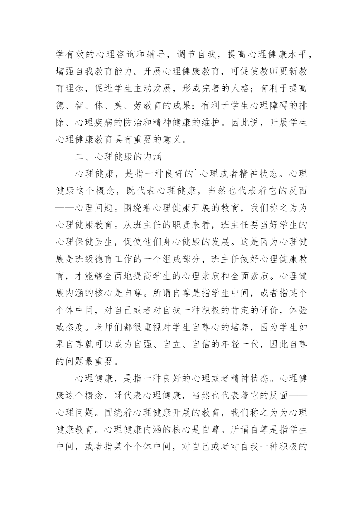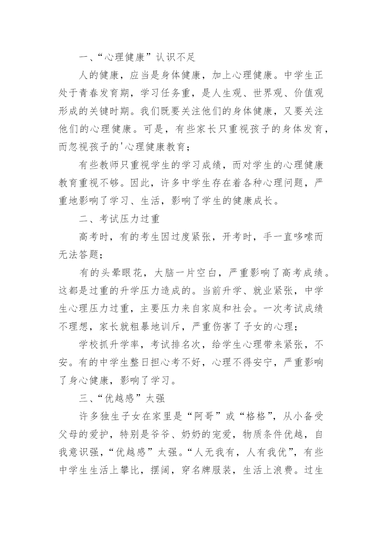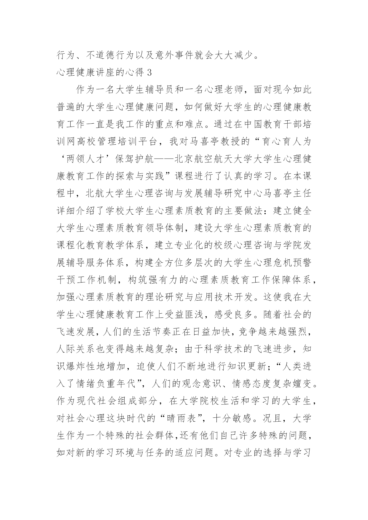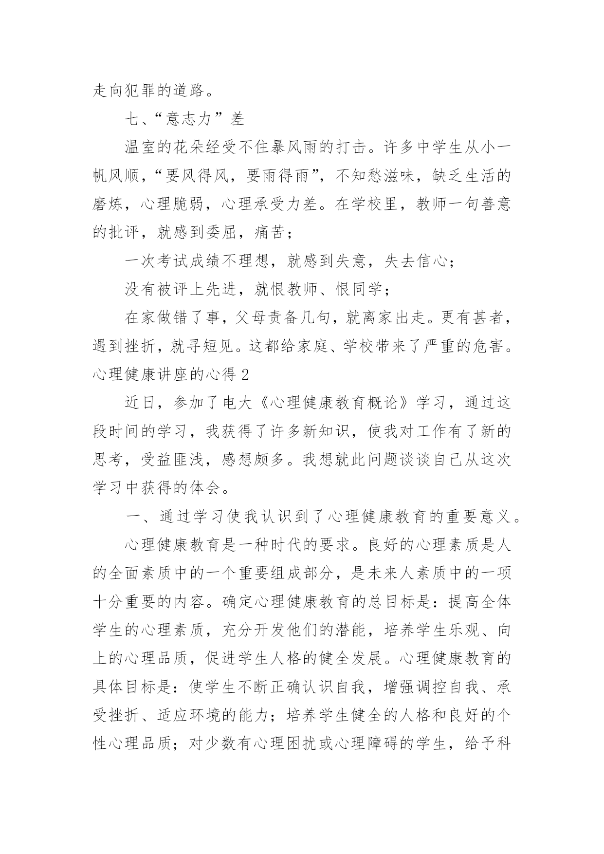 心理健康讲座的心得心理健康讲座的心得18篇我们有一些启发后,就十分有必须要写一篇心得体会,这样有利于培养我们思考的习惯。那么你知道心得体会如何写吗?下面是小编为大家收集的心理健康讲座的心得,欢迎大家借鉴与参考,希望对大家有所帮助。心理健康讲座的心得1现代社会关于“健康”的概念已超越了传统的医学观点,不仅躯体、生理健康,还应该精神、心理健康。当今社会竞争激烈,造成人们心理压力重,在校中学生在这样的社会大环境下生存,面临升学压力,心理脆弱,心理压抑得不到一定的宣泄;再者,我国独生子女以自我为中心的问题也显得越来越严重;更甚者,由于家庭的残缺,如父母离异、丧父或丧母的单家家庭,隔代抚养孩子等现象,都使孩子缺乏良好的生活和教育环境。有关研究表明:心理发生变化的高发区在青春期,中学生存在问题令人触目惊心,学校里学生各种不良现象屡禁不止,各种失控越轨行为时有发生,原因固然是多方面的,但与学生素质不高,尤其是心理健康水平不高心理素质较差有极大的关系。我听了张教授的报告之后,再结合十几年的教育经验,对影响青少年心理健康的因素总结如下:一、“心理健康”认识不足人的健康,应当是身体健康,加上心理健康。中学生正处于青春发育期,学习任务重,是人生观、世界观、价值观形成的关键时期。我们既要关注他们的身体健康,又要关注他们的心理健康。可是,有些家长只重视孩子的身体发育,而忽视孩子的'心理健康教育;有些教师只重视学生的学习成绩,而对学生的心理健康教育重视不够。因此,许多中学生存在着各种心理问题,严重地影响了学习、生活,影响了学生的健康成长。二、考试压力过重高考时,有的考生因过度紧张,开考时,手一直哆嗦而无法答题;有的头晕眼花,大脑一片空白,严重影响了高考成绩。这都是过重的升学压力造成的。当前升学、就业紧张,中学生心理压力过重,主要压力来自家庭和社会。一次考试成绩不理想,家长就粗暴地训斥,严重伤害了子女的心理;学校抓升学率,考试排名次,给学生心理带来紧张,不安。有的中学生整日担心考不好,心理不得安宁,严重影响了身心健康,影响了学习。三、“优越感”太强许多独生子女在家里是“阿哥”或“格格”,从小备受父母的爱护,特别是爷爷、奶奶的宠爱,物质条件优越,自我意识强,“优越感”太强。“人无我有,人有我优”,有些中学生生活上攀比,摆阔,穿名牌服装,生活上浪费。过生日请客送礼,平日吃饭下饭店,过分追求物质享受,更有甚者,一味追求时髦,穿奇装异服,追赶“新人类”,无心学习。四、家庭的变化社会情况复杂,许多家庭出现异常变化,给中学生的心理带来不良影响。有的父母离异,家庭破裂,给学生的心理带来打击,使学生变得内向、自卑,对他人失去了情感,甚至痛恨社会;有的父母失去了工作,下岗待业,家庭经济困难,生活的艰辛给学生心理带来刺激,对生活失去了信心;有的父母关系不和出现家庭争吵,甚至暴力,严重伤害了学生那颗纯净的心,内心痛苦不堪。五、“早恋”中学生内受青春期性萌动的刺激,外受社会不良风气的影响,特别是港台电视、言情小说的诱异,禁不住对异性好奇、爱慕。有的中学生谈情说爱,有的陷入单相思,备受感情的折磨,严重的影响了学习。六、迷恋“网吧”许多中学生迷恋“网吧”,网上聊天,网上交友,沉迷于虚拟的世界里,自我“陶醉”而不能自拔。自我多情,弄虚作假,欺骗别人的感情,有的“通宵达旦”夜不归宿,身心极度疲劳,荒废学业。这种例子不少见,报纸已加以报道。更有甚者,有的猎奇不健康的内容,自甘堕落;有的零花钱不够消费,就从家里偷,甚至向小学生敲诈,走向犯罪的道路。七、“意志力”差温室的花朵经受不住暴风雨的打击。许多中学生从小一帆风顺,“要风得风,要雨得雨”,不知愁滋味,缺乏生活的磨炼,心理脆弱,心理承受力差。在学校里,教师一句善意的批评,就感到委屈,痛苦;一次考试成绩不理想,就感到失意,失去信心;没有被评上先进,就恨教师、恨同学;在家做错了事,父母责备几句,就离家出走。更有甚者,遇到挫折,就寻短见。这都给家庭、学校带来了严重的危害。心理健康讲座的心得2近日,参加了电大《心理健康教育概论》学习,通过这段时间的学习,我获得了许多新知识,使我对工作有了新的思考,受益匪浅,感想颇多。我想就此问题谈谈自己从这次学习中获得的体会。一、通过学习使我认识到了心理健康教育的重要意义。心理健康教育是一种时代的要求。良好的心理素质是人的全面素质中的一个重要组成部分,是未来人素质中的一项十分重要的内容。确定心理健康教育的总目标是:提高全体学生的心理素质,充分开发他们的潜能,培养学生乐观、向上的心理品质,促进学生人格的健全发展。心理健康教育的具体目标是:使学生不断正确认识自我,增强调控自我、承受挫折、适应环境的能力;培养学生健全的人格和良好的个性心理品质;对少数有心理困扰或心理障碍的学生,给予科学有效的心理咨询和辅导,调节自我,