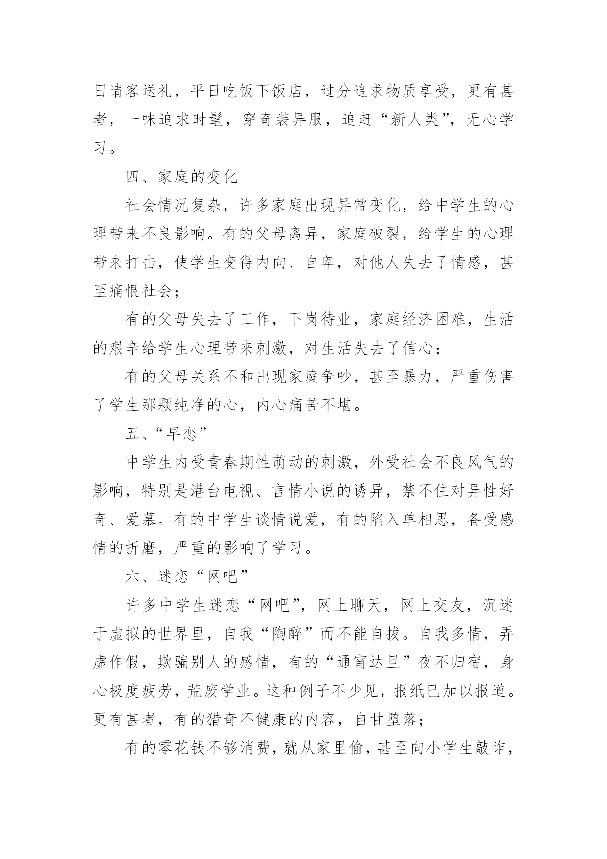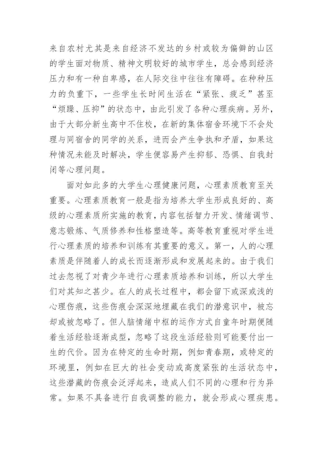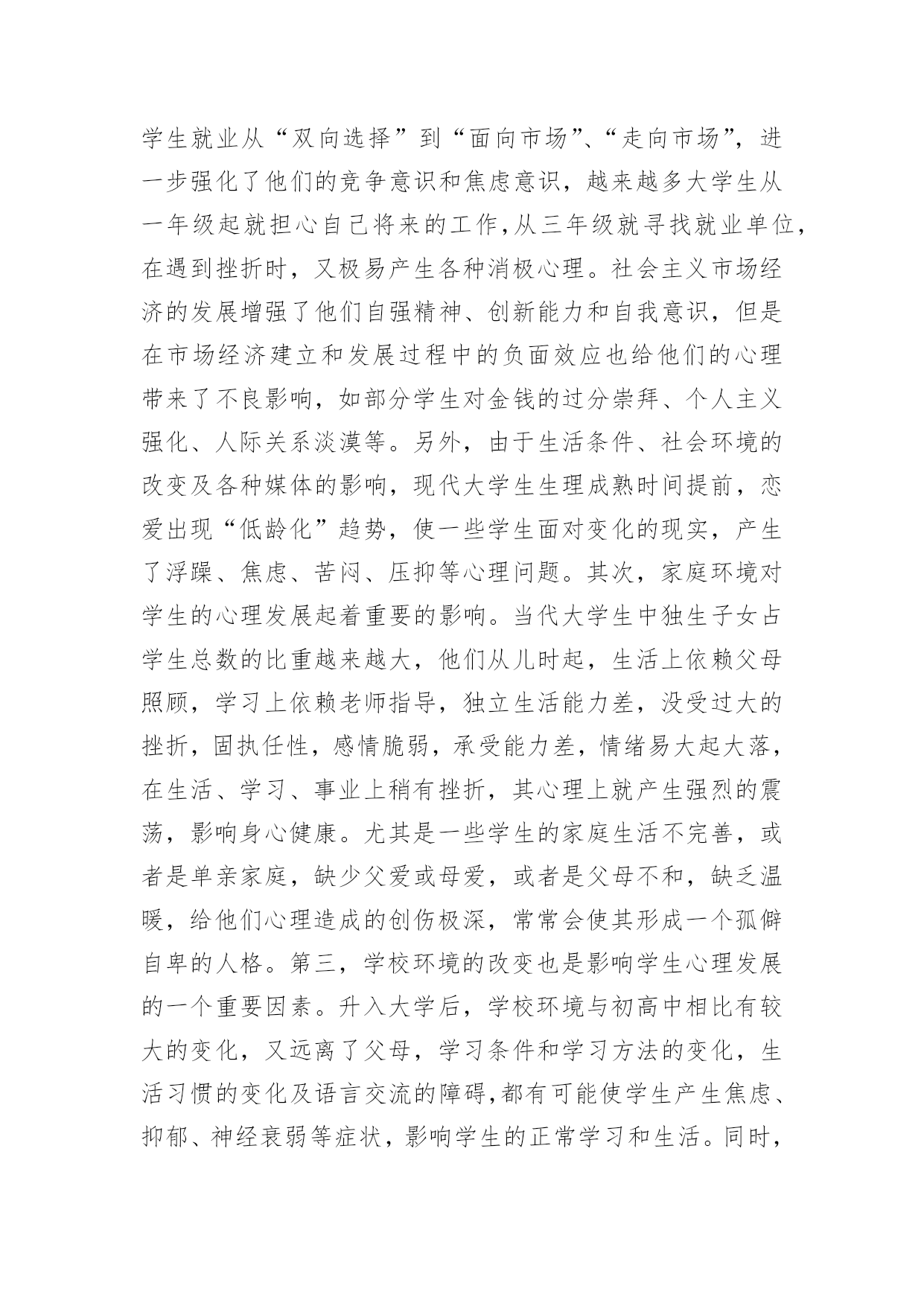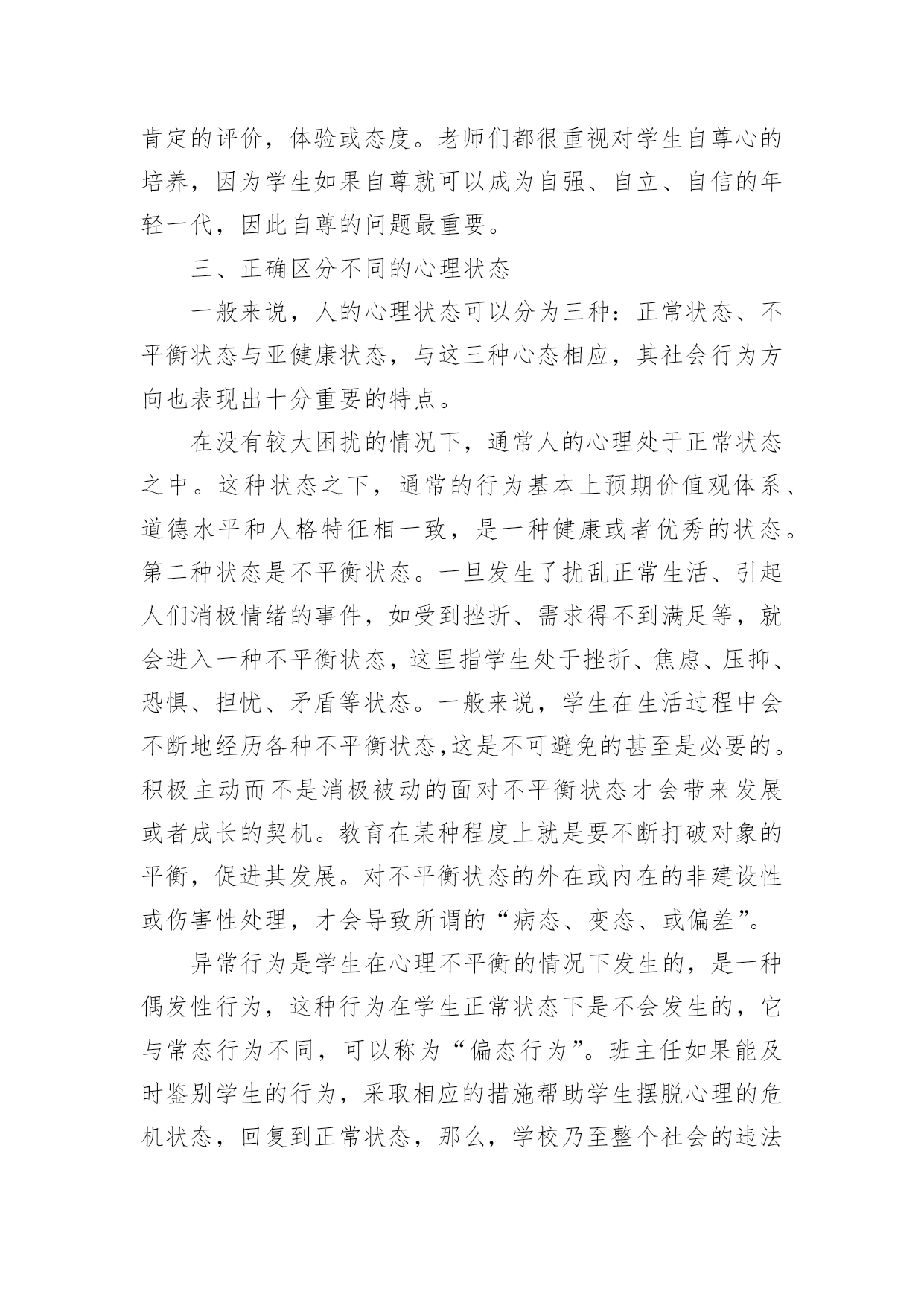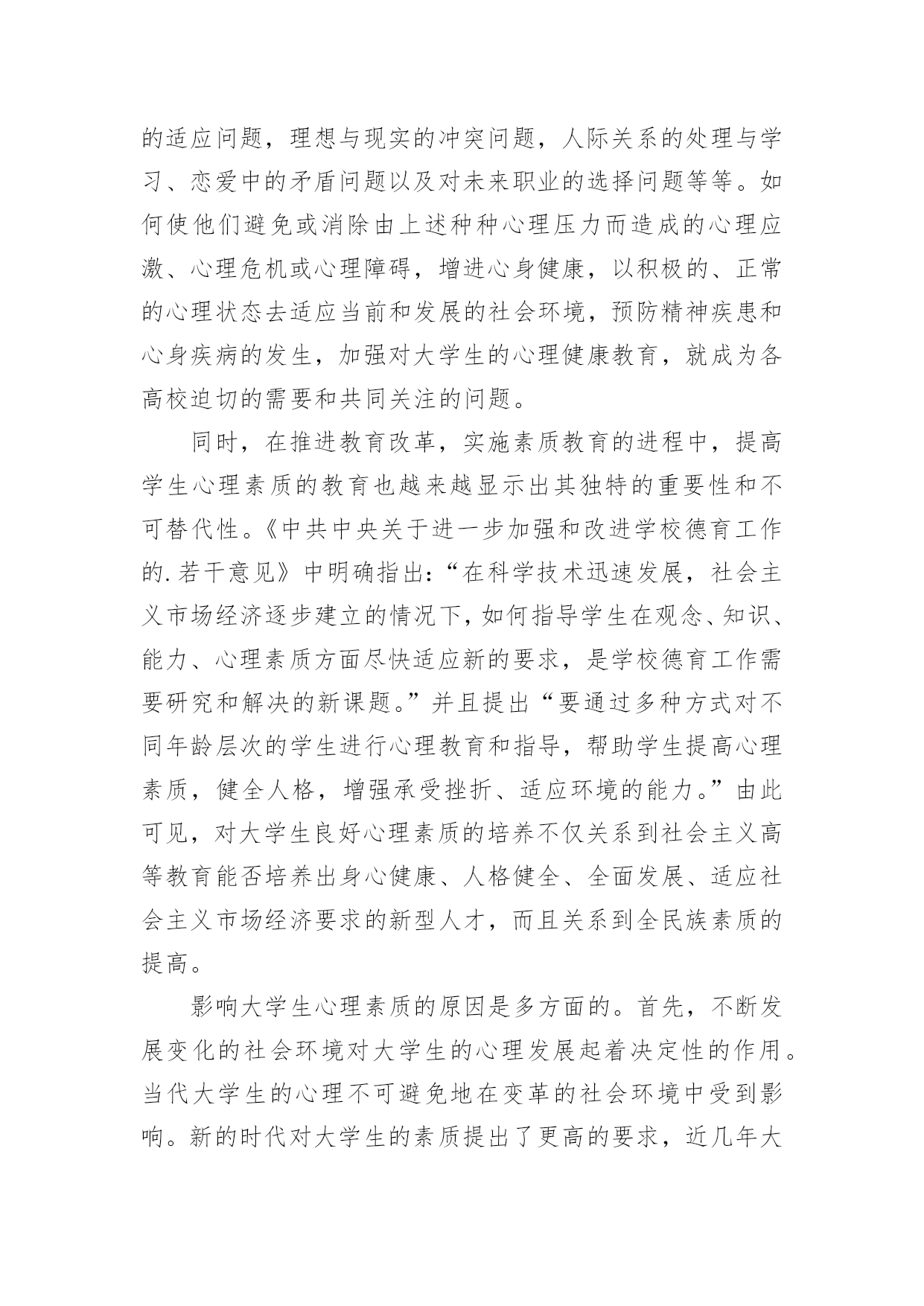 心理健康讲座的心得心理健康讲座的心得18篇我们有一些启发后,就十分有必须要写一篇心得体会,这样有利于培养我们思考的习惯。那么你知道心得体会如何写吗?下面是小编为大家收集的心理健康讲座的心得,欢迎大家借鉴与参考,希望对大家有所帮助。心理健康讲座的心得1现代社会关于“健康”的概念已超越了传统的医学观点,不仅躯体、生理健康,还应该精神、心理健康。当今社会竞争激烈,造成人们心理压力重,在校中学生在这样的社会大环境下生存,面临升学压力,心理脆弱,心理压抑得不到一定的宣泄;再者,我国独生子女以自我为中心的问题也显得越来越严重;更甚者,由于家庭的残缺,如父母离异、丧父或丧母的单家家庭,隔代抚养孩子等现象,都使孩子缺乏良好的生活和教育环境。有关研究表明:心理发生变化的高发区在青春期,中学生存在问题令人触目惊心,学校里学生各种不良现象屡禁不止,各种失控越轨行为时有发生,原因固然是多方面的,但与学生素质不高,尤其是心理健康水平不高心理素质较差有极大的关系。我听了张教授的报告之后,再结合十几年的教育经验,对影响青少年心理健康的因素总结如下:一、“心理健康”认识不足人的健康,应当是身体健康,加上心理健康。中学生正处于青春发育期,学习任务重,是人生观、世界观、价值观形成的关键时期。我们既要关注他们的身体健康,又要关注他们的心理健康。可是,有些家长只重视孩子的身体发育,而忽视孩子的'心理健康教育;有些教师只重视学生的学习成绩,而对学生的心理健康教育重视不够。因此,许多中学生存在着各种心理问题,严重地影响了学习、生活,影响了学生的健康成长。二、考试压力过重高考时,有的考生因过度紧张,开考时,手一直哆嗦而无法答题;有的头晕眼花,大脑一片空白,严重影响了高考成绩。这都是过重的升学压力造成的。当前升学、就业紧张,中学生心理压力过重,主要压力来自家庭和社会。一次考试成绩不理想,家长就粗暴地训斥,严重伤害了子女的心理;学校抓升学率,考试排名次,给学生心理带来紧张,不安。有的中学生整日担心考不好,心理不得安宁,严重影响了身心健康,影响了学习。三、“优越感”太强许多独生子女在家里是“阿哥”或“格格”,从小备受父母的爱护,特别是爷爷、奶奶的宠爱,物质条件优越,自我意识强,“优越感”太强。“人无我有,人有我优”,有些中学生生活上攀比,摆阔,穿名牌服装,生活上浪费。过生日请客送礼,平日吃饭下饭店,过分追求物质享受,更有甚者,一味追求时髦,穿奇装异服,追赶“新人类”,无心学习。四、家庭的变化社会情况复杂,许多家庭出现异常变化,给中学生的心理带来不良影响。有的父母离异,家庭破裂,给学生的心理带来打击,使学生变得内向、自卑,对他人失去了情感,甚至痛恨社会;有的父母失去了工作,下岗待业,家庭经济困难,生活的艰辛给学生心理带来刺激,对生活失去了信心;有的父母关系不和出现家庭争吵,甚至暴力,严重伤害了学生那颗纯净的心,内心痛苦不堪。五、“早恋”中学生内受青春期性萌动的刺激,外受社会不良风气的影响,特别是港台电视、言情小说的诱异,禁不住对异性好奇、爱慕。有的中学生谈情说爱,有的陷入单相思,备受感情的折磨,严重的影响了学习。六、迷恋“网吧”许多中学生迷恋“网吧”,网上聊天,网上交友,沉迷于虚拟的世界里,自我“陶醉”而不能自拔。自我多情,弄虚作假,欺骗别人的感情,有的“通宵达旦”夜不归宿,身心极度疲劳,荒废学业。这种例子不少见,报纸已加以报道。更有甚者,有的猎奇不健康的内容,自甘堕落;有的零花钱不够消费,就从家里偷,甚至向小学生敲诈,走向犯罪的道路。七、“意志力”差温室的花朵经受不住暴风雨的打击。许多中学生从小一帆风顺,“要风得风,要雨得雨”,不知愁滋味,缺乏生活的磨炼,心理脆弱,心理承受力差。在学校里,教师一句善意的批评,就感到委屈,痛苦;一次考试成绩不理想,就感到失意,失去信心;没有被评上先进,就恨教师、恨同学;在家做错了事,父母责备几句,就离家出走。更有甚者,遇到挫折,就寻短见。这都给家庭、学校带来了严重的危害。心理健康讲座的心得2近日,参加了电大《心理健康教育概论》学习,通过这段时间的学习,我获得了许多新知识,使我对工作有了新的思考,受益匪浅,感想颇多。我想就此问题谈谈自己从这次学习中获得的体会。一、通过学习使我认识到了心理健康教育的重要意义。心理健康教育是一种时代的要求。良好的心理素质是人的全面素质中的一个重要组成部分,是未来人素质中的一项十分重要的内容。确定心理健康教育的总目标是:提高全体学生的心理素质,充分开发他们的潜能,培养学生乐观、向上的心理品质,促进学生人格的健全发展。心理健康教育的具体目标是:使学生不断正确认识自我,增强调控自我、承受挫折、适应环境的能力;培养学生健全的人格和良好的个性心理品质;对少数有心理困扰或心理障碍的学生,给予科学有效的心理咨询和辅导,调节自我,