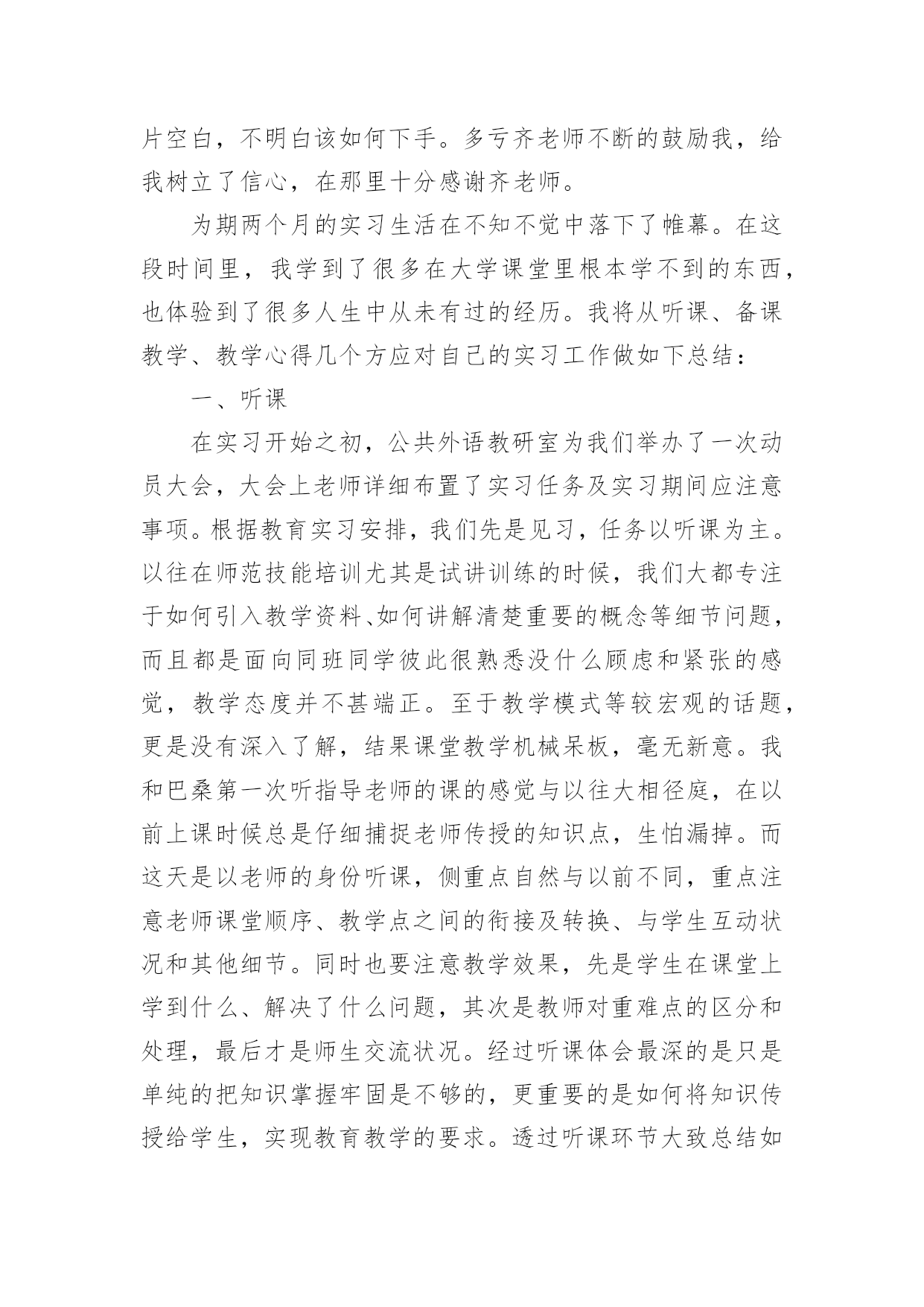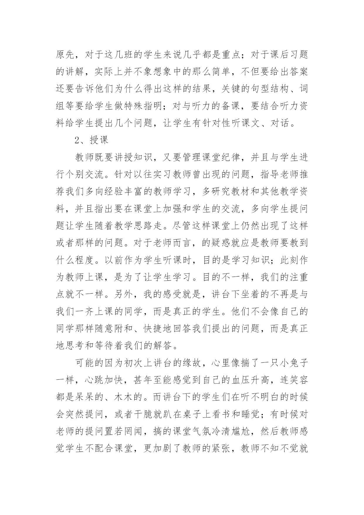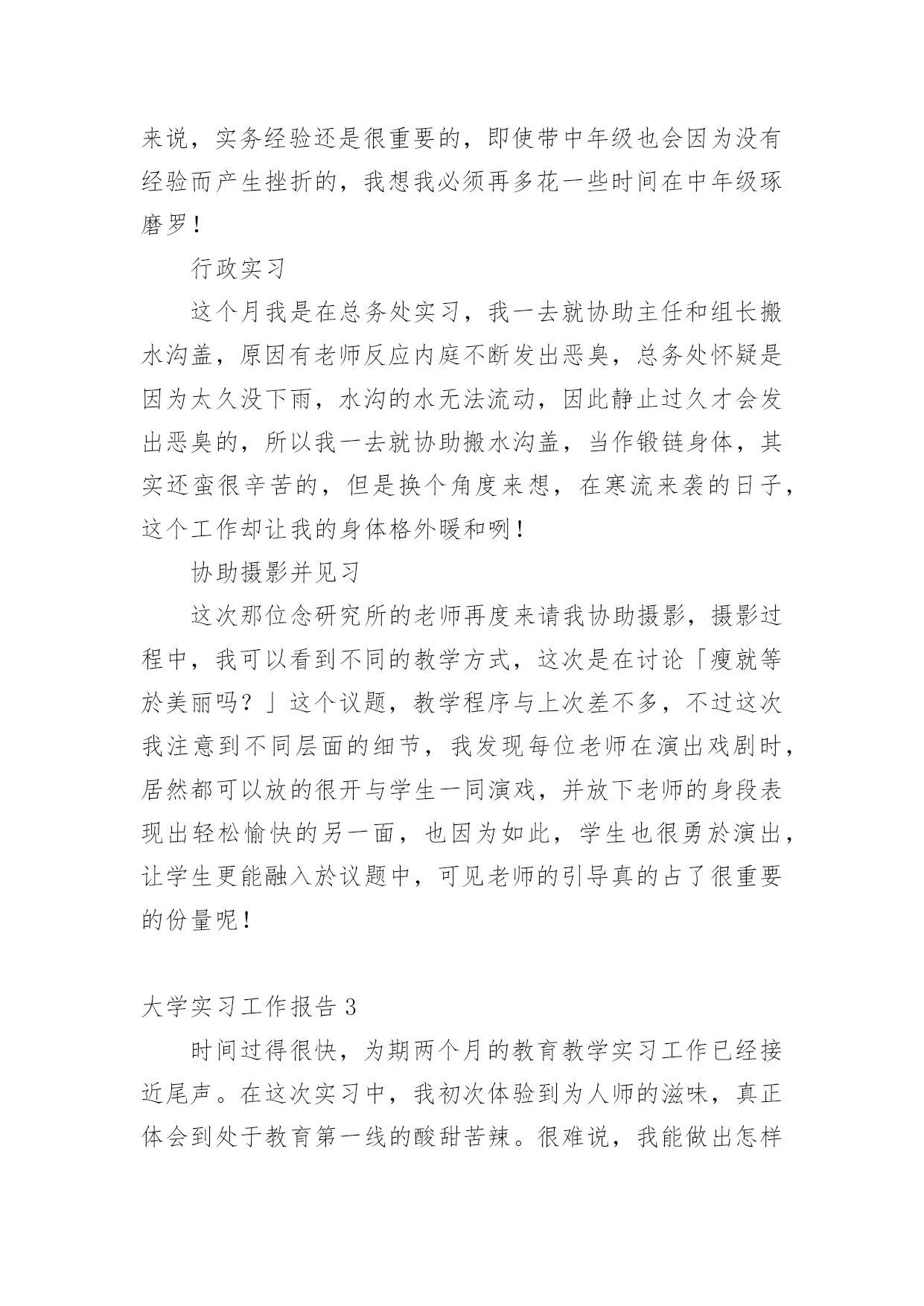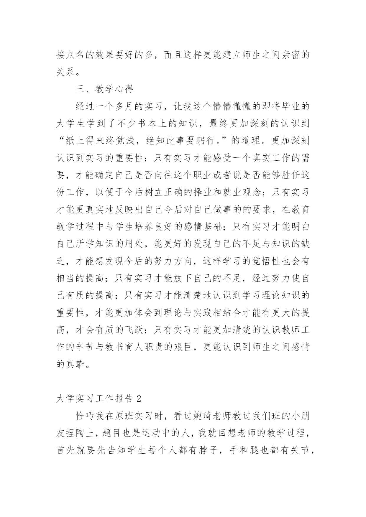 大学实习工作报告在生活中,报告十分的重要,报告成为了一种新兴产业。一听到写报告就拖延症懒癌齐复发?以下是小编为大家整理的大学实习工作报告,供大家参考借鉴,希望可以帮助到有需要的朋友。大学实习工作报告1中小学时候上课的日子里每一天都能看见老师在讲台上伴着四处纷飞的粉笔末挥洒自如引经据典。夏天汗大,老师不经意间用满是粉笔末的手抹了一把脸,那原本带皱纹的慈祥的脸庞一下花了,班级里也顿时炸开了锅,到此刻每次想到那位可爱的老师仍然忍不住想笑。之后,发现城市的大学里教室的设施要比以前好的多,条件也好的多,但是教师的工作本质决定了作一名教师依然很辛苦,更没有想到若干年后的这天我会走上讲台上成为一名教师。大学四年说话间就过去了,学了四年的英语有时候甚至自己都搞不清楚怎样给学生教呢虽然学过《心理学》《教育学》该如何用,身心压力一下大了起来,以至于一想到上课就莫名的紧张,紧张到麻木,麻木到想打退堂鼓。我同宿舍的巴桑同学一齐分到了大学部的公共英语教研室,在齐老师的麾下。齐老师带的是08临床医学专科1、2班和08计算机科学管理专科1、2班的《大学英语基础教程》,学生都是区内生源,基础比较差。当我看到教材的时候我,我脑子一片空白,不明白该如何下手。多亏齐老师不断的鼓励我,给我树立了信心,在那里十分感谢齐老师。为期两个月的实习生活在不知不觉中落下了帷幕。在这段时间里,我学到了很多在大学课堂里根本学不到的东西,也体验到了很多人生中从未有过的经历。我将从听课、备课教学、教学心得几个方应对自己的实习工作做如下总结:一、听课在实习开始之初,公共外语教研室为我们举办了一次动员大会,大会上老师详细布置了实习任务及实习期间应注意事项。根据教育实习安排,我们先是见习,任务以听课为主。以往在师范技能培训尤其是试讲训练的时候,我们大都专注于如何引入教学资料、如何讲解清楚重要的概念等细节问题,而且都是面向同班同学彼此很熟悉没什么顾虑和紧张的感觉,教学态度并不甚端正。至于教学模式等较宏观的话题,更是没有深入了解,结果课堂教学机械呆板,毫无新意。我和巴桑第一次听指导老师的课的感觉与以往大相径庭,在以前上课时候总是仔细捕捉老师传授的知识点,生怕漏掉。而这天是以老师的身份听课,侧重点自然与以前不同,重点注意老师课堂顺序、教学点之间的衔接及转换、与学生互动状况和其他细节。同时也要注意教学效果,先是学生在课堂上学到什么、解决了什么问题,其次是教师对重难点的区分和处理,最后才是师生交流状况。经过听课体会最深的是只是单纯的把知识掌握牢固是不够的,更重要的是如何将知识传授给学生,实现教育教学的要求。透过听课环节大致总结如下:(一)课堂导入:课堂导入直接影响到影响到学生的学习用心性,通常由一个话题作为切入点或者回顾上次课程讲述的知识以加深印象;(二)课程导入:透过本节课要讲解的点切入主题;(三)讲解授课:思路流畅,条例清晰,重难点突出;(四)总结、布置任务:重申本节课的重点,布置作业。二、备课教学1、备课没有理论的实践是盲目的实践,没有实践的理论是空洞的理论,时间过得真快,转眼就要到我们上讲台一试身手的时候了。在《英语教师职业技能训练简明教程》中老师讲到“备课不是简单地看教材,而是认真地梳理教材的资料和想方设法地用自己的语言表述出来。”由于学生英语水平参差不齐,单是这个重新复述的过程就已经很考验我们的潜力。在备课之前我上网看了一些优秀的教案,并从中汲取了一些特色大致了解了备课就应注意在事项,接下来就是在齐老师的指导下,我们开始进行备课。我前两课时讲的是语法将来时态和冠词的用法,按照指导老师的推荐先把语法规则打出来,然后讲解并举例分析,最后一齐作业并布置课下作业;后面几节课是讲解课文和处理课后联系题。刚看到课文的时候真不明白该讲些什么,课本资料很简单感觉根本没有什么可讲解的。我很痛苦地向指导老师说明状况,老师给我指点了知识点之后我才恍然大悟,原先,对于这几班的学生来说几乎都是重点;对于课后习题的讲解,实际上并不象想象中的那么简单,不但要给出答案还要告诉他们为什么得出这样的结果,关键的句型结构、词组等要给学生做特殊指明;对与听力的备课,要结合听力资料给学生提出几个问题,让学生有针对性听课文、对话。2、授课教师既要讲授知识,又要管理课堂纪律,并且与学生进行个别交流。针对以往实习教师曾出现的问题,指导老师推荐我们多向经验丰富的教师学习,多研究教材和其他教学资料,并且指出要在课堂上加强和学生的交流,多向学生提问题让学生随着教学思路走。尽管这样课堂上仍然出现了这样或者那样的问题。对于老师而言,的疑惑就应是教师要教到什么程度。以前作为学生听课时,目的是学习知识;此刻作为教师上课,是为了让学生学习。目的不一样,我们的注重点就不一样。另外,我的感受就是,讲台下坐着的不再是与我们一齐上课的同学,而是真正的学生。