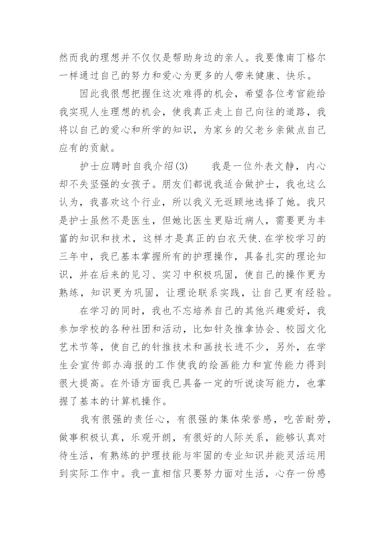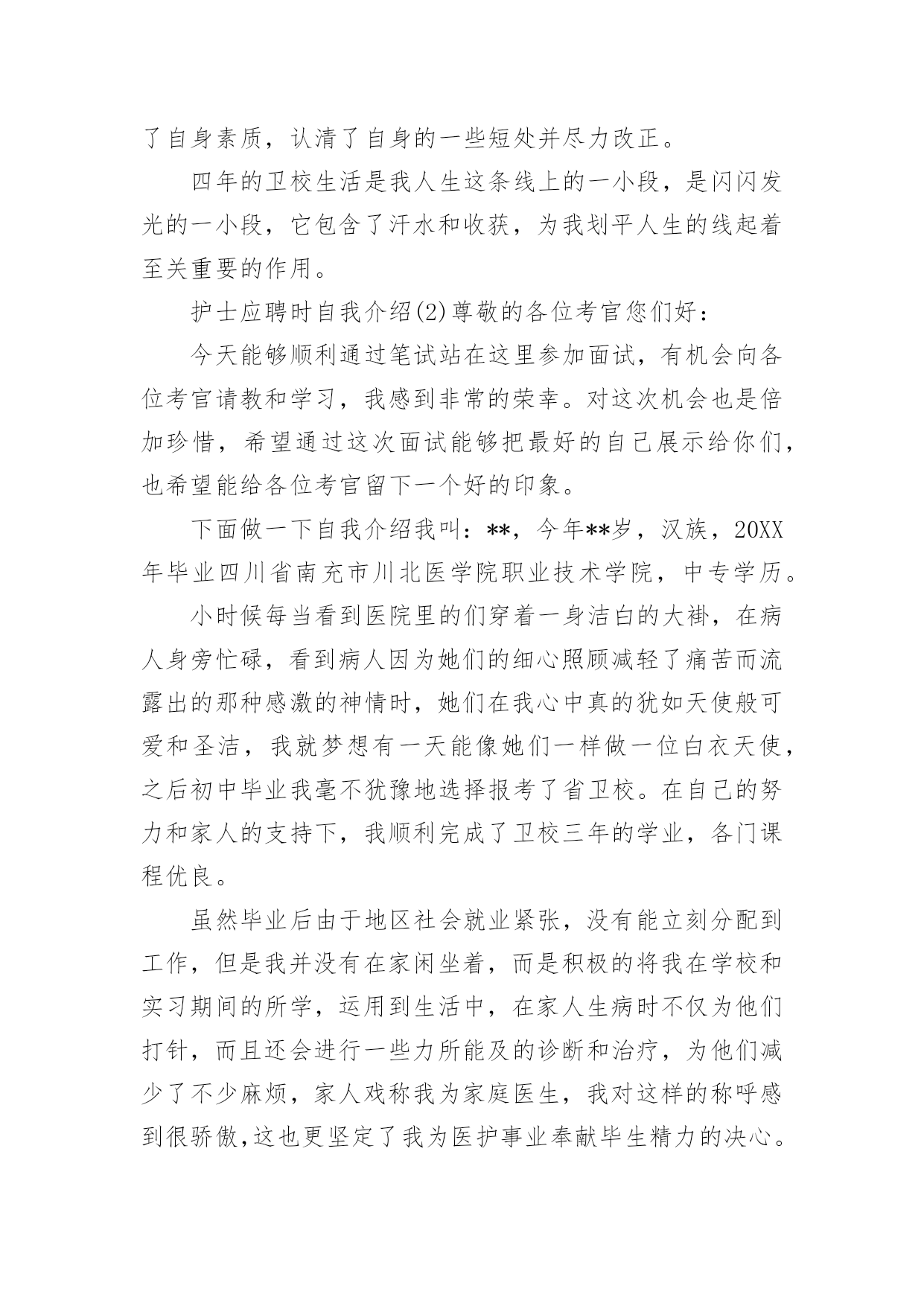 护士应聘自我介绍护士应聘自我介绍三篇家人戏称我为家庭医生,我对这样的称呼感到很骄傲。小编为大家收集整理的护士应聘时自我介绍,喜欢的朋友赶紧来看下啦!护士应聘时自我介绍(1)我叫xxx,毕业于xxx卫校,专业学习护理。以下我将展开我的毕业生求职自我介绍:珍贵的卫校生活已经结束了,现在要来总结一下这几年来的得失,从中继承做得好的方面改进不足的地方,使自己回顾走过的路,也更是为了看清将来要走的路。虽然我的学习成绩不是非常好,但我却在学习的过程中收获了很多。首先是我端正了学习态度。在我考进卫校时,本来想解放一下自己的,但是很快我就明白了,卫校的学习是更需要努力认真的。看到周围的同学们拼命的学习,开始了卫校的学习旅程,觉得自己落后了。卫校的学习不象初中那样是填鸭式的,而是老师把课讲完,然后自己去看,去理解。这个时候自习能力和自制能力是很重要的。长期自习以来我知道了要想学好只埋头苦学是不行的,要学会方法,做事情的方法。古人云:授之以鱼不如授之以渔我来这里的目的就是要学会渔,做什么都勤于思考,遇到不懂的地方能勤于请教。在学习时,以独立思考作为自己的座右铭,时刻不忘警戒。在学习知识这段时间里,我更与老师建立了浓厚的师生情谊。老师们的谆谆教导,使我体会了学习的乐趣。我与身边许多同学,也建立了良好的学习关系,互帮互助,克服难关。学习护理单有理论是不行的,还要有良好的护理技术。所以在上实践课的时候我都会争取机会多操作几次,加上卫校本来就少学生可给学生用的空间可不少。所以我可以再趁放学时间多练习一下。在卫校的第四年是我们到医院实习的时间,基本上一年都是呆在医院里学习。再这里我熟练我的护理操作技术,把理论和实践结合在一起,在带教老师的指导下用我全副的'耐心和爱心护理病人,使病人得到良好的照顾,早日康复。到医院实习认识到许多也是学习护理的同学,也就增加了与其他同学交流和向其学习的机会,锻炼了自己的交际能力,学到别人的长处,认清自己的短处。所以我喜欢实习。虽然有时会感到累些,但乐此不彼。我个人认为自己最大的缺点就是喜欢一心两用甚至多用。急功近利,喜欢一口气学许多东西,但是贪多嚼不烂,即使最后都能学会,也已经搞得自己很疲劳。如今想想,这样其实并不好,正所谓,贵在精而不在广。如果我一段时期内专注于一种学问,不求博但求精,相信一定能更深刻的理解并掌握这门知识。自从我发现自己有这个缺点和问题后,我常常警戒自己,步入社会后也不能一心两用。通过四年卫校生活,学到了很多知识,更重要的是掌握了护理操作技术。思想变成熟了许多,性格更坚毅了。认识了许多同学和老师,建立起友谊,并在与他们的交往中提升了自身素质,认清了自身的一些短处并尽力改正。四年的卫校生活是我人生这条线上的一小段,是闪闪发光的一小段,它包含了汗水和收获,为我划平人生的线起着至关重要的作用。护士应聘时自我介绍(2)尊敬的各位考官您们好:今天能够顺利通过笔试站在这里参加面试,有机会向各位考官请教和学习,我感到非常的荣幸。对这次机会也是倍加珍惜,希望通过这次面试能够把最好的自己展示给你们,也希望能给各位考官留下一个好的印象。下面做一下自我介绍我叫:**,今年**岁,汉族,20XX年毕业四川省南充市川北医学院职业技术学院,中专学历。小时候每当看到医院里的们穿着一身洁白的大褂,在病人身旁忙碌,看到病人因为她们的细心照顾减轻了痛苦而流露出的那种感激的神情时,她们在我心中真的犹如天使般可爱和圣洁,我就梦想有一天能像她们一样做一位白衣天使,之后初中毕业我毫不犹豫地选择报考了省卫校。在自己的努力和家人的支持下,我顺利完成了卫校三年的学业,各门课程优良。虽然毕业后由于地区社会就业紧张,没有能立刻分配到工作,但是我并没有在家闲坐着,而是积极的将我在学校和实习期间的所学,运用到生活中,在家人生病时不仅为他们打针,而且还会进行一些力所能及的诊断和治疗,为他们减少了不少麻烦,家人戏称我为家庭医生,我对这样的称呼感到很骄傲,这也更坚定了我为医护事业奉献毕生精力的决心。然而我的理想并不仅仅是帮助身边的亲人。我要像南丁格尔一样通过自己的努力和爱心为更多的人带来健康、快乐。因此我很想把握住这次难得的机会,希望各位考官能给我实现人生理想的机会,使我真正走上自己向往的道路,我将以自己的爱心和所学的知识,为家乡的父老乡亲做点自己应有的贡献。护士应聘时自我介绍(3)我是一位外表文静,内心却不失坚强的女孩子。朋友们都说我适合做护士,我也这么认为,我喜欢这个行业,所以我义无返顾地选择了她。我只是护士虽然不是医生,但她比医生更贴近病人,需要更为丰富的知识和技术,这样才是真正的白衣天使.在学校学习的三年中,我已基本掌握所有的护理操作,具备扎实的理论知识,并在后来的见习、实习中积极巩固,使自己的操作更为熟练,知识更为巩固,让理论联系实践,让自己更有经验。在学习