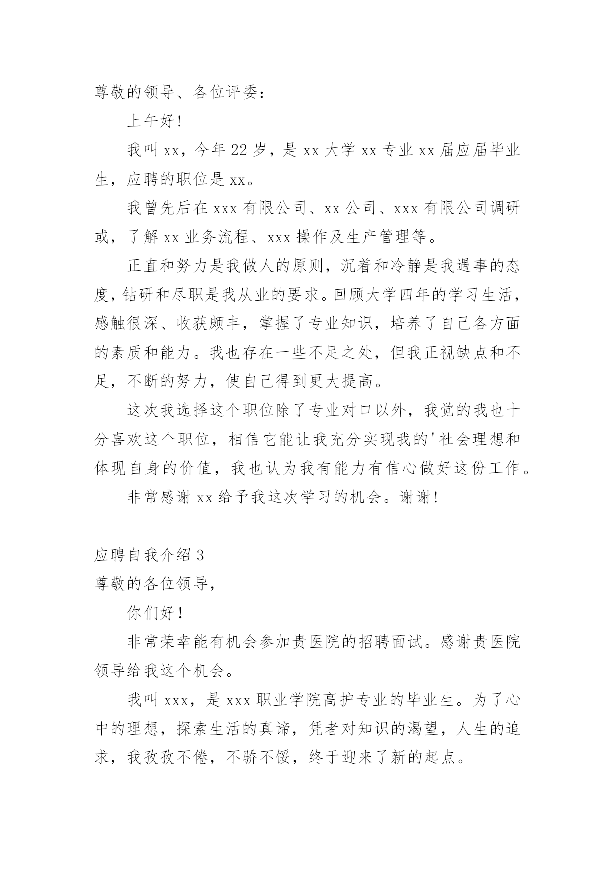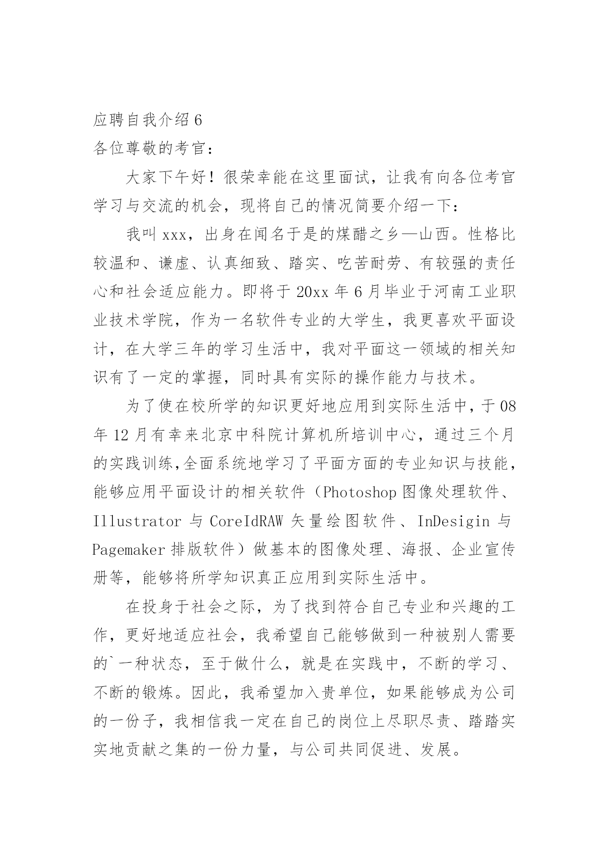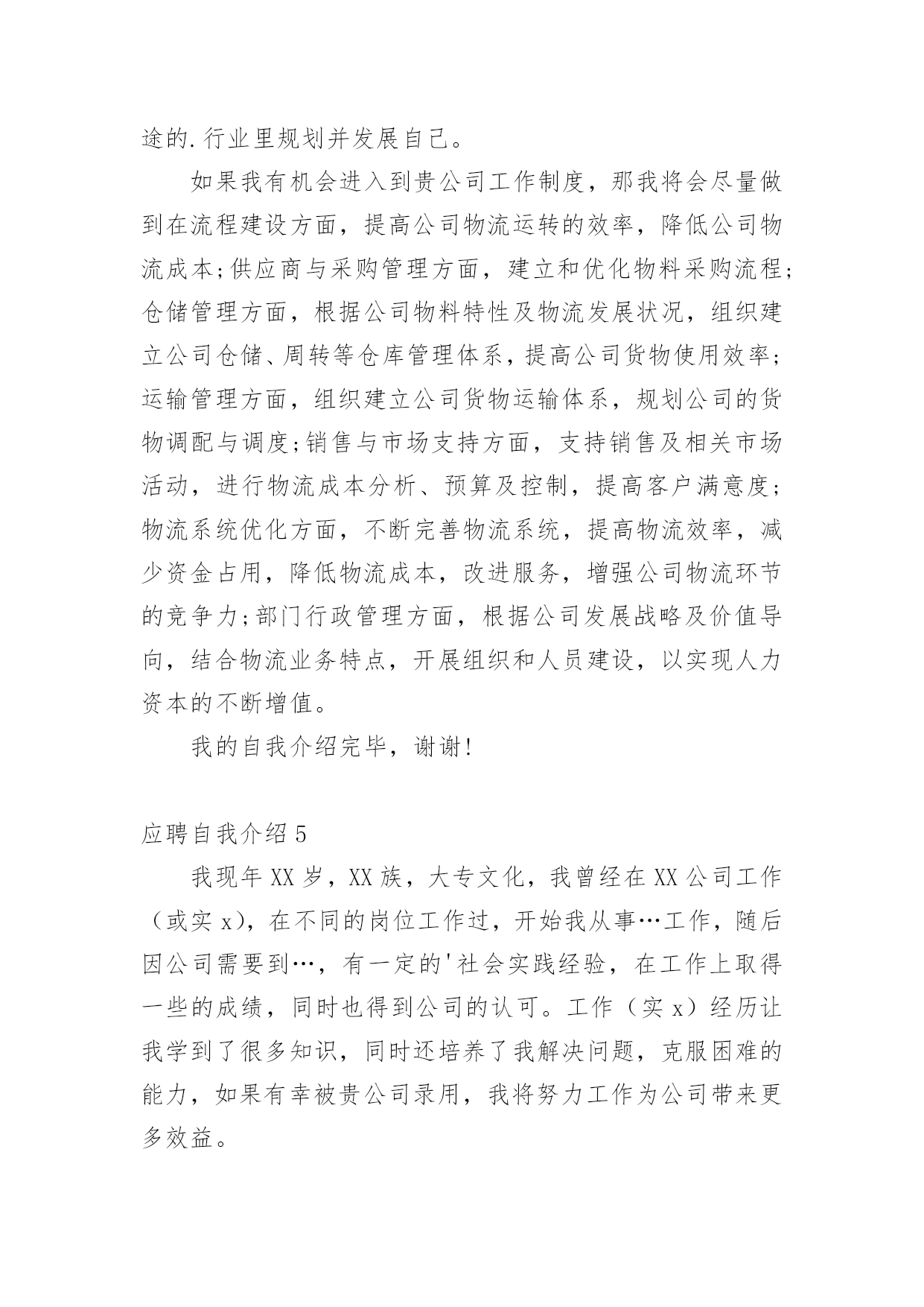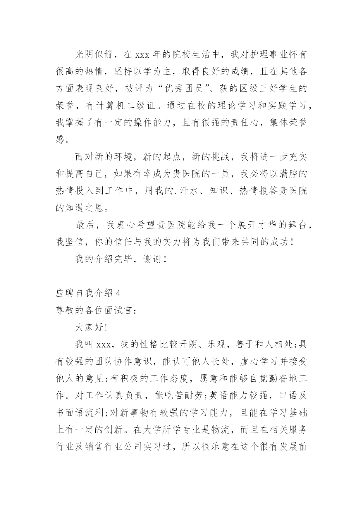 应聘自我介绍(经典)应聘自我介绍15篇当到达一个新的环境后,需要我们进行自我介绍,自我介绍是一展示自己的手段。那么自我介绍要注意有什么内容呢?以下是小编精心整理的应聘自我介绍,欢迎阅读,希望大家能够喜欢。应聘自我介绍1我喜欢音乐、摄影、K歌、骑行、速降等户外活动,喜欢背上行囊去旅行的感觉,去感受及领悟所带来的新事物。有天生的管理天赋,即使是不熟悉的行业我也一样可以管理的井井有条,创效增收。再说我已有多年的采购管理工作经验,擅长部门的'运营管理、绩效制定、人员培训和成本控制。注重企业文化和团队建设,有带团队和培训团队的成功经验,有亲和力并能够很快与各层面的人员建立健康、持续的工作关系。能适当的调整部门员工工作安排,使得工作效率得到相应的提高,同时能以身作则,起到一定的带头作用。相信您的信任与我的实力将为我们带来共同的成功,希望我能为贵公司贡献自己的力量!应聘自我介绍2尊敬的领导、各位评委:上午好!我叫xx,今年22岁,是xx大学xx专业xx届应届毕业生,应聘的职位是xx。我曾先后在xxx有限公司、xx公司、xxx有限公司调研或,了解xx业务流程、xxx操作及生产管理等。正直和努力是我做人的原则,沉着和冷静是我遇事的态度,钻研和尽职是我从业的要求。回顾大学四年的学习生活,感触很深、收获颇丰,掌握了专业知识,培养了自己各方面的素质和能力。我也存在一些不足之处,但我正视缺点和不足,不断的努力,使自己得到更大提高。这次我选择这个职位除了专业对口以外,我觉的我也十分喜欢这个职位,相信它能让我充分实现我的'社会理想和体现自身的价值,我也认为我有能力有信心做好这份工作。非常感谢xx给予我这次学习的机会。谢谢!应聘自我介绍3尊敬的各位领导,你们好!非常荣幸能有机会参加贵医院的招聘面试。感谢贵医院领导给我这个机会。我叫xxx,是xxx职业学院高护专业的毕业生。为了心中的理想,探索生活的真谛,凭者对知识的渴望,人生的追求,我孜孜不倦,不骄不馁,终于迎来了新的起点。光阴似箭,在xxx年的院校生活中,我对护理事业怀有很高的热情,坚持以学为主,取得良好的成绩,且在其他各方面表现良好,被评为“优秀团员”、获的区级三好学生的荣誉,有计算机二级证。通过在校的理论学习和实践学习,我掌握了有一定的操作能力,且有很强的责任心,集体荣誉感。面对新的环境,新的起点,新的挑战,我将进一步充实和提高自己,如果有幸成为贵医院的一员,我必将以满腔的热情投入到工作中,用我的.汗水、知识、热情报答贵医院的知遇之恩。最后,我衷心希望贵医院能给我一个展开才华的舞台,我坚信,你的信任与我的实力将为我们带来共同的成功!我的介绍完毕,谢谢!应聘自我介绍4尊敬的各位面试官:大家好!我叫xxx,我的性格比较开朗、乐观,善于和人相处;具有较强的团队协作意识,能认可他人长处,虚心学习并接受他人的意见;有积极的工作态度,愿意和能够自觉勤奋地工作。对工作认真负责,能吃苦耐劳;英语能力较强,口语及书面语流利;对新事物有较强的学习能力,且能在学习基础上有一定的创新。在大学所学专业是物流,而且在相关服务行业及销售行业公司实习过,所以很乐意在这个很有发展前途的.行业里规划并发展自己。如果我有机会进入到贵公司工作制度,那我将会尽量做到在流程建设方面,提高公司物流运转的效率,降低公司物流成本;供应商与采购管理方面,建立和优化物料采购流程;仓储管理方面,根据公司物料特性及物流发展状况,组织建立公司仓储、周转等仓库管理体系,提高公司货物使用效率;运输管理方面,组织建立公司货物运输体系,规划公司的货物调配与调度;销售与市场支持方面,支持销售及相关市场活动,进行物流成本分析、预算及控制,提高客户满意度;物流系统优化方面,不断完善物流系统,提高物流效率,减少资金占用,降低物流成本,改进服务,增强公司物流环节的竞争力;部门行政管理方面,根据公司发展战略及价值导向,结合物流业务特点,开展组织和人员建设,以实现人力资本的不断增值。我的自我介绍完毕,谢谢!应聘自我介绍5我现年XX岁,XX族,大专文化,我曾经在XX公司工作(或实x),在不同的岗位工作过,开始我从事…工作,随后因公司需要到…,有一定的'社会实践经验,在工作上取得一些的成绩,同时也得到公司的认可。工作(实x)经历让我学到了很多知识,同时还培养了我解决问题,克服困难的能力,如果有幸被贵公司录用,我将努力工作为公司带来更多效益。应聘自我介绍6各位尊敬的考官:大家下午好!很荣幸能在这里面试,让我有向各位考官学习与交流的机会,现将自己的情况简要介绍一下:我叫xxx,出身在闻名于是的煤醋之乡—山西。性格比较温和、谦虚、认真细致、踏实、吃苦耐劳、有较强的责任心和社会适应能力。即将于20xx年6月毕业于河南工业职业技术学院,作为一名软件专业的大学生,我更喜欢平面设计,在大学三年的学