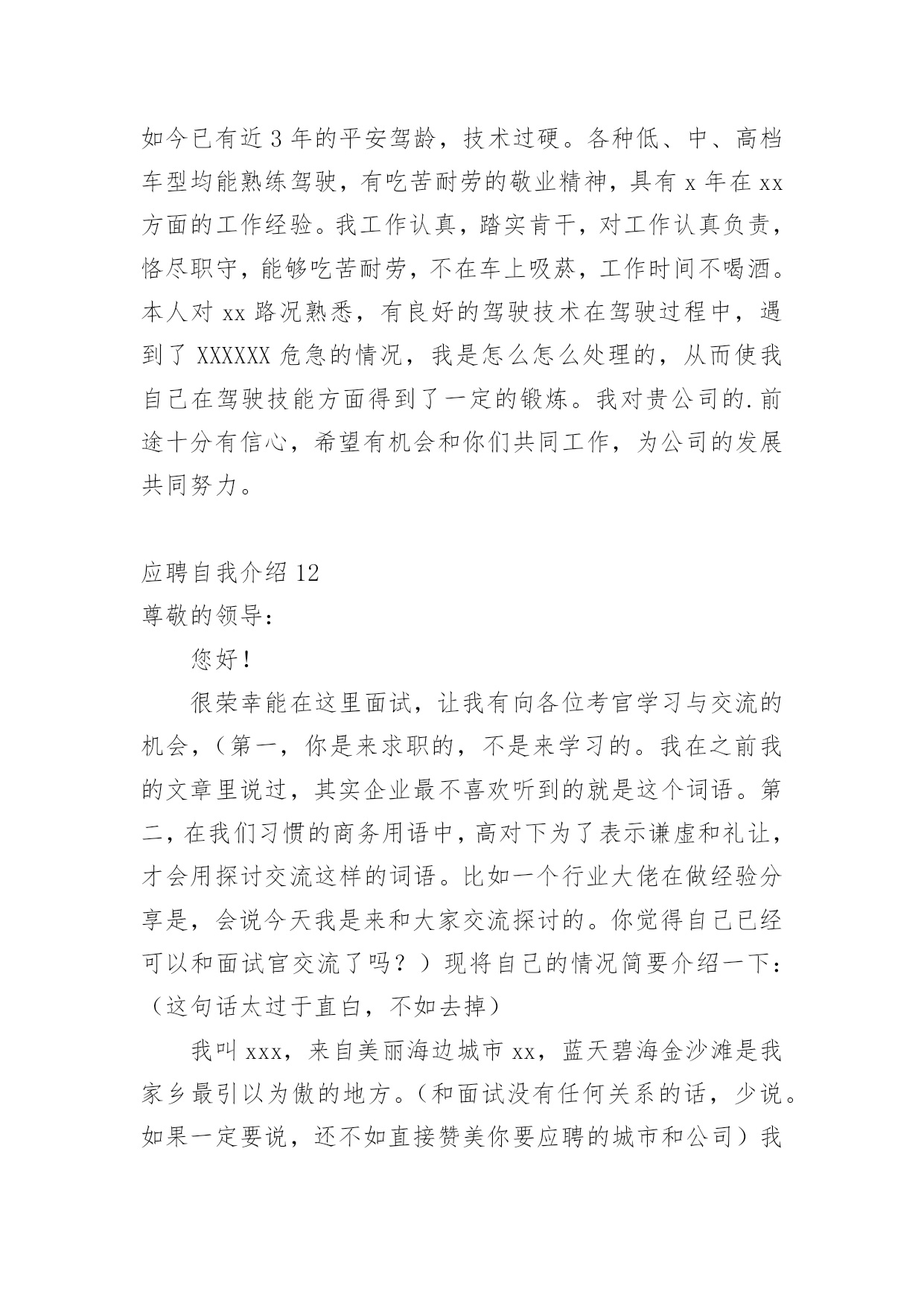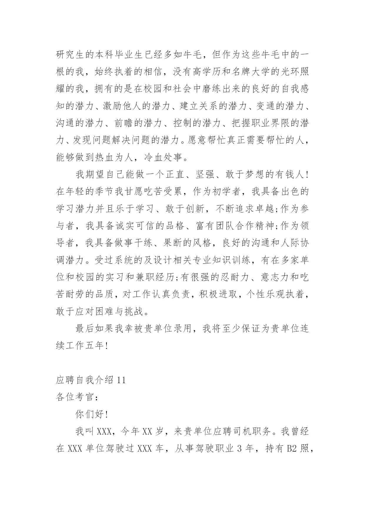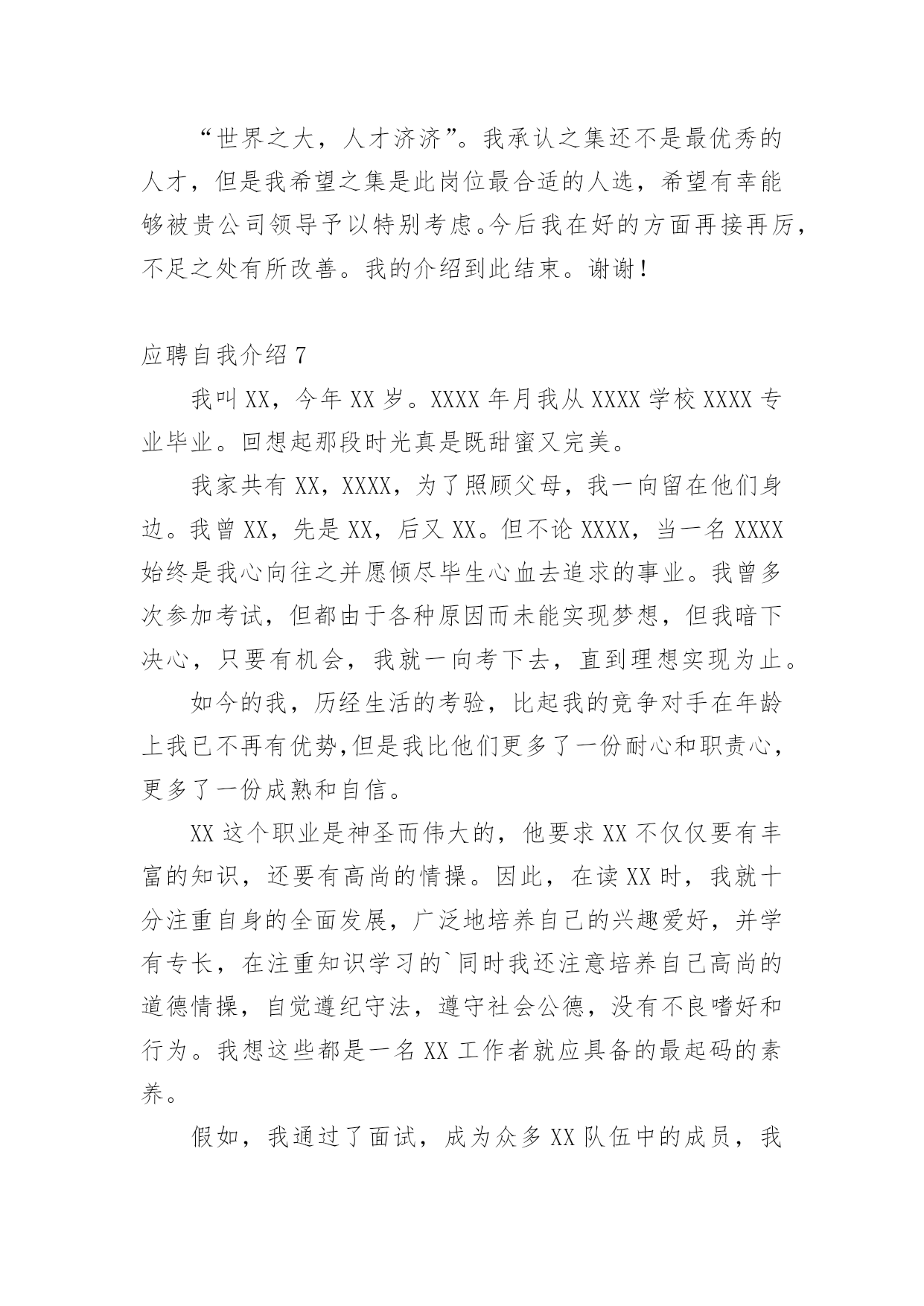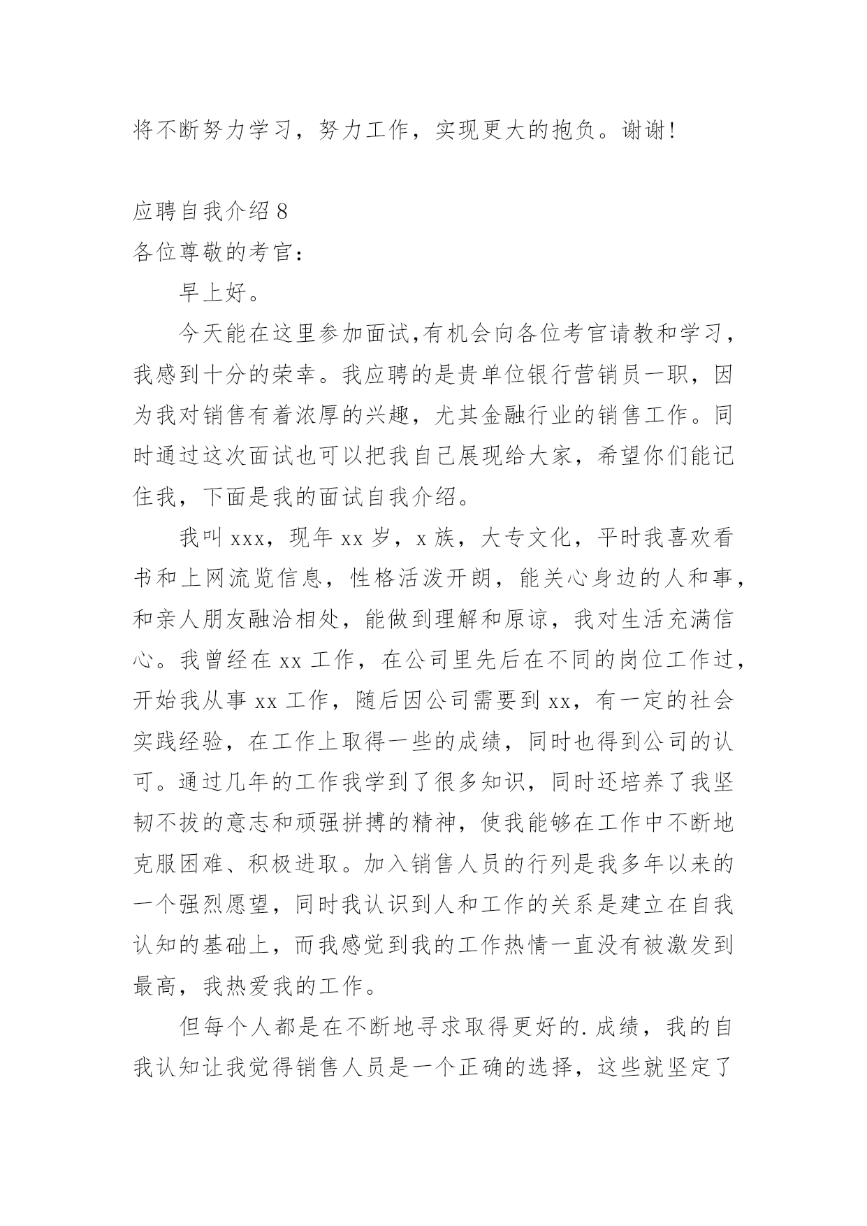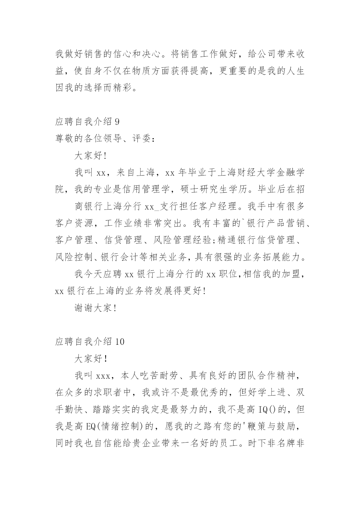 应聘自我介绍(经典)应聘自我介绍15篇当到达一个新的环境后,需要我们进行自我介绍,自我介绍是一展示自己的手段。那么自我介绍要注意有什么内容呢?以下是小编精心整理的应聘自我介绍,欢迎阅读,希望大家能够喜欢。应聘自我介绍1我喜欢音乐、摄影、K歌、骑行、速降等户外活动,喜欢背上行囊去旅行的感觉,去感受及领悟所带来的新事物。有天生的管理天赋,即使是不熟悉的行业我也一样可以管理的井井有条,创效增收。再说我已有多年的采购管理工作经验,擅长部门的'运营管理、绩效制定、人员培训和成本控制。注重企业文化和团队建设,有带团队和培训团队的成功经验,有亲和力并能够很快与各层面的人员建立健康、持续的工作关系。能适当的调整部门员工工作安排,使得工作效率得到相应的提高,同时能以身作则,起到一定的带头作用。相信您的信任与我的实力将为我们带来共同的成功,希望我能为贵公司贡献自己的力量!应聘自我介绍2尊敬的领导、各位评委:上午好!我叫xx,今年22岁,是xx大学xx专业xx届应届毕业生,应聘的职位是xx。我曾先后在xxx有限公司、xx公司、xxx有限公司调研或,了解xx业务流程、xxx操作及生产管理等。正直和努力是我做人的原则,沉着和冷静是我遇事的态度,钻研和尽职是我从业的要求。回顾大学四年的学习生活,感触很深、收获颇丰,掌握了专业知识,培养了自己各方面的素质和能力。我也存在一些不足之处,但我正视缺点和不足,不断的努力,使自己得到更大提高。这次我选择这个职位除了专业对口以外,我觉的我也十分喜欢这个职位,相信它能让我充分实现我的'社会理想和体现自身的价值,我也认为我有能力有信心做好这份工作。非常感谢xx给予我这次学习的机会。谢谢!应聘自我介绍3尊敬的各位领导,你们好!非常荣幸能有机会参加贵医院的招聘面试。感谢贵医院领导给我这个机会。我叫xxx,是xxx职业学院高护专业的毕业生。为了心中的理想,探索生活的真谛,凭者对知识的渴望,人生的追求,我孜孜不倦,不骄不馁,终于迎来了新的起点。光阴似箭,在xxx年的院校生活中,我对护理事业怀有很高的热情,坚持以学为主,取得良好的成绩,且在其他各方面表现良好,被评为“优秀团员”、获的区级三好学生的荣誉,有计算机二级证。通过在校的理论学习和实践学习,我掌握了有一定的操作能力,且有很强的责任心,集体荣誉感。面对新的环境,新的起点,新的挑战,我将进一步充实和提高自己,如果有幸成为贵医院的一员,我必将以满腔的热情投入到工作中,用我的.汗水、知识、热情报答贵医院的知遇之恩。最后,我衷心希望贵医院能给我一个展开才华的舞台,我坚信,你的信任与我的实力将为我们带来共同的成功!我的介绍完毕,谢谢!应聘自我介绍4尊敬的各位面试官:大家好!我叫xxx,我的性格比较开朗、乐观,善于和人相处;具有较强的团队协作意识,能认可他人长处,虚心学习并接受他人的意见;有积极的工作态度,愿意和能够自觉勤奋地工作。对工作认真负责,能吃苦耐劳;英语能力较强,口语及书面语流利;对新事物有较强的学习能力,且能在学习基础上有一定的创新。在大学所学专业是物流,而且在相关服务行业及销售行业公司实习过,所以很乐意在这个很有发展前途的.行业里规划并发展自己。如果我有机会进入到贵公司工作制度,那我将会尽量做到在流程建设方面,提高公司物流运转的效率,降低公司物流成本;供应商与采购管理方面,建立和优化物料采购流程;仓储管理方面,根据公司物料特性及物流发展状况,组织建立公司仓储、周转等仓库管理体系,提高公司货物使用效率;运输管理方面,组织建立公司货物运输体系,规划公司的货物调配与调度;销售与市场支持方面,支持销售及相关市场活动,进行物流成本分析、预算及控制,提高客户满意度;物流系统优化方面,不断完善物流系统,提高物流效率,减少资金占用,降低物流成本,改进服务,增强公司物流环节的竞争力;部门行政管理方面,根据公司发展战略及价值导向,结合物流业务特点,开展组织和人员建设,以实现人力资本的不断增值。我的自我介绍完毕,谢谢!应聘自我介绍5我现年XX岁,XX族,大专文化,我曾经在XX公司工作(或实x),在不同的岗位工作过,开始我从事…工作,随后因公司需要到…,有一定的'社会实践经验,在工作上取得一些的成绩,同时也得到公司的认可。工作(实x)经历让我学到了很多知识,同时还培养了我解决问题,克服困难的能力,如果有幸被贵公司录用,我将努力工作为公司带来更多效益。应聘自我介绍6各位尊敬的考官:大家下午好!很荣幸能在这里面试,让我有向各位考官学习与交流的机会,现将自己的情况简要介绍一下:我叫xxx,出身在闻名于是的煤醋之乡—山西。性格比较温和、谦虚、认真细致、踏实、吃苦耐劳、有较强的责任心和社会适应能力。即将于20xx年6月毕业于河南工业职业技术学院,作为一名软件专业的大学生,我更喜欢平面设计,在大学三年的学