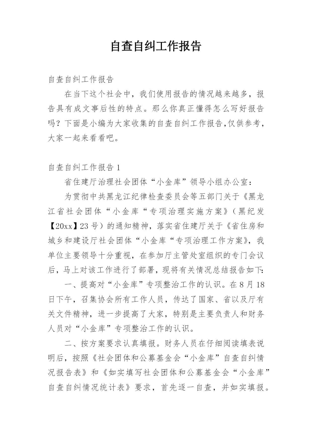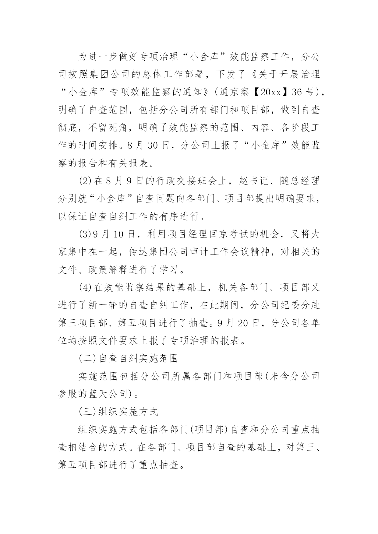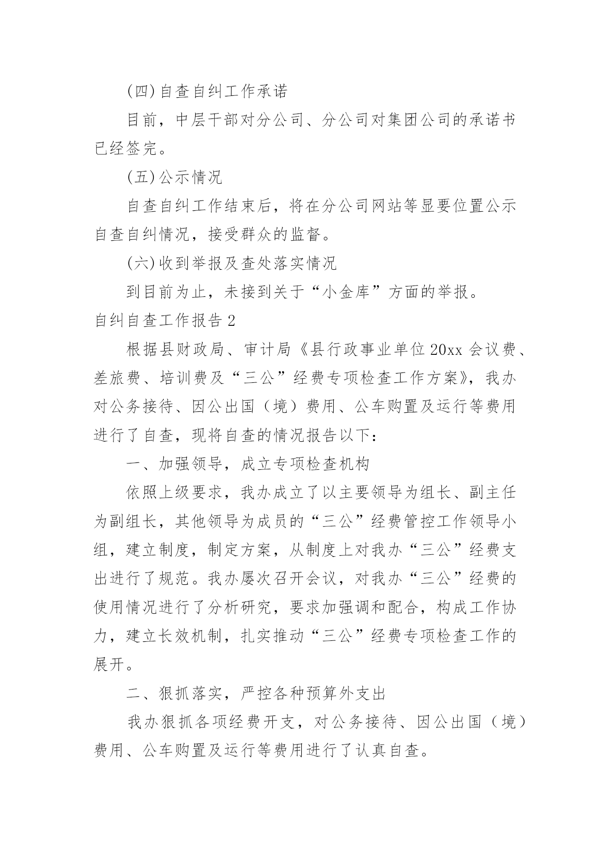 自纠自查工作报告自纠自查工作报告在人们越来越注重自身素养的今天,报告的使用成为日常生活的常态,报告中提到的所有信息应该是准确无误的。那么你真正懂得怎么写好报告吗?下面是小编为大家整理的自纠自查工作报告,希望对大家有所帮助。自纠自查工作报告1按照集团公司关于“小金库”专项治理的通知要求,我公司认真开展了关于“小金库”自查自纠工作,现将有关情况汇报如下:自查自纠组织实施情况(一)动员部署、宣传发动情况1、健全组织,加强领导为加强对“小金库”专项治理工作的领导,分公司成立了由党委书记赵斌毅同志为组长,纪委书记许永军、生产副经理兰庆锁、总会计师欧宝军为副组长,计划财务部、监察审计部、人力资源部、党群工作部部门负责人为组员的领导小组,负责专项治理工作的组织、协调,下设办公室,办公室设在监察审计部,负责日常具体工作,办公室成员由机关各部门负责人、项目经理以及相关人员组成,范文之整改报告:企业小金库自查报告。2、加强宣传,提高认识为保证专项治理工作的顺利开展,分公司开展专项治理的宣传教育工作主要从以下几个方面进行:(1)领导班子成员利用党委会、中心组学习机会专门传达学习了国资委李荣融主任在央企“小金库”专项治理视频会议上的讲话及公司党委、纪委下发的文件精神,以统一思想、提高认识,端正对治理“小金库”的态度。(2)利用分公司内部刊物《京工简讯》,分期连载《党员干部廉洁从政若干准则》《有关“小金库”问题的几个问题说明》等相关内容,以便党员、干部能够有针对性地进行学习,同时,相关科室专门抽出时间,进行会计法规知识的学习与宣贯。(3)8月18日,组织机关部门负责人及在京的项目经理集中学习国资委主任李荣融在中央企业“小金库”专项治理工作会议上的讲话以及集团公司“小金库”专项治理的实施方案内容,明晰“小金库”专项治理工作的整体安排和部署,并将有关内容以邮件形式传给不在京的项目经理并要求自学。(4)由于项目部忙于施工项目无法进行集中学习,因此,我们将学习的材料以及集团公司后续转发的文件,以电子邮件形式发到各个项目经理和项目部(指挥部)的邮箱。同时,挂在单位的局域网上,供项目部组织职工进行学习。3、专项治理工作的具体步骤(1)下发文件,规范治理工作为进一步做好专项治理“小金库”效能监察工作,分公司按照集团公司的总体工作部署,下发了《关于开展治理“小金库”专项效能监察的通知》(通京察【20xx】36号),明确了自查范围,包括分公司所有部门和项目部,做到自查彻底,不留死角,明确了效能监察的范围、内容、各阶段工作的时间安排。8月30日,分公司上报了“小金库”效能监察的报告和有关报表。(2)在8月9日的行政交接班会上,赵书记、随总经理分别就“小金库”自查问题向各部门、项目部提出明确要求,以保证自查自纠工作的有序进行。(3)9月10日,利用项目经理回京考试的机会,又将大家集中在一起,传达集团公司审计工作会议精神,对相关的文件、政策解释进行了学习。(4)在效能监察结果的基础上,机关各部门、项目部又进行了新一轮的自查自纠工作,在此期间,分公司纪委分赴第三项目部、第五项目进行了抽查。9月20日,分公司各单位均按照文件要求上报了专项治理的报表。(二)自查自纠实施范围实施范围包括分公司所属各部门和项目部(未含分公司参股的蓝天公司)。(三)组织实施方式组织实施方式包括各部门(项目部)自查和分公司重点抽查相结合的方式。在各部门、项目部自查的基础上,对第三、第五项目部进行了重点抽查。(四)自查自纠工作承诺目前,中层干部对分公司、分公司对集团公司的承诺书已经签完。(五)公示情况自查自纠工作结束后,将在分公司网站等显要位置公示自查自纠情况,接受群众的监督。(六)收到举报及查处落实情况到目前为止,未接到关于“小金库”方面的举报。自纠自查工作报告2根据县财政局、审计局《县行政事业单位20xx会议费、差旅费、培训费及“三公”经费专项检查工作方案》,我办对公务接待、因公出国(境)费用、公车购置及运行等费用进行了自查,现将自查的情况报告以下:一、加强领导,成立专项检查机构依照上级要求,我办成立了以主要领导为组长、副主任为副组长,其他领导为成员的“三公”经费管控工作领导小组,建立制度,制定方案,从制度上对我办“三公”经费支出进行了规范。我办屡次召开会议,对我办“三公”经费的使用情况进行了分析研究,要求加强调和配合,构成工作协力,建立长效机制,扎实推动“三公”经费专项检查工作的展开。二、狠抓落实,严控各种预算外支出我办狠抓各项经费开支,对公务接待、因公出国(境)费用、公车购置及运行等费用进行了认真自查。在公务接待方面:我办认真学习了中心密切联系群众、改进工作作风的八项规定,严格公务接待费用。在平常工作中,我办严格接待费用开支,做到因私接待客人尽不动用,规定内的接待尽不超标接待,严格遵守公务接待费