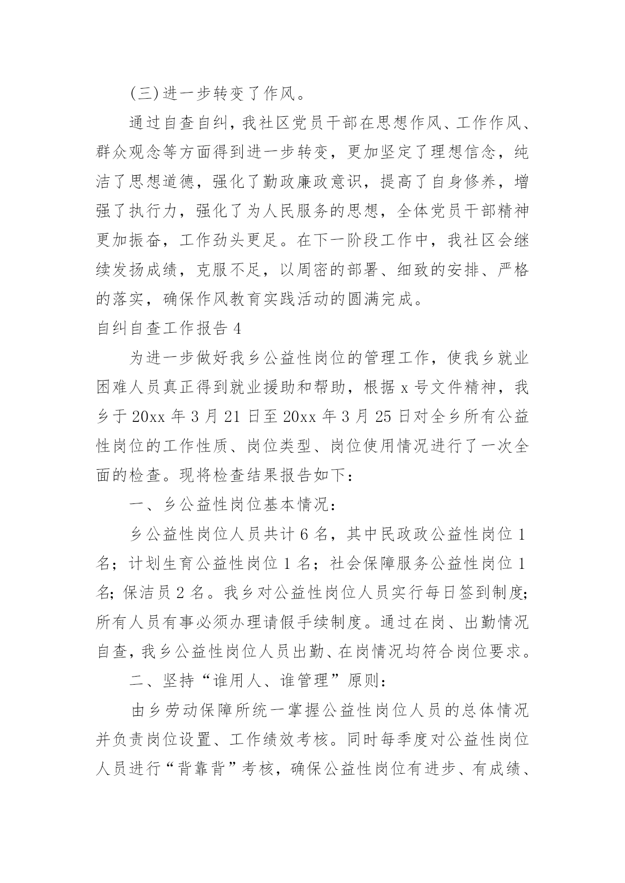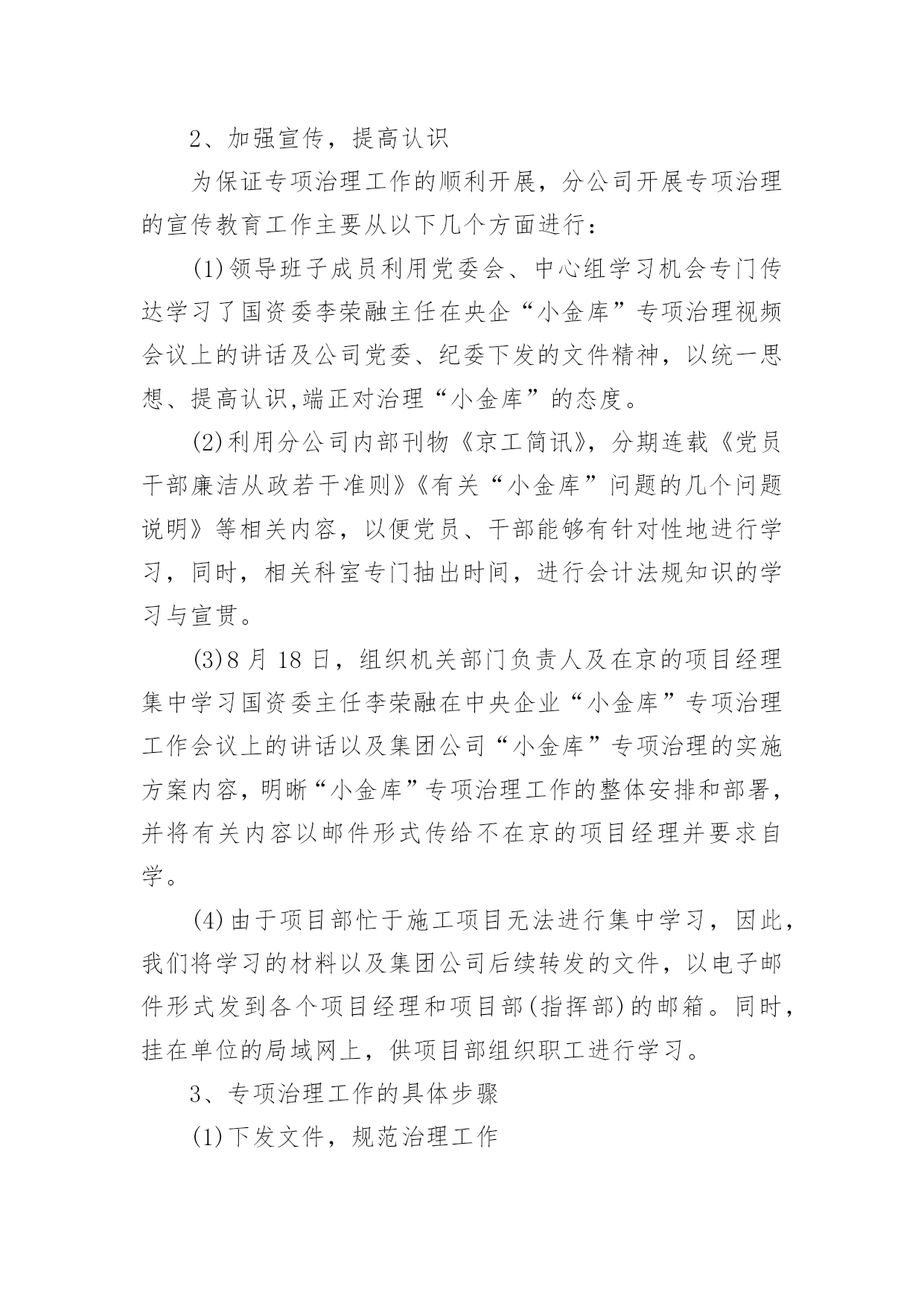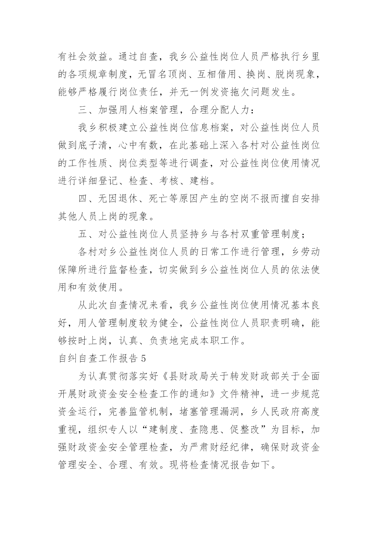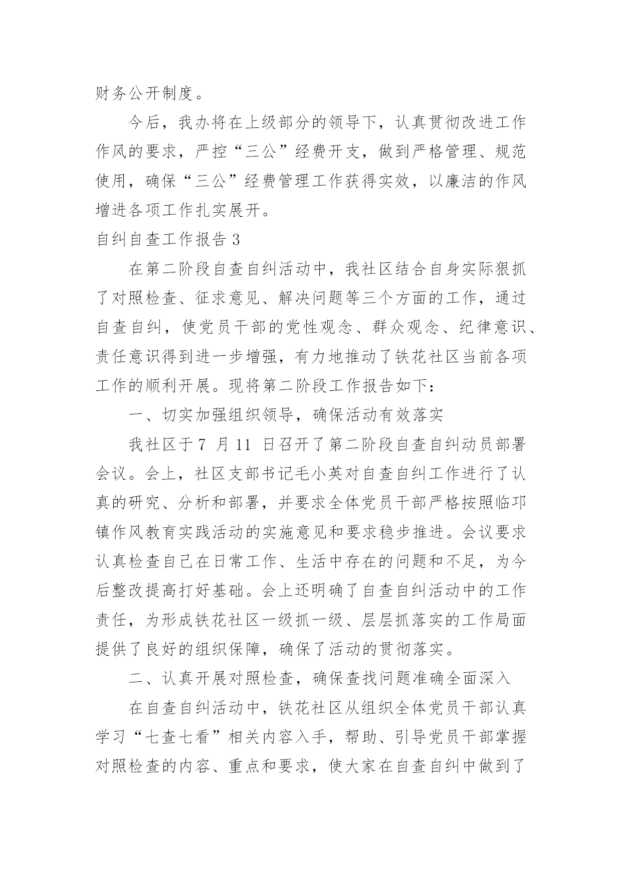 自纠自查工作报告自纠自查工作报告在人们越来越注重自身素养的今天,报告的使用成为日常生活的常态,报告中提到的所有信息应该是准确无误的。那么你真正懂得怎么写好报告吗?下面是小编为大家整理的自纠自查工作报告,希望对大家有所帮助。自纠自查工作报告1按照集团公司关于“小金库”专项治理的通知要求,我公司认真开展了关于“小金库”自查自纠工作,现将有关情况汇报如下:自查自纠组织实施情况(一)动员部署、宣传发动情况1、健全组织,加强领导为加强对“小金库”专项治理工作的领导,分公司成立了由党委书记赵斌毅同志为组长,纪委书记许永军、生产副经理兰庆锁、总会计师欧宝军为副组长,计划财务部、监察审计部、人力资源部、党群工作部部门负责人为组员的领导小组,负责专项治理工作的组织、协调,下设办公室,办公室设在监察审计部,负责日常具体工作,办公室成员由机关各部门负责人、项目经理以及相关人员组成,范文之整改报告:企业小金库自查报告。2、加强宣传,提高认识为保证专项治理工作的顺利开展,分公司开展专项治理的宣传教育工作主要从以下几个方面进行:(1)领导班子成员利用党委会、中心组学习机会专门传达学习了国资委李荣融主任在央企“小金库”专项治理视频会议上的讲话及公司党委、纪委下发的文件精神,以统一思想、提高认识,端正对治理“小金库”的态度。(2)利用分公司内部刊物《京工简讯》,分期连载《党员干部廉洁从政若干准则》《有关“小金库”问题的几个问题说明》等相关内容,以便党员、干部能够有针对性地进行学习,同时,相关科室专门抽出时间,进行会计法规知识的学习与宣贯。(3)8月18日,组织机关部门负责人及在京的项目经理集中学习国资委主任李荣融在中央企业“小金库”专项治理工作会议上的讲话以及集团公司“小金库”专项治理的实施方案内容,明晰“小金库”专项治理工作的整体安排和部署,并将有关内容以邮件形式传给不在京的项目经理并要求自学。(4)由于项目部忙于施工项目无法进行集中学习,因此,我们将学习的材料以及集团公司后续转发的文件,以电子邮件形式发到各个项目经理和项目部(指挥部)的邮箱。同时,挂在单位的局域网上,供项目部组织职工进行学习。3、专项治理工作的具体步骤(1)下发文件,规范治理工作为进一步做好专项治理“小金库”效能监察工作,分公司按照集团公司的总体工作部署,下发了《关于开展治理“小金库”专项效能监察的通知》(通京察【20xx】36号),明确了自查范围,包括分公司所有部门和项目部,做到自查彻底,不留死角,明确了效能监察的范围、内容、各阶段工作的时间安排。8月30日,分公司上报了“小金库”效能监察的报告和有关报表。(2)在8月9日的行政交接班会上,赵书记、随总经理分别就“小金库”自查问题向各部门、项目部提出明确要求,以保证自查自纠工作的有序进行。(3)9月10日,利用项目经理回京考试的机会,又将大家集中在一起,传达集团公司审计工作会议精神,对相关的文件、政策解释进行了学习。(4)在效能监察结果的基础上,机关各部门、项目部又进行了新一轮的自查自纠工作,在此期间,分公司纪委分赴第三项目部、第五项目进行了抽查。9月20日,分公司各单位均按照文件要求上报了专项治理的报表。(二)自查自纠实施范围实施范围包括分公司所属各部门和项目部(未含分公司参股的蓝天公司)。(三)组织实施方式组织实施方式包括各部门(项目部)自查和分公司重点抽查相结合的方式。在各部门、项目部自查的基础上,对第三、第五项目部进行了重点抽查。(四)自查自纠工作承诺目前,中层干部对分公司、分公司对集团公司的承诺书已经签完。(五)公示情况自查自纠工作结束后,将在分公司网站等显要位置公示自查自纠情况,接受群众的监督。(六)收到举报及查处落实情况到目前为止,未接到关于“小金库”方面的举报。自纠自查工作报告2根据县财政局、审计局《县行政事业单位20xx会议费、差旅费、培训费及“三公”经费专项检查工作方案》,我办对公务接待、因公出国(境)费用、公车购置及运行等费用进行了自查,现将自查的情况报告以下:一、加强领导,成立专项检查机构依照上级要求,我办成立了以主要领导为组长、副主任为副组长,其他领导为成员的“三公”经费管控工作领导小组,建立制度,制定方案,从制度上对我办“三公”经费支出进行了规范。我办屡次召开会议,对我办“三公”经费的使用情况进行了分析研究,要求加强调和配合,构成工作协力,建立长效机制,扎实推动“三公”经费专项检查工作的展开。二、狠抓落实,严控各种预算外支出我办狠抓各项经费开支,对公务接待、因公出国(境)费用、公车购置及运行等费用进行了认真自查。在公务接待方面:我办认真学习了中心密切联系群众、改进工作作风的八项规定,严格公务接待费用。在平常工作中,我办严格接待费用开支,做到因私接待客人尽不动用,规定内的接待尽不超标接待,严格遵守公务接待费