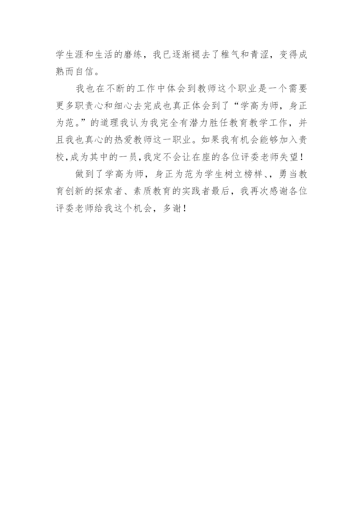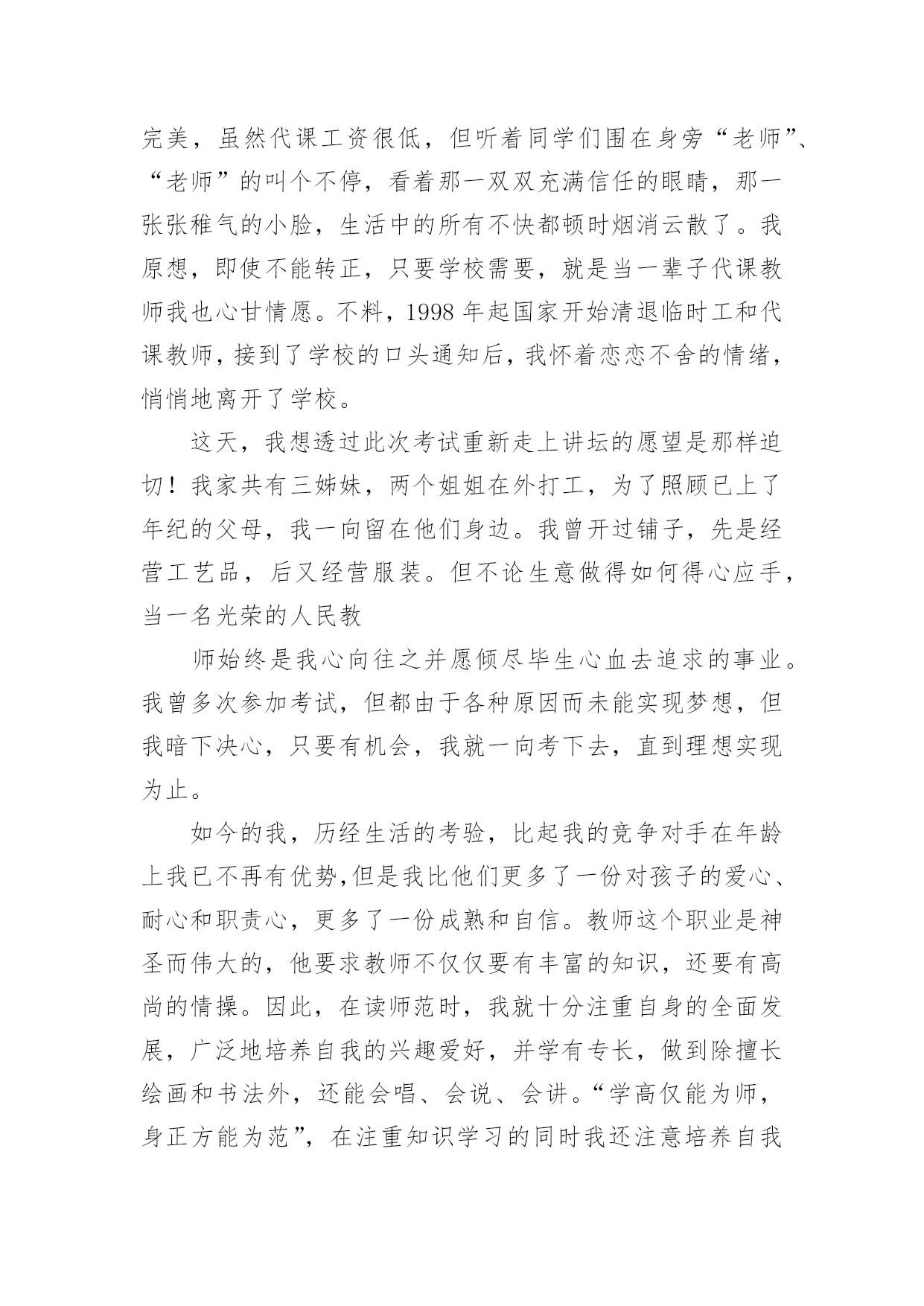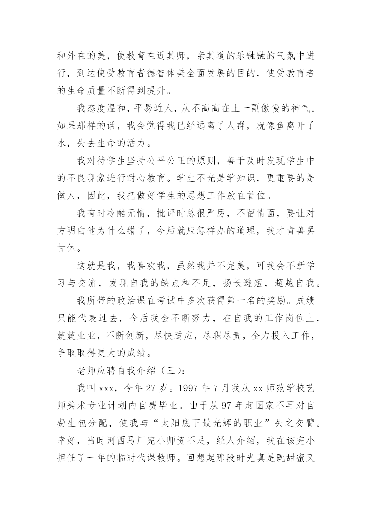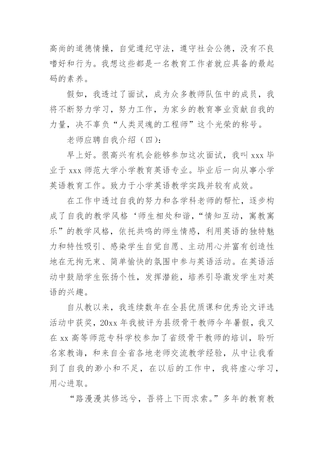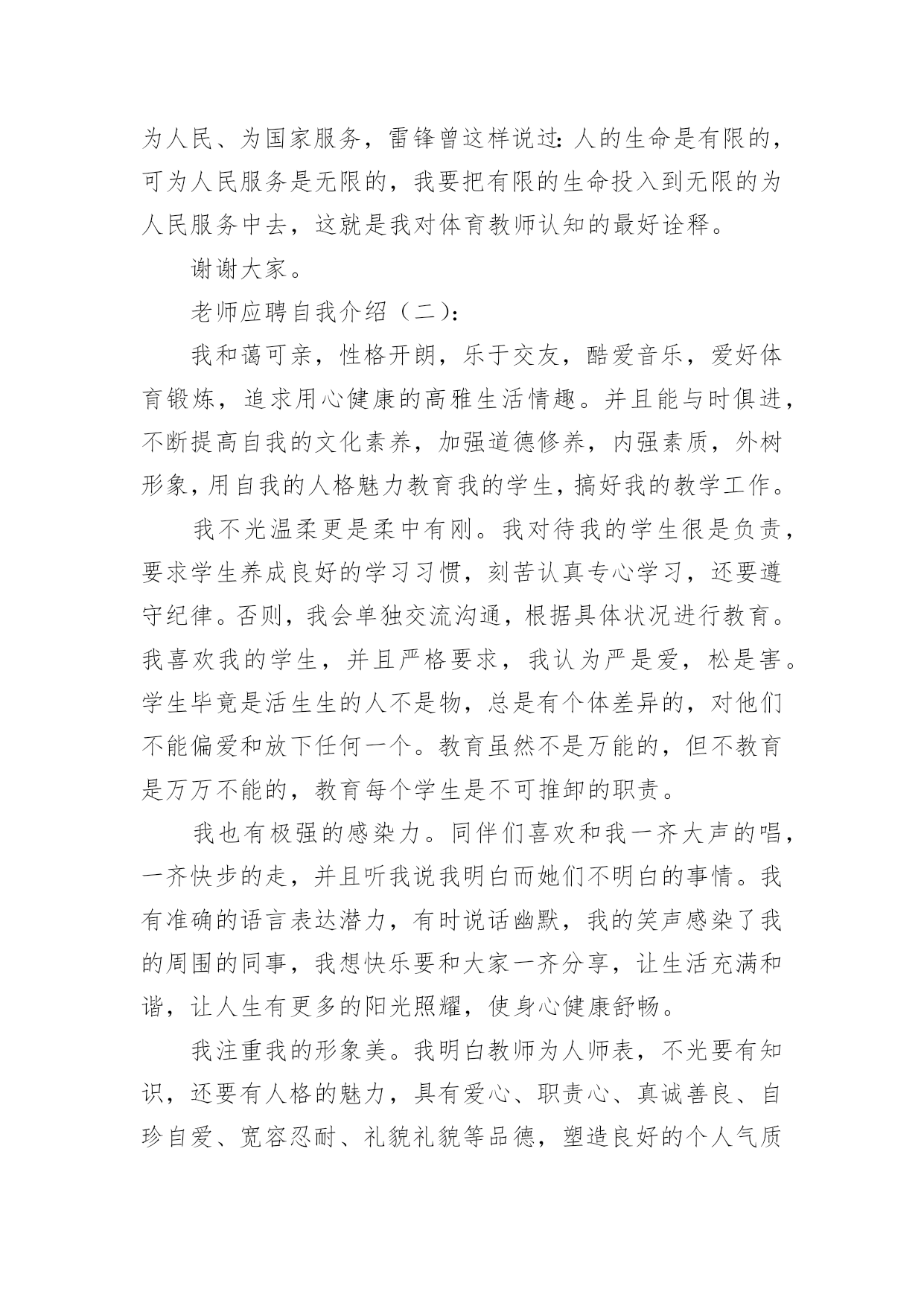 老师应聘自我介绍老师应聘自我介绍(一):你们好!今天能在有机会向各位考官请教和学习,我感到十分的荣幸,同时通过这次面试也可以把我自己展现给大家,希望你们能记住我,下面介绍一下我的基本情况。我叫xxx,现年xx岁,x族,大专文化,平时我喜欢看书和上网流览信息,性格活泼开朗,能关心身边的人和事,和亲人朋友融洽相处,能做到理解和原谅,我对生活充满信心。我曾经在xx工作,在公司里先后在不同的岗位工作过,开始我从事xx工作,随后因公司需要到xx,有一定的社会实践经验,在工作上取得一些的成绩,同时也得到公司的认可。通过几年的工作我学到了很多知识,同时还培养了我坚韧不拔的意志和顽强拼搏的精神,使我能够在工作中不断地克服困难、积极进取。加入体育教师的行列是我多年以来的一个强烈愿望,同时我认识到人和工作的关系是建立在自我认知的基础上,而我感觉到我的工作热情一直没有被激发到最高,我热爱我的工作,但每个人都是在不断地寻求取得更好的成绩,我的自我认知让我觉得体育教师是一个正确的选择,这些就坚定了我报考体育育教师的信心和决心。所以我参加了这次体育教师考试并报考了xx,如果这次能考上,我相信自己能够在xx中得到锻炼和有获得发展的机会。体育教师是一种神圣而高尚的职业,它追求的是公共利益的最大化,所以要求体育教师要为人民、为国家服务,雷锋曾这样说过:人的生命是有限的,可为人民服务是无限的,我要把有限的生命投入到无限的为人民服务中去,这就是我对体育教师认知的最好诠释。谢谢大家。老师应聘自我介绍(二):我和蔼可亲,性格开朗,乐于交友,酷爱音乐,爱好体育锻炼,追求用心健康的高雅生活情趣。并且能与时俱进,不断提高自我的文化素养,加强道德修养,内强素质,外树形象,用自我的人格魅力教育我的学生,搞好我的教学工作。我不光温柔更是柔中有刚。我对待我的学生很是负责,要求学生养成良好的学习习惯,刻苦认真专心学习,还要遵守纪律。否则,我会单独交流沟通,根据具体状况进行教育。我喜欢我的学生,并且严格要求,我认为严是爱,松是害。学生毕竟是活生生的人不是物,总是有个体差异的,对他们不能偏爱和放下任何一个。教育虽然不是万能的,但不教育是万万不能的,教育每个学生是不可推卸的职责。我也有极强的感染力。同伴们喜欢和我一齐大声的唱,一齐快步的走,并且听我说我明白而她们不明白的事情。我有准确的语言表达潜力,有时说话幽默,我的笑声感染了我的周围的同事,我想快乐要和大家一齐分享,让生活充满和谐,让人生有更多的阳光照耀,使身心健康舒畅。我注重我的形象美。我明白教师为人师表,不光要有知识,还要有人格的魅力,具有爱心、职责心、真诚善良、自珍自爱、宽容忍耐、礼貌礼貌等品德,塑造良好的个人气质和外在的美,使教育在近其师,亲其道的乐融融的气氛中进行,到达使受教育者德智体美全面发展的目的,使受教育者的生命质量不断得到提升。我态度温和,平易近人,从不高高在上一副傲慢的神气。如果那样的话,我会觉得我已经远离了人群,就像鱼离开了水,失去生命的活力。我对待学生坚持公平公正的原则,善于及时发现学生中的不良现象进行耐心教育。学生不光是学知识,更重要的是做人,因此,我把做好学生的思想工作放在首位。我有时冷酷无情,批评时总很严厉,不留情面,要让对方明白他为什么错了,今后就应怎样办的道理,我才肯善罢甘休。这就是我,我喜欢我,虽然我并不完美,可我会不断学习与交流,发现自我的缺点和不足,扬长避短,超越自我。我所带的政治课在考试中多次获得第一名的奖励。成绩只能代表过去,今后我会不断努力,在自我的工作岗位上,兢兢业业,不断创新,尽快适应,尽职尽责,全力投入工作,争取取得更大的成绩。老师应聘自我介绍(三):我叫xxx,今年27岁。1997年7月我从xx师范学校艺师美术专业计划内自费毕业。由于从97年起国家不再对自费生包分配,使我与“太阳底下最光辉的职业”失之交臂。幸好,当时河西马厂完小师资不足,经人介绍,我在该完小担任了一年的临时代课教师。回想起那段时光真是既甜蜜又完美,虽然代课工资很低,但听着同学们围在身旁“老师”、“老师”的叫个不停,看着那一双双充满信任的眼睛,那一张张稚气的小脸,生活中的所有不快都顿时烟消云散了。我原想,即使不能转正,只要学校需要,就是当一辈子代课教师我也心甘情愿。不料,1998年起国家开始清退临时工和代课教师,接到了学校的口头通知后,我怀着恋恋不舍的情绪,悄悄地离开了学校。这天,我想透过此次考试重新走上讲坛的愿望是那样迫切!我家共有三姊妹,两个姐姐在外打工,为了照顾已上了年纪的父母,我一向留在他们身边。我曾开过铺子,先是经营工艺品,后又经营服装。但不论生意做得如何得心应手,当一名光荣的人民教师始终是我心向往之并愿倾尽毕生心血去追求的事业。我曾多次参加考试,但都由于各种原因而未能实现梦想,但我暗下决心,只要有机会,我