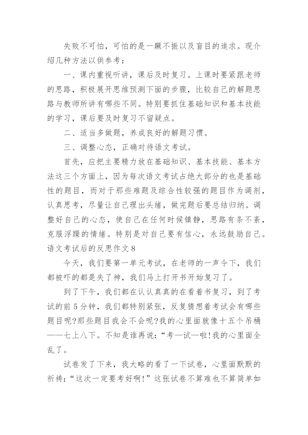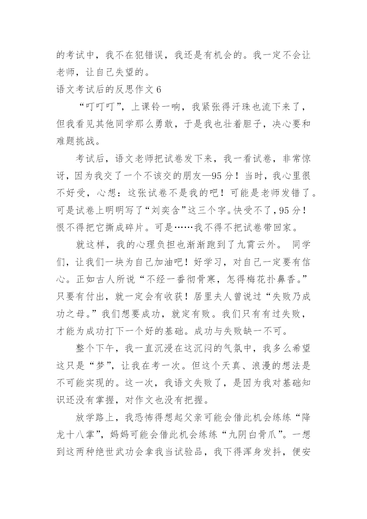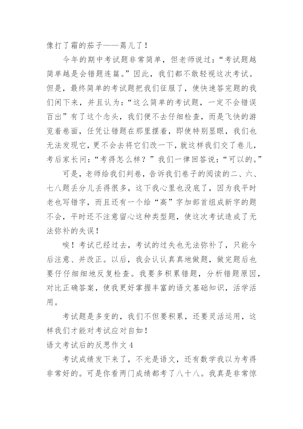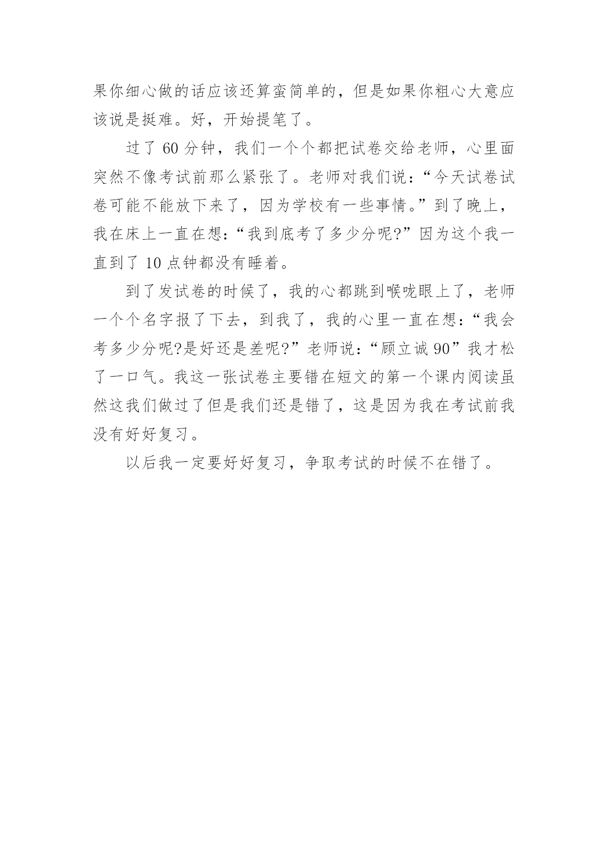 语文考试后的反思作文语文考试后的反思作文(8篇)在生活、工作和学习中,大家都经常接触到作文吧,根据写作命题的特点,作文可以分为命题作文和非命题作文。那么你知道一篇好的作文该怎么写吗?下面是小编为大家整理的语文考试后的反思作文,供大家参考借鉴,希望可以帮助到有需要的朋友。语文考试后的反思作文1语文考试终于结束了,我悬着的一颗心终于放下了,我很高兴,也很担心,高兴的是可以放松一下,担心的是到底是考了多少分。在回家的路上,我的心就像揣着调皮的小兔子,忐忑不安。前面有两个同学边走边讨论考试题目。我赶紧跑过去,与他们一起讨论,不问不知道,一问吓一跳。出乎意料,发现我有好多字写错了,又有好几处错了。我的心跳越来越快,原来回家走路只要10分钟,可我却走了近半小时,边走边想。我的心情就像化掉的巧克力一样黏糊糊的,难受极了。几乎每次考试都是基础部分失分最多。我想,肯定考不到高分了。不知不觉到家了。推开门,妈妈问我试卷难吗?我无语。考得怎么样?妈妈的这句话就像一个木塞子,把我的嘴塞住了,我憋了半天才说出一句话。不知道,应该90分有吧!说完,我来到自己的房间,拿出课外书,认真阅读起来。大约过半小时,妈妈来到我的身旁,我鼓着腮帮子,表情一副不高兴的样子。妈妈连忙安慰我说:“还可以,这是真实的,考试前是不用复习的,就是要看看你吸收知识的能力,平时知识掌握得怎样。才4年级不需要做太多的题目,有时间阅读。上课认真听讲,老师布置的作业高效完成就可以了。基础部分是死知识,你时间用的太少了,到时会好的。况且你又不是太差。就是要养成好的学习习惯。特别是语文要边写边默读,有没有丢字少字。妈妈就知道你在写的方面不是太好,没关系,到时就好了。听了妈妈的一番话,我心里舒服多了。我开心的是作文和阅读理解我扣分少。通过每次考试后,我懂得了学习一定要认真踏实,不能投机取巧,好的成绩的取得是与平时的努力分不开的。语文考试后的反思作文2期中考试的语文成绩令老师与父母大失所望,也令我也十分震惊,是的,考砸了。我不得不躲一下期中考试后的深刻反思了,反思之后我发现失败的原因有很多。首先,学习态度不端正,课前预习不充分,学完每一课后没有及时复习,导致考试时碰到以前课程的题目,失分过多。学习习惯不好,没有合理安排时间,作业的质量与效率不高,经常熬夜,上课没有精神。其次,上课没有积极参与课堂,对于每一个问题没有仔细思考,以致思路不活跃,掌握的知识不具体、不全面,不会举一反三,思考问题所需时间很长,导致作文时间不充裕。做的练习很少,做题的经验较少。再者,便是课外书的阅读,阅读量过少,导致写作文没有素材,词汇的积累也很少,语言没有逻辑性,文章显得十分杂乱,苍白无力。对历史与人文的理解也很少,对许多文章包括诗词都不能理解,导致考试中的课外文言文失分不少,阅读能力仍有待提高。最后,则是我最大的弱点:粗心。总是“大意失荆州”,做题马马虎虎,没有审清题意便盲目做题,不知是语文,所有的科目都是这样,做完试卷后没有仔细检查,导致犯了许多不该错的失误,正确率较低。以后做题一定要仔细,不能因为题目简单而不去在意,学习是一个循环渐进的过程,只有打牢了基础,才能在此之上再去提高,所以,对以前知识的掌握,是必要性的。通过了对本次语文考试的反思,我了解了更多自己的不足之处,知道了,自己的水平还差得很远,只有下苦功夫,才能取得成功。一分耕耘一分收获,我要继续努力争取下一次的好成绩!语文考试后的反思作文3随着期中考试的结束,答疑网小编推荐语文期中考试后反思与总结100字供大家查看,祝各位考生金榜题名!令人紧张的语文考试结束了,考试的失败与成功还是一个未解之谜,可是,当考完最后一门功课时,老师简短的几句话却成了我们心情的晴天霹雳,使一下子松弛下来的我们像打了霜的茄子——蔫儿了!今年的期中考试题非常简单,但老师说过:“考试题越简单越是会错题连篇。”因此,我们都不敢轻视这次考试。但是,最终简单的考试题把我们征服了,使快速答完题的我们闲下来,并且认为:“这么简单的考试题,一定不会错误百出”有了这个念头,我们便不去仔细检查,而是飞快的游览着卷面,任凭让错题在那里摆着,即使特别显眼,我们也无法发现它,更不会去将它们改一下,就这样我们交了卷儿,考后家长问:“考得怎么样?”我们一律回答说:“可以的。”可是,老师给我们判卷,告诉我们卷子的阅读的二、六、七八题丢分儿丢得很多,这下我心里也没底了,因为我平时老也写错字,而且还有一个给“高”字加部首组成新字的题不会,平时还不注意留心这种类型题,使这次考试造成了无法弥补的失误!唉!考试已经过去,考试的过失也无法弥补了,只能今后注意、并改正。以后,我会认认真真地做题,做完题后也要仔仔细细地反复检查。我要多积累错题,分析错题原因,对比正确答案,使我更好掌握丰富的语文基础知识,活学活用。考试题是多变的,
