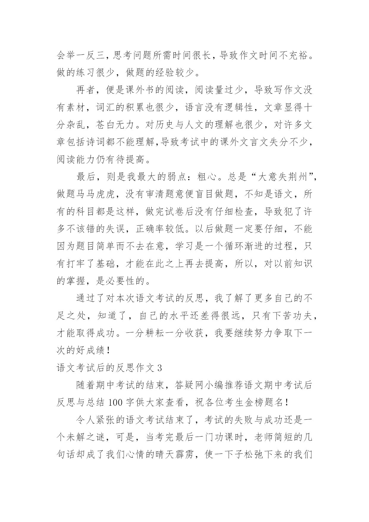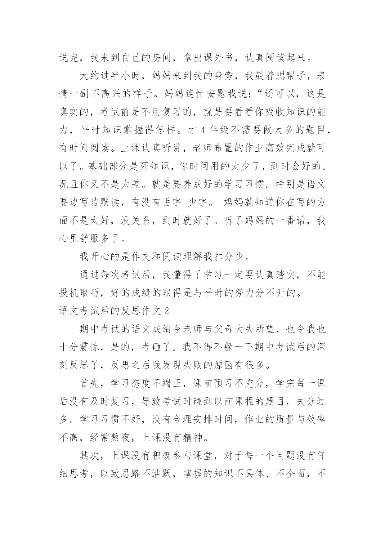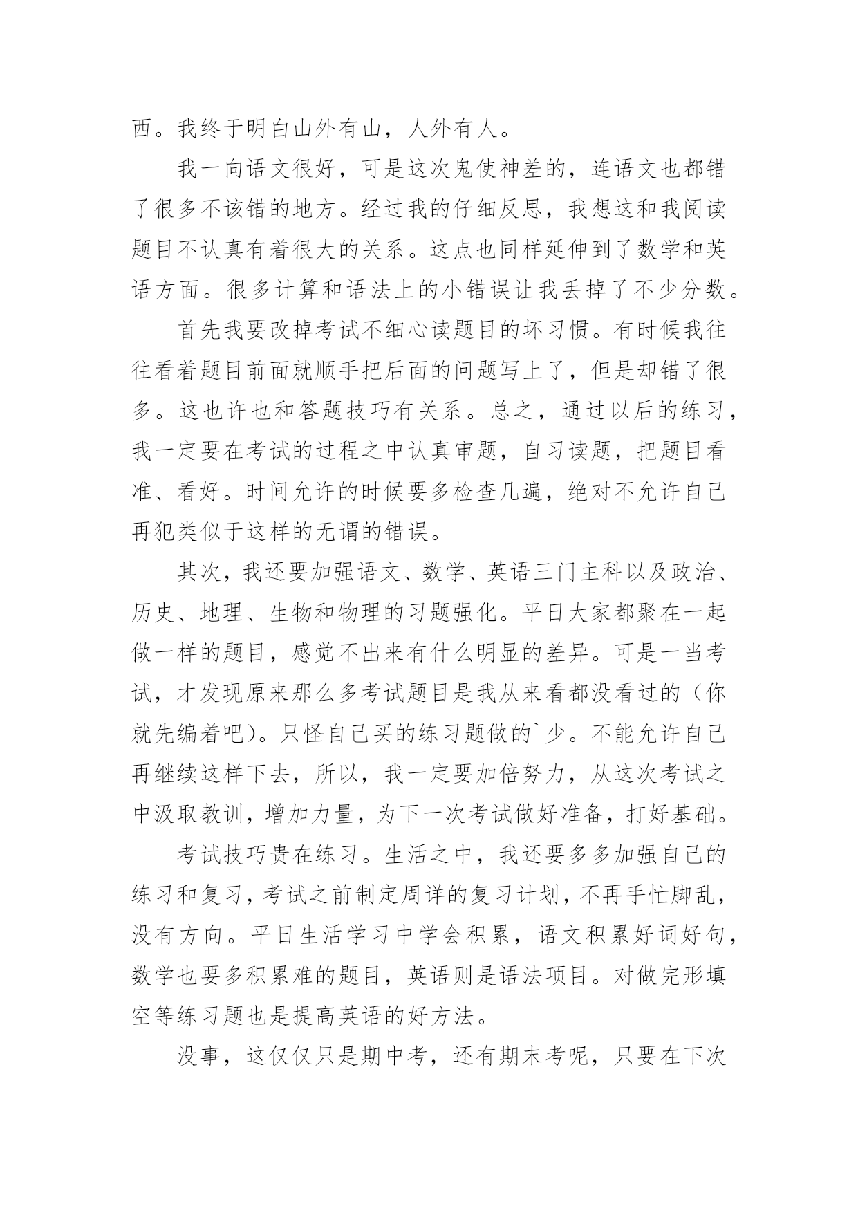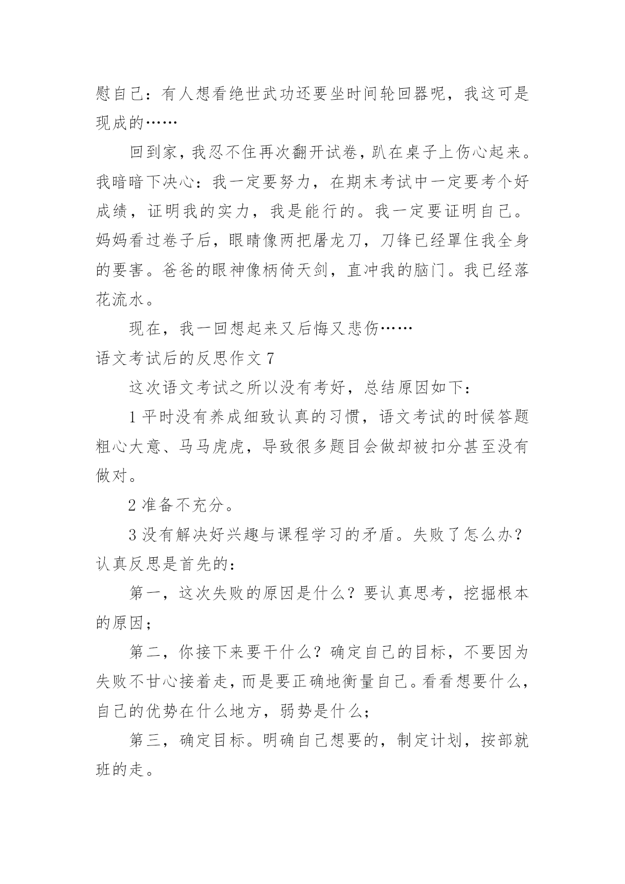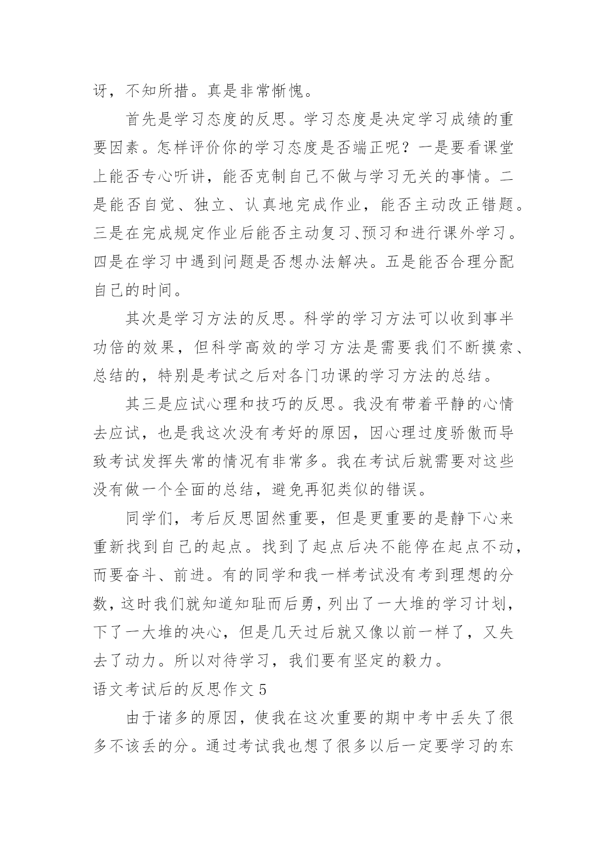 语文考试后的反思作文语文考试后的反思作文(8篇)在生活、工作和学习中,大家都经常接触到作文吧,根据写作命题的特点,作文可以分为命题作文和非命题作文。那么你知道一篇好的作文该怎么写吗?下面是小编为大家整理的语文考试后的反思作文,供大家参考借鉴,希望可以帮助到有需要的朋友。语文考试后的反思作文1语文考试终于结束了,我悬着的一颗心终于放下了,我很高兴,也很担心,高兴的是可以放松一下,担心的是到底是考了多少分。在回家的路上,我的心就像揣着调皮的小兔子,忐忑不安。前面有两个同学边走边讨论考试题目。我赶紧跑过去,与他们一起讨论,不问不知道,一问吓一跳。出乎意料,发现我有好多字写错了,又有好几处错了。我的心跳越来越快,原来回家走路只要10分钟,可我却走了近半小时,边走边想。我的心情就像化掉的巧克力一样黏糊糊的,难受极了。几乎每次考试都是基础部分失分最多。我想,肯定考不到高分了。不知不觉到家了。推开门,妈妈问我试卷难吗?我无语。考得怎么样?妈妈的这句话就像一个木塞子,把我的嘴塞住了,我憋了半天才说出一句话。不知道,应该90分有吧!说完,我来到自己的房间,拿出课外书,认真阅读起来。大约过半小时,妈妈来到我的身旁,我鼓着腮帮子,表情一副不高兴的样子。妈妈连忙安慰我说:“还可以,这是真实的,考试前是不用复习的,就是要看看你吸收知识的能力,平时知识掌握得怎样。才4年级不需要做太多的题目,有时间阅读。上课认真听讲,老师布置的作业高效完成就可以了。基础部分是死知识,你时间用的太少了,到时会好的。况且你又不是太差。就是要养成好的学习习惯。特别是语文要边写边默读,有没有丢字少字。妈妈就知道你在写的方面不是太好,没关系,到时就好了。听了妈妈的一番话,我心里舒服多了。我开心的是作文和阅读理解我扣分少。通过每次考试后,我懂得了学习一定要认真踏实,不能投机取巧,好的成绩的取得是与平时的努力分不开的。语文考试后的反思作文2期中考试的语文成绩令老师与父母大失所望,也令我也十分震惊,是的,考砸了。我不得不躲一下期中考试后的深刻反思了,反思之后我发现失败的原因有很多。首先,学习态度不端正,课前预习不充分,学完每一课后没有及时复习,导致考试时碰到以前课程的题目,失分过多。学习习惯不好,没有合理安排时间,作业的质量与效率不高,经常熬夜,上课没有精神。其次,上课没有积极参与课堂,对于每一个问题没有仔细思考,以致思路不活跃,掌握的知识不具体、不全面,不会举一反三,思考问题所需时间很长,导致作文时间不充裕。做的练习很少,做题的经验较少。再者,便是课外书的阅读,阅读量过少,导致写作文没有素材,词汇的积累也很少,语言没有逻辑性,文章显得十分杂乱,苍白无力。对历史与人文的理解也很少,对许多文章包括诗词都不能理解,导致考试中的课外文言文失分不少,阅读能力仍有待提高。最后,则是我最大的弱点:粗心。总是“大意失荆州”,做题马马虎虎,没有审清题意便盲目做题,不知是语文,所有的科目都是这样,做完试卷后没有仔细检查,导致犯了许多不该错的失误,正确率较低。以后做题一定要仔细,不能因为题目简单而不去在意,学习是一个循环渐进的过程,只有打牢了基础,才能在此之上再去提高,所以,对以前知识的掌握,是必要性的。通过了对本次语文考试的反思,我了解了更多自己的不足之处,知道了,自己的水平还差得很远,只有下苦功夫,才能取得成功。一分耕耘一分收获,我要继续努力争取下一次的好成绩!语文考试后的反思作文3随着期中考试的结束,答疑网小编推荐语文期中考试后反思与总结100字供大家查看,祝各位考生金榜题名!令人紧张的语文考试结束了,考试的失败与成功还是一个未解之谜,可是,当考完最后一门功课时,老师简短的几句话却成了我们心情的晴天霹雳,使一下子松弛下来的我们像打了霜的茄子——蔫儿了!今年的期中考试题非常简单,但老师说过:“考试题越简单越是会错题连篇。”因此,我们都不敢轻视这次考试。但是,最终简单的考试题把我们征服了,使快速答完题的我们闲下来,并且认为:“这么简单的考试题,一定不会错误百出”有了这个念头,我们便不去仔细检查,而是飞快的游览着卷面,任凭让错题在那里摆着,即使特别显眼,我们也无法发现它,更不会去将它们改一下,就这样我们交了卷儿,考后家长问:“考得怎么样?”我们一律回答说:“可以的。”可是,老师给我们判卷,告诉我们卷子的阅读的二、六、七八题丢分儿丢得很多,这下我心里也没底了,因为我平时老也写错字,而且还有一个给“高”字加部首组成新字的题不会,平时还不注意留心这种类型题,使这次考试造成了无法弥补的失误!唉!考试已经过去,考试的过失也无法弥补了,只能今后注意、并改正。以后,我会认认真真地做题,做完题后也要仔仔细细地反复检查。我要多积累错题,分析错题原因,对比正确答案,使我更好掌握丰富的语文基础知识,活学活用。考试题是多变的,