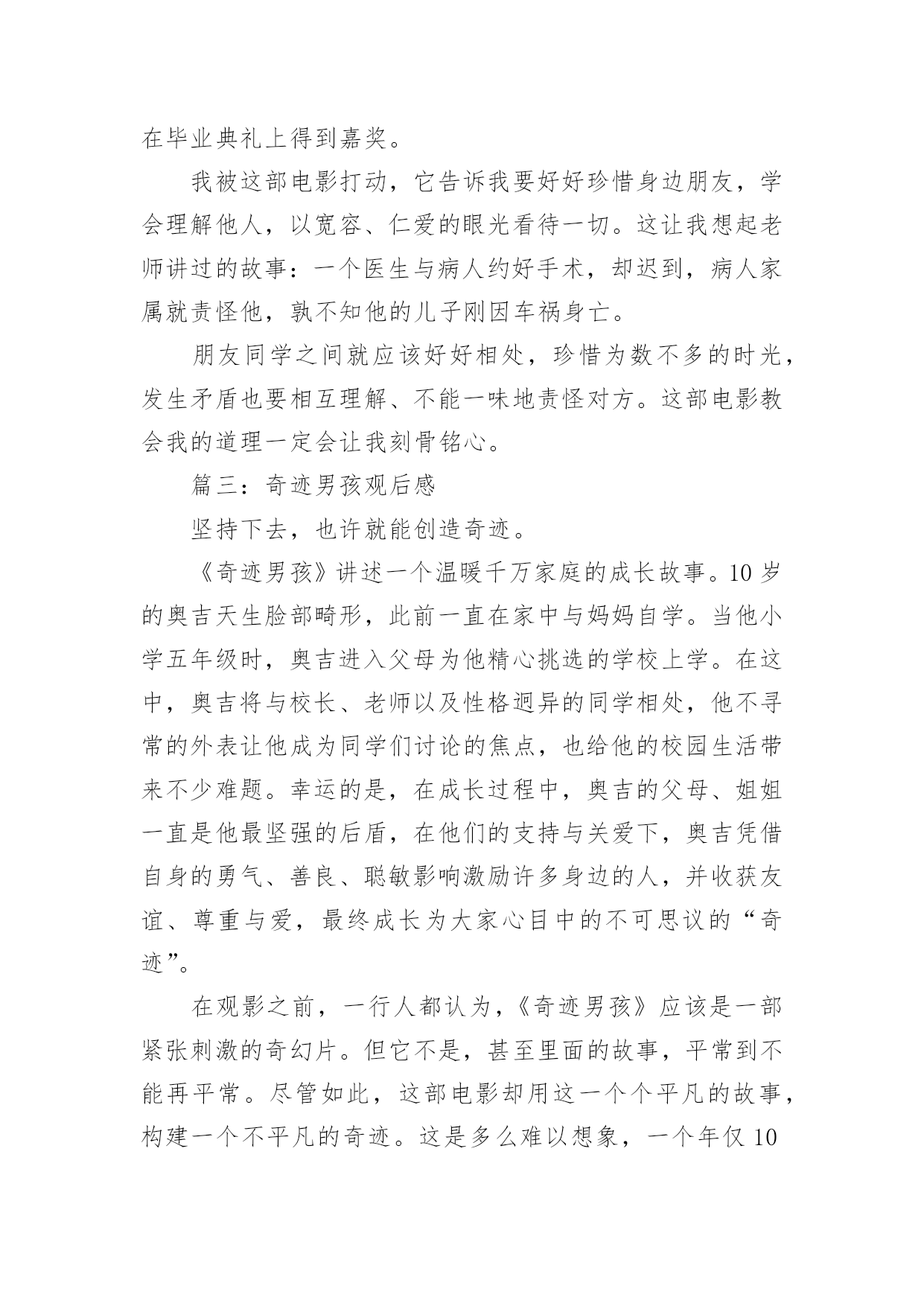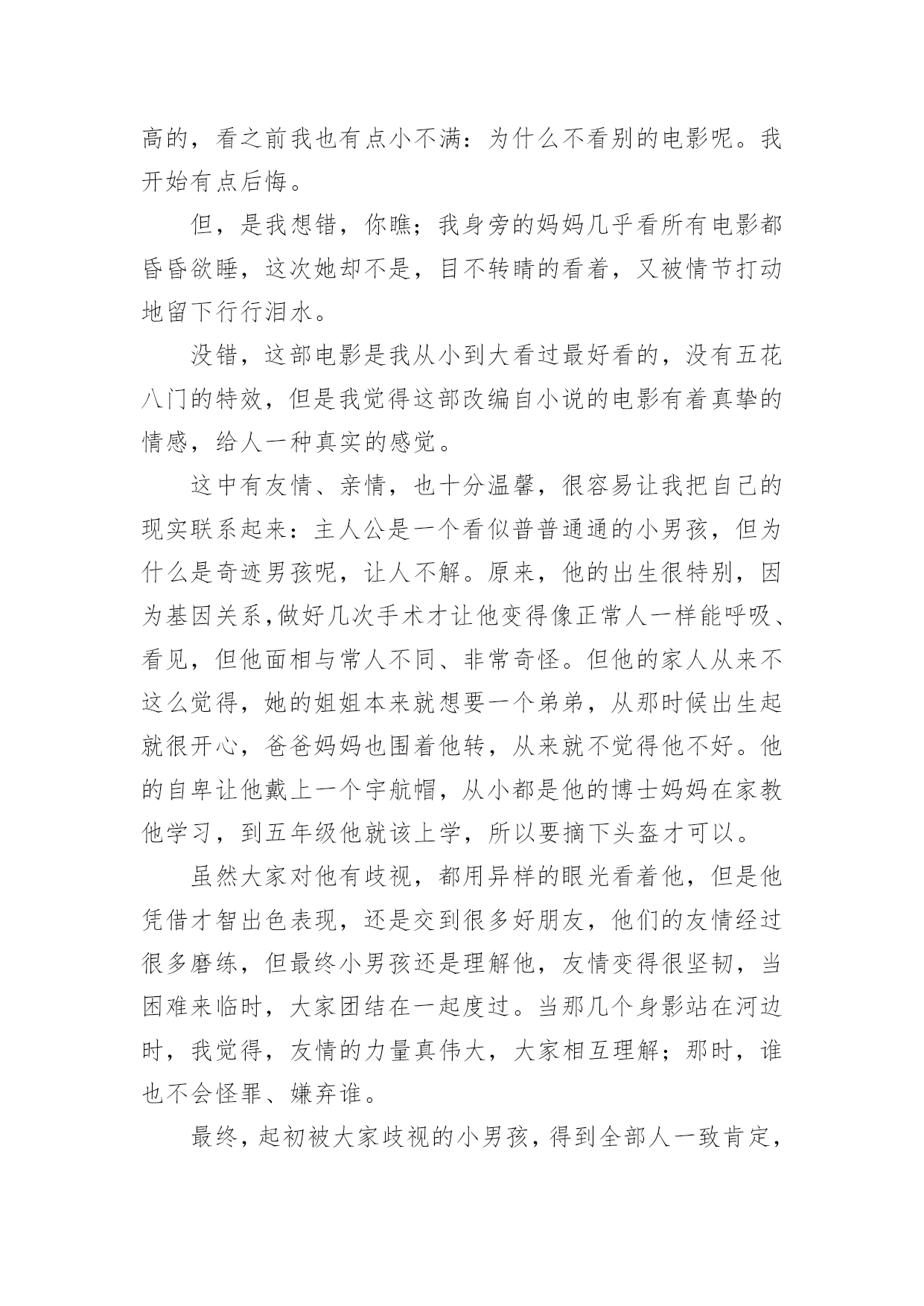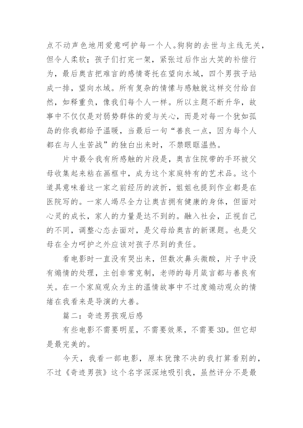 奇迹男孩观后感奇迹男孩观后感精选《奇迹男孩》是由美国狮门影业出品的家庭剧情片,讲述一位有面部缺陷的小男孩如何进入普通学校,并重拾自信、积极面对生活的励志故事。下面是小编整理的奇迹男孩观后感精选,希望对你有所帮助!篇一:奇迹男孩观后感《奇迹男孩》,一部很不错的电影,整片思想在第一堂课的名言中就提出:“在正确与善良之间选择,请选择善良”。电影《奇迹男孩》改编自全球畅销小说《奇迹》,讲述一个温暖千万家庭的成长故事。10岁的奥吉天生脸部畸形,此前一直在家中与妈妈自学。当他小学五年级时,奥吉进入父母为他精心挑选的学校上学。在这中,奥吉将与校长、老师以及性格迥异的同学相处,他不寻常的外表让他成为同学们讨论的焦点,并终日受到嘲笑与排斥,就连好不容易交到的新朋友也似乎不太值得信任。幸运的是,在成长过程中,奥吉的父母、姐姐一直是他最坚强的后盾,在他们的支持与关爱下,奥吉凭借自身的勇气、善良、聪敏影响激励许多身边的人,并收获友谊、尊重与爱,最终成长为大家心目中的不可思议的“奇迹”。没看电影之前,看到评论说电影讲“校园霸凌”、讲“对异类的包容”,但在观看过程中,我明显感觉到故事在一点点不动声色地用爱意呵护每一个人。狗狗的去世与主线无关,但令人柔软;孩子们打完一架,紧张过后作出大笑的补偿行为,最后奥吉把难言的感情寄托在望向水域,四个男孩子站成一排,望向水域。所有复杂的情愫与感触就这样交付给自然,如释重负,像我们每个人一样。所以主题不断升华,故事中不仅仅是对弱势群体的爱与关心,而是对每一个犹如孤岛的你我都给予温暖,当最后一句“善良一点,因为每个人都在与人生苦战”的独白出来时,不禁眼眶温热。片中最令我有所感触的片段是,奥吉住院带的手环被父母收集起来粘在画框中,成为这个家庭特有的艺术品。这个道具意味着这一家之前经历的波折,姐姐也提到作业都是在医院写的。一家人竭尽全力让奥吉拥有健康的身体,但面对心灵的成长,家人的力量是达不到的。融入社会,正视自己的不同,调整心态去面对,是父母给奥吉的新课题。也是父母在全力呵护之外应该对孩子尽到的责任。看电影时一直没有哭出来,但数次鼻头微酸,片子中没有煽情的处理,主创非常克制,老师的每月箴言都与善良有关。在一个家庭观众为主的温情故事中不过度煽动观众的情绪在我看来是导演的大善。篇二:奇迹男孩观后感有些电影不需要明星,不需要效果,不需要3D。但它却是最完美的。今天,我看一部电影,原本犹豫不决的我打算看别的,不过《奇迹男孩》这个名字深深地吸引我,虽然评分不是最高的,看之前我也有点小不满:为什么不看别的电影呢。我开始有点后悔。但,是我想错,你瞧;我身旁的妈妈几乎看所有电影都昏昏欲睡,这次她却不是,目不转睛的看着,又被情节打动地留下行行泪水。没错,这部电影是我从小到大看过最好看的,没有五花八门的特效,但是我觉得这部改编自小说的电影有着真挚的情感,给人一种真实的感觉。这中有友情、亲情,也十分温馨,很容易让我把自己的现实联系起来:主人公是一个看似普普通通的小男孩,但为什么是奇迹男孩呢,让人不解。原来,他的出生很特别,因为基因关系,做好几次手术才让他变得像正常人一样能呼吸、看见,但他面相与常人不同、非常奇怪。但他的家人从来不这么觉得,她的姐姐本来就想要一个弟弟,从那时候出生起就很开心,爸爸妈妈也围着他转,从来就不觉得他不好。他的自卑让他戴上一个宇航帽,从小都是他的博士妈妈在家教他学习,到五年级他就该上学,所以要摘下头盔才可以。虽然大家对他有歧视,都用异样的眼光看着他,但是他凭借才智出色表现,还是交到很多好朋友,他们的友情经过很多磨练,但最终小男孩还是理解他,友情变得很坚韧,当困难来临时,大家团结在一起度过。当那几个身影站在河边时,我觉得,友情的力量真伟大,大家相互理解;那时,谁也不会怪罪、嫌弃谁。最终,起初被大家歧视的小男孩,得到全部人一致肯定,在毕业典礼上得到嘉奖。我被这部电影打动,它告诉我要好好珍惜身边朋友,学会理解他人,以宽容、仁爱的眼光看待一切。这让我想起老师讲过的故事:一个医生与病人约好手术,却迟到,病人家属就责怪他,孰不知他的儿子刚因车祸身亡。朋友同学之间就应该好好相处,珍惜为数不多的时光,发生矛盾也要相互理解、不能一味地责怪对方。这部电影教会我的道理一定会让我刻骨铭心。篇三:奇迹男孩观后感坚持下去,也许就能创造奇迹。《奇迹男孩》讲述一个温暖千万家庭的成长故事。10岁的奥吉天生脸部畸形,此前一直在家中与妈妈自学。当他小学五年级时,奥吉进入父母为他精心挑选的学校上学。在这中,奥吉将与校长、老师以及性格迥异的同学相处,他不寻常的外表让他成为同学们讨论的焦点,也给他的校园生活带来不少难题。幸运的是,在成长过程中,奥吉的父母、姐姐一直是他最坚强的后盾,在他们的支持与关爱下,奥吉凭借自身的勇气、善良、聪敏影响激励许多身边的人,并收获友谊