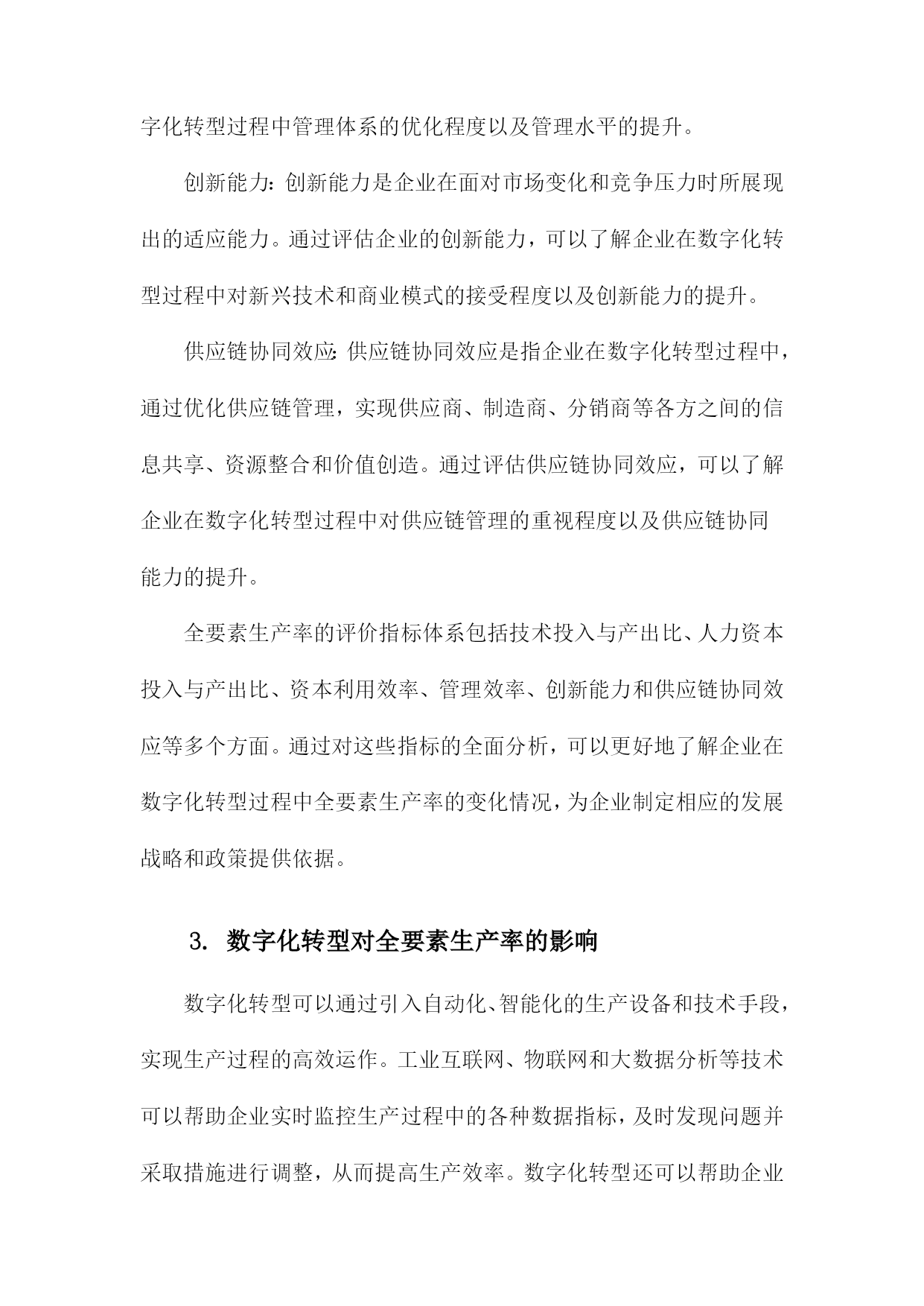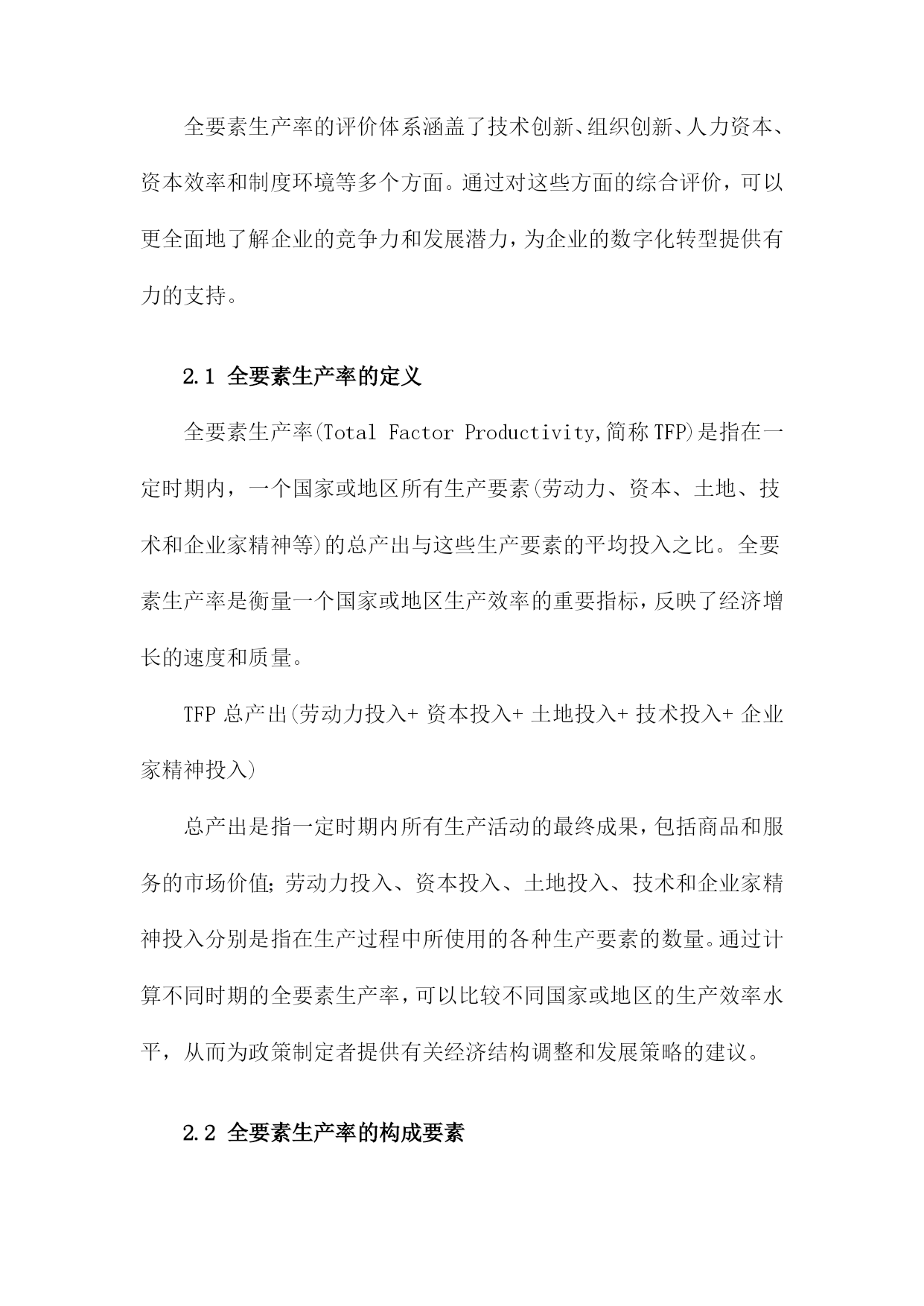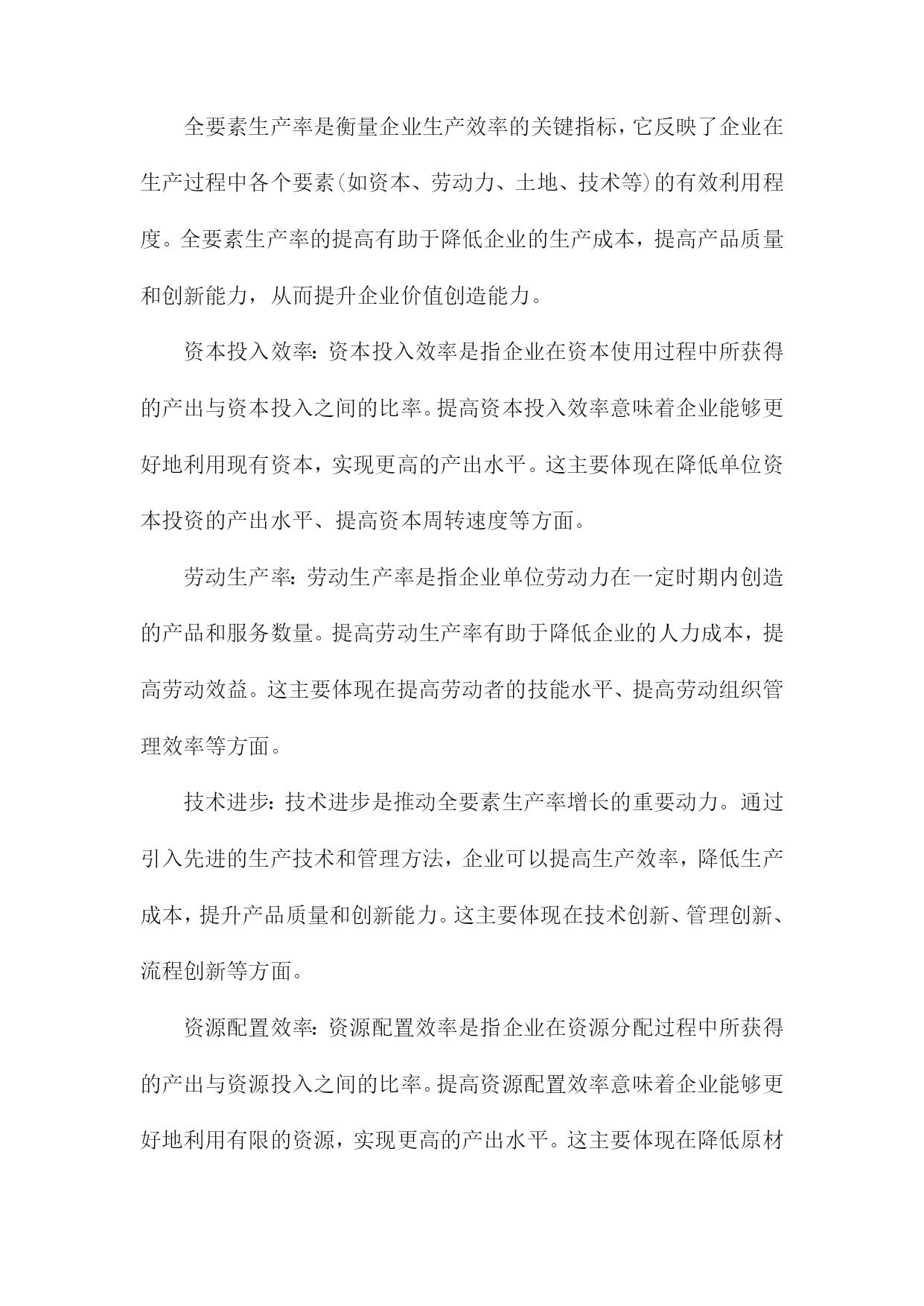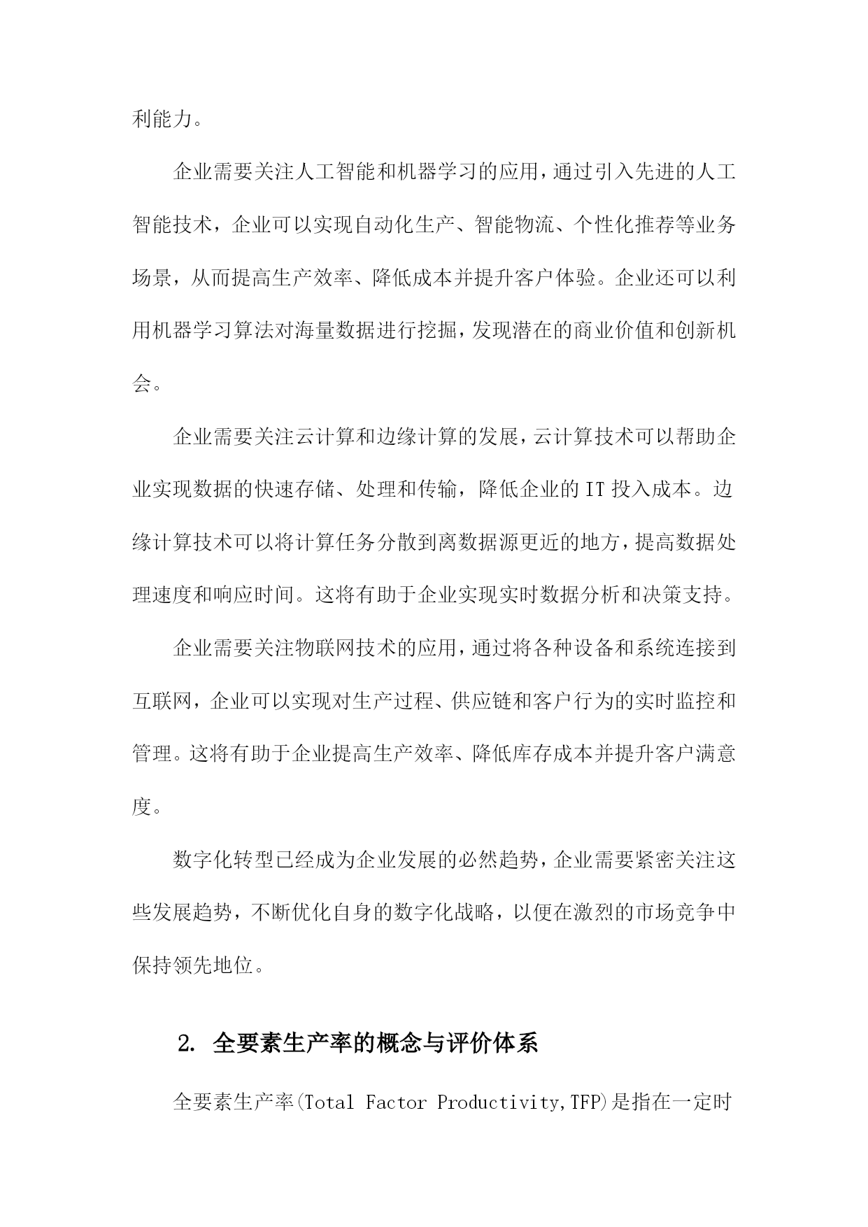 数字化转型、全要素生产率与企业价值创造1.数字化转型概述数字化转型是指企业在面对日益激烈的市场竞争和消费者需求变化的背景下,通过运用先进的数字技术和理念,对企业的生产、经营、管理等各个环节进行全面升级和优化,以提高企业的核心竞争力和价值创造能力。数字化转型不仅仅是技术的简单应用,更是一种组织、文化和战略的变革。在这个过程中,企业需要充分挖掘数据的价值,实现信息资源的高效利用,提升企业的运营效率和创新能力,从而实现可持续发展。全要素生产率(TotalFactorProductivity,TFP)是衡量一个国家或地区经济产出增长的关键指标,它综合反映了劳动力、资本、土地、技术和创新等因素对经济增长的贡献。在数字化转型过程中,企业需要关注全要素生产率的提升,通过技术创新和管理创新,实现生产要素的最优配置和协同作用,从而提高企业的经济效益和社会价值。企业价值创造是企业在市场竞争中实现盈利能力和持续发展的基础。数字化转型可以帮助企业优化产品和服务供给,提高客户满意度和忠诚度,拓展市场空间和渠道网络,降低成本和风险,增强企业的竞争优势。数字化转型还可以帮助企业更好地适应市场变化,实现快速响应和敏捷创新,从而为企业价值创造提供源源不断的动力。1.1数字化转型的定义数字化转型是指企业在面对日益激烈的市场竞争和不断变化的客户需求时,通过运用先进的数字技术,对企业的生产、经营、管理等各个环节进行全面升级和优化,以提高企业的核心竞争力和价值创造能力。数字化转型的核心是通过数据的采集、分析、挖掘和应用,实现企业内部各个部门和业务之间的高效协同,以及与外部环境的实时互动,从而实现企业的可持续发展。1.2数字化转型的意义数字化转型是指企业在面对日益激烈的市场竞争和不断变化的客户需求时,通过引入先进的数字技术和管理理念,对企业的生产、经营、组织和文化等各个方面进行全面升级和优化,以实现企业的持续创新和价值创造。在当前全球经济一体化和信息技术高速发展的背景下,数字化转型已经成为企业发展的必然选择。提高生产效率:通过引入先进的数字技术和自动化设备,企业可以实现生产过程的高度自动化和智能化,从而提高生产效率,降低生产成本,提升产品和服务的质量。优化资源配置:数字化转型可以帮助企业实现对各类资源的精确管理和高效利用,包括人力资源、物资资源、财务资源等,从而实现资源的最优配置,提高企业的竞争力。提升创新能力:数字化转型可以为企业提供强大的数据支持和分析能力,帮助企业更好地了解市场需求,预测未来趋势,从而推动企业的技术创新和产品研发,增强企业的核心竞争力。改善企业管理水平:数字化转型可以帮助企业实现管理的信息化、数字化和智能化,提高企业的管理水平和决策效率,降低企业的运营风险。促进产业升级:数字化转型可以推动整个产业链的优化升级,促进产业结构的调整和优化,提高整个产业的附加值和竞争力。提升客户满意度:数字化转型可以使企业更好地满足客户的需求,提供个性化、智能化的产品和服务,从而提升客户的满意度和忠诚度。增强企业的社会责任感:数字化转型可以帮助企业实现绿色发展、可持续发展,关注环境保护和社会公益事业,提升企业的社会责任意识和形象。1.3数字化转型的发展趋势企业需要关注数据驱动的决策制定,通过对大量数据的收集、分析和挖掘,企业可以更好地了解市场趋势、客户需求和内部运营状况,从而做出更加精确和高效的决策。这将有助于提高企业的竞争力和盈利能力。企业需要关注人工智能和机器学习的应用,通过引入先进的人工智能技术,企业可以实现自动化生产、智能物流、个性化推荐等业务场景,从而提高生产效率、降低成本并提升客户体验。企业还可以利用机器学习算法对海量数据进行挖掘,发现潜在的商业价值和创新机会。企业需要关注云计算和边缘计算的发展,云计算技术可以帮助企业实现数据的快速存储、处理和传输,降低企业的IT投入成本。边缘计算技术可以将计算任务分散到离数据源更近的地方,提高数据处理速度和响应时间。这将有助于企业实现实时数据分析和决策支持。企业需要关注物联网技术的应用,通过将各种设备和系统连接到互联网,企业可以实现对生产过程、供应链和客户行为的实时监控和管理。这将有助于企业提高生产效率、降低库存成本并提升客户满意度。数字化转型已经成为企业发展的必然趋势,企业需要紧密关注这些发展趋势,不断优化自身的数字化战略,以便在激烈的市场竞争中保持领先地位。2.全要素生产率的概念与评价体系全要素生产率(TotalFactorProductivity,TFP)是指在一定时期内,企业通过技术进步、组织创新和资本效率等各个方面的改进,使得生产要素(如劳动力、资本、土地、企业家才能等)的产出增加超过其投入增加的水平。全要素生产率是衡量一个国家或地区经济增长潜力的重要指标,也是评价企