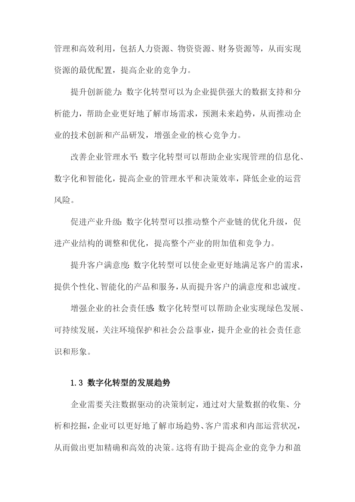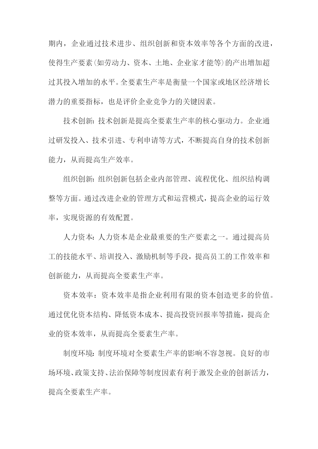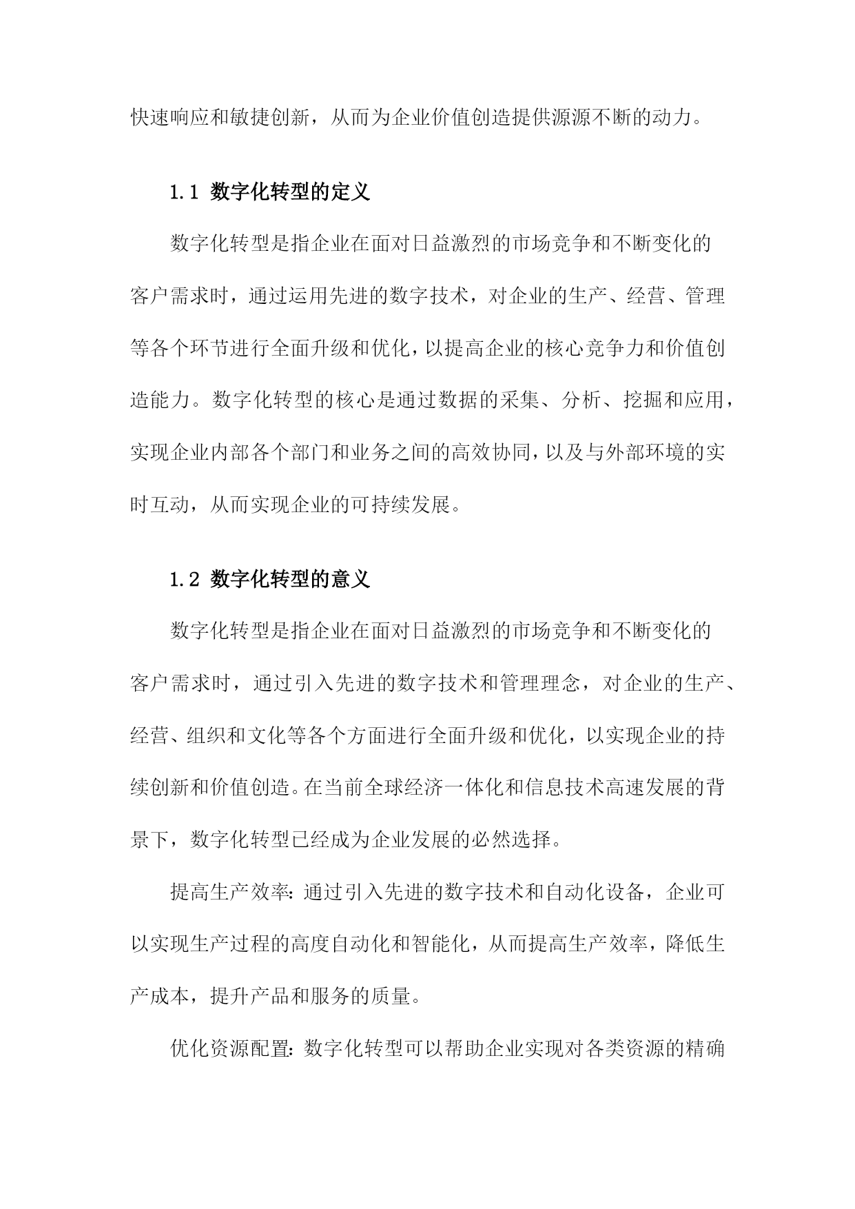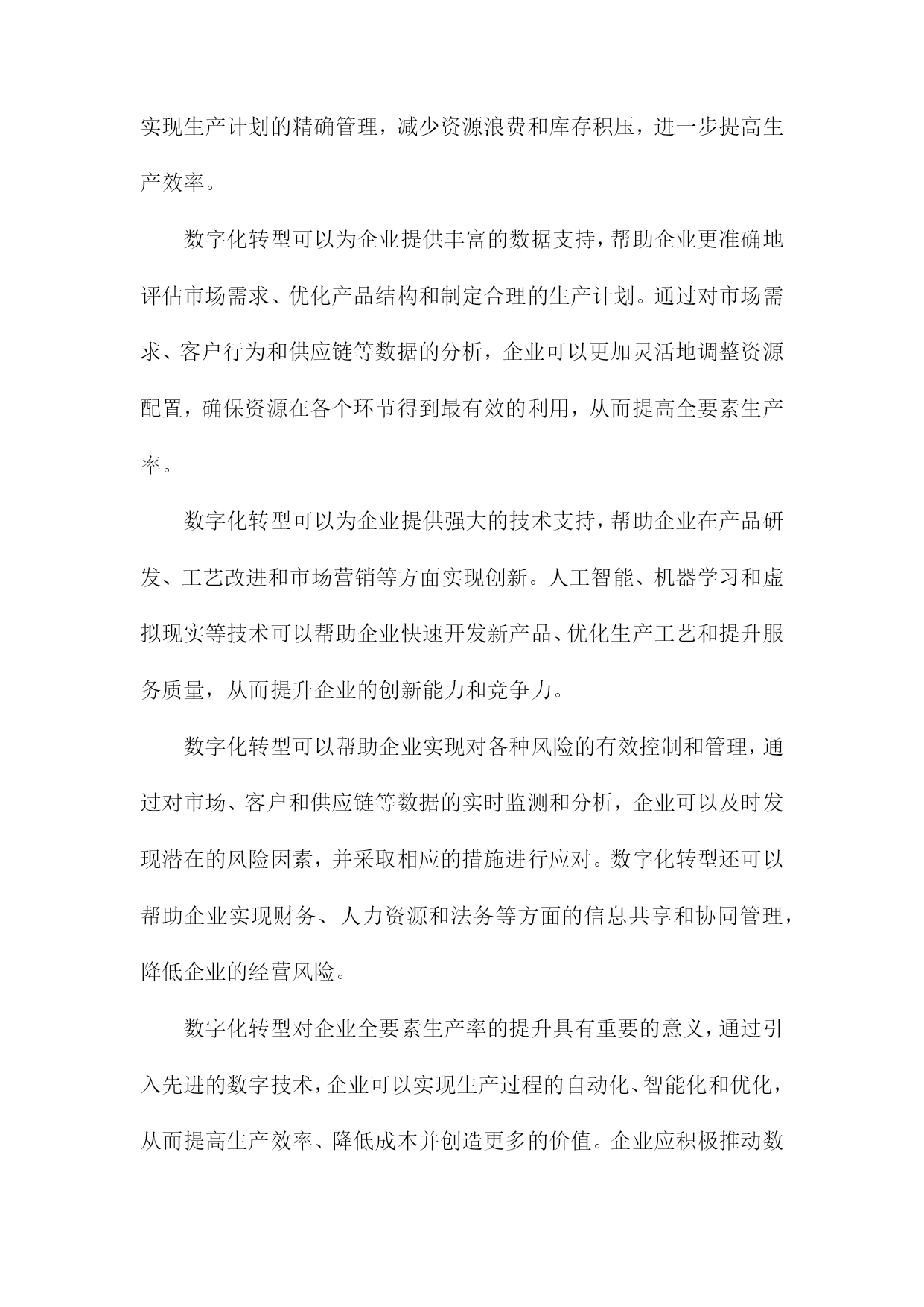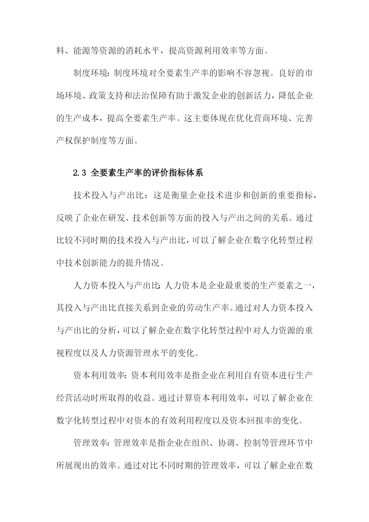 数字化转型、全要素生产率与企业价值创造1.数字化转型概述数字化转型是指企业在面对日益激烈的市场竞争和消费者需求变化的背景下,通过运用先进的数字技术和理念,对企业的生产、经营、管理等各个环节进行全面升级和优化,以提高企业的核心竞争力和价值创造能力。数字化转型不仅仅是技术的简单应用,更是一种组织、文化和战略的变革。在这个过程中,企业需要充分挖掘数据的价值,实现信息资源的高效利用,提升企业的运营效率和创新能力,从而实现可持续发展。全要素生产率(TotalFactorProductivity,TFP)是衡量一个国家或地区经济产出增长的关键指标,它综合反映了劳动力、资本、土地、技术和创新等因素对经济增长的贡献。在数字化转型过程中,企业需要关注全要素生产率的提升,通过技术创新和管理创新,实现生产要素的最优配置和协同作用,从而提高企业的经济效益和社会价值。企业价值创造是企业在市场竞争中实现盈利能力和持续发展的基础。数字化转型可以帮助企业优化产品和服务供给,提高客户满意度和忠诚度,拓展市场空间和渠道网络,降低成本和风险,增强企业的竞争优势。数字化转型还可以帮助企业更好地适应市场变化,实现快速响应和敏捷创新,从而为企业价值创造提供源源不断的动力。1.1数字化转型的定义数字化转型是指企业在面对日益激烈的市场竞争和不断变化的客户需求时,通过运用先进的数字技术,对企业的生产、经营、管理等各个环节进行全面升级和优化,以提高企业的核心竞争力和价值创造能力。数字化转型的核心是通过数据的采集、分析、挖掘和应用,实现企业内部各个部门和业务之间的高效协同,以及与外部环境的实时互动,从而实现企业的可持续发展。1.2数字化转型的意义数字化转型是指企业在面对日益激烈的市场竞争和不断变化的客户需求时,通过引入先进的数字技术和管理理念,对企业的生产、经营、组织和文化等各个方面进行全面升级和优化,以实现企业的持续创新和价值创造。在当前全球经济一体化和信息技术高速发展的背景下,数字化转型已经成为企业发展的必然选择。提高生产效率:通过引入先进的数字技术和自动化设备,企业可以实现生产过程的高度自动化和智能化,从而提高生产效率,降低生产成本,提升产品和服务的质量。优化资源配置:数字化转型可以帮助企业实现对各类资源的精确管理和高效利用,包括人力资源、物资资源、财务资源等,从而实现资源的最优配置,提高企业的竞争力。提升创新能力:数字化转型可以为企业提供强大的数据支持和分析能力,帮助企业更好地了解市场需求,预测未来趋势,从而推动企业的技术创新和产品研发,增强企业的核心竞争力。改善企业管理水平:数字化转型可以帮助企业实现管理的信息化、数字化和智能化,提高企业的管理水平和决策效率,降低企业的运营风险。促进产业升级:数字化转型可以推动整个产业链的优化升级,促进产业结构的调整和优化,提高整个产业的附加值和竞争力。提升客户满意度:数字化转型可以使企业更好地满足客户的需求,提供个性化、智能化的产品和服务,从而提升客户的满意度和忠诚度。增强企业的社会责任感:数字化转型可以帮助企业实现绿色发展、可持续发展,关注环境保护和社会公益事业,提升企业的社会责任意识和形象。1.3数字化转型的发展趋势企业需要关注数据驱动的决策制定,通过对大量数据的收集、分析和挖掘,企业可以更好地了解市场趋势、客户需求和内部运营状况,从而做出更加精确和高效的决策。这将有助于提高企业的竞争力和盈利能力。企业需要关注人工智能和机器学习的应用,通过引入先进的人工智能技术,企业可以实现自动化生产、智能物流、个性化推荐等业务场景,从而提高生产效率、降低成本并提升客户体验。企业还可以利用机器学习算法对海量数据进行挖掘,发现潜在的商业价值和创新机会。企业需要关注云计算和边缘计算的发展,云计算技术可以帮助企业实现数据的快速存储、处理和传输,降低企业的IT投入成本。边缘计算技术可以将计算任务分散到离数据源更近的地方,提高数据处理速度和响应时间。这将有助于企业实现实时数据分析和决策支持。企业需要关注物联网技术的应用,通过将各种设备和系统连接到互联网,企业可以实现对生产过程、供应链和客户行为的实时监控和管理。这将有助于企业提高生产效率、降低库存成本并提升客户满意度。数字化转型已经成为企业发展的必然趋势,企业需要紧密关注这些发展趋势,不断优化自身的数字化战略,以便在激烈的市场竞争中保持领先地位。2.全要素生产率的概念与评价体系全要素生产率(TotalFactorProductivity,TFP)是指在一定时期内,企业通过技术进步、组织创新和资本效率等各个方面的改进,使得生产要素(如劳动力、资本、土地、企业家才能等)的产出增加超过其投入增加的水平。全要素生产率是衡量一个国家或地区经济增长潜力的重要指标,也是评价企