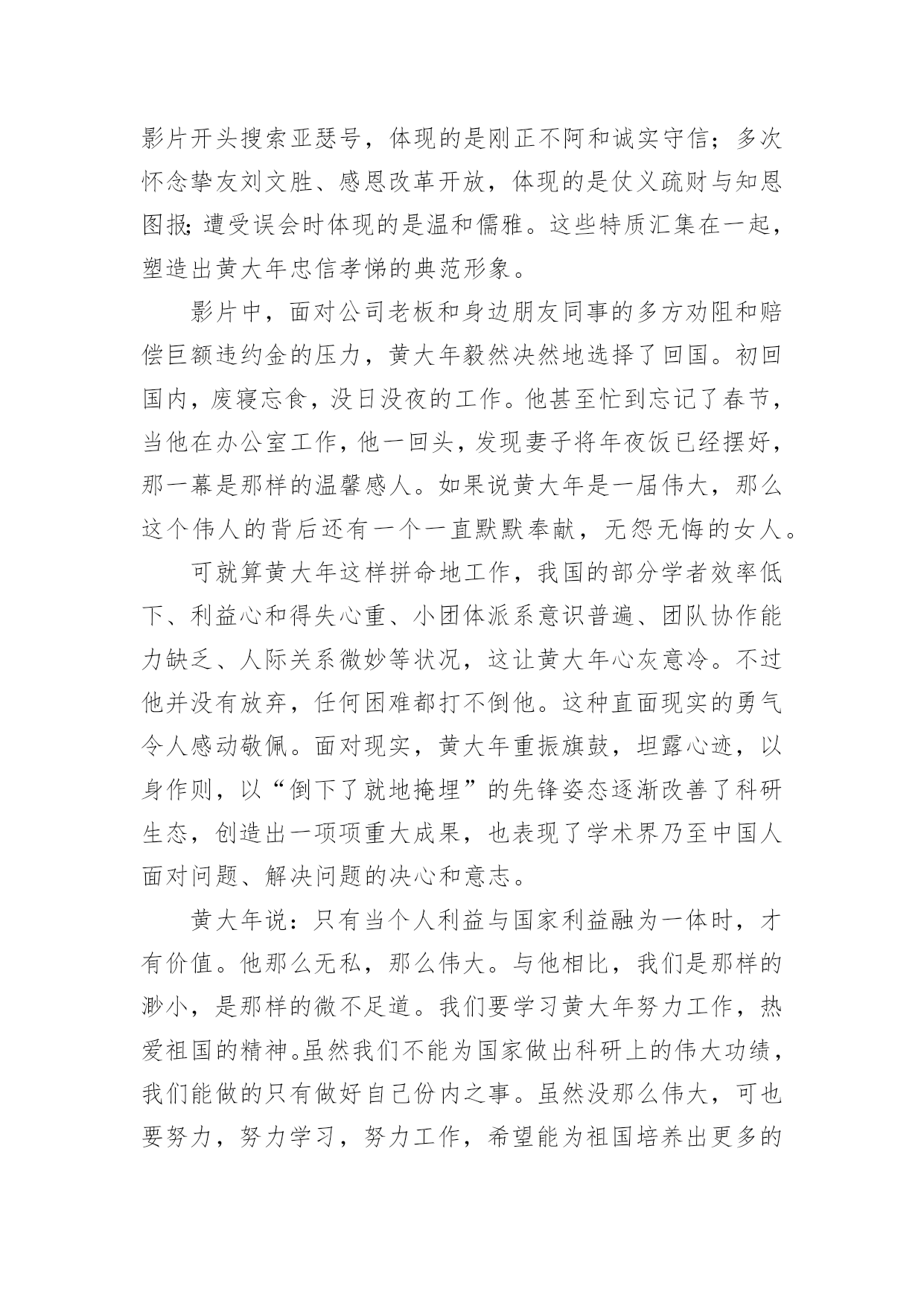 《黄大年》观后感《黄大年》观后感范文观看一部优秀作品之后,我们会受益匪浅,大家一定收获不少吧,让我们好好写份观后感,把你的收获感想写下来吧。快来参考观后感是怎么写的吧,下面是小编为大家收集的《黄大年》观后感范文,欢迎阅读与收藏。今天下午,学校组织我们看了《黄大年》这部电影,心里激荡着丰富情感,脑海里回想着很多句,比如法国科学家巴斯德的话“科学没有国界,科学家却有祖国”,以及中国人常说的“鞠躬尽瘁,死而后已”。黄大年的形象让人联想到20世纪四五十年代归国的科学家钱学森、邓稼先。黄大年也是当之无愧的大师。片中,x大学校长对黄大年阐释他何以成为第一个东北引进人才的理由时如是说:“你的归国能使外国舰队在中国的海岸线后撤一百多海里”。可见,黄大年的学术成就获得了从上到下的一致认可,这恰好呼应了当年美国军方对钱学森的评价——走到哪里都能抵得上五个师的兵力。黄大年海外游学、任教、搞科研多年,他身上的“世界性”已浸入骨髓,这些内容在影片中表现为其流利的英语交流、优雅的绅士做派、娴熟的大提琴技能以及默默支持街边的流浪歌手等细节之处。然而,他又是“最中国的”:比如影片开头搜索亚瑟号,体现的是刚正不阿和诚实守信;多次怀念挚友刘文胜、感恩改革开放,体现的是仗义疏财与知恩图报;遭受误会时体现的是温和儒雅。这些特质汇集在一起,塑造出黄大年忠信孝悌的典范形象。影片中,面对公司老板和身边朋友同事的多方劝阻和赔偿巨额违约金的压力,黄大年毅然决然地选择了回国。初回国内,废寝忘食,没日没夜的工作。他甚至忙到忘记了春节,当他在办公室工作,他一回头,发现妻子将年夜饭已经摆好,那一幕是那样的温馨感人。如果说黄大年是一届伟大,那么这个伟人的背后还有一个一直默默奉献,无怨无悔的女人。可就算黄大年这样拼命地工作,我国的部分学者效率低下、利益心和得失心重、小团体派系意识普遍、团队协作能力缺乏、人际关系微妙等状况,这让黄大年心灰意冷。不过他并没有放弃,任何困难都打不倒他。这种直面现实的勇气令人感动敬佩。面对现实,黄大年重振旗鼓,坦露心迹,以身作则,以“倒下了就地掩埋”的先锋姿态逐渐改善了科研生态,创造出一项项重大成果,也表现了学术界乃至中国人面对问题、解决问题的决心和意志。黄大年说:只有当个人利益与国家利益融为一体时,才有价值。他那么无私,那么伟大。与他相比,我们是那样的渺小,是那样的微不足道。我们要学习黄大年努力工作,热爱祖国的精神。虽然我们不能为国家做出科研上的伟大功绩,我们能做的只有做好自己份内之事。虽然没那么伟大,可也要努力,努力学习,努力工作,希望能为祖国培养出更多的国之栋梁。来日为祖国争光。我们也要教育孩子们:振兴中华,乃我辈之责!这部作品当成一部改变千万人命运、带领人类向前的英雄电影,也可以当成一部浓缩了近半个世纪的历史题材电影,更可以当成一部传达知识分子精神的传记电影,因为这是一部有灵魂的作品。