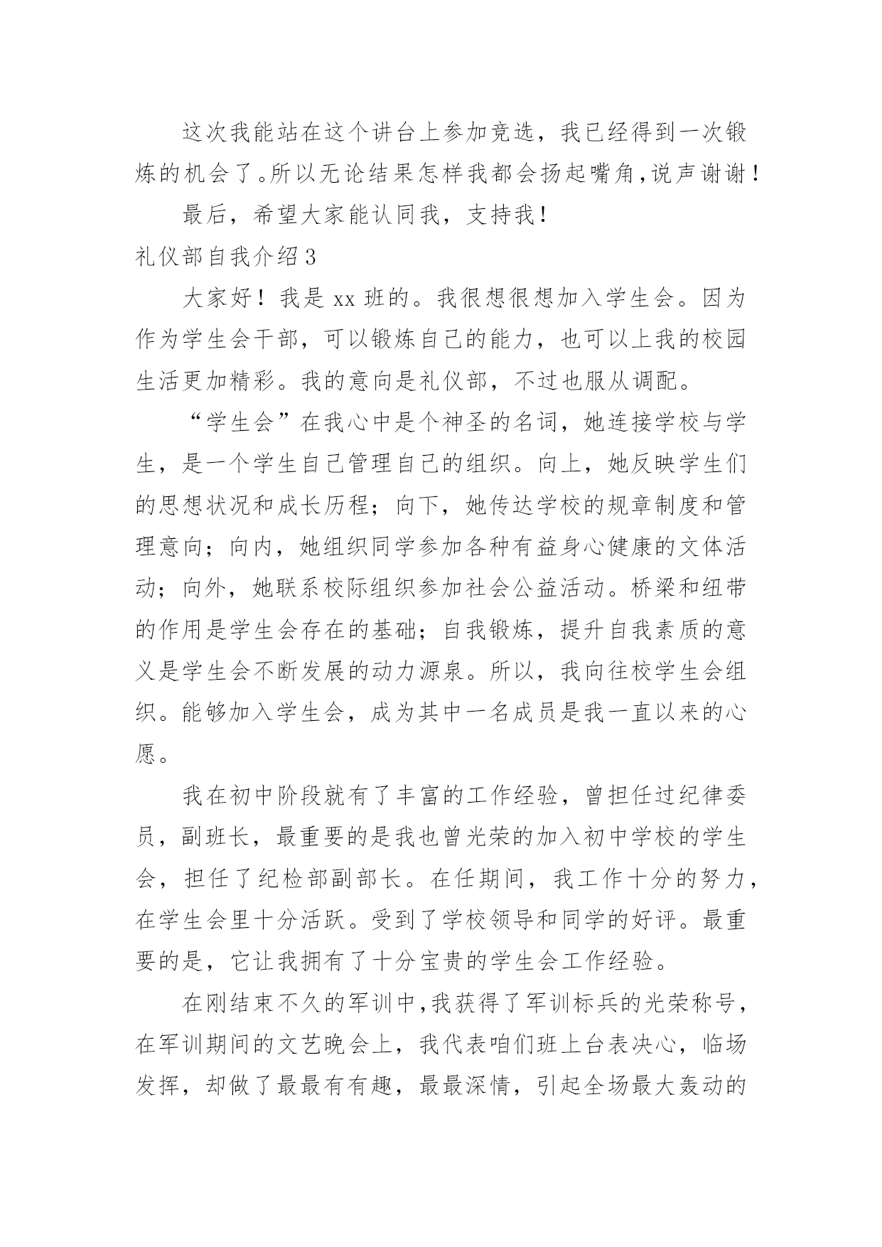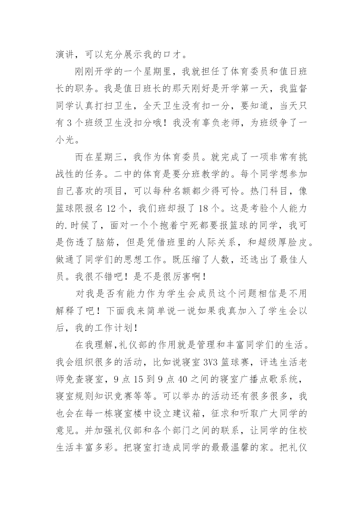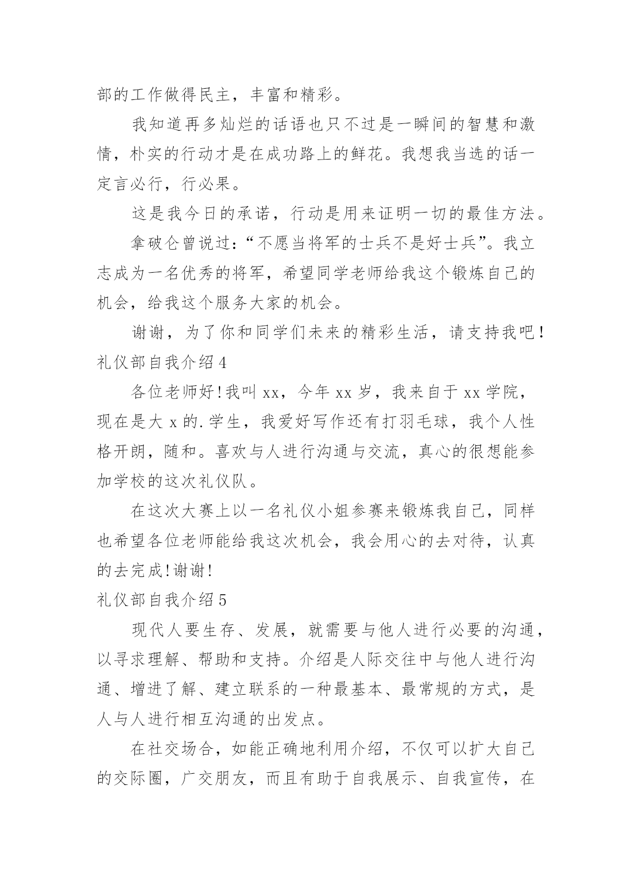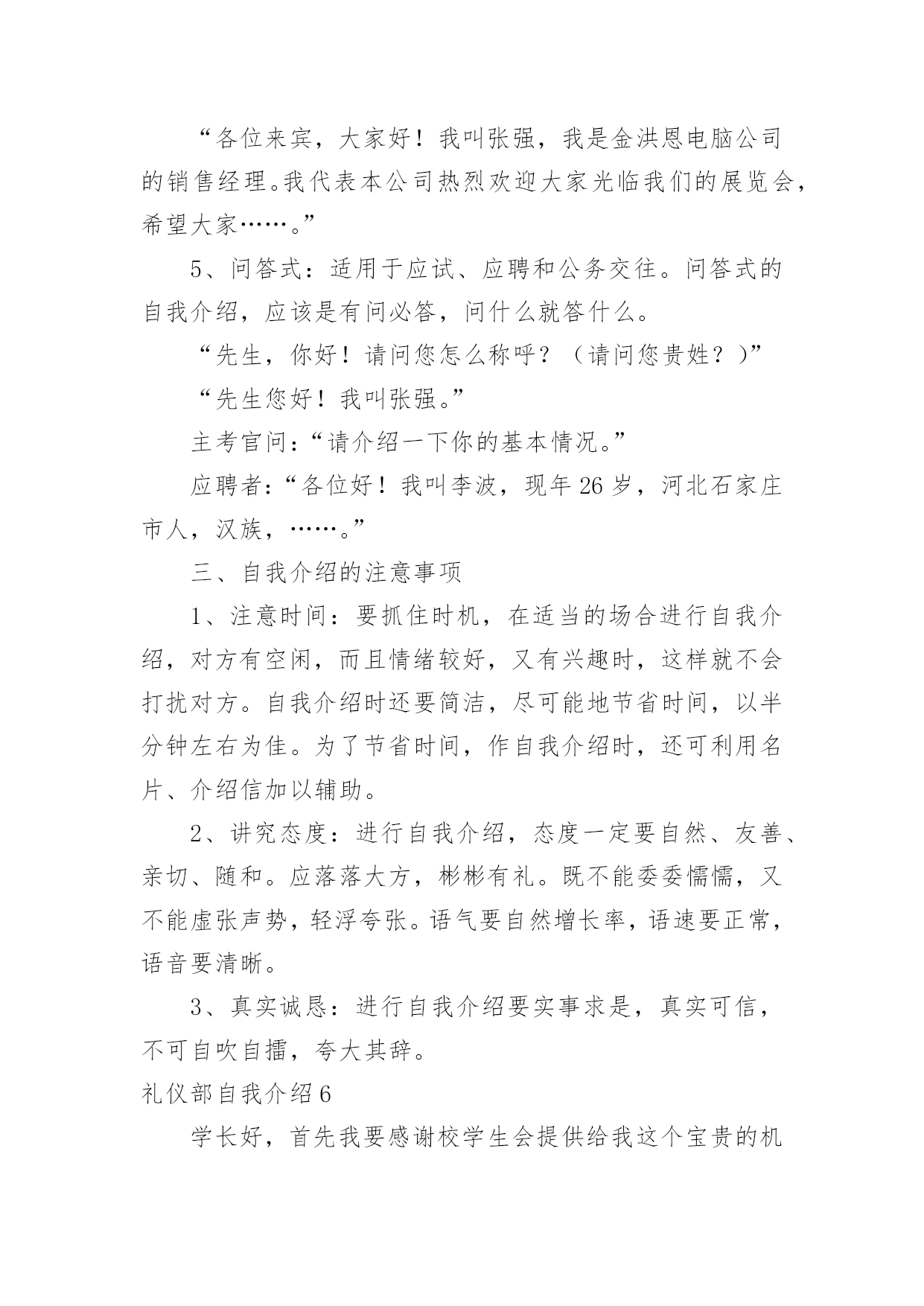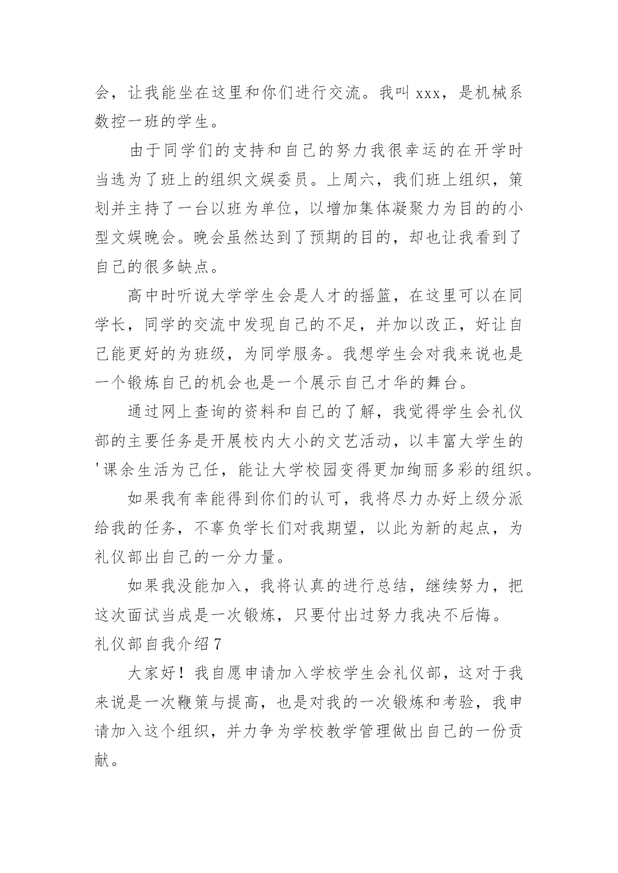 礼仪部自我介绍礼仪部自我介绍当去到一个新环境下,我们总归要向他人介绍自己,自我介绍可以唤起他人对我们的兴趣。那么自我介绍要注意有什么内容呢?以下是小编整理的礼仪部自我介绍,希望能够帮助到大家。礼仪部自我介绍1尊敬的各位评委老师、各位观众:你们好!一个自信的性格,一个放松的状态,以及一种让人亲近的感觉,这就是我,来自xxx,我毕业于xxx表演专业。我是一个非常乐观的x孩,最大的特质就是执着,只要是我所选择的事情,我所选择礼仪小姐的道路,我都会非常坚定的走下去。我喜欢挑战自我,喜欢在强手之中找到自己的位置,如果胜利我会嫣然一笑,如果失败我会得到更大的动力,争取更大的成功。我看过一本书,书上说:机遇对每个人都是平等的。但成功只给有准备的人。而这个准备,就是一个自我提高、自我完善的.过程。只要你你为自己选择的目标去奋斗了,你的生活就会充满快乐。今天,能不能得上奖并不重要,重要的是我给了自己一次展示自我、认识自我、锻炼自我的机会,也给我一次向大家学习、提高自我的机会。电视是一扇窗,当你打开着扇窗时,你我之间就开始了真诚的交流,主持对我来说是一个无限广阔的魅力空间,我心甘愿为他付出,为他去奉献。谢谢评委老师,谢谢大家,更谢谢值得尊敬的对手。今天能站在这个舞台上讲这些话,我就战胜了自已,我可以告诉自已,我赢了。谢谢!礼仪部自我介绍2大家好!我叫XXX,来是xx班的学生。我的爱好是XXXXXX。很高兴能站在这个讲台上参加礼仪部学生会竞选。此时我的心里也很紧张。首先我想说我很适合加入学生会,因为有人说,从事一件事的原动力是热情,唯有热情是从内心迸发出来的力量,可以驱动你去触摸自己的.理想。而我就有这样的一份热情,对的喜欢,所以我认为我很适合成为学生会这个大家庭的一员。当然,仅仅有热情是远远不够的。还要有在学习和工作上的能力。我不敢说我有什么样的能力,但在以后的学习和工作中我一定会让大家知道,我能行。在生活中我是一个活泼开朗的人。而我之所以要加入学生会,是因为我认为学生会是一个可以更好的锻炼我的人际交往能力和工作能力的地方。这次我能站在这个讲台上参加竞选,我已经得到一次锻炼的机会了。所以无论结果怎样我都会扬起嘴角,说声谢谢!最后,希望大家能认同我,支持我!礼仪部自我介绍3大家好!我是xx班的。我很想很想加入学生会。因为作为学生会干部,可以锻炼自己的能力,也可以上我的校园生活更加精彩。我的意向是礼仪部,不过也服从调配。“学生会”在我心中是个神圣的名词,她连接学校与学生,是一个学生自己管理自己的组织。向上,她反映学生们的思想状况和成长历程;向下,她传达学校的规章制度和管理意向;向内,她组织同学参加各种有益身心健康的文体活动;向外,她联系校际组织参加社会公益活动。桥梁和纽带的作用是学生会存在的基础;自我锻炼,提升自我素质的意义是学生会不断发展的动力源泉。所以,我向往校学生会组织。能够加入学生会,成为其中一名成员是我一直以来的心愿。我在初中阶段就有了丰富的工作经验,曾担任过纪律委员,副班长,最重要的是我也曾光荣的加入初中学校的学生会,担任了纪检部副部长。在任期间,我工作十分的努力,在学生会里十分活跃。受到了学校领导和同学的好评。最重要的是,它让我拥有了十分宝贵的学生会工作经验。在刚结束不久的军训中,我获得了军训标兵的光荣称号,在军训期间的文艺晚会上,我代表咱们班上台表决心,临场发挥,却做了最最有有趣,最最深情,引起全场最大轰动的演讲,可以充分展示我的口才。刚刚开学的一个星期里,我就担任了体育委员和值日班长的职务。我是值日班长的那天刚好是开学第一天,我监督同学认真打扫卫生,全天卫生没有扣一分,要知道,当天只有3个班级卫生没扣分哦!我没有辜负老师,为班级争了一小光。而在星期三,我作为体育委员。就完成了一项非常有挑战性的任务。二中的体育是要分班教学的。每个同学想参加自己喜欢的项目,可以每种名额都少得可怜。热门科目,像篮球限报名12个,我们班却报了18个。这是考验个人能力的.时候了,面对一个个抱着宁死都要报篮球的同学,我可是伤透了脑筋,但是凭借班里的人际关系,和超级厚脸皮。做通了同学们的思想工作。既压缩了人数,还选出了最佳人员。我很不错吧!是不是很厉害啊!对我是否有能力作为学生会成员这个问题相信是不用解释了吧!下面我来简单说一说如果我真加入了学生会以后,我的工作计划!在我理解,礼仪部的作用就是管理和丰富同学们的生活。我会组织很多的活动,比如说寝室3V3篮球赛,评选生活老师免查寝室,9点15到9点40之间的寝室广播点歌系统,寝室规则知识竞赛等等。可以举办的活动还有很多很多,我也会在每一栋寝室楼中设立建议箱,征求和听取广大同学的意见。并加强礼仪部和各个部门之间的联系,让同学的住校生活丰富多彩。把寝室打造成同学的最最温馨的家。把礼仪部的工作做得民主,丰富和精彩。我