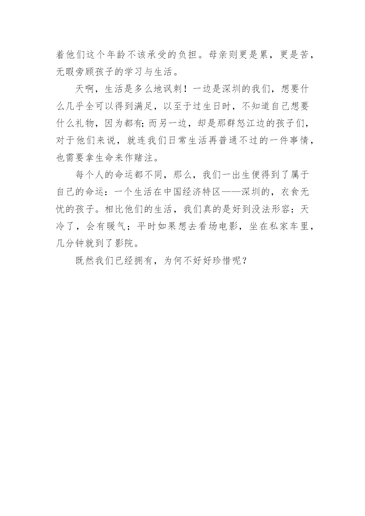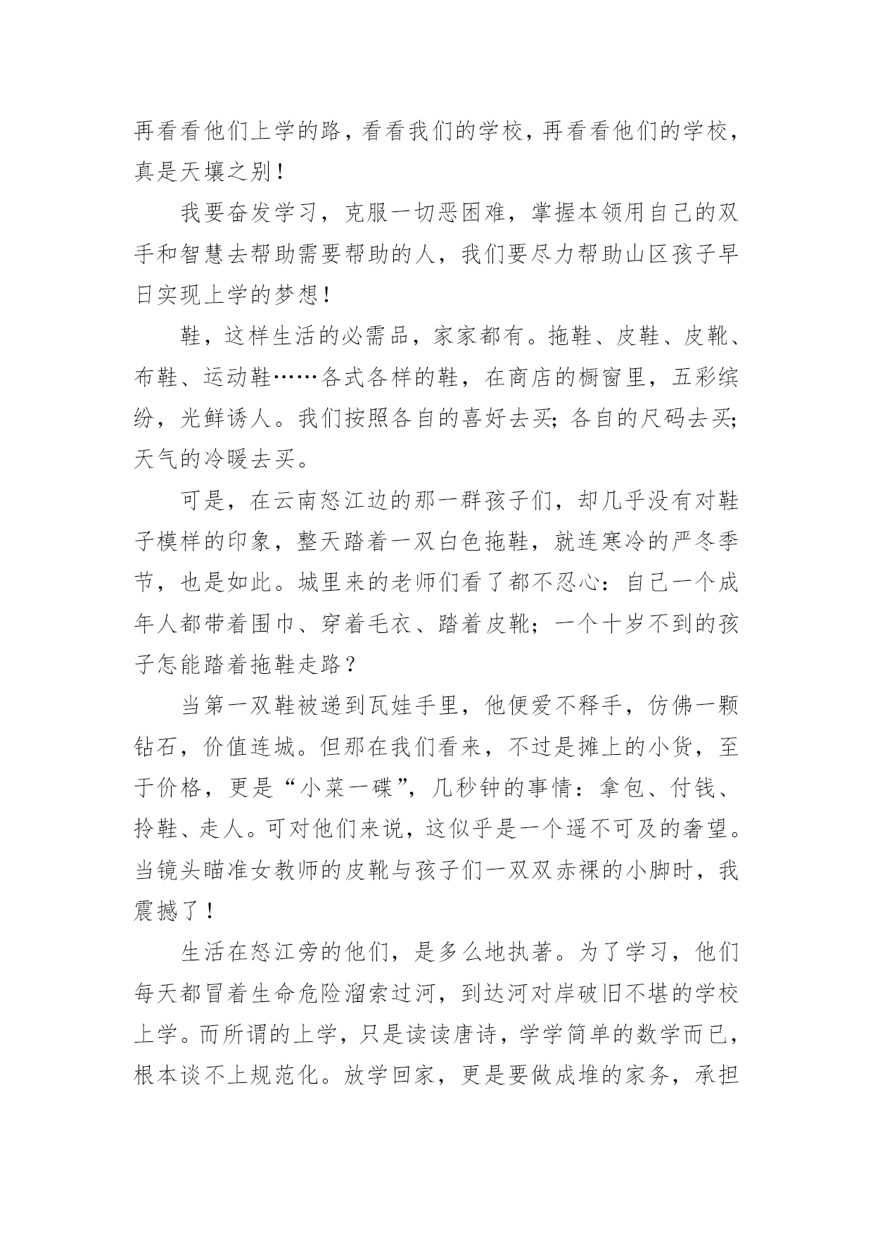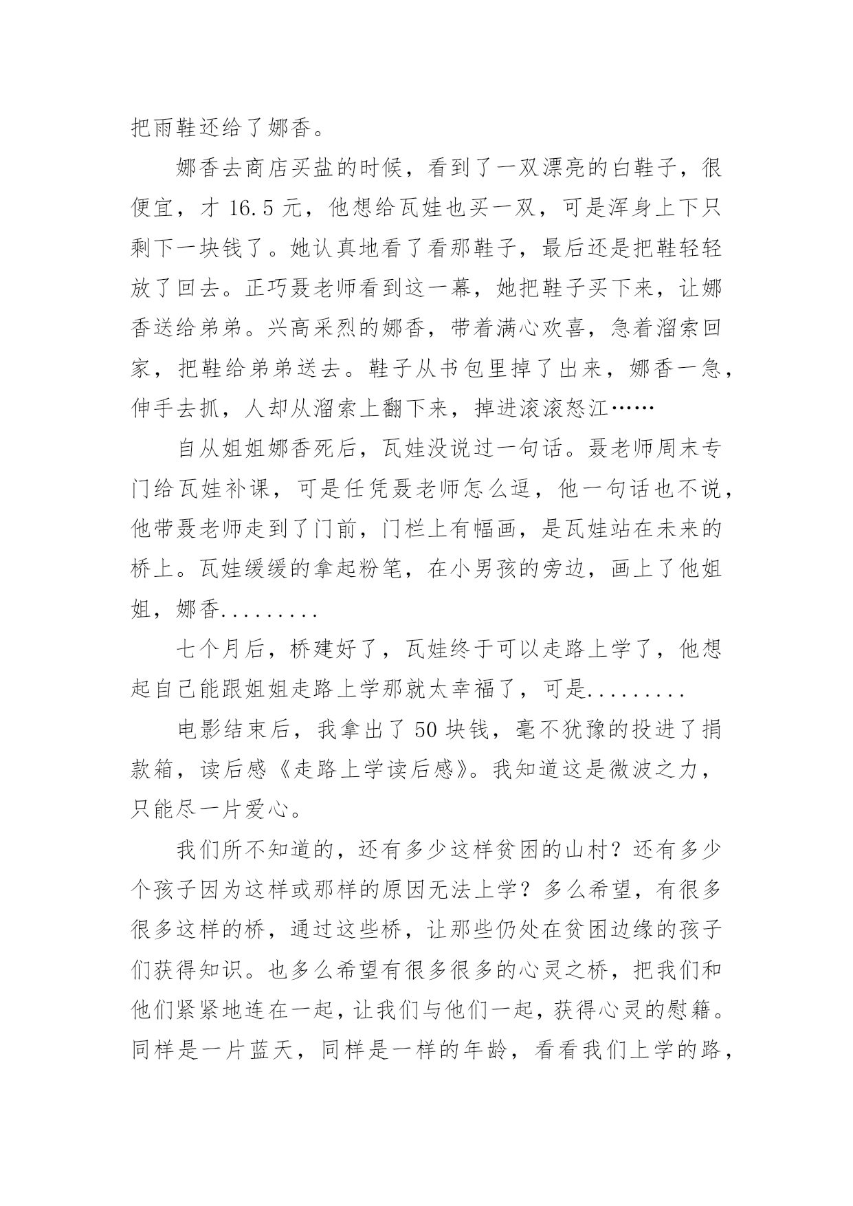上学路上观后感当观看作品时,我们会沉浸在情节之中,从中我们收获新的思想,在写观后感时,需要有自己独特的视角和思考立场。到底应如何写观后感呢?以下是小编精心整理的上学路上观后感,供大家参考借鉴,希望可以帮助到有需要的朋友。周末虽然阳光明媚,但是我的心情却格外沉重,因为我看了一部电影《走路上学》,走路上学读后感。这部电影很感人,女主角娜香和男主角瓦娃,虽然和我们一样的年龄,但他们为了上学,冒着生命危险溜索过江。瓦娃是娜香的弟弟,因为妈妈陪姐姐溜索时差点落入江中,不准再让瓦娃溜索。但他很想去姐姐的学校看看,就趁妈妈出去干活的时候把溜索用的工具拿出来,他顺利的过了江,找到了那座学校,老师正在讲课,瓦娃就趴在窗口听。看到这时,我觉得我们真的很幸福,傈僳族的孩子是多么的渴望上学呀!聂老师很同情这些山区里的孩子,看到同学们大冬天穿着拖鞋上学,就用尺子量了每个同学的脚,叫城里的人们按照尺寸给每个人买了一双合脚的雨鞋。还特地到每个同学家里送鞋子。来到娜香家里时,认出了瓦娃,娜香的妈妈气得拿着鸡毛掸子冲着瓦娃就打。聂老师拦着她妈妈瓦娃才免了一顿打。他很喜欢聂老师送给娜香的红雨鞋,并答应有了红雨鞋之后不再溜索。娜香就答应他了。不过,第二天,他又把雨鞋还给了娜香。娜香去商店买盐的时候,看到了一双漂亮的白鞋子,很便宜,才16.5元,他想给瓦娃也买一双,可是浑身上下只剩下一块钱了。她认真地看了看那鞋子,最后还是把鞋轻轻放了回去。正巧聂老师看到这一幕,她把鞋子买下来,让娜香送给弟弟。兴高采烈的娜香,带着满心欢喜,急着溜索回家,把鞋给弟弟送去。鞋子从书包里掉了出来,娜香一急,伸手去抓,人却从溜索上翻下来,掉进滚滚怒江……自从姐姐娜香死后,瓦娃没说过一句话。聂老师周末专门给瓦娃补课,可是任凭聂老师怎么逗,他一句话也不说,他带聂老师走到了门前,门栏上有幅画,是瓦娃站在未来的桥上。瓦娃缓缓的拿起粉笔,在小男孩的旁边,画上了他姐姐,娜香.........七个月后,桥建好了,瓦娃终于可以走路上学了,他想起自己能跟姐姐走路上学那就太幸福了,可是.........电影结束后,我拿出了50块钱,毫不犹豫的投进了捐款箱,读后感《走路上学读后感》。我知道这是微波之力,只能尽一片爱心。我们所不知道的,还有多少这样贫困的山村?还有多少个孩子因为这样或那样的原因无法上学?多么希望,有很多很多这样的桥,通过这些桥,让那些仍处在贫困边缘的孩子们获得知识。也多么希望有很多很多的心灵之桥,把我们和他们紧紧地连在一起,让我们与他们一起,获得心灵的慰籍。同样是一片蓝天,同样是一样的年龄,看看我们上学的路,再看看他们上学的路,看看我们的学校,再看看他们的学校,真是天壤之别!我要奋发学习,克服一切恶困难,掌握本领用自己的双手和智慧去帮助需要帮助的人,我们要尽力帮助山区孩子早日实现上学的梦想!鞋,这样生活的必需品,家家都有。拖鞋、皮鞋、皮靴、布鞋、运动鞋……各式各样的鞋,在商店的橱窗里,五彩缤纷,光鲜诱人。我们按照各自的喜好去买;各自的尺码去买;天气的冷暖去买。可是,在云南怒江边的那一群孩子们,却几乎没有对鞋子模样的印象,整天踏着一双白色拖鞋,就连寒冷的严冬季节,也是如此。城里来的老师们看了都不忍心:自己一个成年人都带着围巾、穿着毛衣、踏着皮靴;一个十岁不到的孩子怎能踏着拖鞋走路?当第一双鞋被递到瓦娃手里,他便爱不释手,仿佛一颗钻石,价值连城。但那在我们看来,不过是摊上的小货,至于价格,更是“小菜一碟”,几秒钟的事情:拿包、付钱、拎鞋、走人。可对他们来说,这似乎是一个遥不可及的奢望。当镜头瞄准女教师的皮靴与孩子们一双双赤裸的小脚时,我震撼了!生活在怒江旁的他们,是多么地执著。为了学习,他们每天都冒着生命危险溜索过河,到达河对岸破旧不堪的学校上学。而所谓的上学,只是读读唐诗,学学简单的数学而已,根本谈不上规范化。放学回家,更是要做成堆的家务,承担着他们这个年龄不该承受的负担。母亲则更是累,更是苦,无暇旁顾孩子的学习与生活。天啊,生活是多么地讽刺!一边是深圳的我们,想要什么几乎全可以得到满足,以至于过生日时,不知道自己想要什么礼物,因为都有;而另一边,却是那群怒江边的孩子们,对于他们来说,就连我们日常生活再普通不过的一件事情,也需要拿生命来作赌注。每个人的命运都不同,那么,我们一出生便得到了属于自己的命运:一个生活在中国经济特区——深圳的,衣食无忧的孩子。相比他们的生活,我们真的是好到没法形容:天冷了,会有暖气;平时如果想去看场电影,坐在私家车里,几分钟就到了影院。既然我们已经拥有,为何不好好珍惜呢?