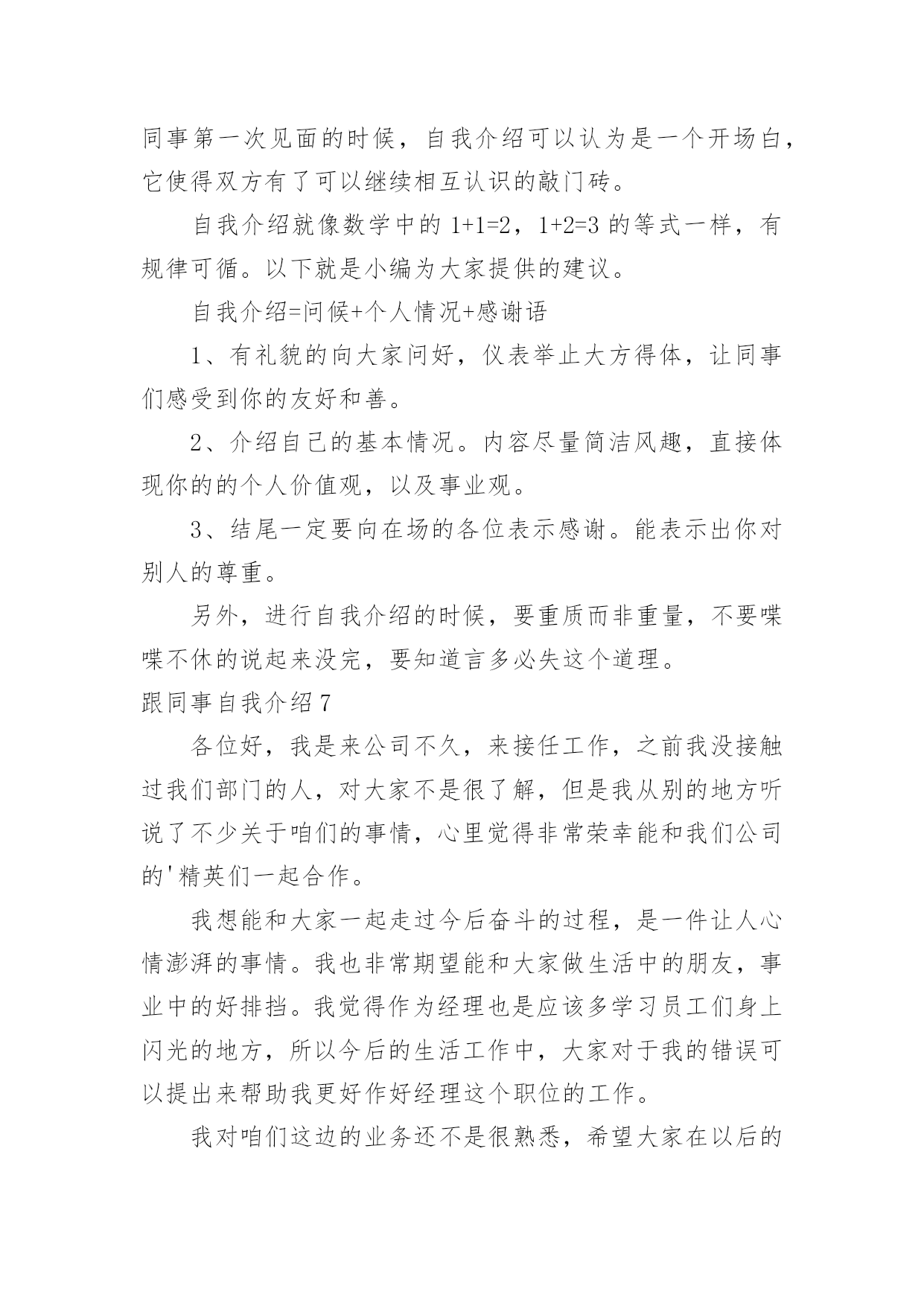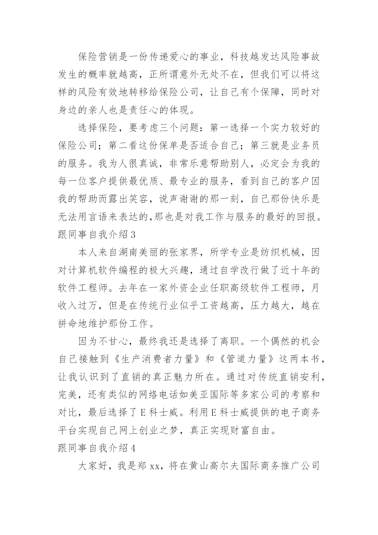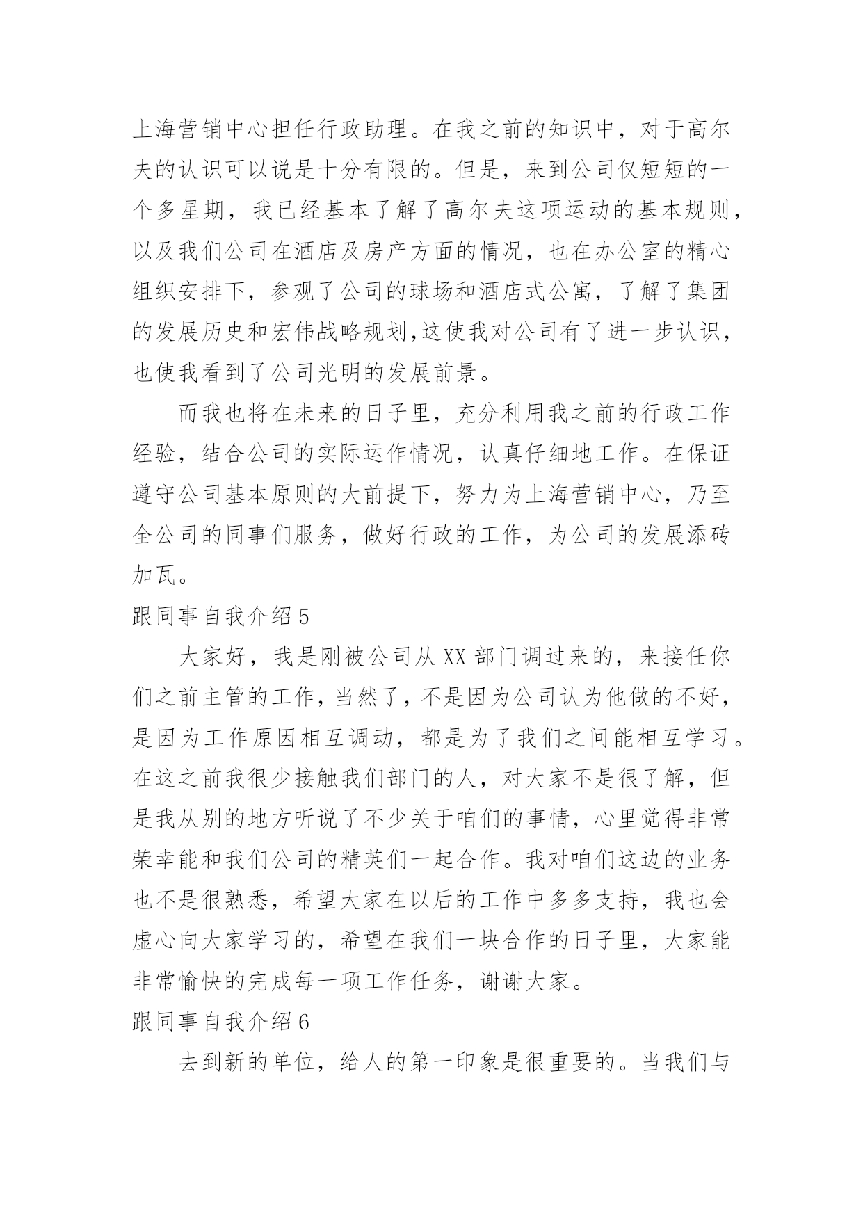 跟同事自我介绍跟同事自我介绍当来到一个新环境时,通常需要用到自我介绍,用自我介绍往往可以向他人介绍自己。相信大家又在为写自我介绍犯愁了吧!以下是小编整理的跟同事自我介绍,欢迎阅读与收藏。跟同事自我介绍1大家好,我叫刘,来自合肥营销部。毕业于安大江淮学院英语专业。11月初来这里实习,已有半月时间。"秋尽江南草未凋",这是对这里最深的感受。绿树茵茵碧草连天,首先打动我的是这里的美景,对于异地的陌生感就这样被悄然淡化。然后是对未知的期待与不安。带着满腹的疑惑与好奇来到部门实习,大家各司其职,忙的不亦乐乎。我觉得自己要学的还有很多。汪经理的声音很好听,亲切的透彻的;这里的气氛也很融洽,暖暖的柔和的。跟同事自我介绍2本人于暨南大学毕业,获得硕士研究生学位,毕业后从事过技术管理、教育工作。一次偶然的机会接触到平安,才真正认识到保险的真实内涵,认识到工作的价值。于是我毅然辞去之前的教育工作,全身心投入保险事业,以便为更多的人与家庭带来保障送去平安!保险营销是一份传递爱心的事业,科技越发达风险事故发生的概率就越高,正所谓意外无处不在,但我们可以将这样的风险有效地转移给保险公司,让自己有个保障,同时对身边的亲人也是责任心的体现。选择保险,要考虑三个问题:第一选择一个实力较好的保险公司;第二看这份保单是否适合自己;第三就是业务员的服务。我为人很真诚,非常乐意帮助别人,必定会为我的每一位客户提供最优质、最专业的服务,看到自己的客户因我的帮助而露出笑容,说声谢谢的那一刻,自己那份快乐是无法用言语来表达的,那也是对我工作与服务的最好的回报。跟同事自我介绍3本人来自湖南美丽的张家界,所学专业是纺织机械,因对计算机软件编程的极大兴趣,通过自学改行做了近十年的软件工程师。去年在一家外资企业任职高级软件工程师,月收入过万,但是在传统行业似乎工资越高,压力越大,越在拼命地维护那份工作。因为不甘心,最终我还是选择了离职。一个偶然的机会自己接触到《生产消费者力量》和《管道力量》这两本书,让我认识到了直销的真正魅力所在。通过对传统直销安利,完美,还有类似的网络电话如美亚国际等多家公司的考察和对比,最后选择了E科士威。利用E科士威提供的电子商务平台实现自己网上创业之梦,真正实现财富自由。跟同事自我介绍4大家好,我是郑xx,将在黄山高尔夫国际商务推广公司上海营销中心担任行政助理。在我之前的知识中,对于高尔夫的认识可以说是十分有限的。但是,来到公司仅短短的一个多星期,我已经基本了解了高尔夫这项运动的基本规则,以及我们公司在酒店及房产方面的情况,也在办公室的精心组织安排下,参观了公司的球场和酒店式公寓,了解了集团的发展历史和宏伟战略规划,这使我对公司有了进一步认识,也使我看到了公司光明的发展前景。而我也将在未来的日子里,充分利用我之前的行政工作经验,结合公司的实际运作情况,认真仔细地工作。在保证遵守公司基本原则的大前提下,努力为上海营销中心,乃至全公司的同事们服务,做好行政的工作,为公司的发展添砖加瓦。跟同事自我介绍5大家好,我是刚被公司从XX部门调过来的,来接任你们之前主管的工作,当然了,不是因为公司认为他做的不好,是因为工作原因相互调动,都是为了我们之间能相互学习。在这之前我很少接触我们部门的人,对大家不是很了解,但是我从别的地方听说了不少关于咱们的事情,心里觉得非常荣幸能和我们公司的精英们一起合作。我对咱们这边的业务也不是很熟悉,希望大家在以后的工作中多多支持,我也会虚心向大家学习的,希望在我们一块合作的日子里,大家能非常愉快的完成每一项工作任务,谢谢大家。跟同事自我介绍6去到新的单位,给人的第一印象是很重要的。当我们与同事第一次见面的时候,自我介绍可以认为是一个开场白,它使得双方有了可以继续相互认识的敲门砖。自我介绍就像数学中的1+1=2,1+2=3的等式一样,有规律可循。以下就是小编为大家提供的建议。自我介绍=问候+个人情况+感谢语1、有礼貌的向大家问好,仪表举止大方得体,让同事们感受到你的友好和善。2、介绍自己的基本情况。内容尽量简洁风趣,直接体现你的的个人价值观,以及事业观。3、结尾一定要向在场的各位表示感谢。能表示出你对别人的尊重。另外,进行自我介绍的时候,要重质而非重量,不要喋喋不休的说起来没完,要知道言多必失这个道理。跟同事自我介绍7各位好,我是来公司不久,来接任工作,之前我没接触过我们部门的人,对大家不是很了解,但是我从别的地方听说了不少关于咱们的事情,心里觉得非常荣幸能和我们公司的'精英们一起合作。我想能和大家一起走过今后奋斗的过程,是一件让人心情澎湃的事情。我也非常期望能和大家做生活中的朋友,事业中的好排挡。我觉得作为经理也是应该多学习员工们身上闪光的地方,所以今后的生活工作中,大家对于我的错误可以提出来帮助我更好作好经理这个职位的工作。我对咱们