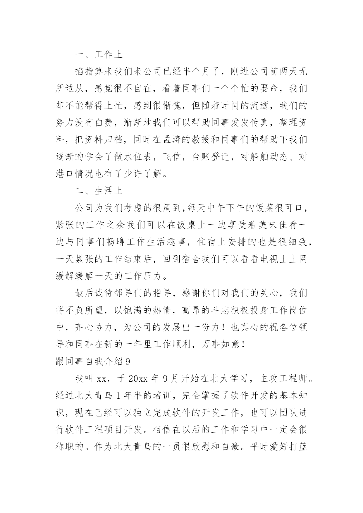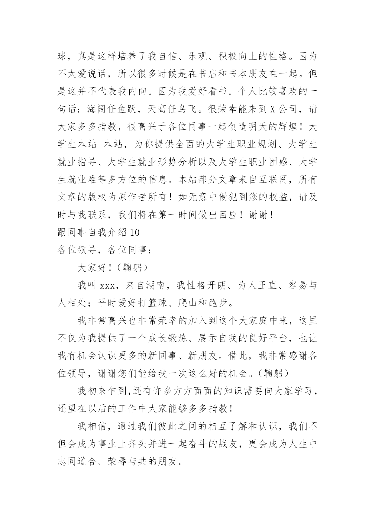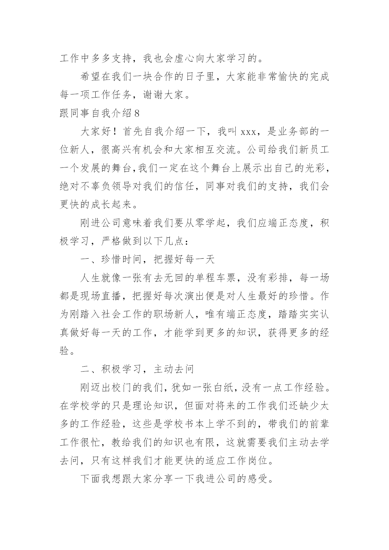 跟同事自我介绍跟同事自我介绍当来到一个新环境时,通常需要用到自我介绍,用自我介绍往往可以向他人介绍自己。相信大家又在为写自我介绍犯愁了吧!以下是小编整理的跟同事自我介绍,欢迎阅读与收藏。跟同事自我介绍1大家好,我叫刘,来自合肥营销部。毕业于安大江淮学院英语专业。11月初来这里实习,已有半月时间。"秋尽江南草未凋",这是对这里最深的感受。绿树茵茵碧草连天,首先打动我的是这里的美景,对于异地的陌生感就这样被悄然淡化。然后是对未知的期待与不安。带着满腹的疑惑与好奇来到部门实习,大家各司其职,忙的不亦乐乎。我觉得自己要学的还有很多。汪经理的声音很好听,亲切的透彻的;这里的气氛也很融洽,暖暖的柔和的。跟同事自我介绍2本人于暨南大学毕业,获得硕士研究生学位,毕业后从事过技术管理、教育工作。一次偶然的机会接触到平安,才真正认识到保险的真实内涵,认识到工作的价值。于是我毅然辞去之前的教育工作,全身心投入保险事业,以便为更多的人与家庭带来保障送去平安!保险营销是一份传递爱心的事业,科技越发达风险事故发生的概率就越高,正所谓意外无处不在,但我们可以将这样的风险有效地转移给保险公司,让自己有个保障,同时对身边的亲人也是责任心的体现。选择保险,要考虑三个问题:第一选择一个实力较好的保险公司;第二看这份保单是否适合自己;第三就是业务员的服务。我为人很真诚,非常乐意帮助别人,必定会为我的每一位客户提供最优质、最专业的服务,看到自己的客户因我的帮助而露出笑容,说声谢谢的那一刻,自己那份快乐是无法用言语来表达的,那也是对我工作与服务的最好的回报。跟同事自我介绍3本人来自湖南美丽的张家界,所学专业是纺织机械,因对计算机软件编程的极大兴趣,通过自学改行做了近十年的软件工程师。去年在一家外资企业任职高级软件工程师,月收入过万,但是在传统行业似乎工资越高,压力越大,越在拼命地维护那份工作。因为不甘心,最终我还是选择了离职。一个偶然的机会自己接触到《生产消费者力量》和《管道力量》这两本书,让我认识到了直销的真正魅力所在。通过对传统直销安利,完美,还有类似的网络电话如美亚国际等多家公司的考察和对比,最后选择了E科士威。利用E科士威提供的电子商务平台实现自己网上创业之梦,真正实现财富自由。跟同事自我介绍4大家好,我是郑xx,将在黄山高尔夫国际商务推广公司上海营销中心担任行政助理。在我之前的知识中,对于高尔夫的认识可以说是十分有限的。但是,来到公司仅短短的一个多星期,我已经基本了解了高尔夫这项运动的基本规则,以及我们公司在酒店及房产方面的情况,也在办公室的精心组织安排下,参观了公司的球场和酒店式公寓,了解了集团的发展历史和宏伟战略规划,这使我对公司有了进一步认识,也使我看到了公司光明的发展前景。而我也将在未来的日子里,充分利用我之前的行政工作经验,结合公司的实际运作情况,认真仔细地工作。在保证遵守公司基本原则的大前提下,努力为上海营销中心,乃至全公司的同事们服务,做好行政的工作,为公司的发展添砖加瓦。跟同事自我介绍5大家好,我是刚被公司从XX部门调过来的,来接任你们之前主管的工作,当然了,不是因为公司认为他做的不好,是因为工作原因相互调动,都是为了我们之间能相互学习。在这之前我很少接触我们部门的人,对大家不是很了解,但是我从别的地方听说了不少关于咱们的事情,心里觉得非常荣幸能和我们公司的精英们一起合作。我对咱们这边的业务也不是很熟悉,希望大家在以后的工作中多多支持,我也会虚心向大家学习的,希望在我们一块合作的日子里,大家能非常愉快的完成每一项工作任务,谢谢大家。跟同事自我介绍6去到新的单位,给人的第一印象是很重要的。当我们与同事第一次见面的时候,自我介绍可以认为是一个开场白,它使得双方有了可以继续相互认识的敲门砖。自我介绍就像数学中的1+1=2,1+2=3的等式一样,有规律可循。以下就是小编为大家提供的建议。自我介绍=问候+个人情况+感谢语1、有礼貌的向大家问好,仪表举止大方得体,让同事们感受到你的友好和善。2、介绍自己的基本情况。内容尽量简洁风趣,直接体现你的的个人价值观,以及事业观。3、结尾一定要向在场的各位表示感谢。能表示出你对别人的尊重。另外,进行自我介绍的时候,要重质而非重量,不要喋喋不休的说起来没完,要知道言多必失这个道理。跟同事自我介绍7各位好,我是来公司不久,来接任工作,之前我没接触过我们部门的人,对大家不是很了解,但是我从别的地方听说了不少关于咱们的事情,心里觉得非常荣幸能和我们公司的'精英们一起合作。我想能和大家一起走过今后奋斗的过程,是一件让人心情澎湃的事情。我也非常期望能和大家做生活中的朋友,事业中的好排挡。我觉得作为经理也是应该多学习员工们身上闪光的地方,所以今后的生活工作中,大家对于我的错误可以提出来帮助我更好作好经理这个职位的工作。我对咱们