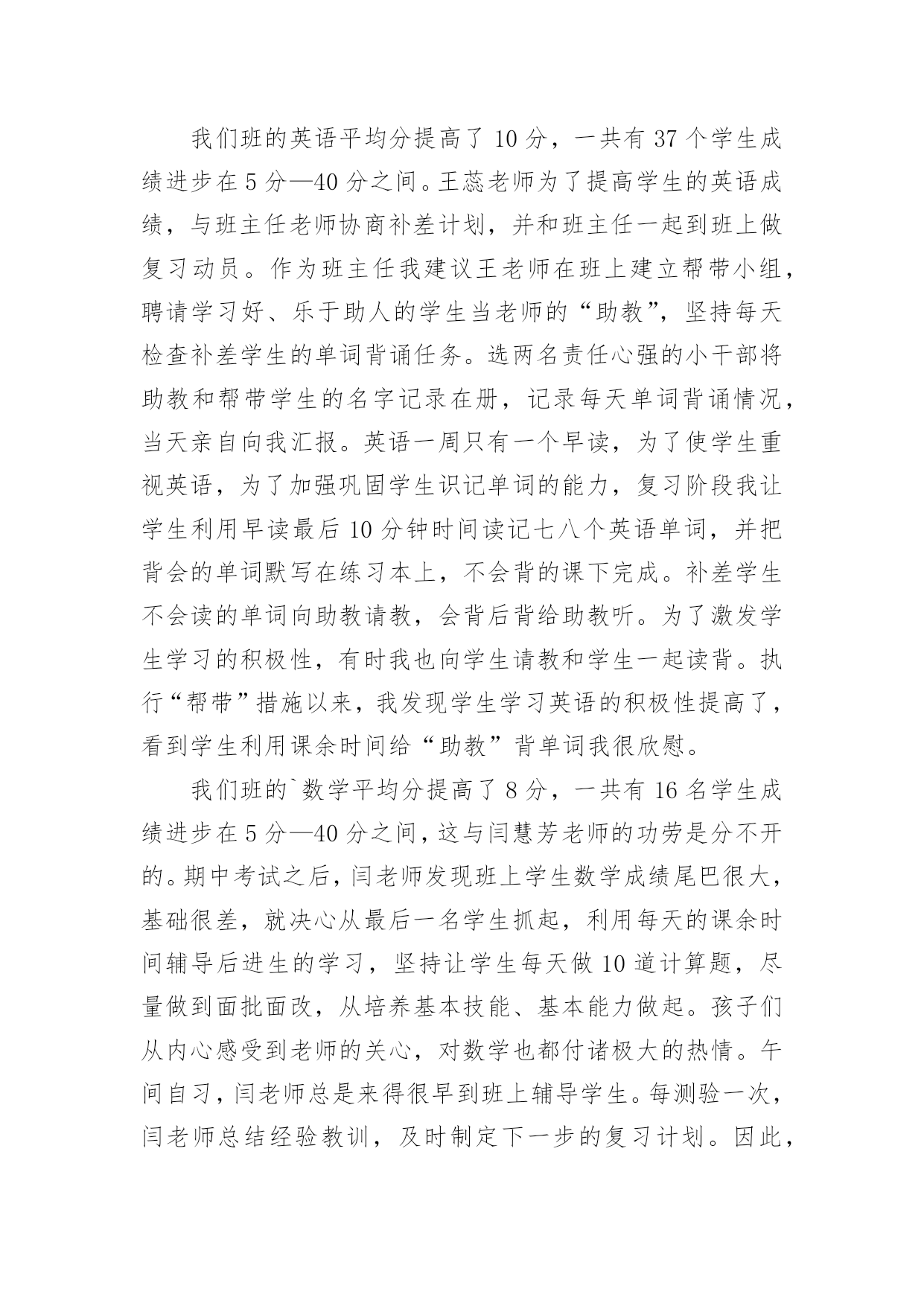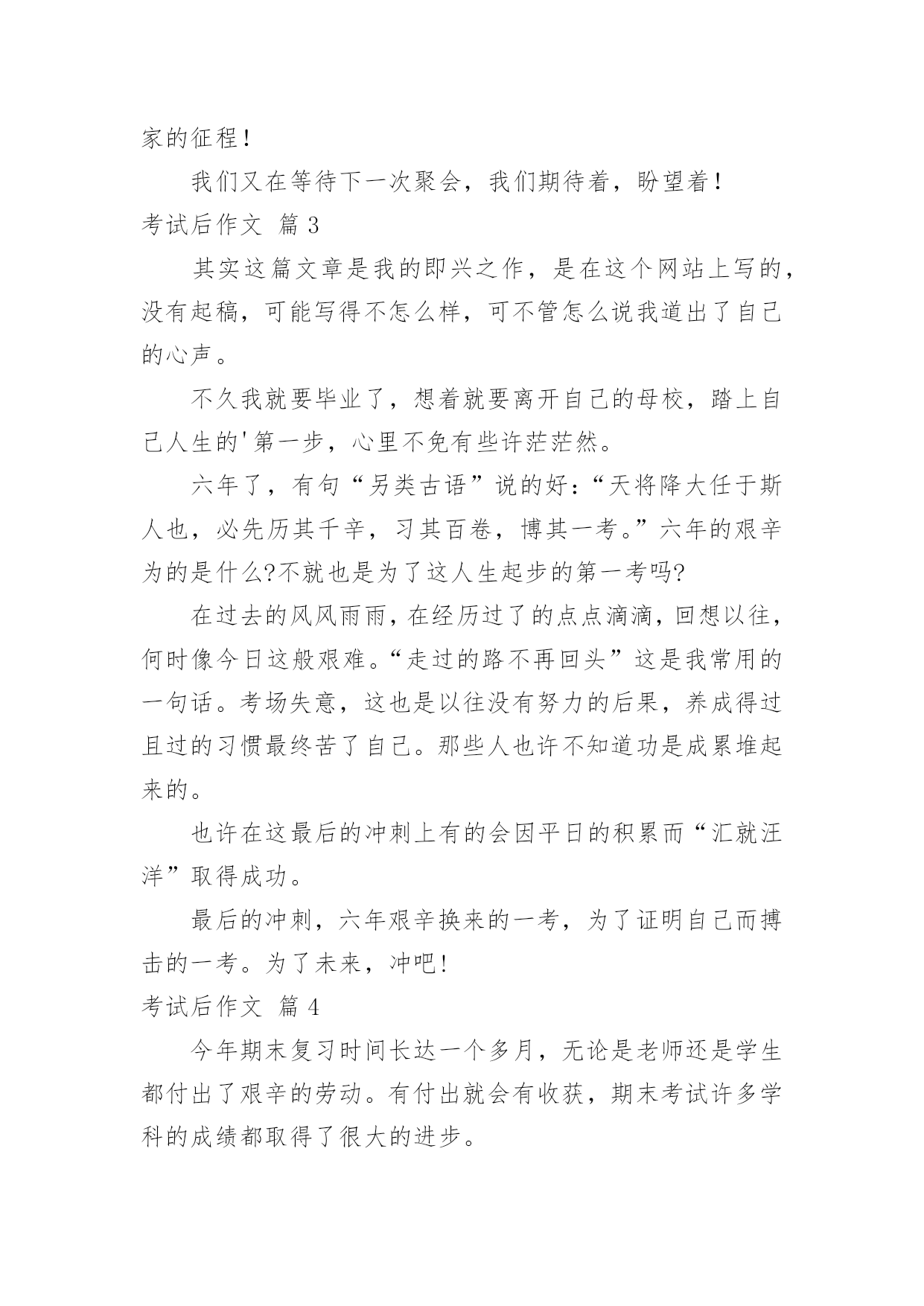 考试后作文考试后作文4篇[荐]在学习、工作乃至生活中,大家都尝试过写作文吧,作文根据写作时限的不同可以分为限时作文和非限时作文。相信许多人会觉得作文很难写吧,以下是小编收集整理的考试后作文4篇,欢迎阅读,希望大家能够喜欢。考试后作文篇1这次期中考试结束了,我考的成绩还是挺不错的',但是考试结束之后,我还为自己安排了一项其他的内容,就是做好考试之后的总结。我拿出一个崭新的本子,把考试卷上出错的题目都一一地照抄了下来,然后用红笔写上解题过程和出错的原因,等着下一次考试之前好好的复习。考试后作文篇2紧张的考试过去了,意味大家盼望已久的暑假已经近在咫尺。为了让我们更好地放松自己,我们的家委会组织了亲子活动。7月,是一个炎热的月份。亲子活动那天,火红的骄阳把大地烘烤得热烘烘的,可我们的激情却没能让太阳晒倒。我们的目的地是八卦田,走进园内,满眼是大片绿地,一块块土地上长着蔬菜和其它食品的植株,有芋艿、番薯、向日葵等,一座座茅草屋坐落在河旁,哪里都飘荡着田园风光的气息。我们来到了预定的宿营地,同学都聚集在这里,聊天的聊天,玩游戏的玩游戏,热闹得似乎要把屋顶都掀翻了。不久,大家开始玩弄起锄头了,就此,亲子活动的第一篇章——挖土豆的序幕打开了。随着家长的一声令下,大家争先恐后地冲向土豆田。大家踏进田地,纷纷寻找各自的目标。刚开始,同学们也有点蒙,乱挖一气,但没过多久,大家就找到了诀窍,袋子也饱满起来。这时,太阳当空,同学们已汗流浃背,但大家的兴致却越来越浓。我虽对炽热的太阳畏惧三分,但看着同学一个又一个地将土豆填进袋子里,我的心也不觉痒痒起来。当我又想奔向土豆田时,同学们已经个个满载而归。我不得不收起这份热情。快乐的时间就是短暂,我还没尝到挖土豆的乐趣,亲子活动又进入了第二高潮——有奖竞答比赛拉开帷幕,大家都左思右想寻找答案,在快乐中学习,既收获了快乐,又从中学到了知识,真是一举两得啊!竞答结束后,我们又玩了击“鼓”传“花”。“鼓”停时“花”在手里的同学一个个表演节目,有的`诵古诗,有的讲笑话……活动快结束了,这时我好不容易又逮到了一个挖土豆的机会,和几个尚未过足瘾的同学结成一伙,拿着锄头,向土豆田疾奔,抓住体验乡村生活的机会。同伴们也真有经验,已经知道土豆的藏身之地,我使劲刨几下,土豆想躲也躲不着了。哦,我终于挖了一袋,享受着丰收的快乐,也让我再次享受了挖土豆的乐趣。噢,太阳不知不觉地跑到西边山顶了,大家都踏上了回家的征程!我们又在等待下一次聚会,我们期待着,盼望着!考试后作文篇3其实这篇文章是我的即兴之作,是在这个网站上写的,没有起稿,可能写得不怎么样,可不管怎么说我道出了自己的心声。不久我就要毕业了,想着就要离开自己的母校,踏上自己人生的'第一步,心里不免有些许茫茫然。六年了,有句“另类古语”说的好:“天将降大任于斯人也,必先历其千辛,习其百卷,博其一考。”六年的艰辛为的是什么?不就也是为了这人生起步的第一考吗?在过去的风风雨雨,在经历过了的点点滴滴,回想以往,何时像今日这般艰难。“走过的路不再回头”这是我常用的一句话。考场失意,这也是以往没有努力的后果,养成得过且过的习惯最终苦了自己。那些人也许不知道功是成累堆起来的。也许在这最后的冲刺上有的会因平日的积累而“汇就汪洋”取得成功。最后的冲刺,六年艰辛换来的一考,为了证明自己而搏击的一考。为了未来,冲吧!考试后作文篇4今年期末复习时间长达一个多月,无论是老师还是学生都付出了艰辛的劳动。有付出就会有收获,期末考试许多学科的成绩都取得了很大的进步。我们班的英语平均分提高了10分,一共有37个学生成绩进步在5分—40分之间。王蕊老师为了提高学生的英语成绩,与班主任老师协商补差计划,并和班主任一起到班上做复习动员。作为班主任我建议王老师在班上建立帮带小组,聘请学习好、乐于助人的学生当老师的“助教”,坚持每天检查补差学生的单词背诵任务。选两名责任心强的小干部将助教和帮带学生的名字记录在册,记录每天单词背诵情况,当天亲自向我汇报。英语一周只有一个早读,为了使学生重视英语,为了加强巩固学生识记单词的能力,复习阶段我让学生利用早读最后10分钟时间读记七八个英语单词,并把背会的单词默写在练习本上,不会背的课下完成。补差学生不会读的单词向助教请教,会背后背给助教听。为了激发学生学习的积极性,有时我也向学生请教和学生一起读背。执行“帮带”措施以来,我发现学生学习英语的积极性提高了,看到学生利用课余时间给“助教”背单词我很欣慰。我们班的`数学平均分提高了8分,一共有16名学生成绩进步在5分—40分之间,这与闫慧芳老师的功劳是分不开的。期中考试之后,闫老师发现班上学生数学成绩尾巴很大,基础很差,就决心从最后一名学生抓起,利用每天的课余时间辅导后进生的学习,坚持让学生每天做10道计算题,尽量做到面批面改,从培养基