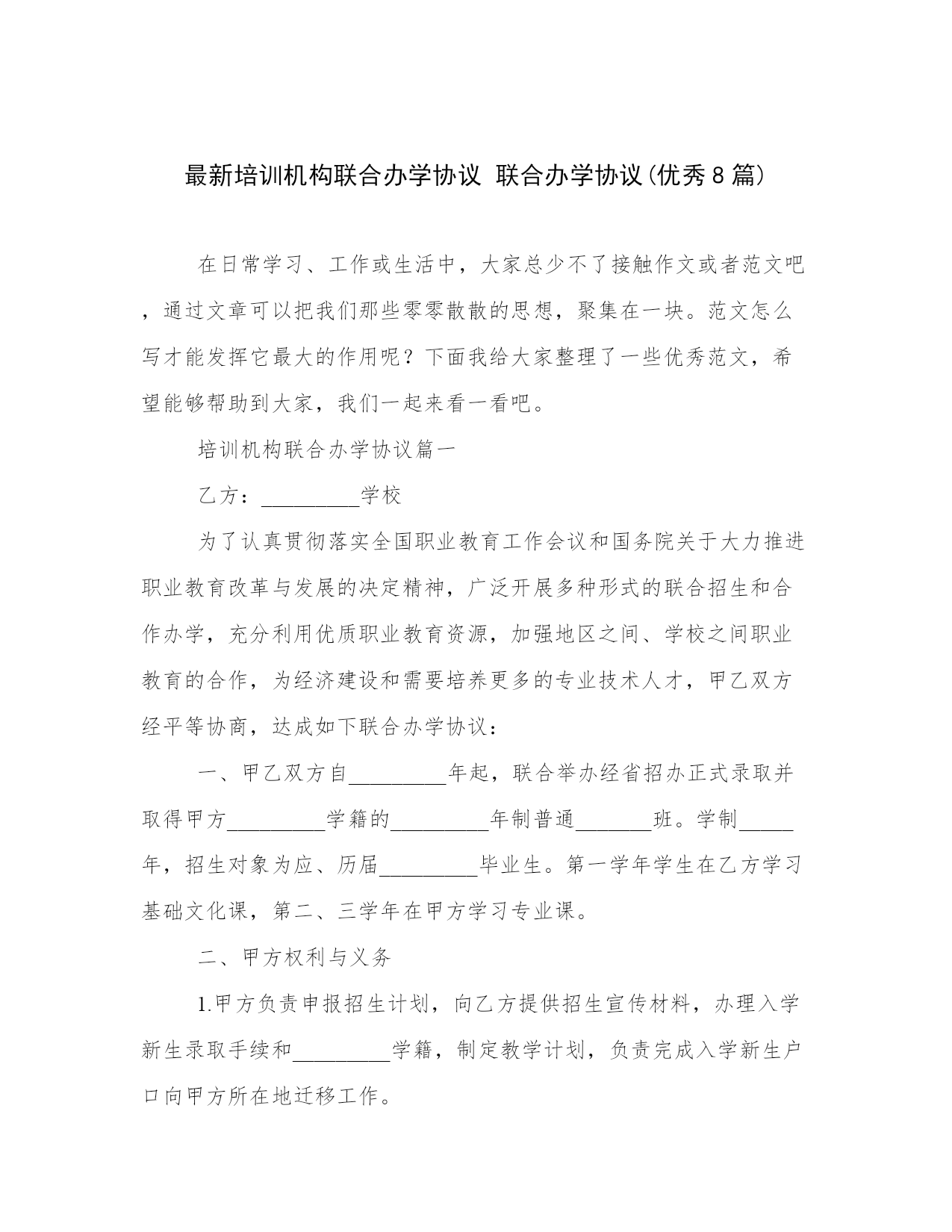 20XX标准合同模板范本PERSONALRESUME甲方:XXX乙方:XXX2024版教育培训项目联合办学协议稿合同编号_________一、合同主体甲方:____________________地址:____________________联系人:__________________联系电话:________________乙方:____________________地址:____________________联系人:__________________联系电话:________________二、合同前言2.1背景和目的鉴于甲方在教育培训领域的丰富经验和优质资源,以及乙方在招生、市场推广等方面的优势,双方为共同推进教育培训项目,提高教育培训质量,实现资源共享、互利共赢,特订立本协议。2.2合同依据本合同依据《中华人民共和国合同法》、《中华人民共和国教育法》等相关法律法规,经双方友好协商,自愿签订。三、定义与解释3.1专业术语(1)教育培训项目:指甲方提供的各类教育培训课程,包括但不限于学历教育、职业技能培训等。(2)联合办学:指甲方与乙方共同开展教育培训项目,共享资源、共担风险、共负盈亏的合作模式。3.2关键词解释(1)资源共享:指甲方提供教育培训资源,乙方提供招生和市场推广资源,双方共同利用各自资源推进项目发展。(2)互利共赢:指甲方与乙方在合作过程中,实现各自利益的最大化,共同发展。四、权利与义务4.1甲方的权利和义务(1)甲方负责提供教育培训项目所需的师资、教学设施、教材等资源。(2)甲方有权对乙方提供的招生和市场推广方案进行审核,确保其符合甲方品牌形象及教学质量要求。(3)甲方应按约定向乙方支付合作费用。(4)甲方有权对乙方的教育教学质量进行监督和评估。4.2乙方的权利和义务(1)乙方负责招生、市场推广、学生管理等工作。(2)乙方有权按照甲方提供的课程设置和教学质量要求,自主开展招生和市场推广活动。(3)乙方应按约定向甲方支付合作费用。(4)乙方应保证所招学生的质量,确保学生按时完成学业。五、履行条款5.1合同履行时间本合同自双方签字盖章之日起生效,有效期为____年,自合同生效之日起计算。5.2合同履行地点甲乙双方在各自所在地履行合同。5.3合同履行方式(1)甲乙双方通过线上、线下等多种方式开展合作。(2)甲乙双方定期召开协调会议,共同解决合作过程中的问题。六、合同的生效和终止6.1生效条件本合同自甲乙双方签字盖章之日起生效。6.2终止条件(1)合同到期,双方未续签;(2)双方协商一致,提前终止合同;(3)一方严重违约,导致合同无法继续履行。6.3终止程序双方在合同终止前,应提前____个月书面通知对方。6.4终止后果合同终止后,甲乙双方应按照合同约定处理合同终止后的相关事宜,包括但不限于合作费用的结算、已招收学生的安置等。七、费用与支付7.1费用构成(1)甲方提供的教育培训服务费;(2)乙方招生和市场推广费用;(3)合作项目所需的教材、设施等成本费用;(4)双方合作过程中产生的其他合理费用。7.2支付方式(1)银行转账;(2)现金支付;(3)其他双方认可的方式。7.3支付时间(1)甲方应在合同约定的期限内,向乙方支付合作费用;(2)乙方应在收到甲方提供的教育培训服务后,按约定向甲方支付相应费用。7.4支付章件(1)付款通知单;(2)发票或收据;(3)其他双方约定的支持文件。八、违约责任8.1甲方违约(1)向乙方支付违约金;(2)赔偿乙方因此造成的损失;(3)继续履行合同。8.2乙方违约(1)向甲方支付违约金;(2)赔偿甲方因此造成的损失;(3)继续履行合同。8.3赔偿金额和方式双方应在合同中明确违约赔偿金额和方式,确保在违约情况下,受损方得到合理赔偿。九、保密条款9.1保密内容(1)合作项目的具体内容;(2)双方的商业秘密;(3)其他双方明确要求保密的信息。9.2保密期限双方对保密信息的保密期限自合同签订之日起算,至合作项目终止后____年。9.3保密履行方式(1)签订保密协议;(2)限制内部人员接触保密信息;(3)采取技术手段保护保密信息。十、不可抗力10.1不可抗力定义本合同所指的不可抗力包括自然灾害、战争、政策调整等无法预见、无法避免且无