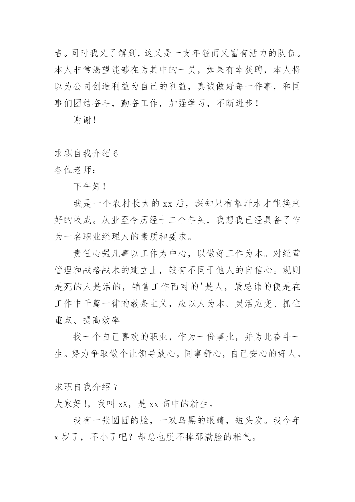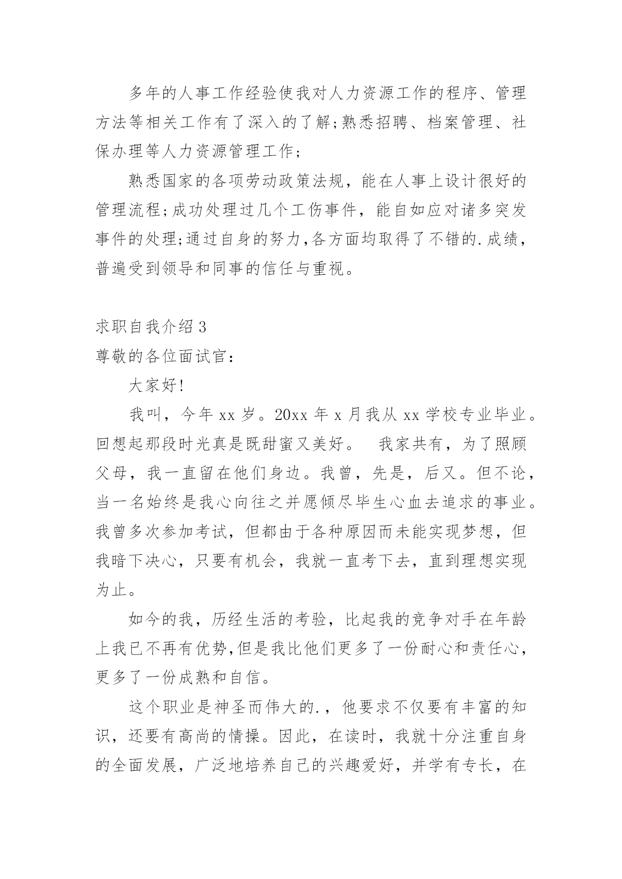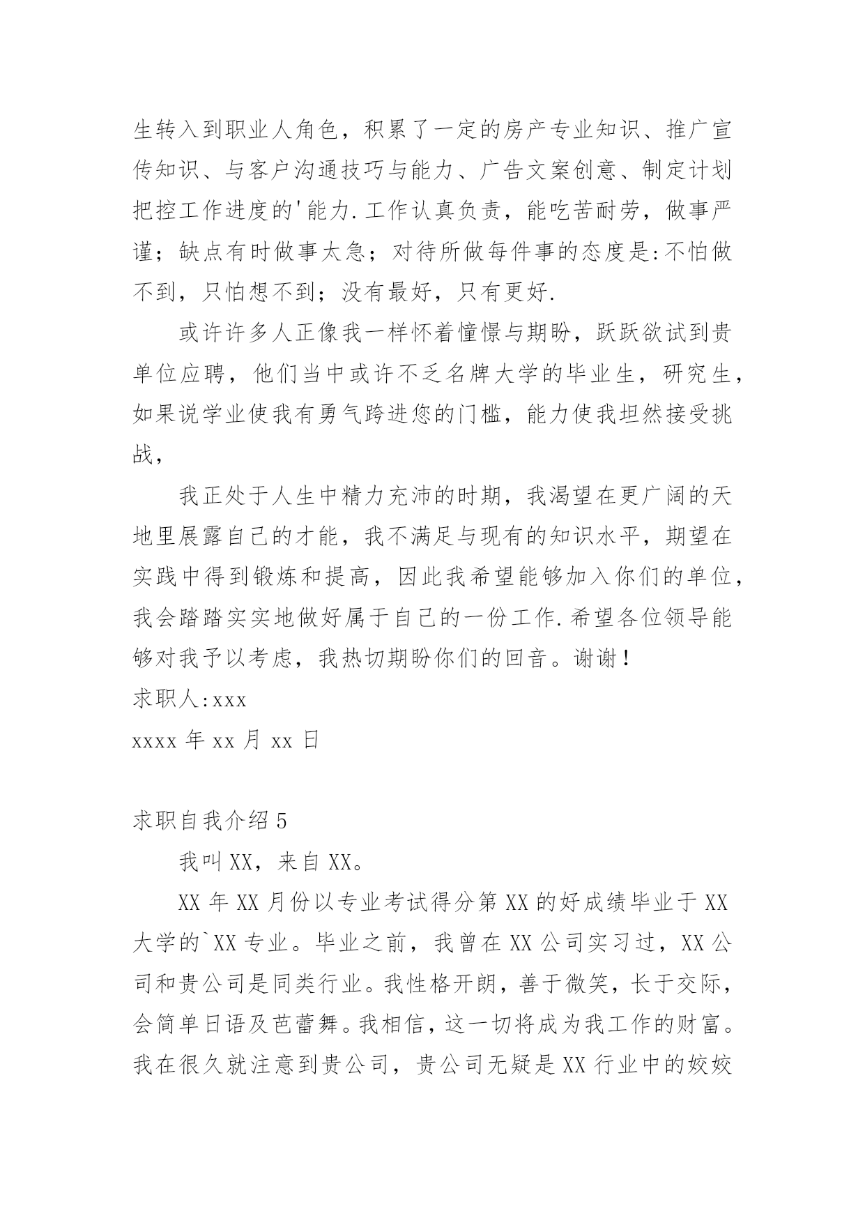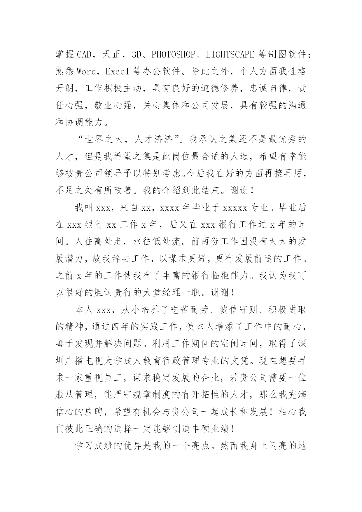 求职自我介绍当去到一个新环境下,通常需要用到自我介绍,自我介绍可以给陌生人留下一个好的印象。如何编写一段个性的自我介绍?下面是小编帮大家整理的求职自我介绍,希望能够帮助到大家。求职自我介绍1尊敬的领导:大家下午好!很荣幸能在那里面试,让我有向各位考官学习与交流的机会。我叫xx,来自于中国最美的乡村——xx。性格比较温和、谦虚、认真细致、踏实、吃苦耐劳、有较强的职责心和社会适应潜力(那里能够用一些修饰性的词语对自己的性格做一个简单的介绍,当然是好的方面啦)。即将于20xx年7月毕业于xx工业职业技术学院,作为一名电子商务专业的大学生,我更喜欢平面设计方面的资料,在大学三年的学习生活中,我对平面这一领域的相关知识有了必须的掌握,同时具有实际的操作潜力与技术(那里就是为了体现自己的专业技能以及期望的职业发展方向了)。为了使在校所学的知识更好地应用到实际生活中,于20xx年xx月有幸来北京中科院计算机所培训中心,透过三个月的实践训练,全面系统地学习了平面方面的专业知识与技能,能够应用平面设计的相关软件(Photoshop图像处理软件、Illustrator与CoreIdRAW矢量绘图软件、InDesigin与Pagemaker排版软件)做基本的图像处理、海报、企业宣传册等,能够将所学知识真正应用到实际生活中。(主要交代你之前的实习经验以及技能运用方面的状况,最好用一些具体的数据来表达)在投身于社会之际,为了找到贴合自己专业和兴趣的工作,更好地适应社会,我期望自己能够做到一种被别人需要的一种状态,至于做什么,就是在实践中,不断的学习、不断的锻炼.因此,我期望加入贵单位,如果能够成为公司的一份子,我相信我必须在自己的岗位上尽职尽责、踏踏实实地贡献之集的一份力量,与公司共同促进、发展。(这段话其实是有缺陷的,虽然看上去很通顺自然,但是整体上给人一种夸夸其谈的感觉,编者的'主张就是:直接说出你将来的发展方向,以及你的职业规划,3-5年的规划等,这样会切实的多,也会让面试官觉得你是一个脚踏实地的人)“世界之大,人才济济”。我承认自己还不是最优秀的人才,但是我期望之集是此岗位最适宜的人选,期望有幸能够被贵公司领导予以个性思考。今后我在好的方面再接再厉,不足之处有所改善。我的介绍到此结束。谢谢!求职人:xxxxxxx年xx月xx日求职自我介绍2多年的人事工作经验使我对人力资源工作的程序、管理方法等相关工作有了深入的了解;熟悉招聘、档案管理、社保办理等人力资源管理工作;熟悉国家的各项劳动政策法规,能在人事上设计很好的管理流程;成功处理过几个工伤事件,能自如应对诸多突发事件的处理;通过自身的努力,各方面均取得了不错的.成绩,普遍受到领导和同事的信任与重视。求职自我介绍3尊敬的各位面试官:大家好!我叫,今年xx岁。20xx年x月我从xx学校专业毕业。回想起那段时光真是既甜蜜又美好。我家共有,为了照顾父母,我一直留在他们身边。我曾,先是,后又。但不论,当一名始终是我心向往之并愿倾尽毕生心血去追求的事业。我曾多次参加考试,但都由于各种原因而未能实现梦想,但我暗下决心,只要有机会,我就一直考下去,直到理想实现为止。如今的我,历经生活的考验,比起我的竞争对手在年龄上我已不再有优势,但是我比他们更多了一份耐心和责任心,更多了一份成熟和自信。这个职业是神圣而伟大的.,他要求不仅要有丰富的知识,还要有高尚的情操。因此,在读时,我就十分注重自身的全面发展,广泛地培养自己的兴趣爱好,并学有专长,在注重知识学习的同时我还注意培养自己高尚的道德情操,自觉遵纪守法,遵守社会公德,没有不良嗜好和行为。我想这些都是一名工作者应该具备的最起码的素养。假如,我通过了面试,成为众多队伍中的成员,我将不断努力学习,努力工作,实现更大的抱负。谢谢!求职自我介绍4尊敬的领导:您好!学习文秘专业的我,诚实、正直、好学、简朴、乐观、自信、责任心强;乐于与人相处,与身边的人相处融洽,具团体合作精神;为人正直,作为一名文秘专业学生,我把“基础扎实,应用灵活”作为学习的宗旨和目标.在大学四年期间,我更是惜时如金,不断从各方面严格要求自己.“知识就是未来”,除了完成大学本科的教学大纲要求,并且取得四年成绩优秀总评外,我还大量涉猎各方面的知识光阴荏苒,转眼间,我已毕业一年了想想过去的工作和大学生活心中感慨万千,毕业后通过网络我找到了一份文职工作,正在实现自己的梦想,我深知“工欲善其事,必先利其器”的道理.因此,我并不满足于本专业知识的学习和技能的掌握,在不放松专业学习的同时,努力拓展自己的知识面,提高自身的工作能力:曾就职于北京冠智房产咨询中心,任职推广部创意文案一年.受公司良好的学习、工作、人际关系影响,迅速从学生转入到职业人角色,积累了一定的房产专业知识、推广宣传知识、与客户沟通技巧与能力、广告文案