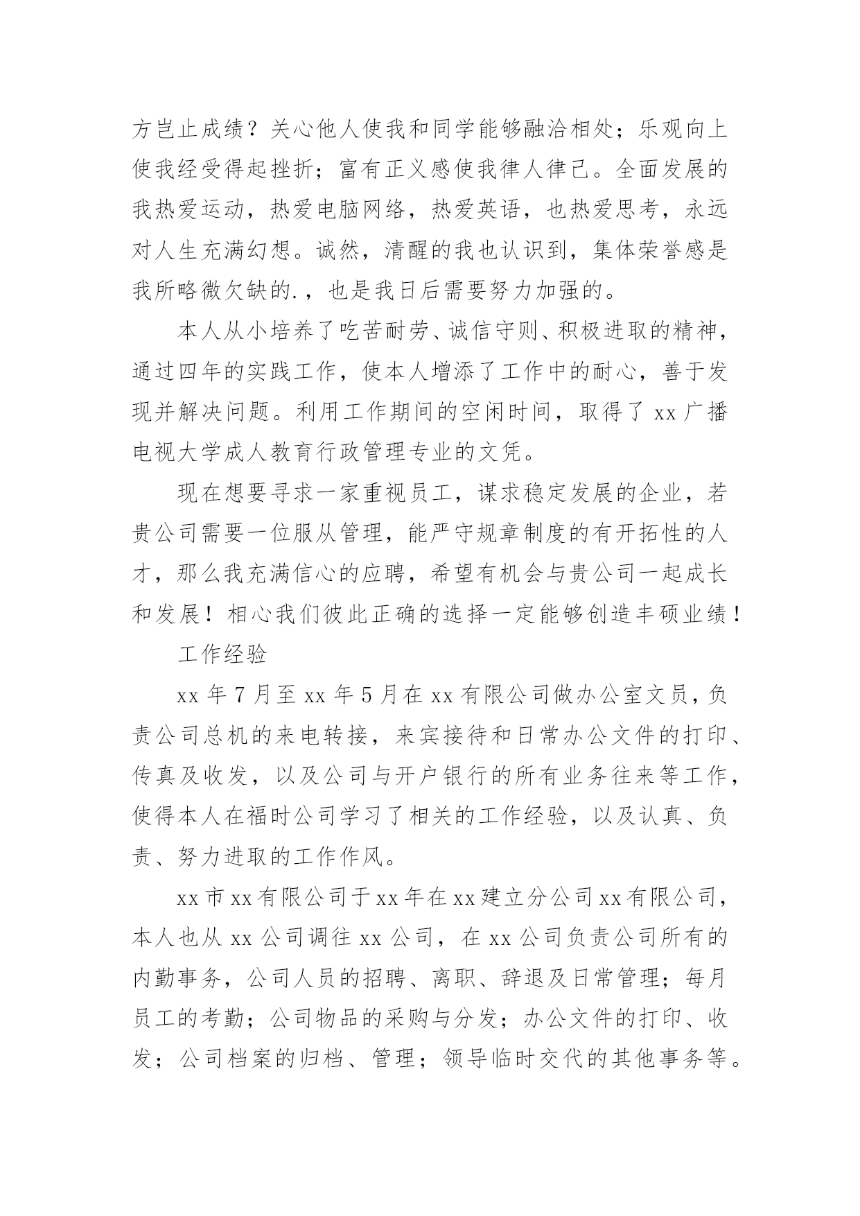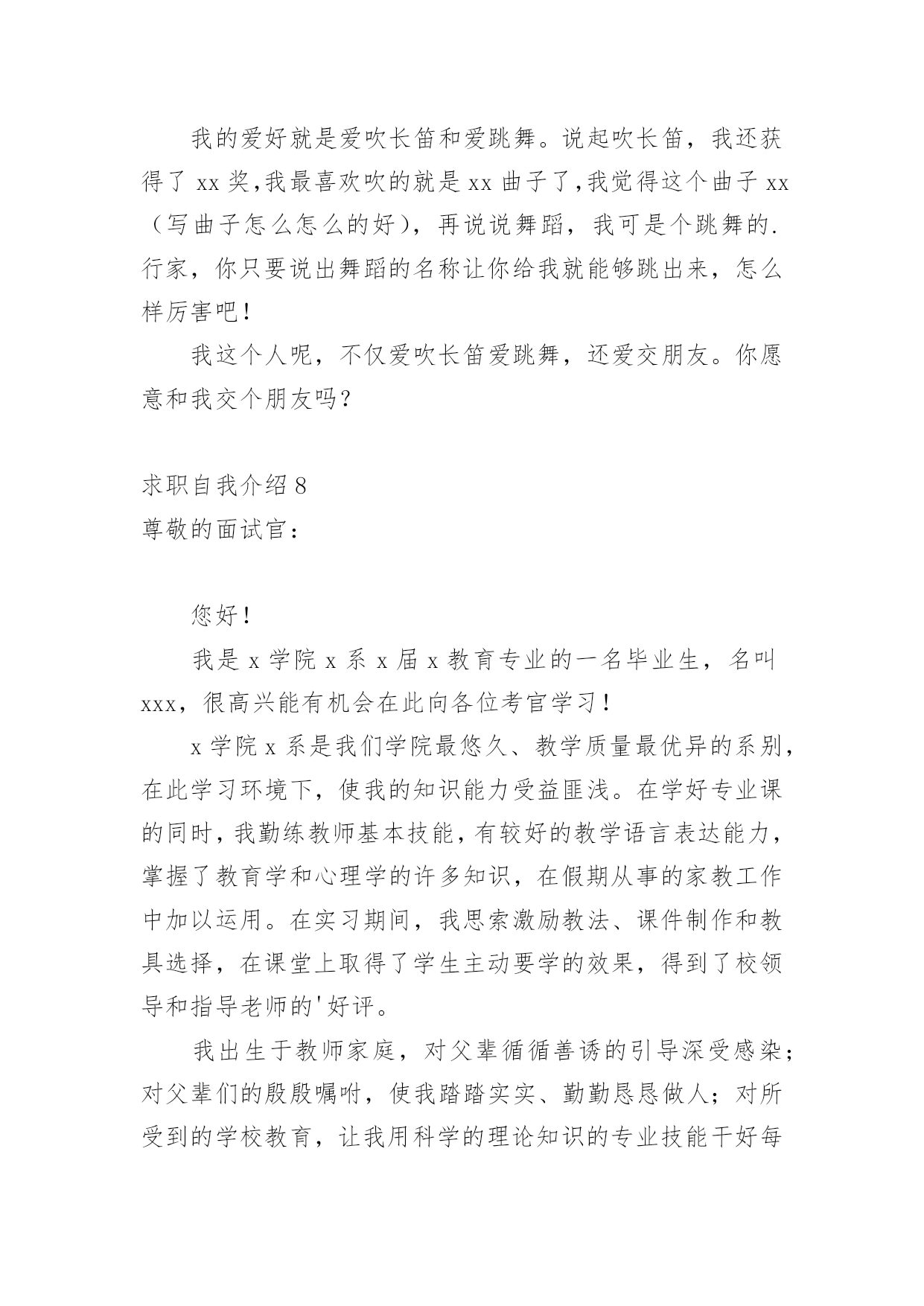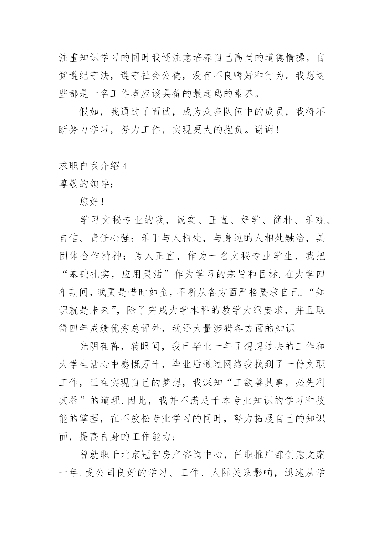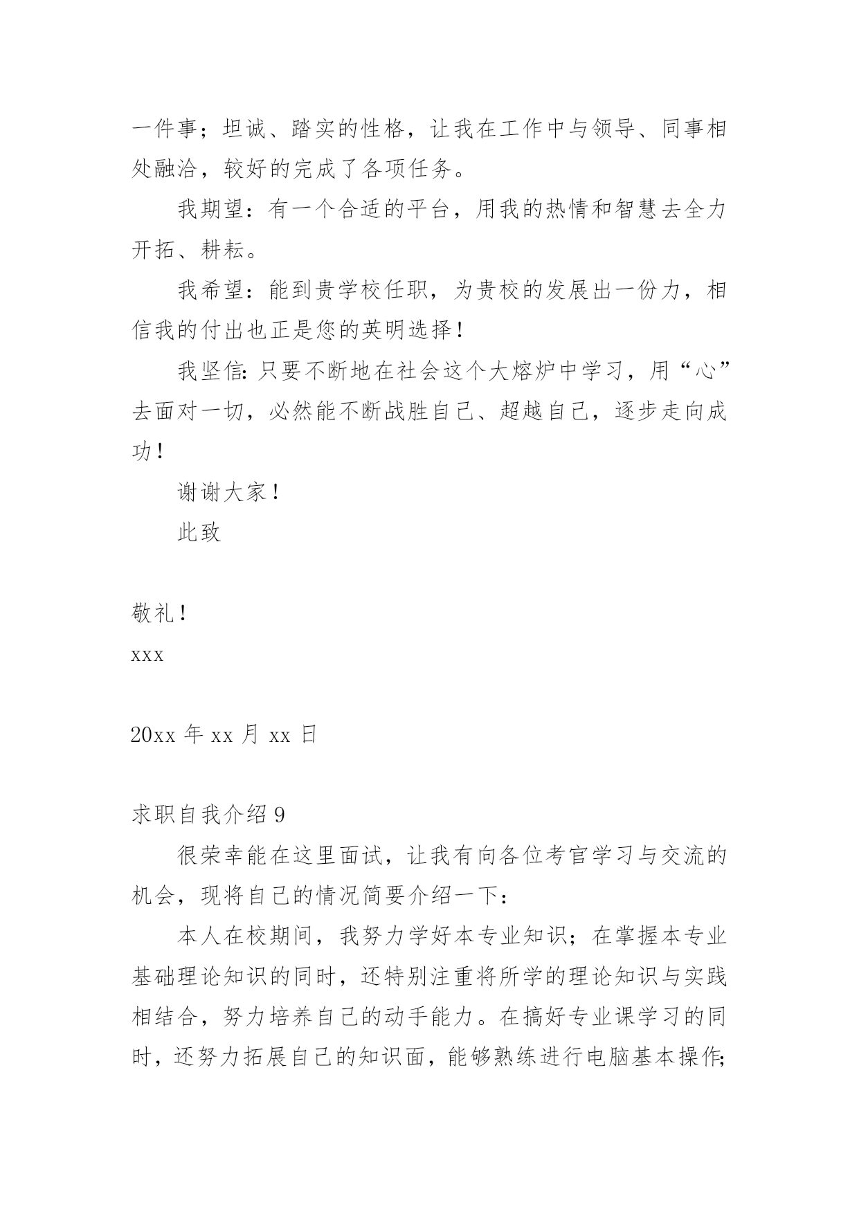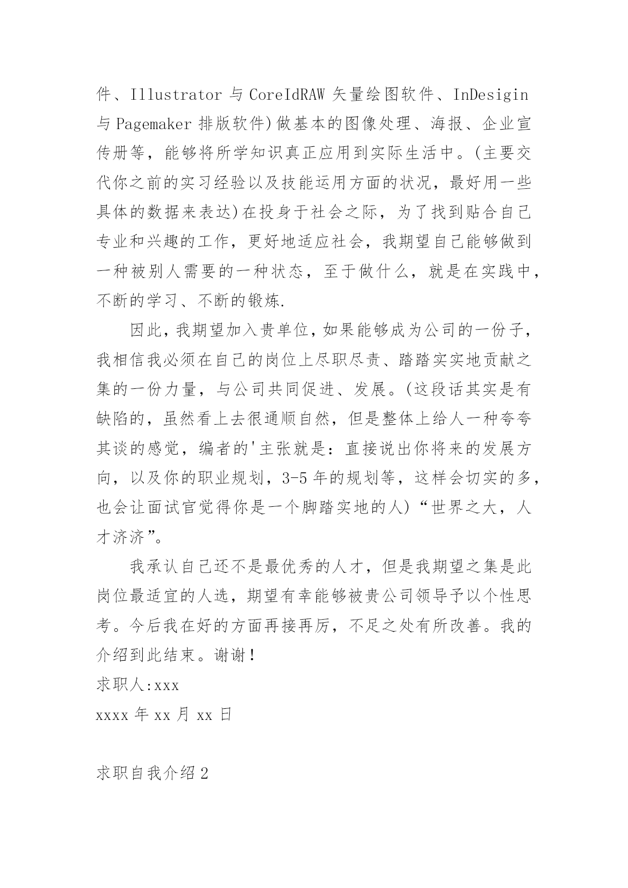 求职自我介绍当去到一个新环境下,通常需要用到自我介绍,自我介绍可以给陌生人留下一个好的印象。如何编写一段个性的自我介绍?下面是小编帮大家整理的求职自我介绍,希望能够帮助到大家。求职自我介绍1尊敬的领导:大家下午好!很荣幸能在那里面试,让我有向各位考官学习与交流的机会。我叫xx,来自于中国最美的乡村——xx。性格比较温和、谦虚、认真细致、踏实、吃苦耐劳、有较强的职责心和社会适应潜力(那里能够用一些修饰性的词语对自己的性格做一个简单的介绍,当然是好的方面啦)。即将于20xx年7月毕业于xx工业职业技术学院,作为一名电子商务专业的大学生,我更喜欢平面设计方面的资料,在大学三年的学习生活中,我对平面这一领域的相关知识有了必须的掌握,同时具有实际的操作潜力与技术(那里就是为了体现自己的专业技能以及期望的职业发展方向了)。为了使在校所学的知识更好地应用到实际生活中,于20xx年xx月有幸来北京中科院计算机所培训中心,透过三个月的实践训练,全面系统地学习了平面方面的专业知识与技能,能够应用平面设计的相关软件(Photoshop图像处理软件、Illustrator与CoreIdRAW矢量绘图软件、InDesigin与Pagemaker排版软件)做基本的图像处理、海报、企业宣传册等,能够将所学知识真正应用到实际生活中。(主要交代你之前的实习经验以及技能运用方面的状况,最好用一些具体的数据来表达)在投身于社会之际,为了找到贴合自己专业和兴趣的工作,更好地适应社会,我期望自己能够做到一种被别人需要的一种状态,至于做什么,就是在实践中,不断的学习、不断的锻炼.因此,我期望加入贵单位,如果能够成为公司的一份子,我相信我必须在自己的岗位上尽职尽责、踏踏实实地贡献之集的一份力量,与公司共同促进、发展。(这段话其实是有缺陷的,虽然看上去很通顺自然,但是整体上给人一种夸夸其谈的感觉,编者的'主张就是:直接说出你将来的发展方向,以及你的职业规划,3-5年的规划等,这样会切实的多,也会让面试官觉得你是一个脚踏实地的人)“世界之大,人才济济”。我承认自己还不是最优秀的人才,但是我期望之集是此岗位最适宜的人选,期望有幸能够被贵公司领导予以个性思考。今后我在好的方面再接再厉,不足之处有所改善。我的介绍到此结束。谢谢!求职人:xxxxxxx年xx月xx日求职自我介绍2多年的人事工作经验使我对人力资源工作的程序、管理方法等相关工作有了深入的了解;熟悉招聘、档案管理、社保办理等人力资源管理工作;熟悉国家的各项劳动政策法规,能在人事上设计很好的管理流程;成功处理过几个工伤事件,能自如应对诸多突发事件的处理;通过自身的努力,各方面均取得了不错的.成绩,普遍受到领导和同事的信任与重视。求职自我介绍3尊敬的各位面试官:大家好!我叫,今年xx岁。20xx年x月我从xx学校专业毕业。回想起那段时光真是既甜蜜又美好。我家共有,为了照顾父母,我一直留在他们身边。我曾,先是,后又。但不论,当一名始终是我心向往之并愿倾尽毕生心血去追求的事业。我曾多次参加考试,但都由于各种原因而未能实现梦想,但我暗下决心,只要有机会,我就一直考下去,直到理想实现为止。如今的我,历经生活的考验,比起我的竞争对手在年龄上我已不再有优势,但是我比他们更多了一份耐心和责任心,更多了一份成熟和自信。这个职业是神圣而伟大的.,他要求不仅要有丰富的知识,还要有高尚的情操。因此,在读时,我就十分注重自身的全面发展,广泛地培养自己的兴趣爱好,并学有专长,在注重知识学习的同时我还注意培养自己高尚的道德情操,自觉遵纪守法,遵守社会公德,没有不良嗜好和行为。我想这些都是一名工作者应该具备的最起码的素养。假如,我通过了面试,成为众多队伍中的成员,我将不断努力学习,努力工作,实现更大的抱负。谢谢!求职自我介绍4尊敬的领导:您好!学习文秘专业的我,诚实、正直、好学、简朴、乐观、自信、责任心强;乐于与人相处,与身边的人相处融洽,具团体合作精神;为人正直,作为一名文秘专业学生,我把“基础扎实,应用灵活”作为学习的宗旨和目标.在大学四年期间,我更是惜时如金,不断从各方面严格要求自己.“知识就是未来”,除了完成大学本科的教学大纲要求,并且取得四年成绩优秀总评外,我还大量涉猎各方面的知识光阴荏苒,转眼间,我已毕业一年了想想过去的工作和大学生活心中感慨万千,毕业后通过网络我找到了一份文职工作,正在实现自己的梦想,我深知“工欲善其事,必先利其器”的道理.因此,我并不满足于本专业知识的学习和技能的掌握,在不放松专业学习的同时,努力拓展自己的知识面,提高自身的工作能力:曾就职于北京冠智房产咨询中心,任职推广部创意文案一年.受公司良好的学习、工作、人际关系影响,迅速从学生转入到职业人角色,积累了一定的房产专业知识、推广宣传知识、与客户沟通技巧与能力、广告文案