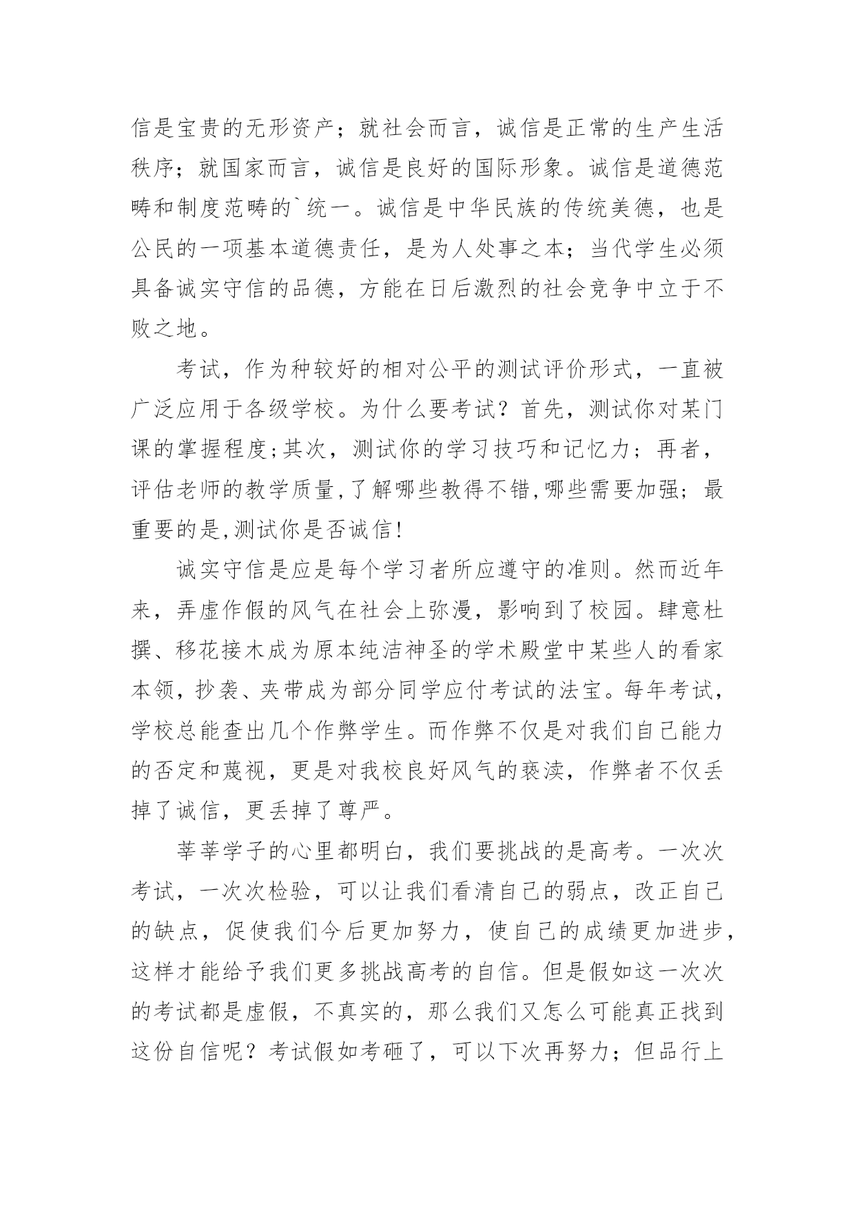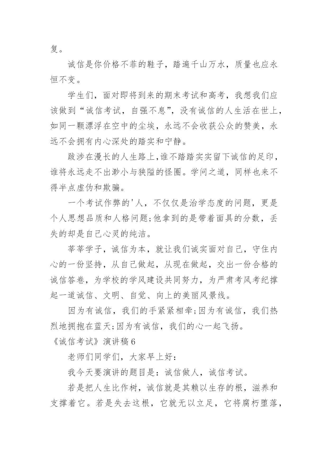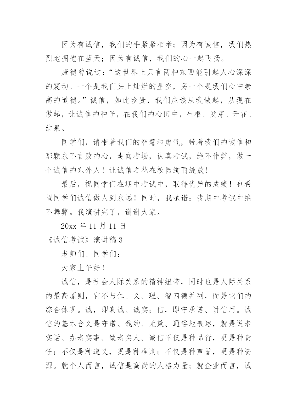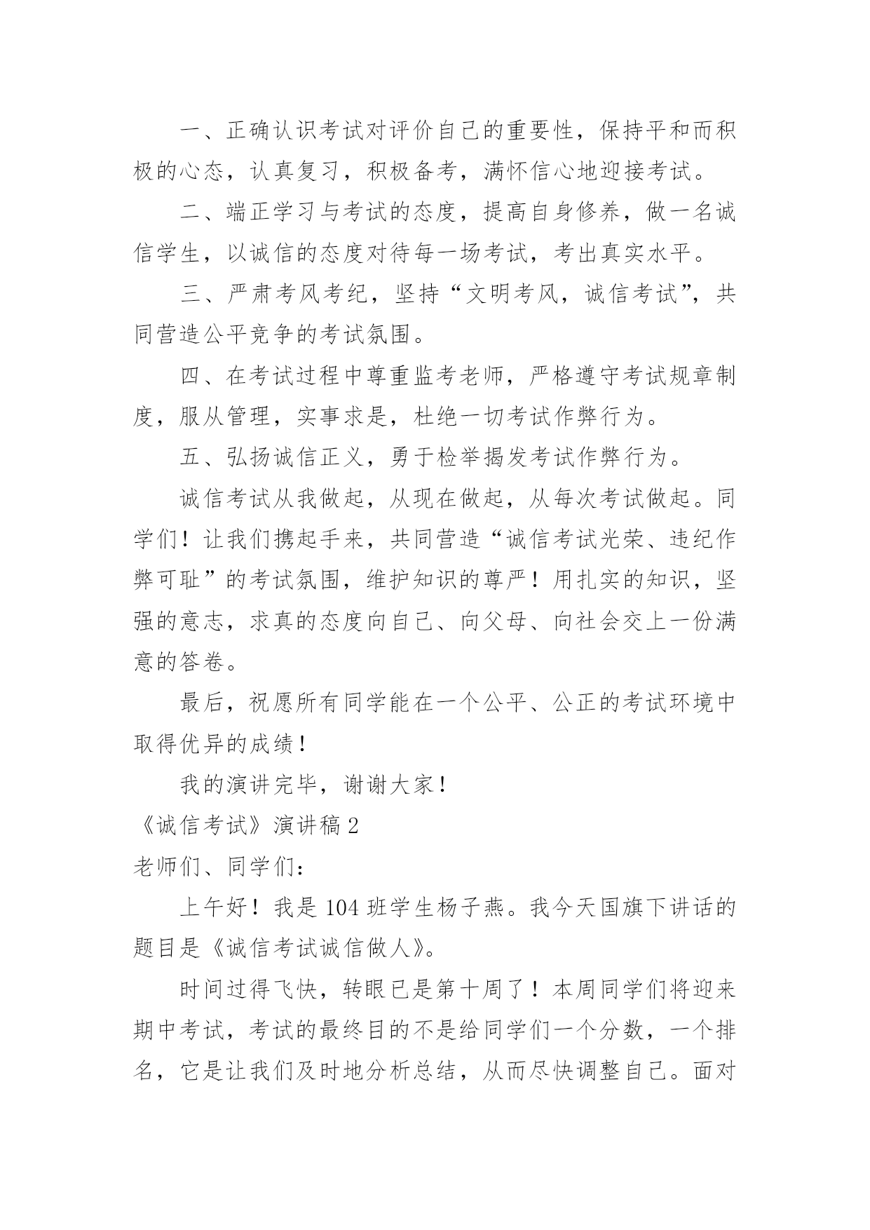 《诚信考试》演讲稿《诚信考试》演讲稿演讲稿是一种实用性比较强的文稿,是为演讲准备的书面材料。随着社会一步步向前发展,能够利用到演讲稿的场合越来越多,那要怎么写好演讲稿呢?下面是小编整理的《诚信考试》演讲稿,希望能够帮助到大家。《诚信考试》演讲稿1尊敬的老师亲爱的同学们:大家早上好!我是初二7班的xxx。今天我在国旗下演讲的题目是:“诚信做人,诚信考试。”诚信不但是一种自尊、自重、自爱,更是真实的自我、坦荡的自我、诚信的自我,这是一种光荣。真诚希望我们各位同学凭自己的辛勤汗水和真才实学,在考场上发挥出色水平,以诚信考试为荣,以违纪作弊为耻!也许有些同学的考试成绩的不是太如意,可是即使自己的成绩不理想,也不要在考试中采取不正当的竞争手段,我们应当做一个光明磊落的人。做一个诚信的人!赢要赢得别人心服口服,即使输也要输的坦坦荡荡。为营造一个公平、公正、积极健康、有序和谐的竞争平台,创建良好的考风、学风、校风,坚决抵制考试作弊的`不良风气,我们初二7班向全校同学发出如下倡议:一、正确认识考试对评价自己的重要性,保持平和而积极的心态,认真复习,积极备考,满怀信心地迎接考试。二、端正学习与考试的态度,提高自身修养,做一名诚信学生,以诚信的态度对待每一场考试,考出真实水平。三、严肃考风考纪,坚持“文明考风,诚信考试”,共同营造公平竞争的考试氛围。四、在考试过程中尊重监考老师,严格遵守考试规章制度,服从管理,实事求是,杜绝一切考试作弊行为。五、弘扬诚信正义,勇于检举揭发考试作弊行为。诚信考试从我做起,从现在做起,从每次考试做起。同学们!让我们携起手来,共同营造“诚信考试光荣、违纪作弊可耻”的考试氛围,维护知识的尊严!用扎实的知识,坚强的意志,求真的态度向自己、向父母、向社会交上一份满意的答卷。最后,祝愿所有同学能在一个公平、公正的考试环境中取得优异的成绩!我的演讲完毕,谢谢大家!《诚信考试》演讲稿2老师们、同学们:上午好!我是104班学生杨子燕。我今天国旗下讲话的题目是《诚信考试诚信做人》。时间过得飞快,转眼已是第十周了!本周同学们将迎来期中考试,考试的最终目的不是给同学们一个分数,一个排名,它是让我们及时地分析总结,从而尽快调整自己。面对即将到来的期中考试,我们应该做到“诚信考试,诚实做人”。同学们,诚实守信是中华民族的传统美德,诚是“壁立千仞,无欲则刚”的博大;信是“君子一言,驷马难追”的承诺。只有“诚信”方可“立身”,做到“诚信”方可“成人”。诚信是一种自尊、自重、自爱,是真实的自我、坦荡的自我。诚信的自我是一种光荣。“岂能如人意,但求无愧吾心”。让竞争在平等、公平、和谐中展开,让一切的付出和回报都真实,纯净!我想,只有我们坦然运用诚信的尺度来衡量自身,才无愧于自己的良心,才能正确面对人生考场上的各种各样的考试!没有诚信的人生活在世上,如同一颗漂浮在空中的尘埃,永远不会收获公众的赞美,永远不会拥有内心深处的踏实和宁静。跋涉在漫长的.人生路上,谁不踏踏实实留下诚信的足印,谁将永远走不出渺小与狭隘的怪圈。学问之道,同样也来不得半点虚伪和欺骗。一个考试作弊的人,不仅仅是治学态度的问题,更是个人思想品质和人格问题;他拿到的是带着面具的分数,丢失的却是自己心灵的纯洁。莘莘学子,诚信为本,就让我们诚实面对自己,守住内心的一份坚持,从自己做起,从现在做起,交出一份合格的诚信答卷,为学校的学风建设共同努力,为严肃考风考纪撑起一道诚信、文明、自觉、向上的美丽风景线。因为有诚信,我们的手紧紧相牵;因为有诚信,我们热烈地拥抱在蓝天;因为有诚信,我们的心一起飞扬。康德曾说过:“这世界上只有两种东西能引起人心深深的震动。一个是我们头上灿烂的星空,另一个是我们心中崇高的道德。”诚信,如此珍贵,我们应该从我做起,从现在做起,让诚信的种子,在我们的心田中,生根、发芽、开花、结果。同学们,请带着我们的智慧和勇气,带着我们的诚信和那颗永不言败的心,走向考场,认真考试,绝不作弊,做一个诚信的东外人!让诚信之花在校园绚丽绽放!最后,祝同学们在期中考试中,取得优异的成绩!也希望同学们诚信做人到永远!同时,我承诺:我期中考试中绝不舞弊。我演讲完了,谢谢大家。20xx年11月11日《诚信考试》演讲稿3老师们、同学们:大家上午好!诚信,是社会人际关系的精神纽带,同时也是人际关系的最高原则,它不与仁、义、理、智四德并列,而是它们的综合体现。诚,即真诚、诚实;信,即守承诺、讲信用。诚信的基本含义是守诺、践约、无欺。通俗地表述,就是说老实话、办老实事、做老实人。诚信不仅是种品行,更是种责任;不仅是种道义,更是种准则;不仅是种声誉,更是种资源。就个人而言,诚信是高尚的人格力量;就企业而言,诚信是宝贵的无形资产;就社会而言,诚信是正常的生产生活秩序;就国家而言,诚信是良好的国际形象。诚信是道