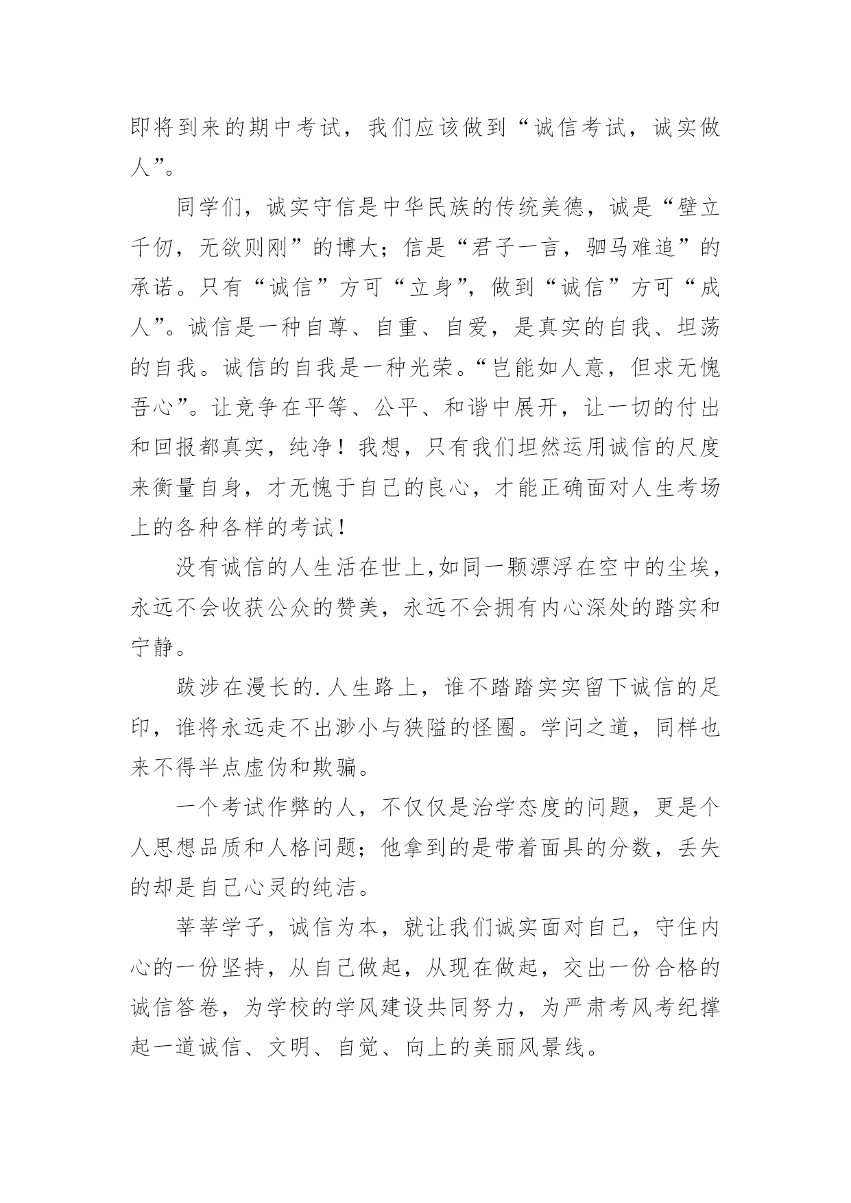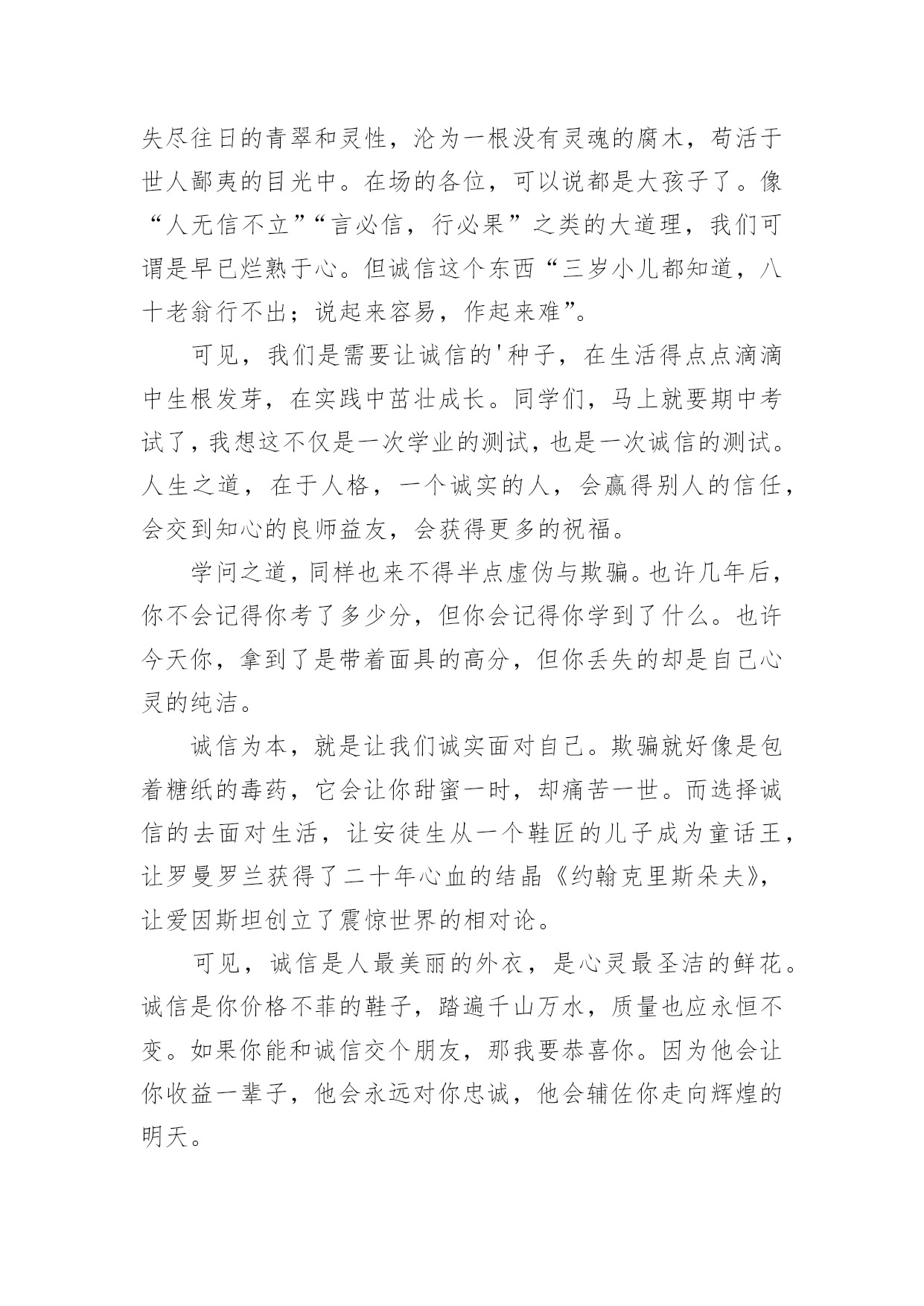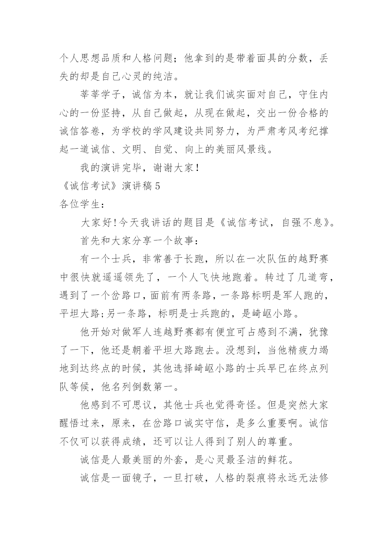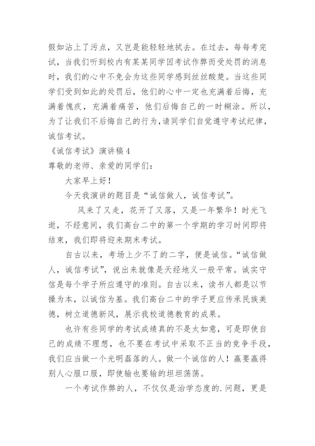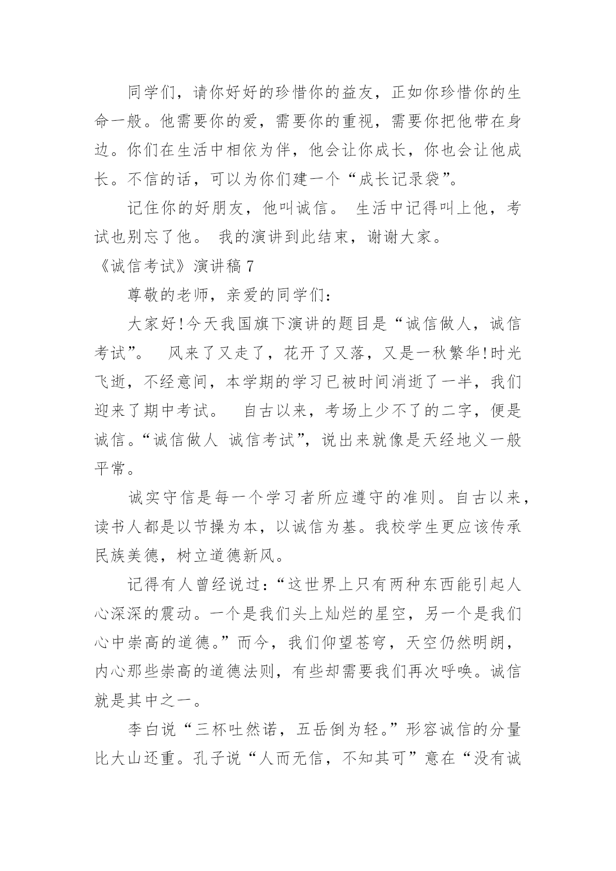 《诚信考试》演讲稿《诚信考试》演讲稿演讲稿是一种实用性比较强的文稿,是为演讲准备的书面材料。随着社会一步步向前发展,能够利用到演讲稿的场合越来越多,那要怎么写好演讲稿呢?下面是小编整理的《诚信考试》演讲稿,希望能够帮助到大家。《诚信考试》演讲稿1尊敬的老师亲爱的同学们:大家早上好!我是初二7班的xxx。今天我在国旗下演讲的题目是:“诚信做人,诚信考试。”诚信不但是一种自尊、自重、自爱,更是真实的自我、坦荡的自我、诚信的自我,这是一种光荣。真诚希望我们各位同学凭自己的辛勤汗水和真才实学,在考场上发挥出色水平,以诚信考试为荣,以违纪作弊为耻!也许有些同学的考试成绩的不是太如意,可是即使自己的成绩不理想,也不要在考试中采取不正当的竞争手段,我们应当做一个光明磊落的人。做一个诚信的人!赢要赢得别人心服口服,即使输也要输的坦坦荡荡。为营造一个公平、公正、积极健康、有序和谐的竞争平台,创建良好的考风、学风、校风,坚决抵制考试作弊的`不良风气,我们初二7班向全校同学发出如下倡议:一、正确认识考试对评价自己的重要性,保持平和而积极的心态,认真复习,积极备考,满怀信心地迎接考试。二、端正学习与考试的态度,提高自身修养,做一名诚信学生,以诚信的态度对待每一场考试,考出真实水平。三、严肃考风考纪,坚持“文明考风,诚信考试”,共同营造公平竞争的考试氛围。四、在考试过程中尊重监考老师,严格遵守考试规章制度,服从管理,实事求是,杜绝一切考试作弊行为。五、弘扬诚信正义,勇于检举揭发考试作弊行为。诚信考试从我做起,从现在做起,从每次考试做起。同学们!让我们携起手来,共同营造“诚信考试光荣、违纪作弊可耻”的考试氛围,维护知识的尊严!用扎实的知识,坚强的意志,求真的态度向自己、向父母、向社会交上一份满意的答卷。最后,祝愿所有同学能在一个公平、公正的考试环境中取得优异的成绩!我的演讲完毕,谢谢大家!《诚信考试》演讲稿2老师们、同学们:上午好!我是104班学生杨子燕。我今天国旗下讲话的题目是《诚信考试诚信做人》。时间过得飞快,转眼已是第十周了!本周同学们将迎来期中考试,考试的最终目的不是给同学们一个分数,一个排名,它是让我们及时地分析总结,从而尽快调整自己。面对即将到来的期中考试,我们应该做到“诚信考试,诚实做人”。同学们,诚实守信是中华民族的传统美德,诚是“壁立千仞,无欲则刚”的博大;信是“君子一言,驷马难追”的承诺。只有“诚信”方可“立身”,做到“诚信”方可“成人”。诚信是一种自尊、自重、自爱,是真实的自我、坦荡的自我。诚信的自我是一种光荣。“岂能如人意,但求无愧吾心”。让竞争在平等、公平、和谐中展开,让一切的付出和回报都真实,纯净!我想,只有我们坦然运用诚信的尺度来衡量自身,才无愧于自己的良心,才能正确面对人生考场上的各种各样的考试!没有诚信的人生活在世上,如同一颗漂浮在空中的尘埃,永远不会收获公众的赞美,永远不会拥有内心深处的踏实和宁静。跋涉在漫长的.人生路上,谁不踏踏实实留下诚信的足印,谁将永远走不出渺小与狭隘的怪圈。学问之道,同样也来不得半点虚伪和欺骗。一个考试作弊的人,不仅仅是治学态度的问题,更是个人思想品质和人格问题;他拿到的是带着面具的分数,丢失的却是自己心灵的纯洁。莘莘学子,诚信为本,就让我们诚实面对自己,守住内心的一份坚持,从自己做起,从现在做起,交出一份合格的诚信答卷,为学校的学风建设共同努力,为严肃考风考纪撑起一道诚信、文明、自觉、向上的美丽风景线。因为有诚信,我们的手紧紧相牵;因为有诚信,我们热烈地拥抱在蓝天;因为有诚信,我们的心一起飞扬。康德曾说过:“这世界上只有两种东西能引起人心深深的震动。一个是我们头上灿烂的星空,另一个是我们心中崇高的道德。”诚信,如此珍贵,我们应该从我做起,从现在做起,让诚信的种子,在我们的心田中,生根、发芽、开花、结果。同学们,请带着我们的智慧和勇气,带着我们的诚信和那颗永不言败的心,走向考场,认真考试,绝不作弊,做一个诚信的东外人!让诚信之花在校园绚丽绽放!最后,祝同学们在期中考试中,取得优异的成绩!也希望同学们诚信做人到永远!同时,我承诺:我期中考试中绝不舞弊。我演讲完了,谢谢大家。20xx年11月11日《诚信考试》演讲稿3老师们、同学们:大家上午好!诚信,是社会人际关系的精神纽带,同时也是人际关系的最高原则,它不与仁、义、理、智四德并列,而是它们的综合体现。诚,即真诚、诚实;信,即守承诺、讲信用。诚信的基本含义是守诺、践约、无欺。通俗地表述,就是说老实话、办老实事、做老实人。诚信不仅是种品行,更是种责任;不仅是种道义,更是种准则;不仅是种声誉,更是种资源。就个人而言,诚信是高尚的人格力量;就企业而言,诚信是宝贵的无形资产;就社会而言,诚信是正常的生产生活秩序;就国家而言,诚信是良好的国际形象。诚信是道