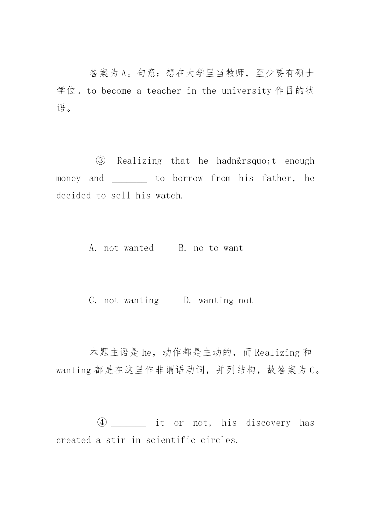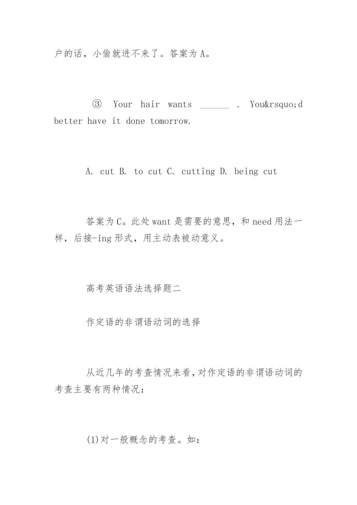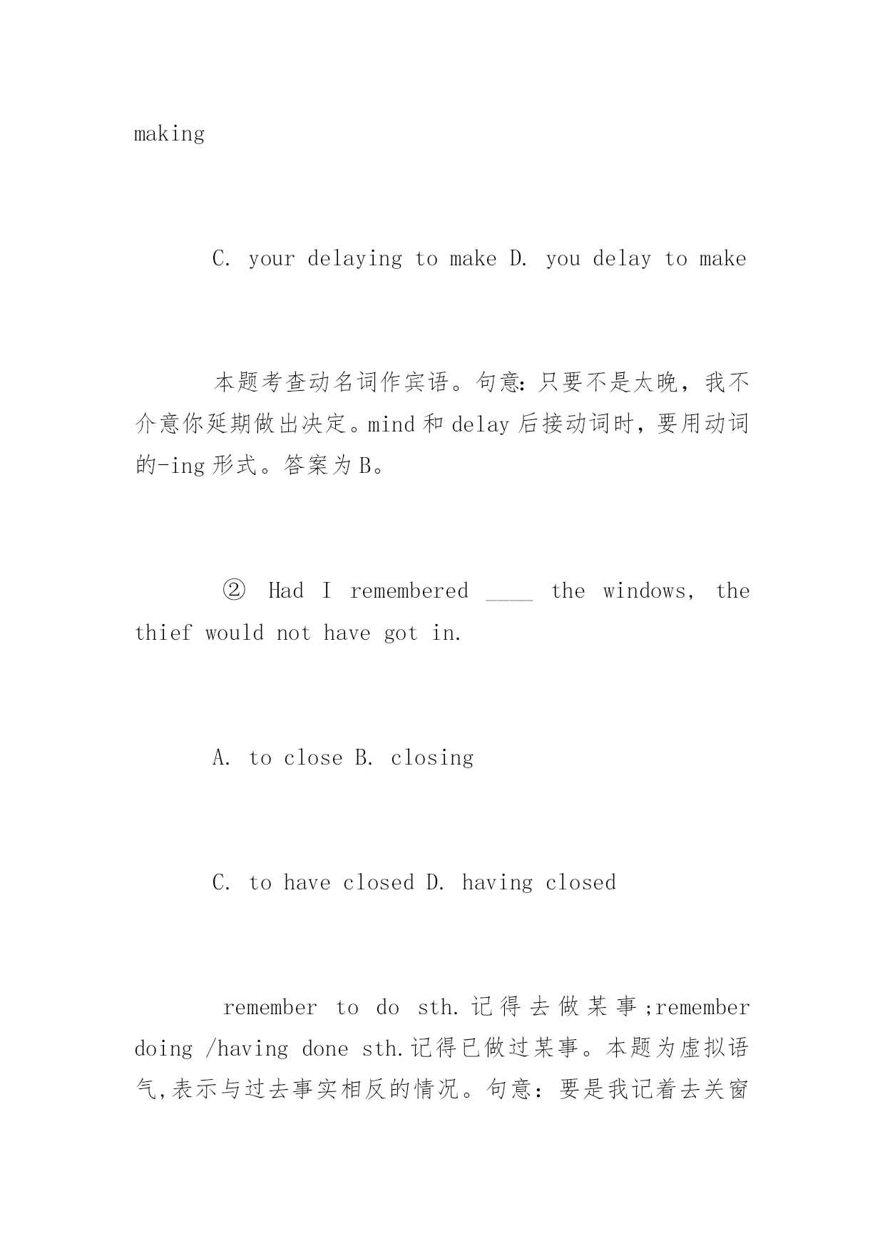 高考英语语法选择题高考英语语法选择题对高考英语不怎么熟练的情况下可以对英语语法归类训练,下面是小编整理的高考英语语法选择题,可以提高英语原发填空,供大家参考!高考英语语法选择题一1)谓语动词后不定式与动名词的选择谓语动词后接不定式还是接动名词也是语法测试中的一个题眼。如:①Idon’tmind____thedecisionaslongasitisnottoolate.A.youtodelaymakingB.yourdelayingmakingC.yourdelayingtomakeD.youdelaytomake本题考查动名词作宾语。句意:只要不是太晚,我不介意你延期做出决定。mind和delay后接动词时,要用动词的-ing形式。答案为B。②HadIremembered____thewindows,thethiefwouldnothavegotin.A.tocloseB.closingC.tohaveclosedD.havingclosedremembertodosth.记得去做某事;rememberdoing/havingdonesth.记得已做过某事。本题为虚拟语气,表示与过去事实相反的情况。句意:要是我记着去关窗户的话,小偷就进不来了。答案为A。③Yourhairwants______.You’dbetterhaveitdonetomorrow.A.cutB.tocutC.cuttingD.beingcut答案为C。此处want是需要的意思,和need用法一样,后接-ing形式,用主动表被动意义。高考英语语法选择题二作定语的非谓语动词的选择从近几年的考查情况来看,对作定语的非谓语动词的考查主要有两种情况:(1)对一般概念的考查。如:Theproject____bytheendof2000,willexpandthecity’stelephonenetworktocover1,000,000users.A.accomplishedB.beingaccomplishedC.tobeaccomplishedD.havingbeenaccomplished考查不定式作定语。本题中的时间是2000年底,这是一个将来时的时间状语,说明该事情是未来完成的,故使用不定式表示未来。答案为C。(2)对固定结构的考查。如:Theprofessorcouldhardlyfindsufficientgrounds_____hisargumentsinfavorofthenewtheory.A.tobebasedonB.tobaseonC.whichtobaseonD.onwhichtobase此题为不定式作定语的'固定形式,答案为D。在英语中有些名词,如动词变来的名词,形容词变来的名词,以及means,way,time,moment,reason等要求其后用不定式作定语,不定式没有体的变化。高考英语语法选择题三作状语的非谓语动词的选择作状语的非谓语动词主要考查其各种形式的选择。如:①______theearthtobeflat,manyfearedthatColumbuswouldfallofftheedgeoftheearth.A.HavingbelievedB.BelievingC.BelievedD.BeingBelieved此题考查非谓语动词作原因状语的用法。believe和句子主语many之间是明显的主动关系,所以用现在分词;并且非谓语动词所表示的动作和主句动作在发生时间并不存在先后发生的关系,故答案为B。②_______ateacherinauniversity,itisnecessarytohaveatleastamaster’sdegree.A.TobecomeB.BecomeC.OnebecomesD.Onbecoming答案为A。句意:想在大学里当教师,至少要有硕士学位。tobecomeateacherintheuniversity作目的状语。③Realizingthathehadn’tenoughmoneyand_______toborrowfromhisfather,hedecidedtosellhiswatch.A.notwantedB.notowantC.notwantingD.wantingnot本题主语是he,动作都是主动的,而Realizing和wanting都是在这里作非谓语动词,并列结构,故答案为C。④_______itornot,hisdiscoveryhascreatedastirinscientificcircles.A.BelieveB.Tobel